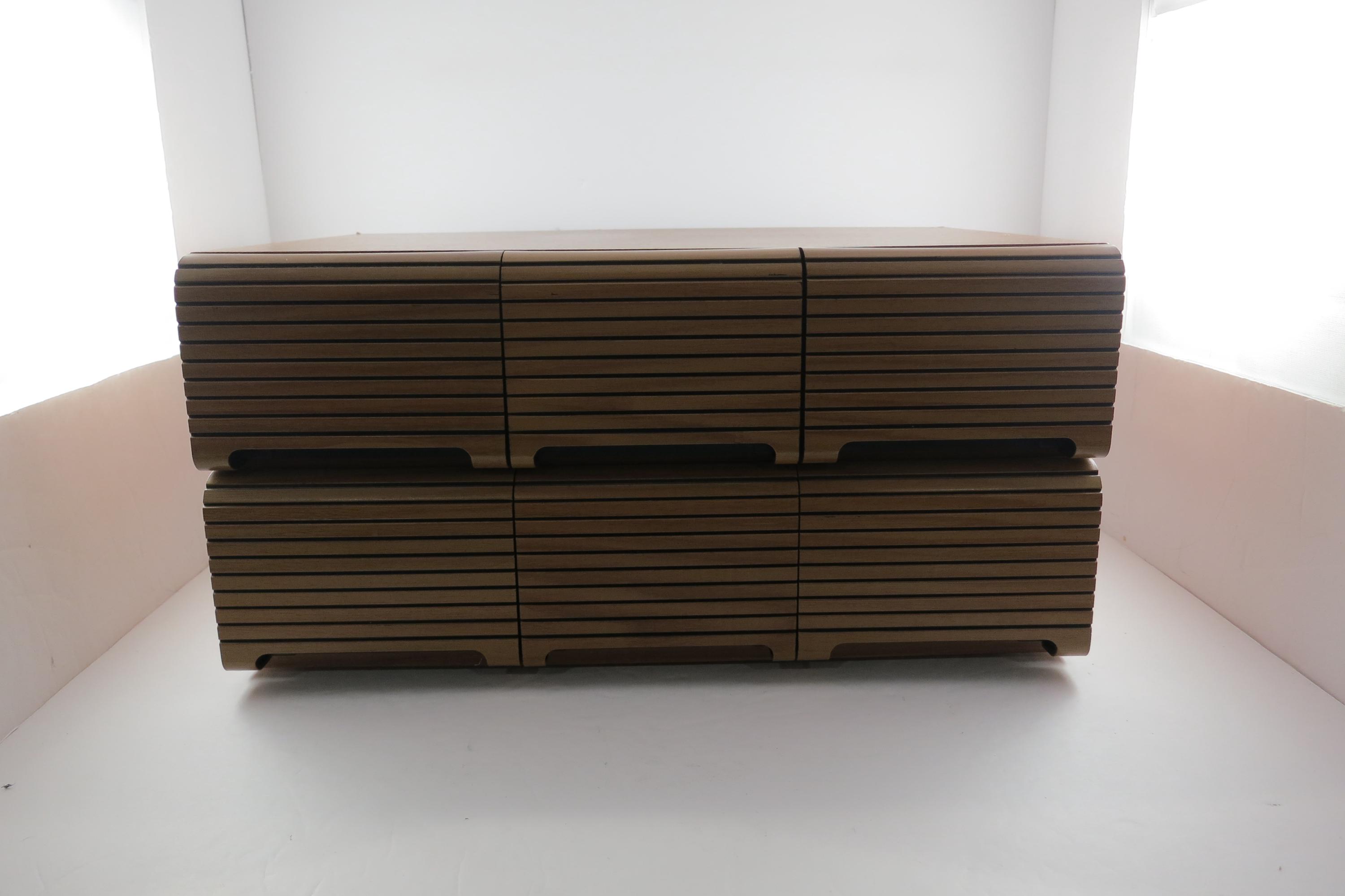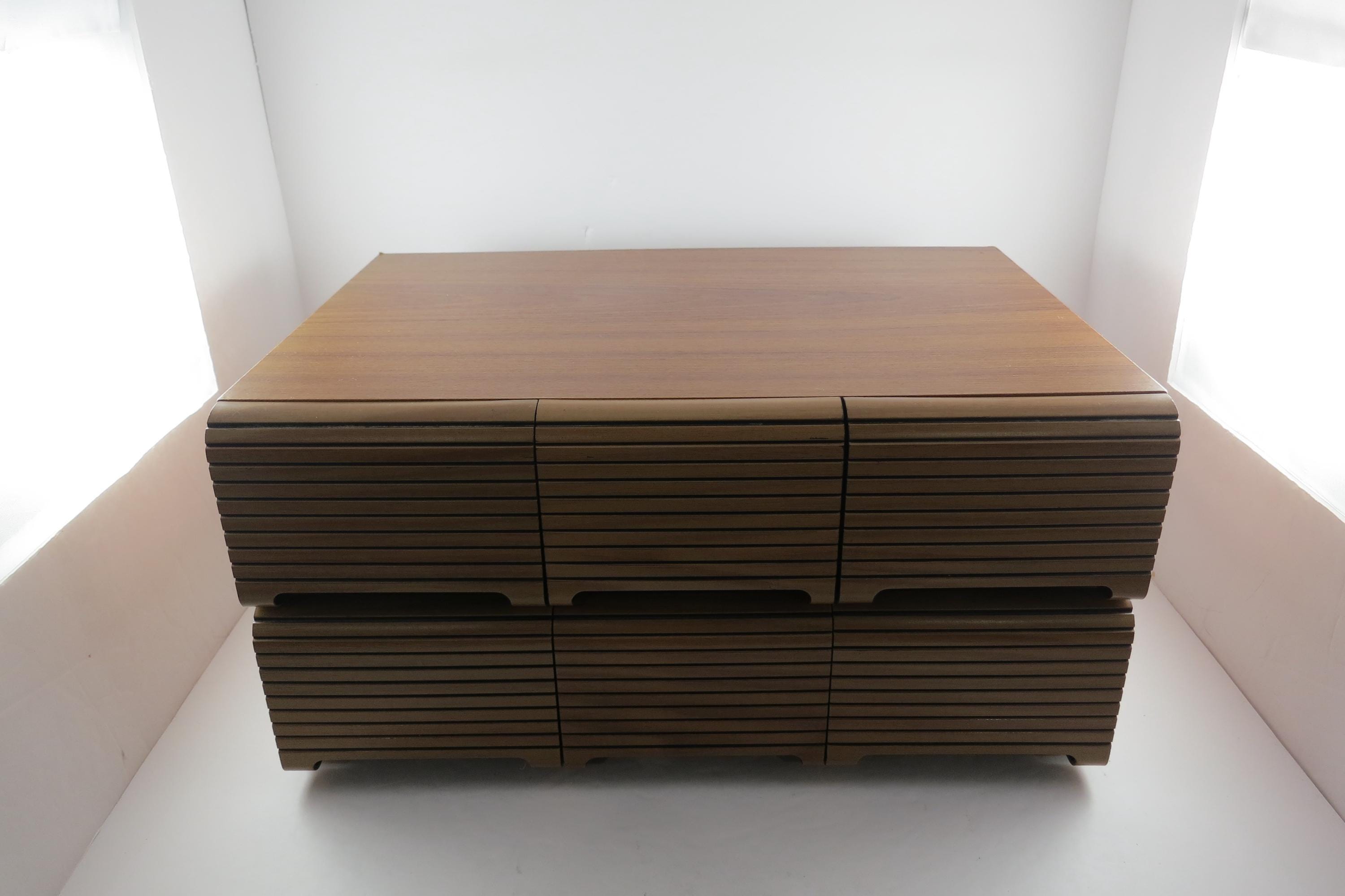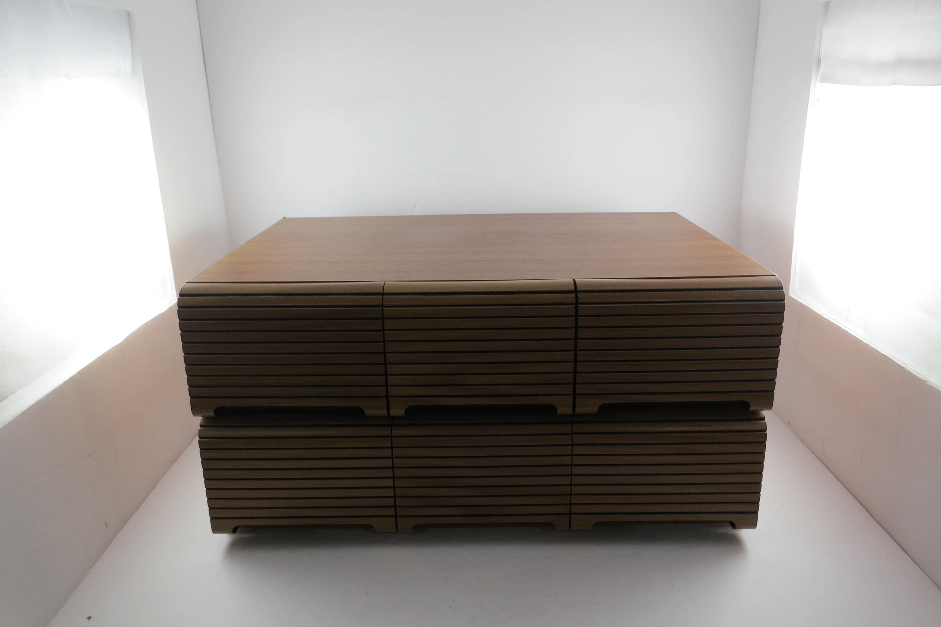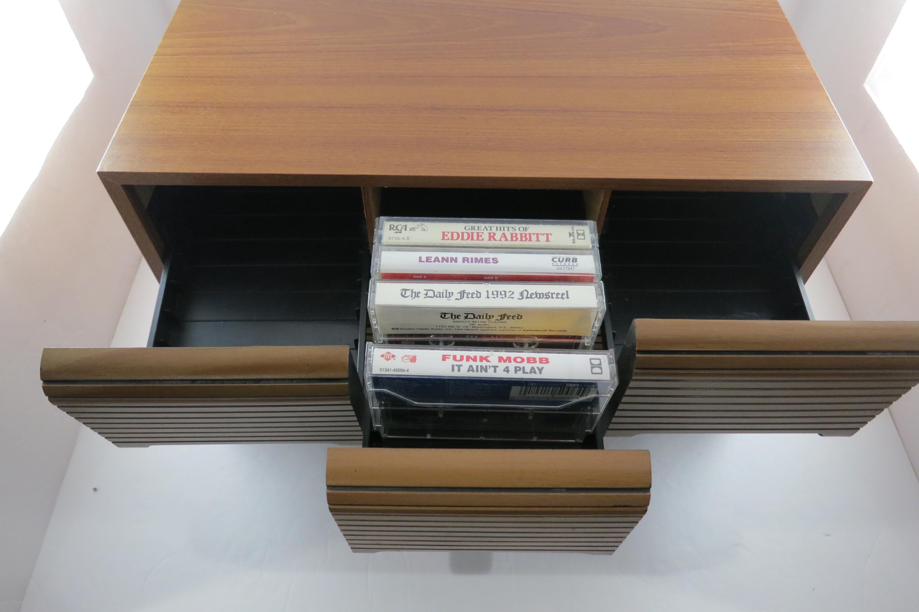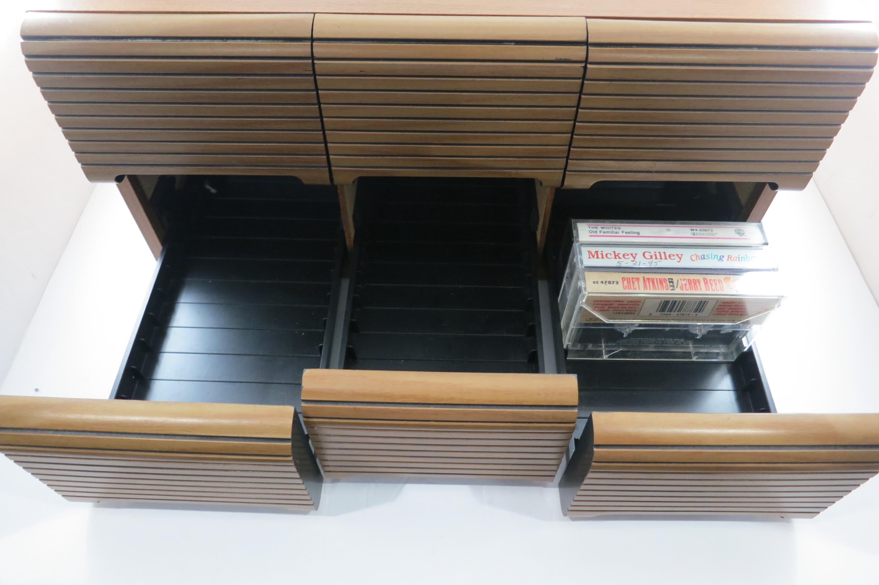 Original 1980's Faux Wood Double Cassette Holder Holds 72 Cassette Tapes Organizer Display. In excellent condition. Six drawers, each holds 12 cassettes in their cases. Perfect for your vintage cassette collection, . Total measurement of 15 inches wide, 10 1/4 inches deep and 7 3/4 inches tall.