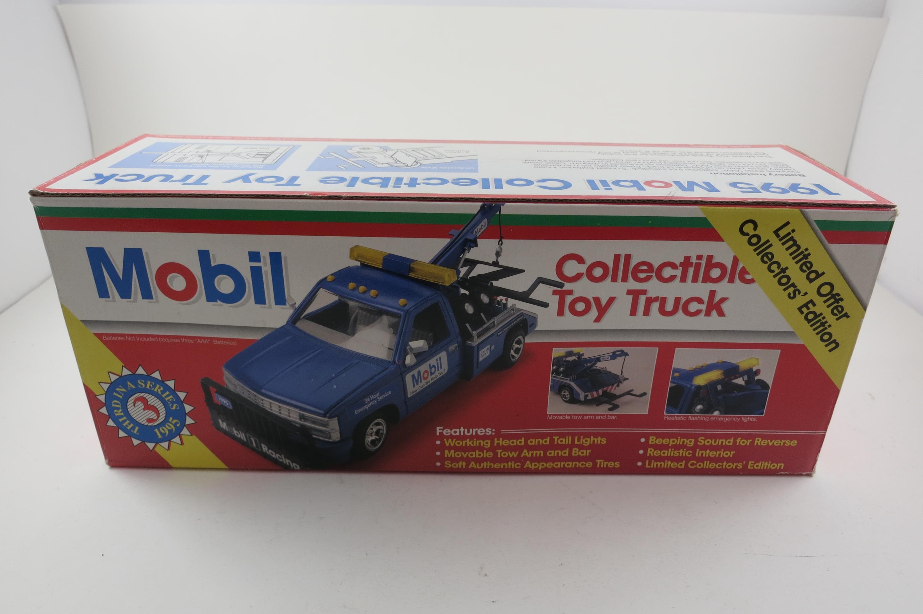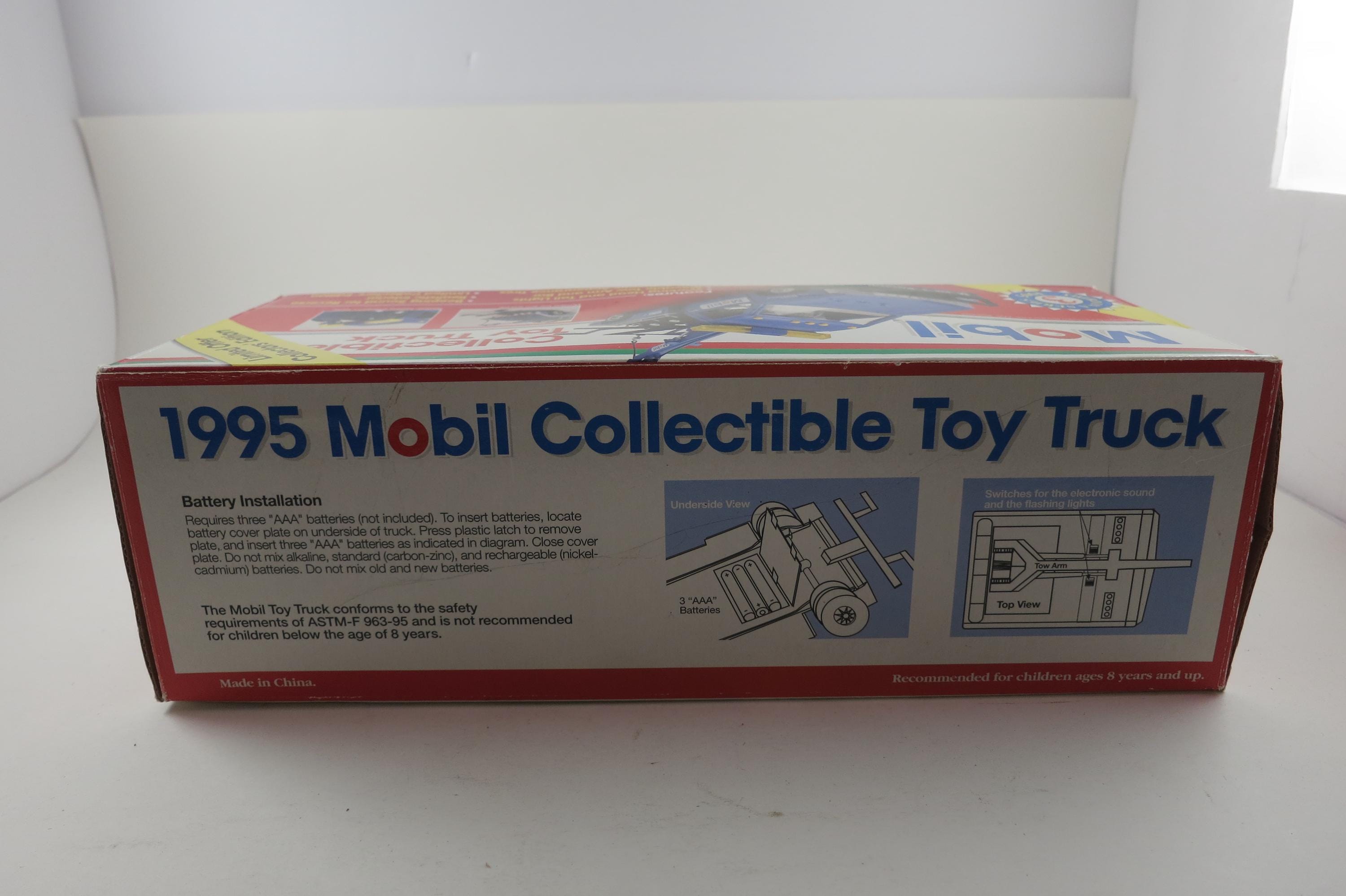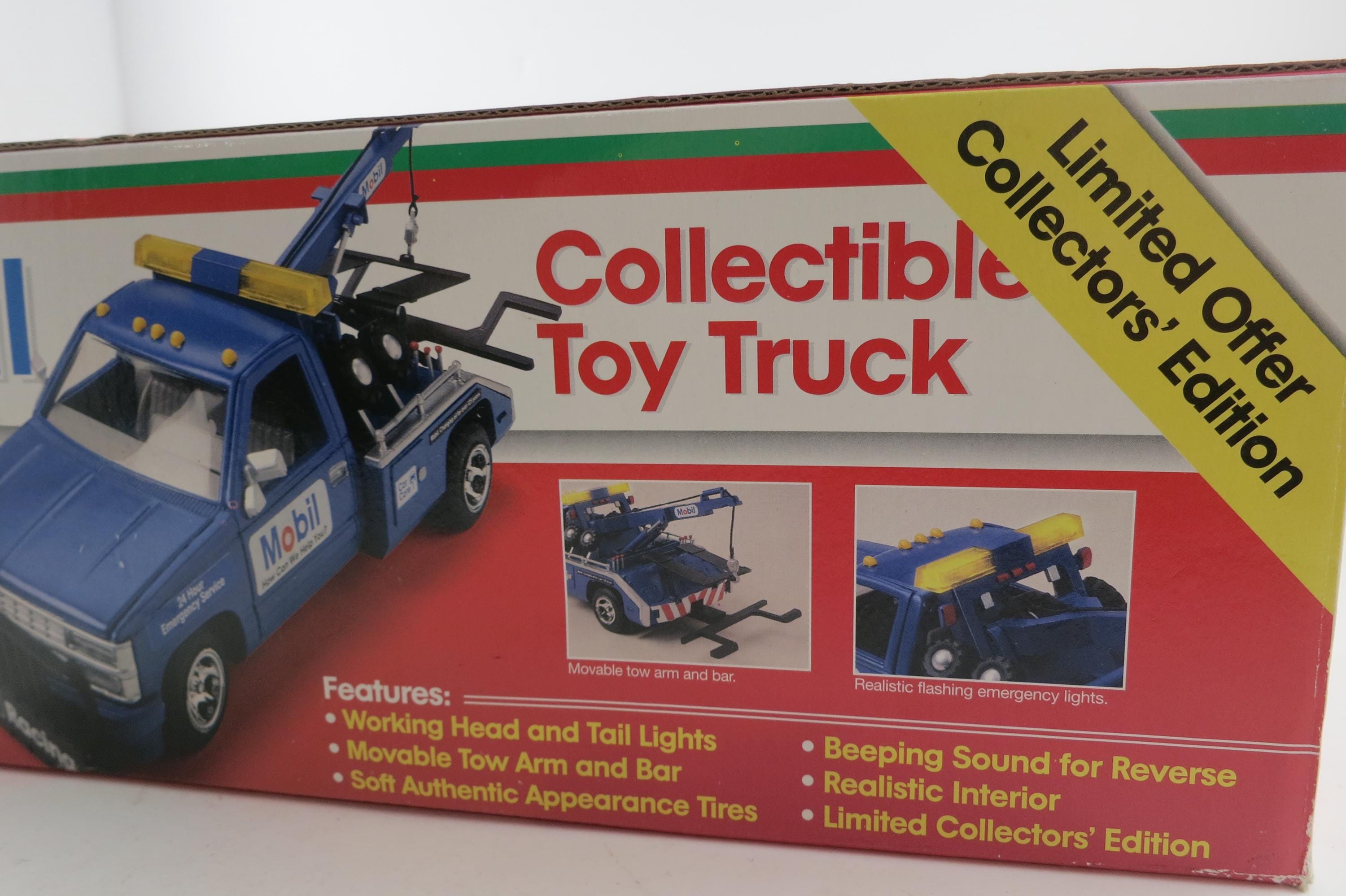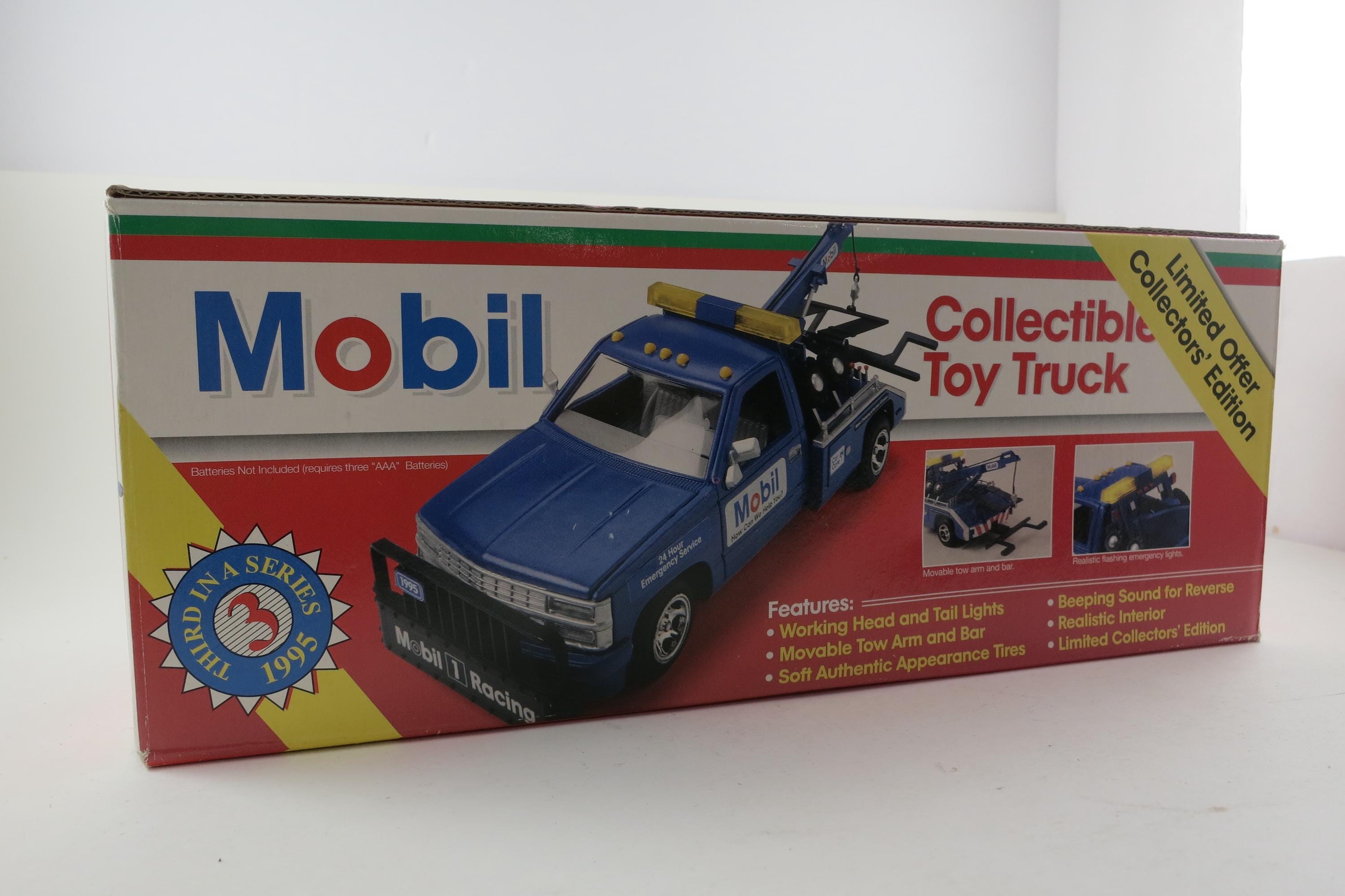 Vintage 1995 Mobile Gasoline Tow Truck Toy New In Original Box Lights Sounds Back Up Tow Arm and Bar Move.