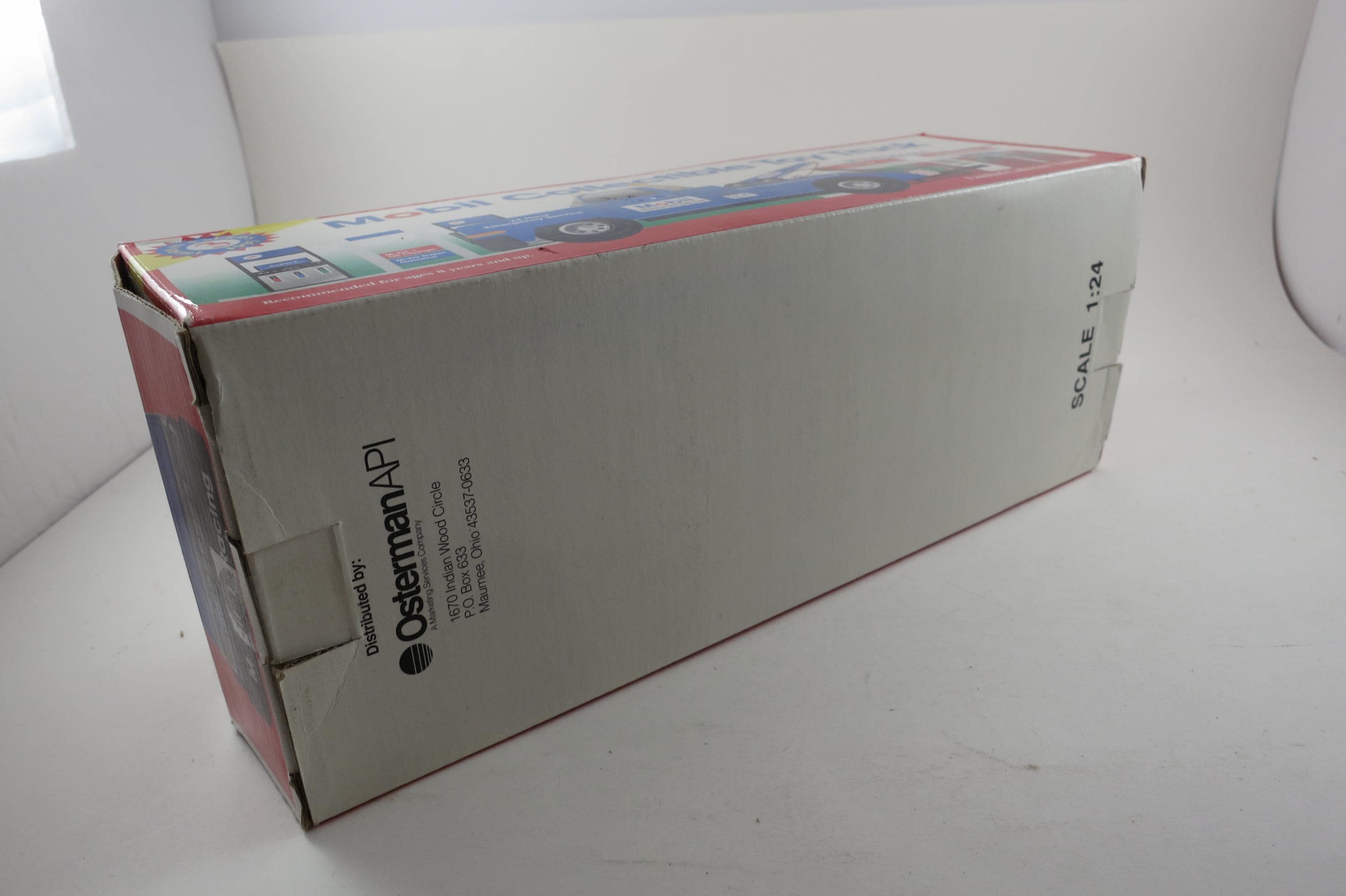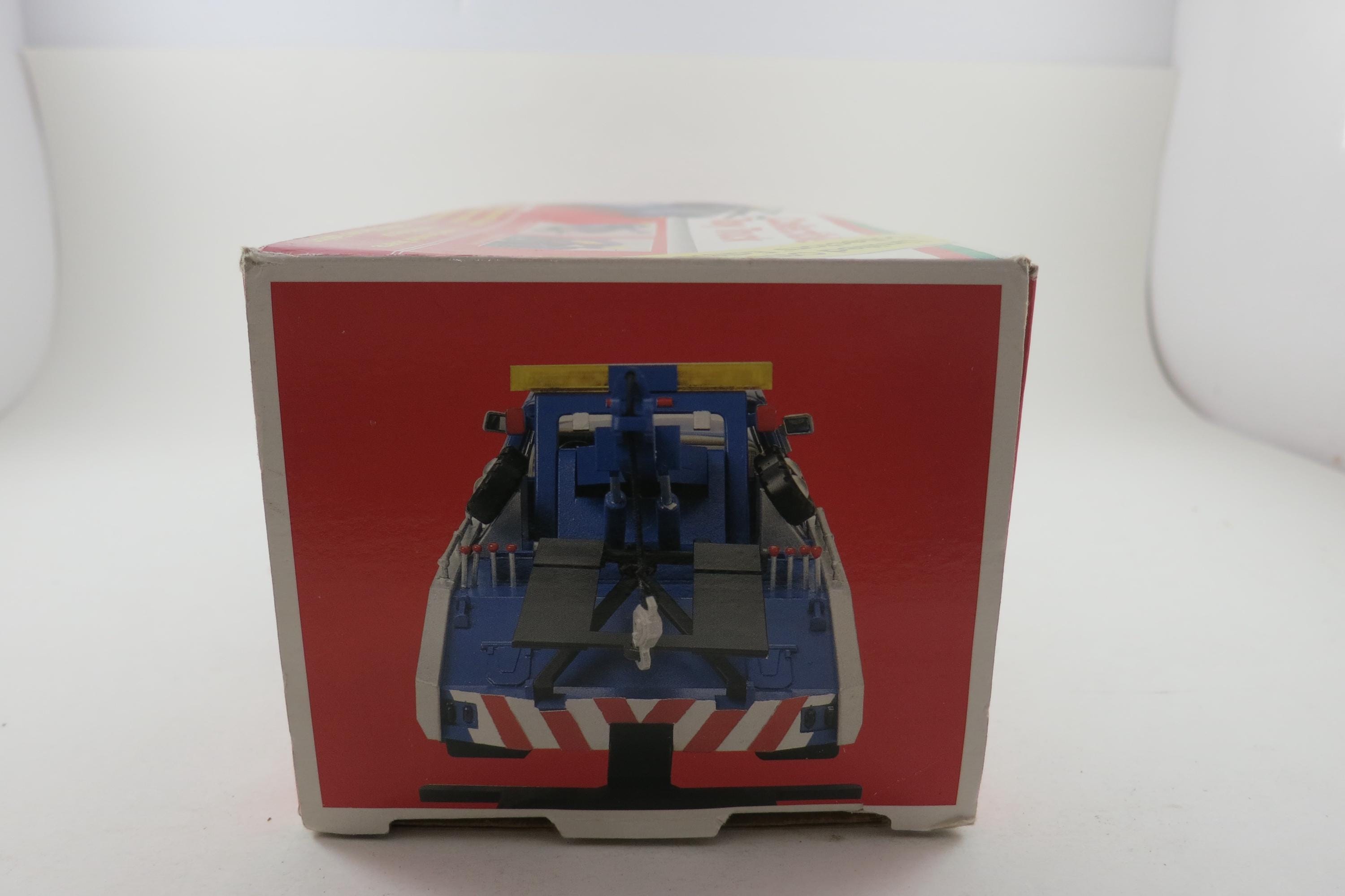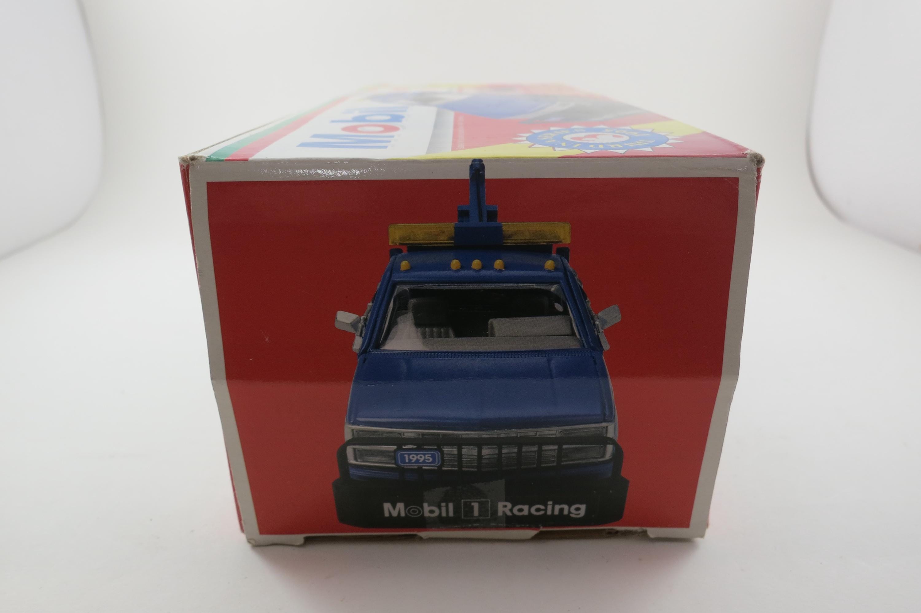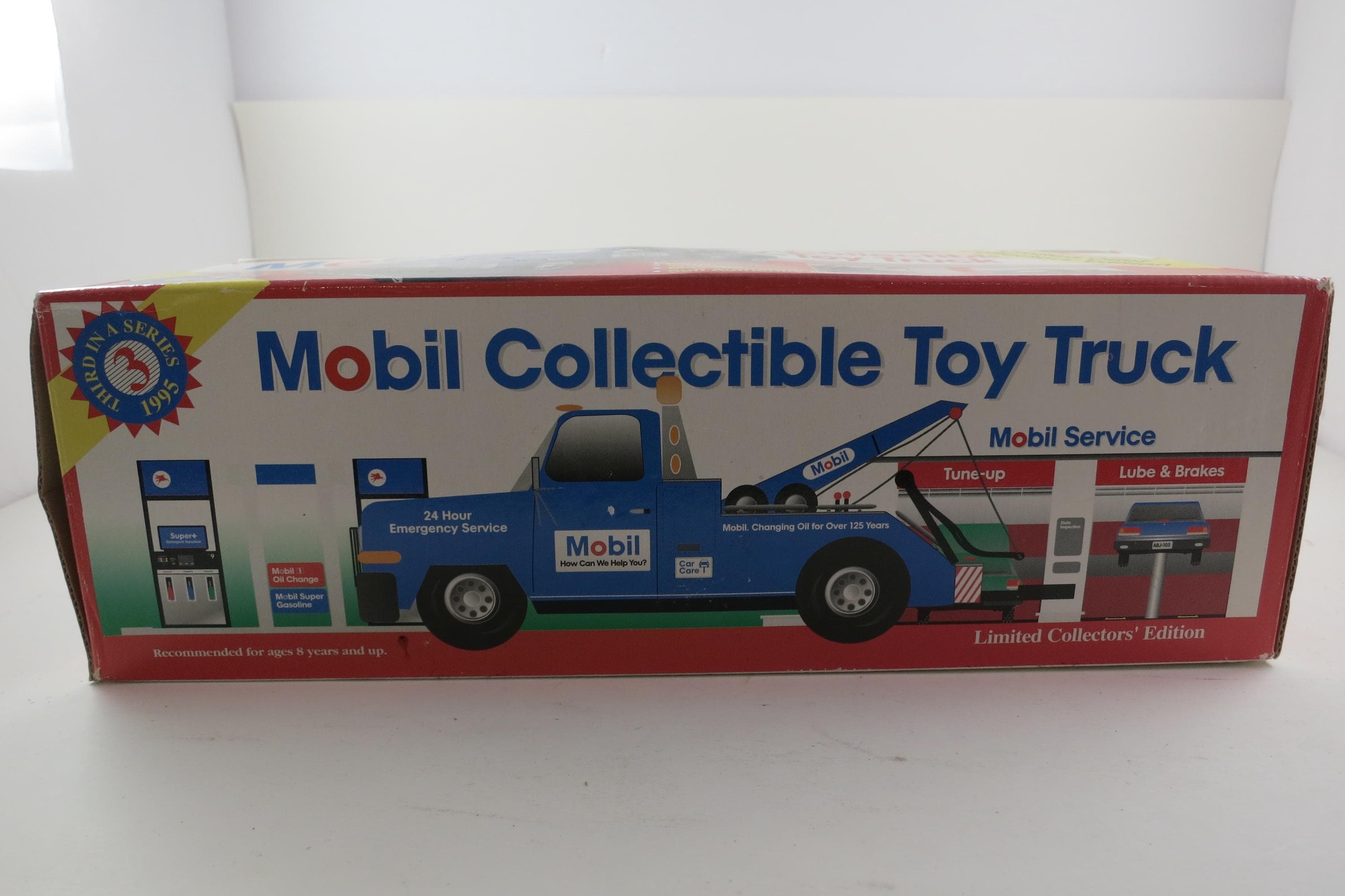 Vintage 1995 Mobile Gasoline Tow Truck Toy New In Original Box Lights Sounds Back Up Tow Arm and Bar Move.