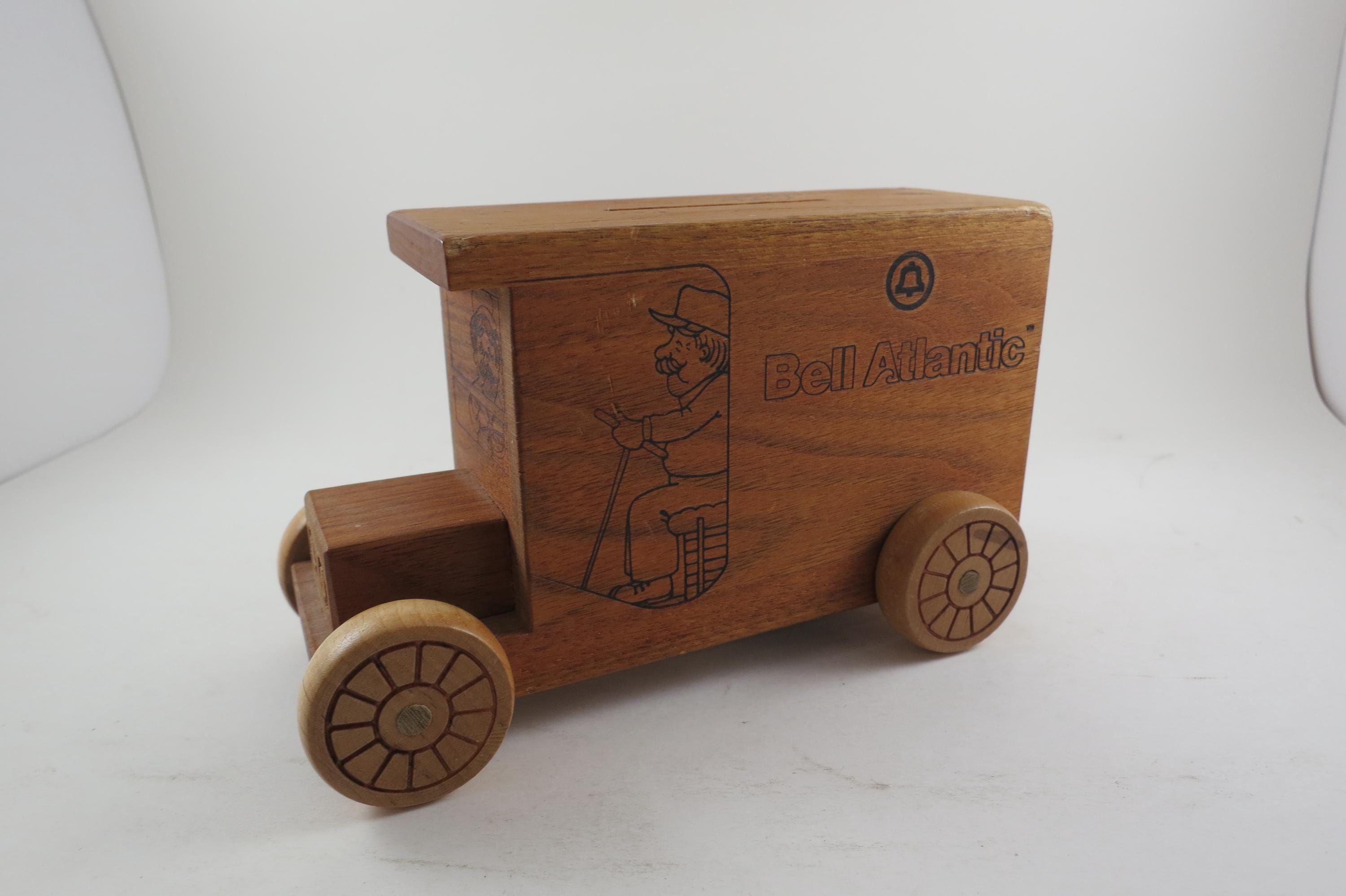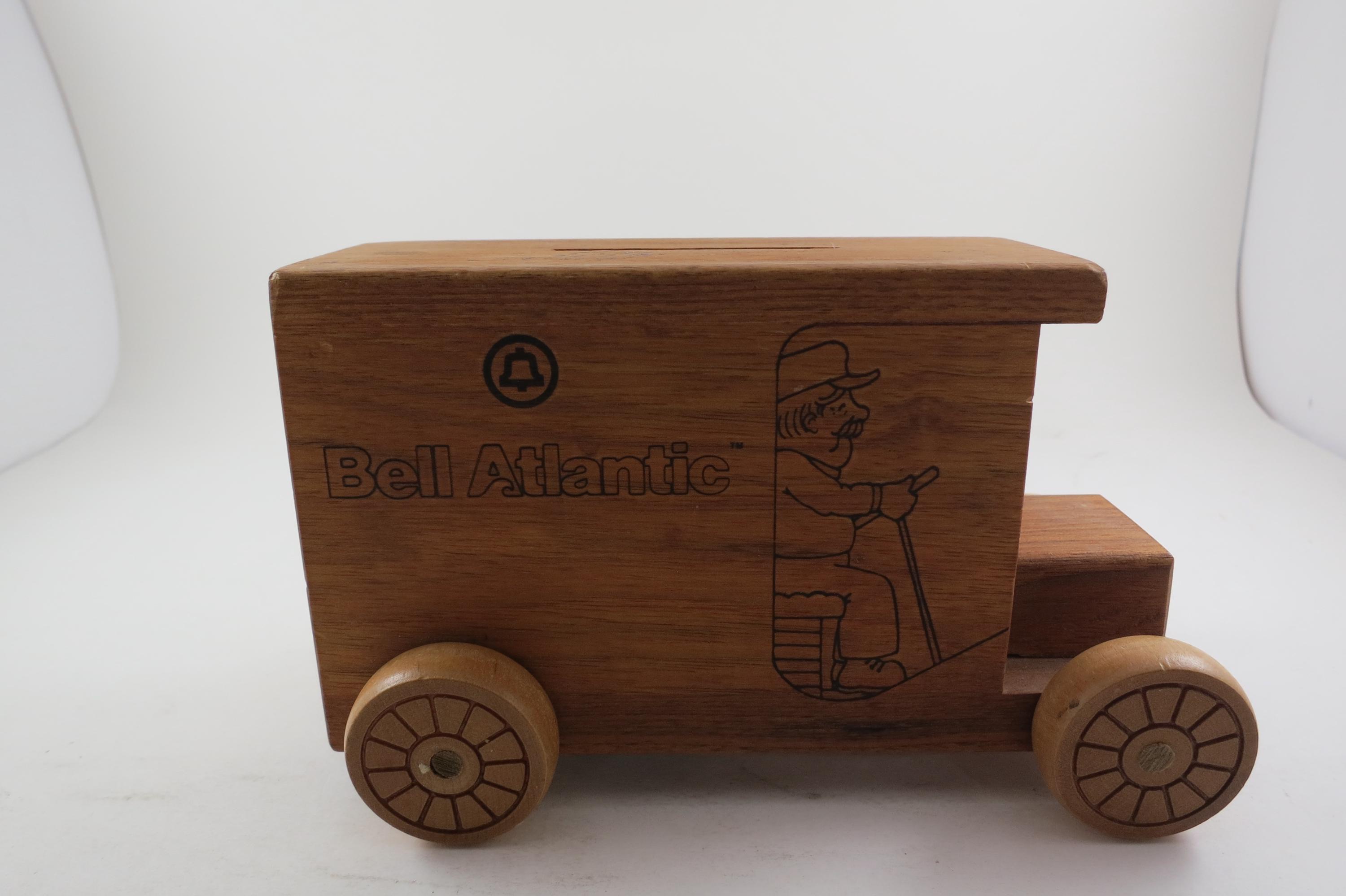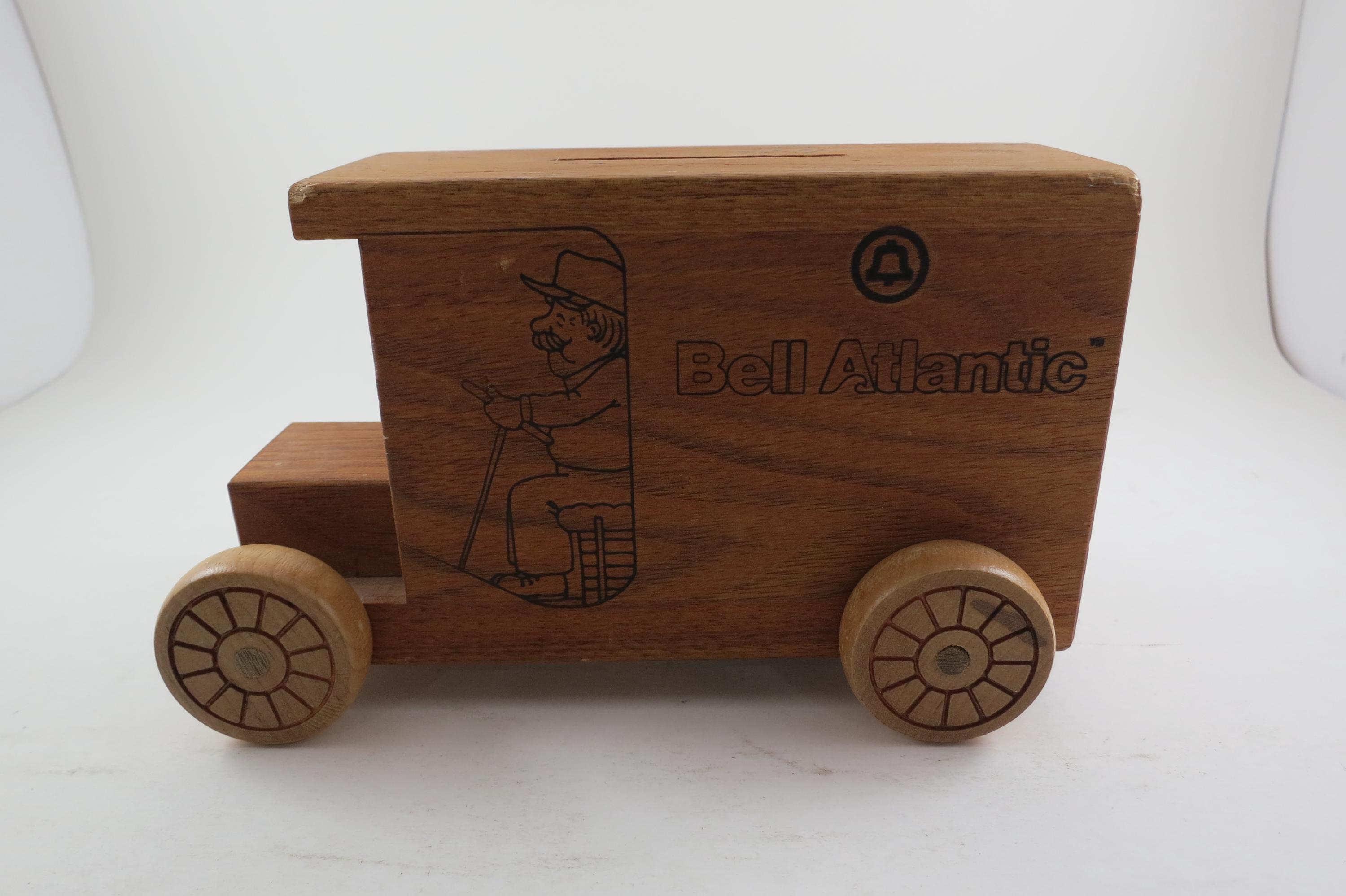 Vintage 1984 Bell Atlantic Toystalgia Wooden Advertising Bank Excellent Condition. Measures 7 1/2 inches long and 4 1/2 inches tall. Hard to find! Perfect gift!