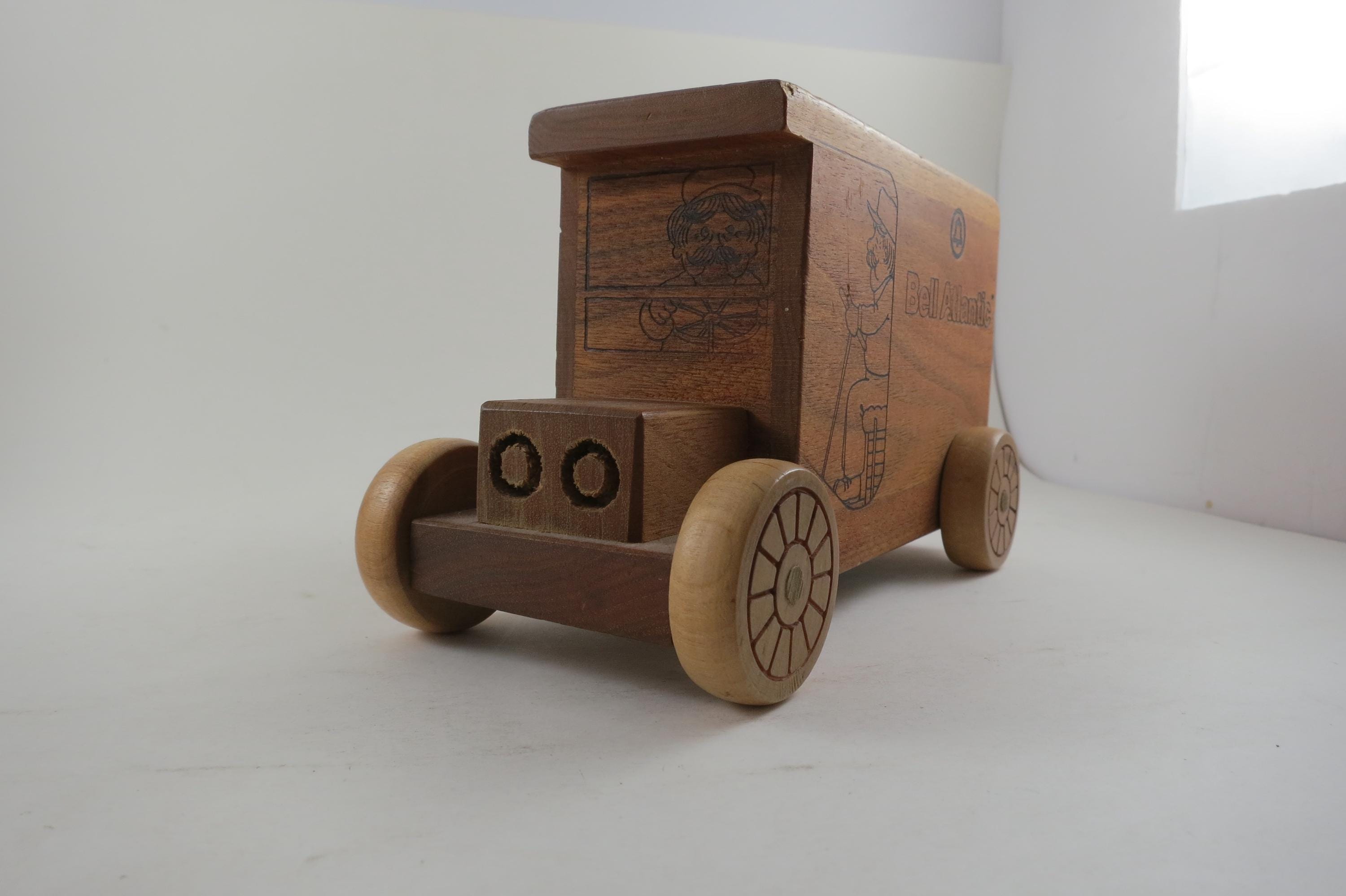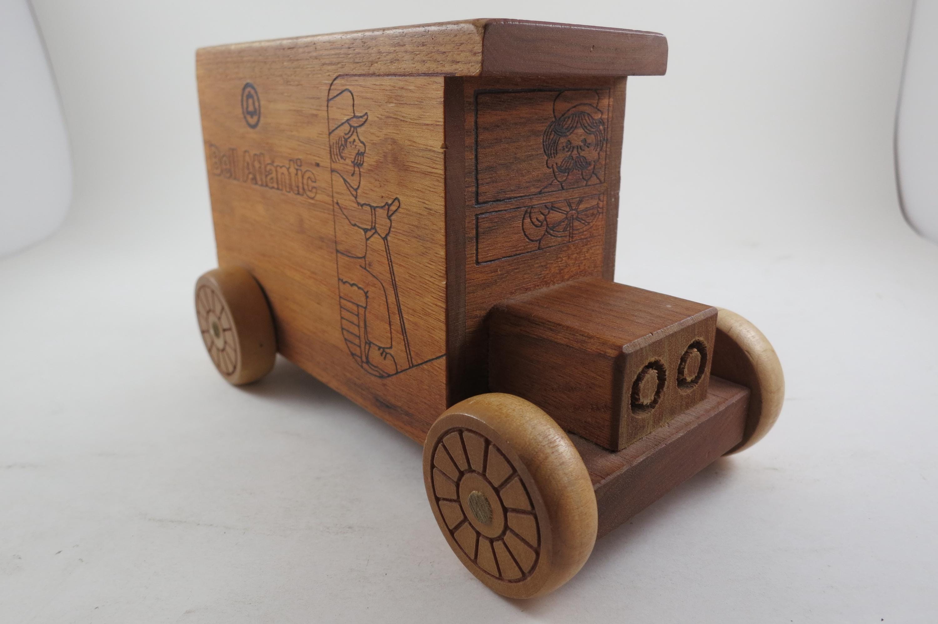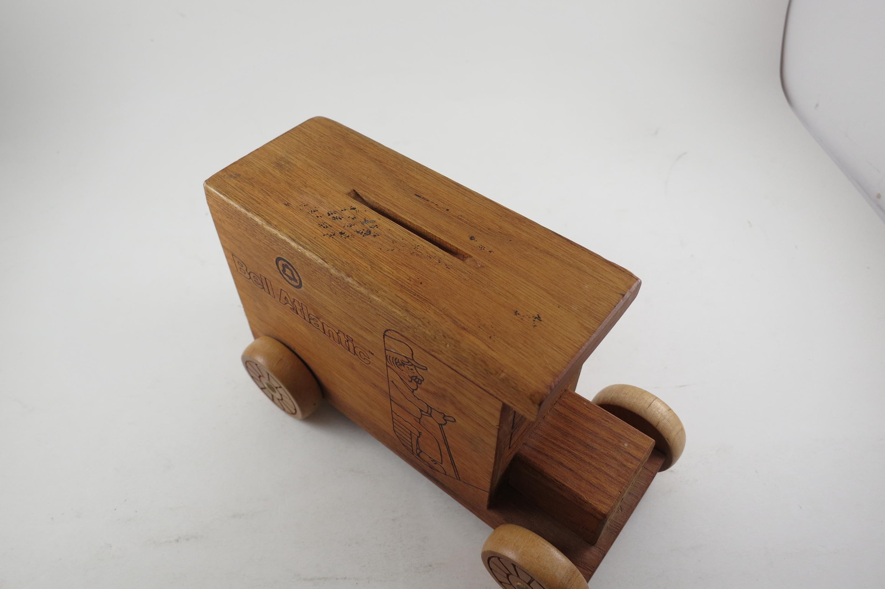 Vintage 1984 Bell Atlantic Toystalgia Wooden Advertising Bank Excellent Condition. Measures 7 1/2 inches long and 4 1/2 inches tall. Hard to find! Perfect gift!