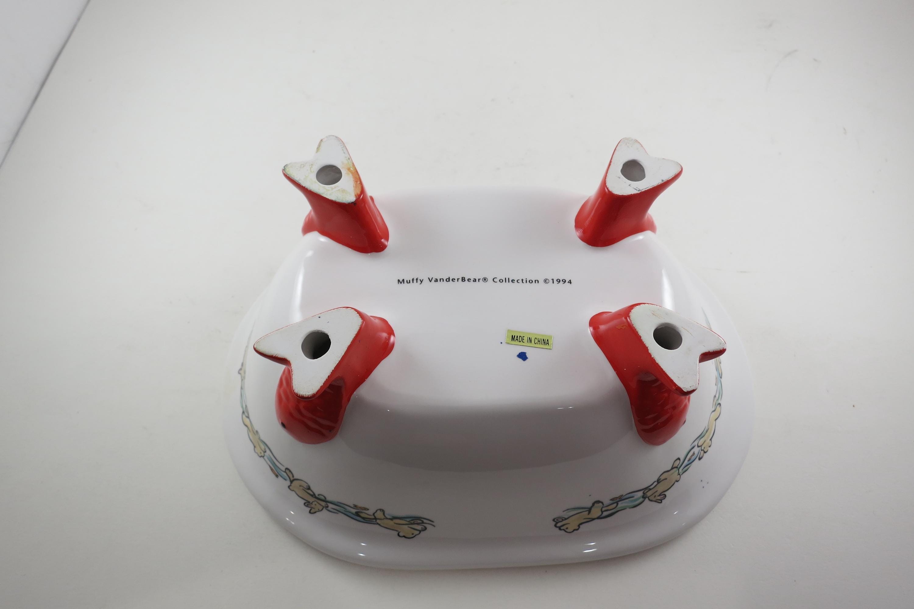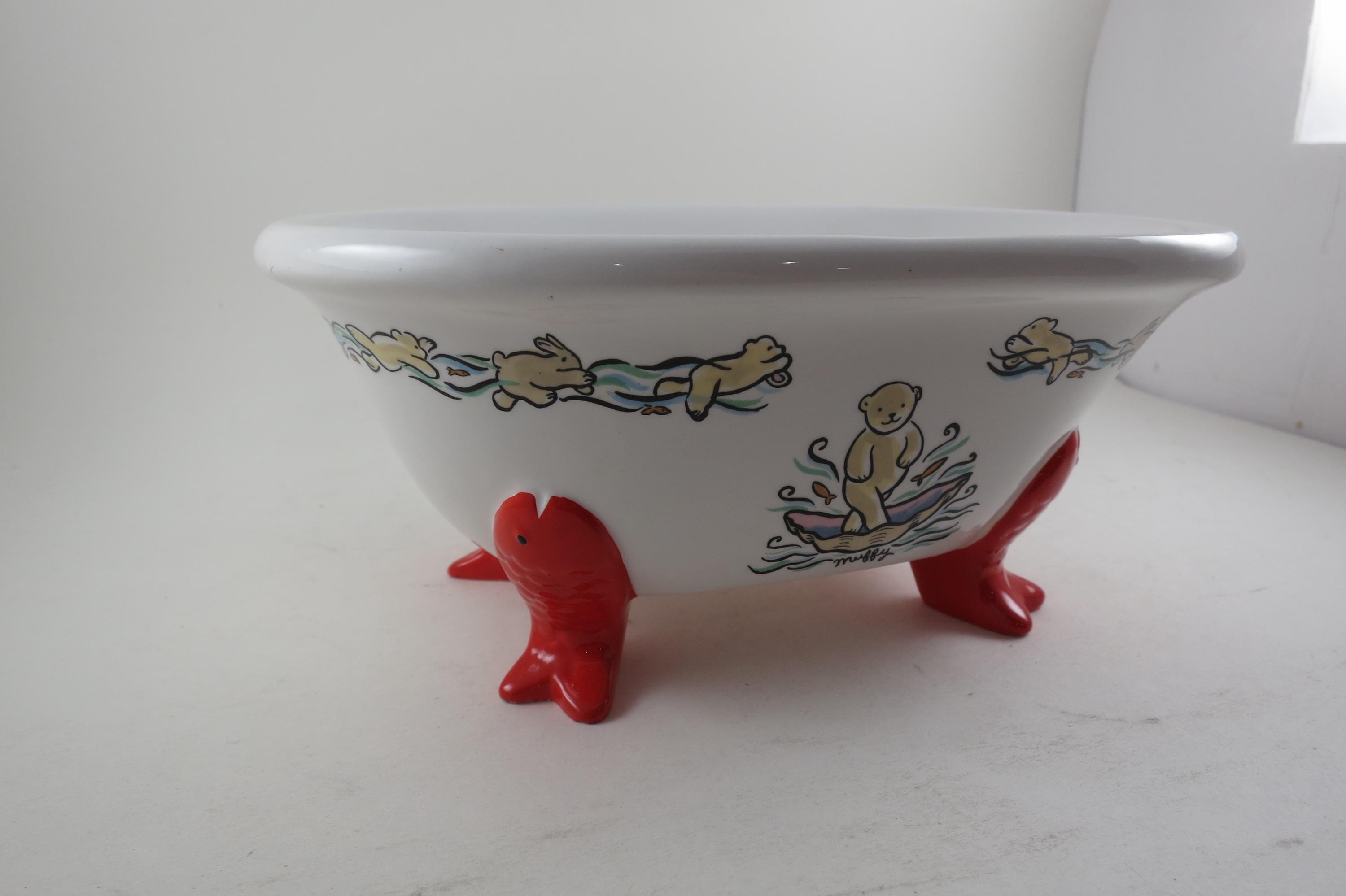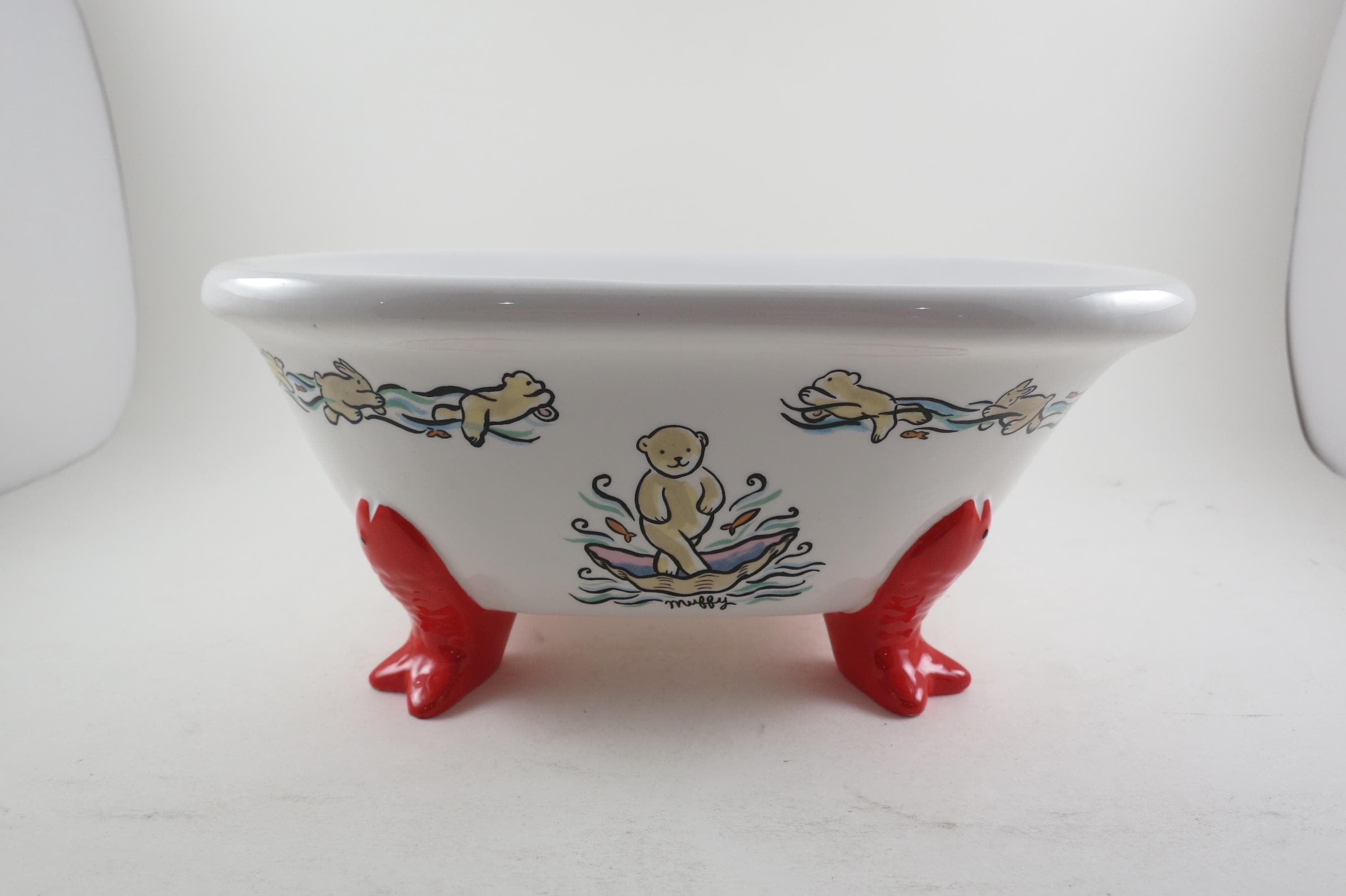 Vintage 1994 Muffy VanderBear Collection Ceramic Dish Bear Bathing Fish Feet Excellent Condition. Measures 9 1/4 inches long, 6 1/2 inches wide and 4 inches tall.