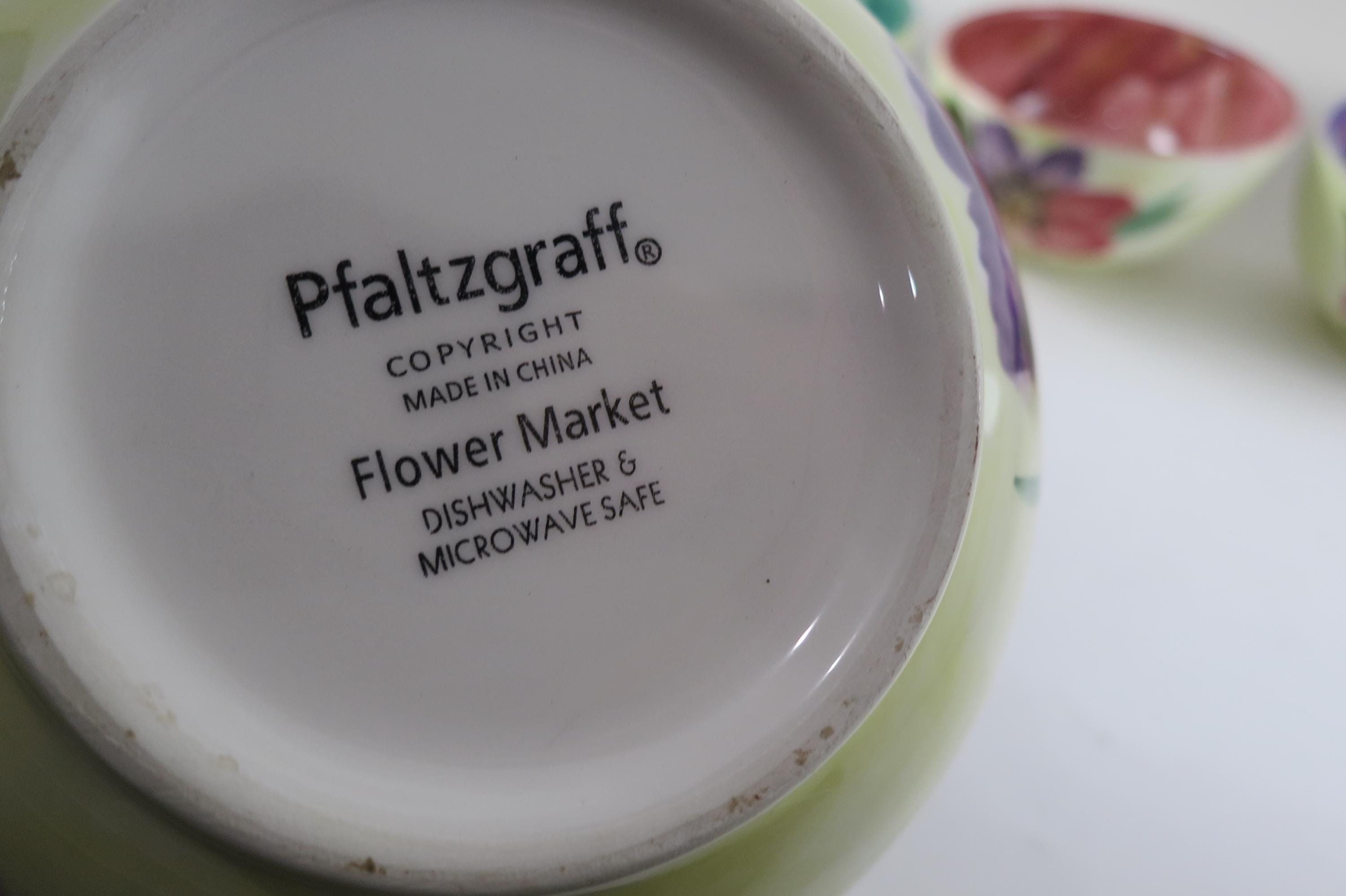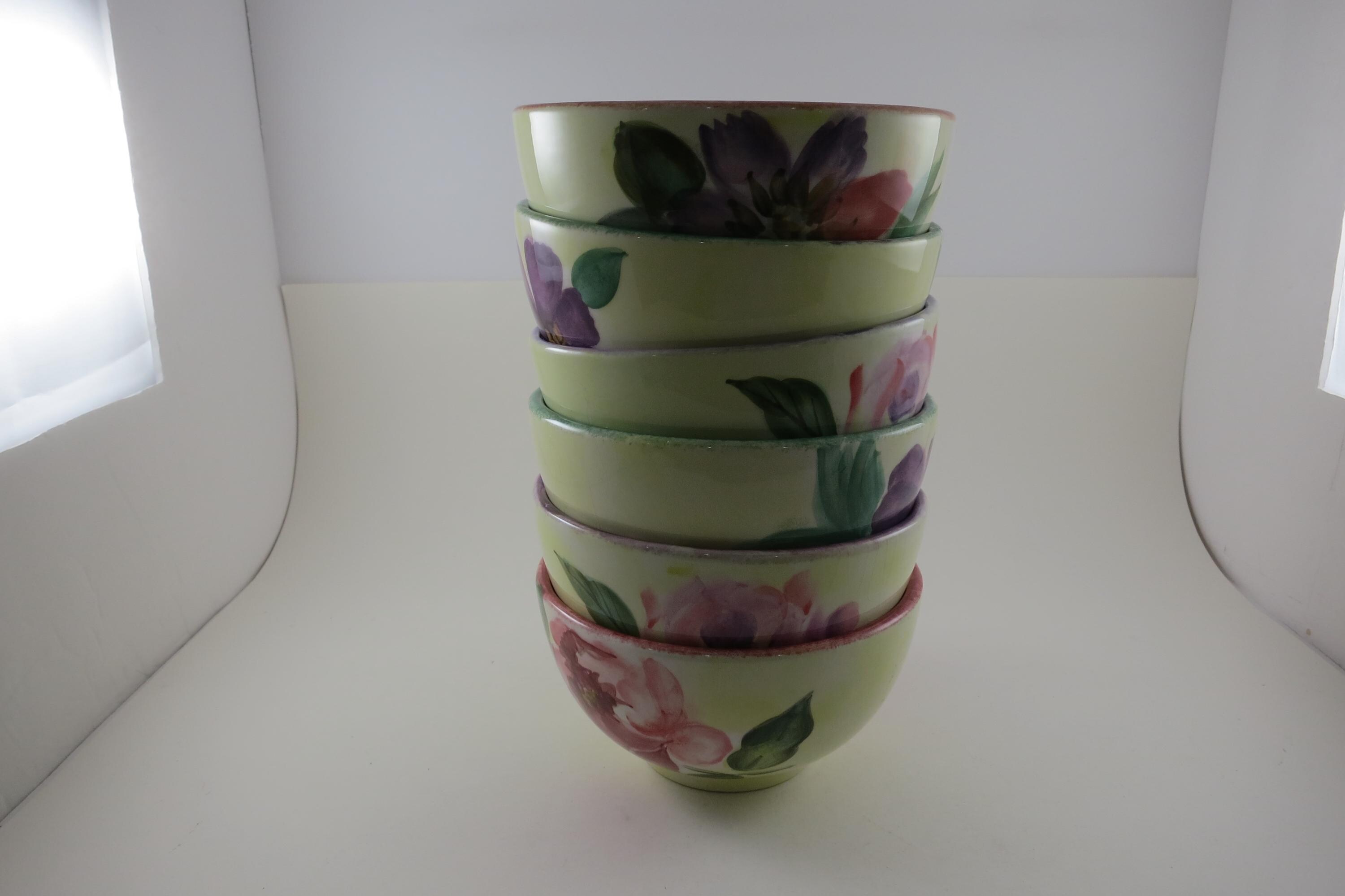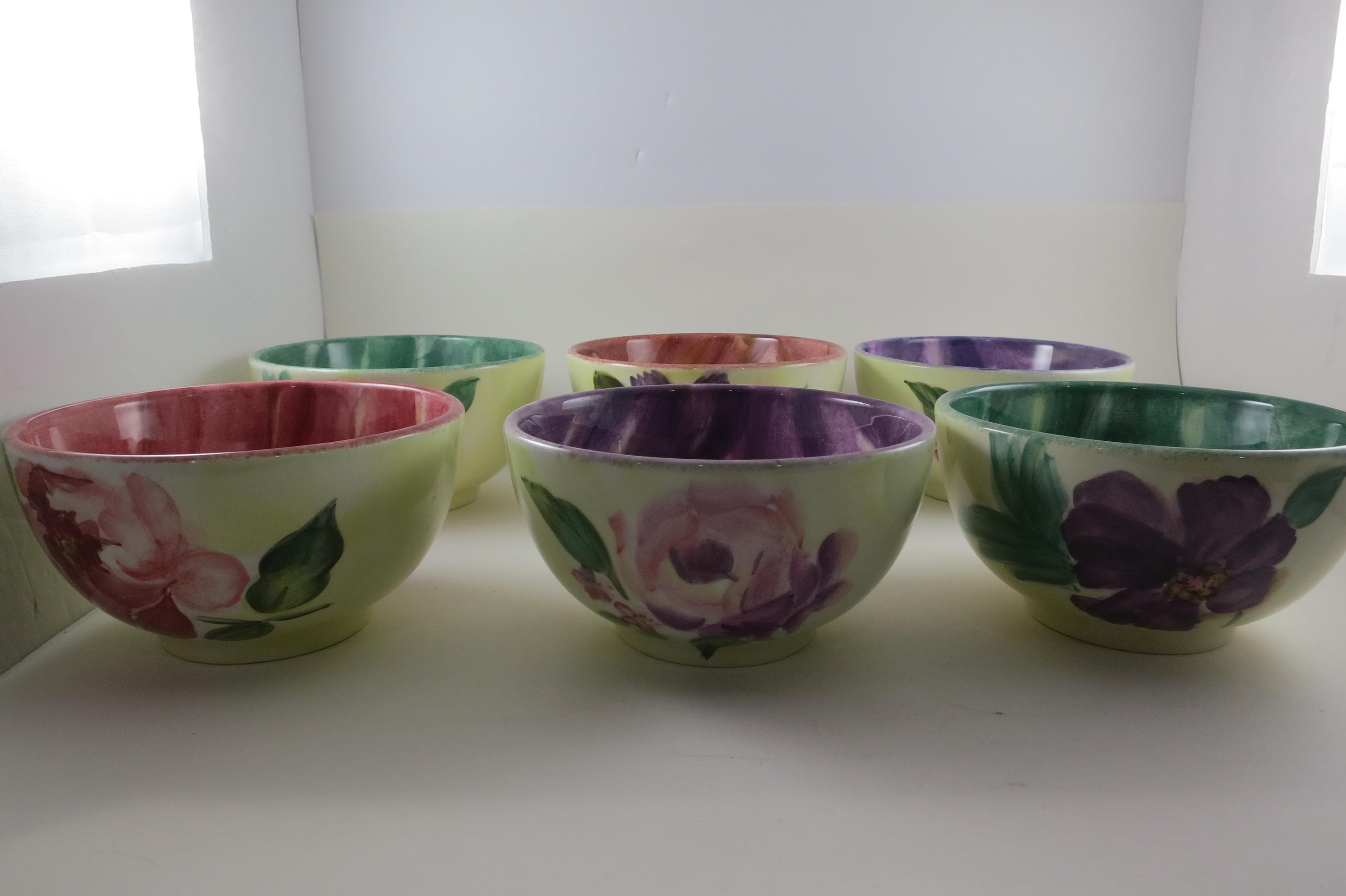 Set of Six Pfaltzgraff Flower Market 6 Inch Soup Bowls 2 Red 2 Green 2 Purple Excellent Used Condition. All six are in excellent condition with no chips, cracks or damages. They measure 6 inches in diameter and 3 1/4 inches tall.