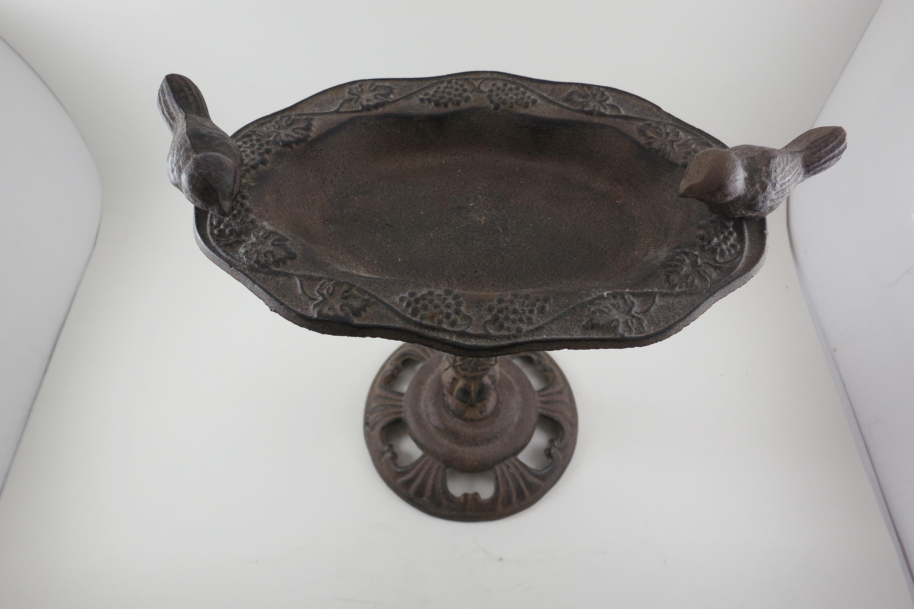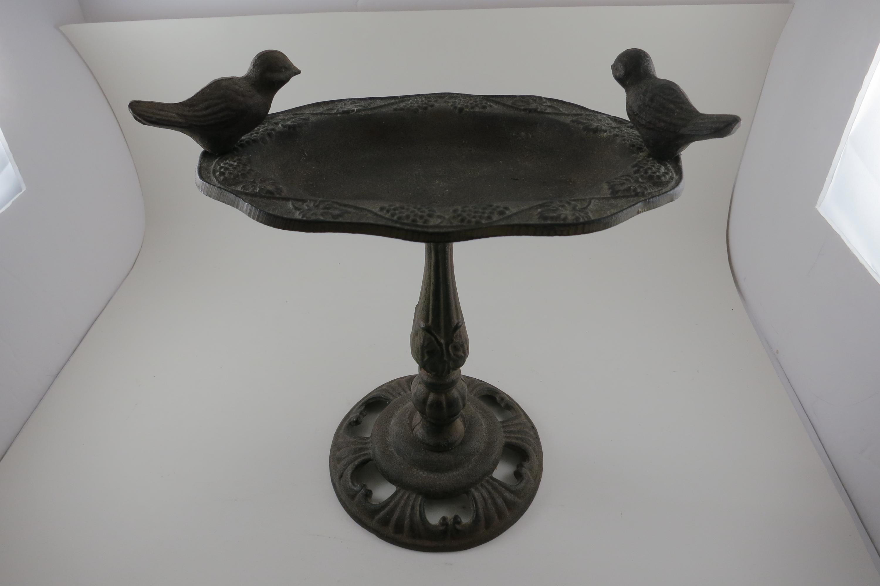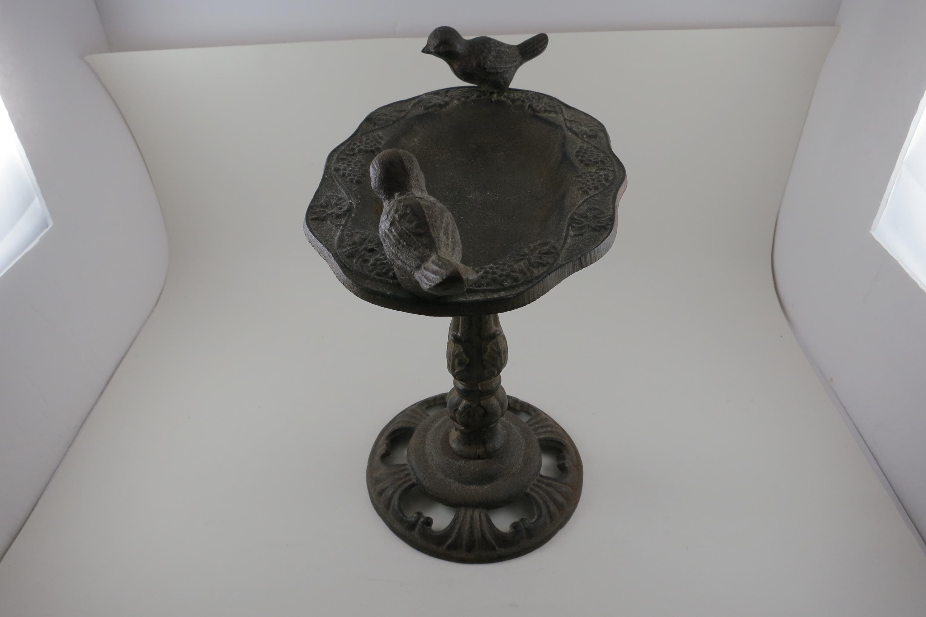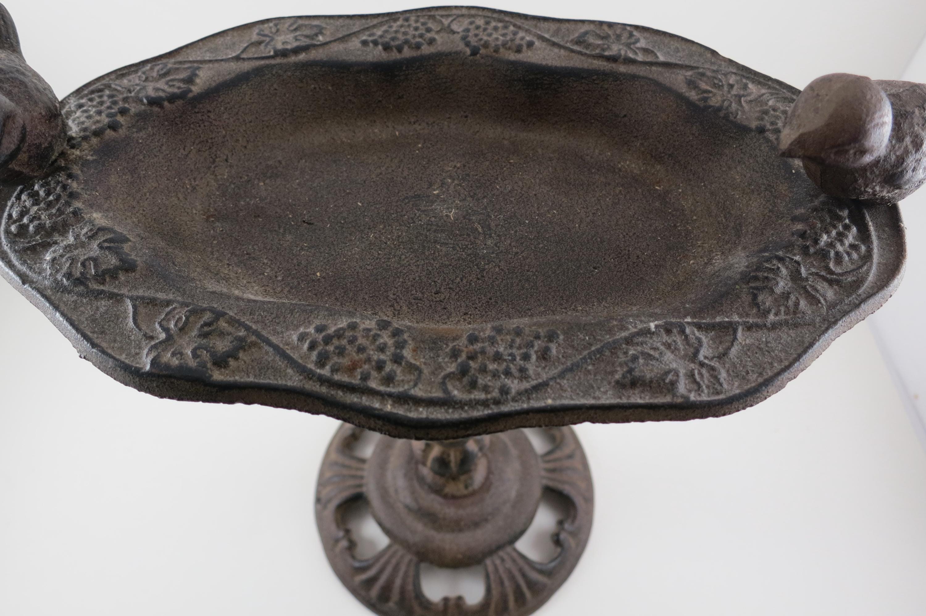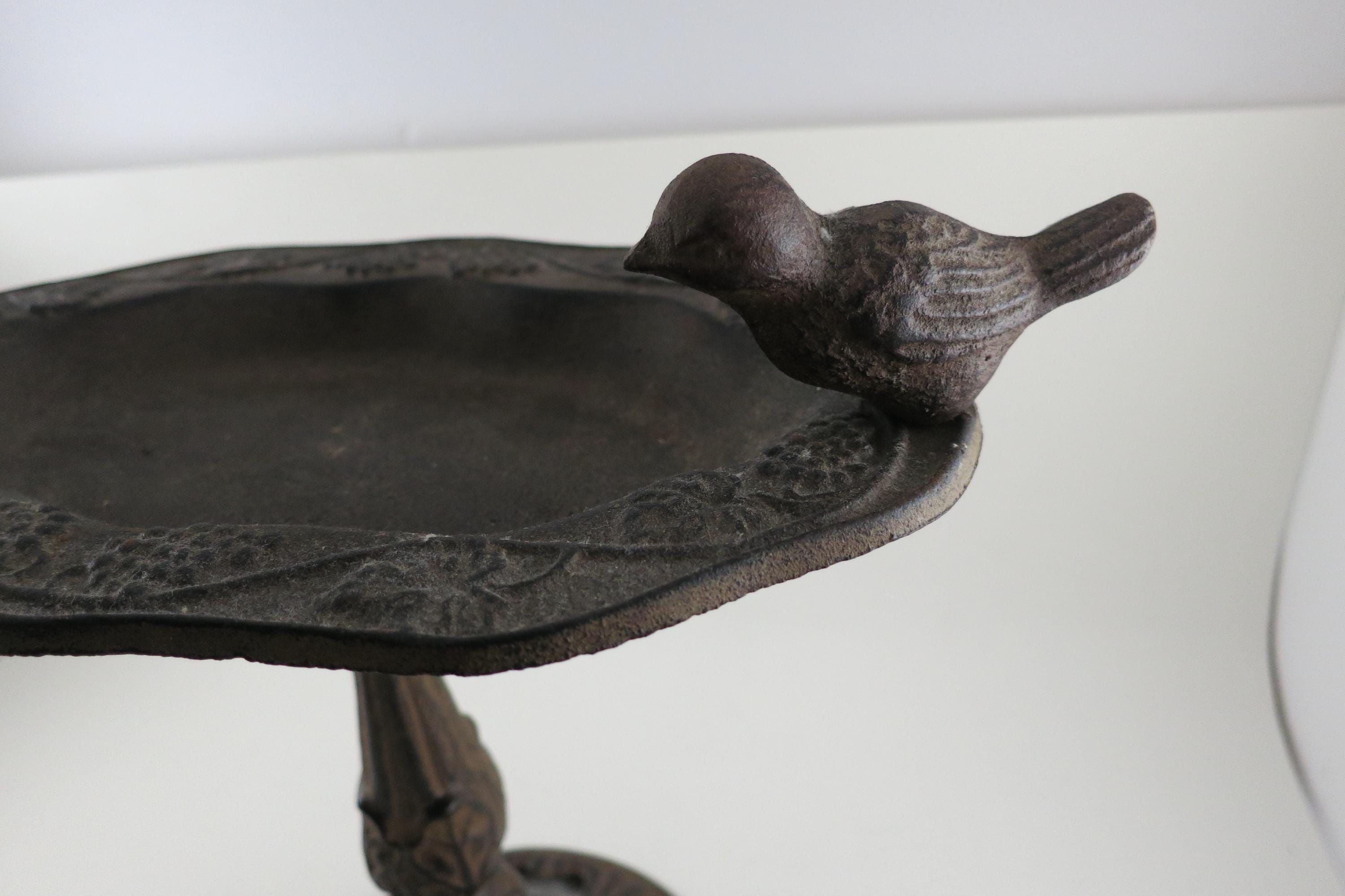 Vintage Cast Metal 1960's French Garden Decor Bird Bath Beautiful Piece 10 Inches Tall. Nice ornate piece, it is 10 1/2 inches wide and in excellent condition with no damages.