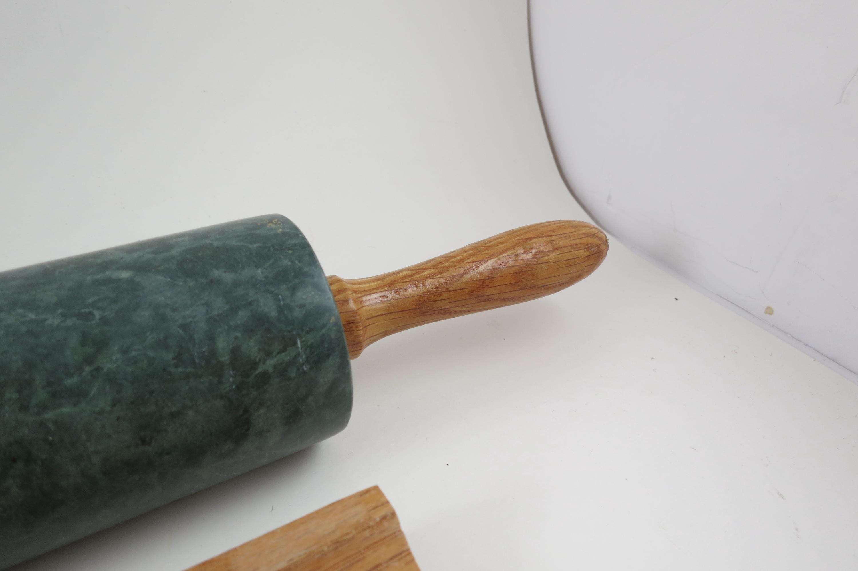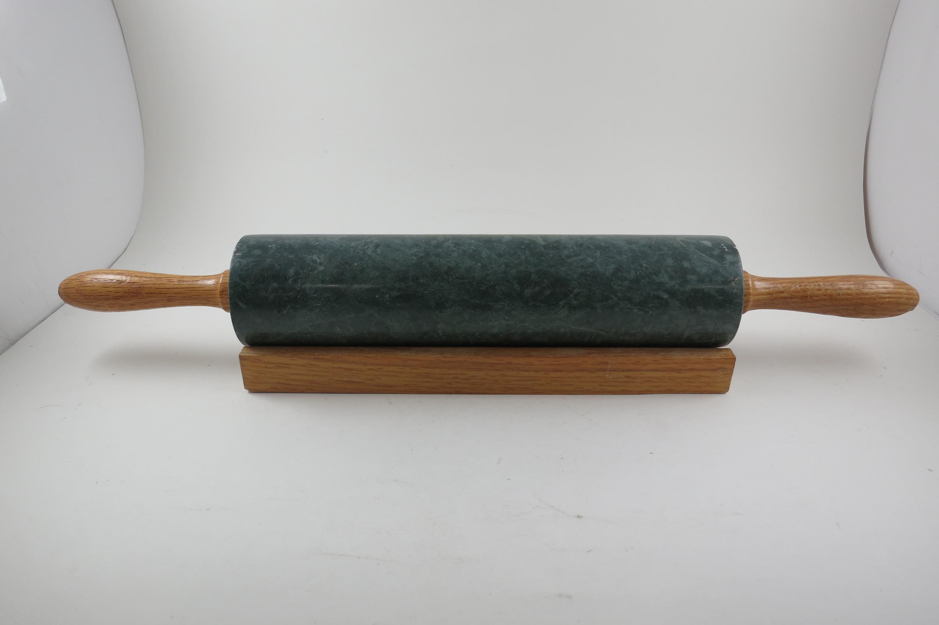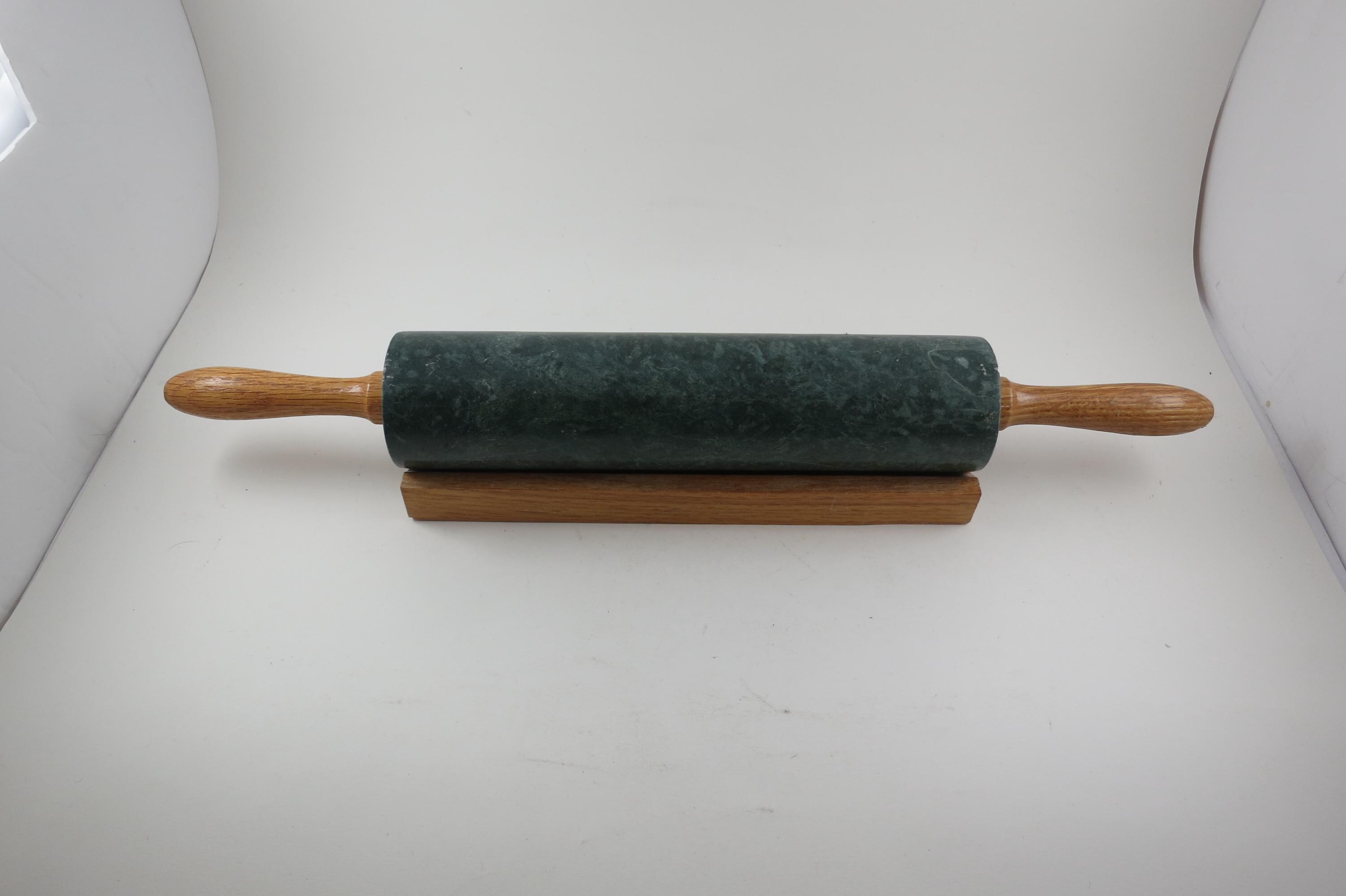 Antique Wooden Green Marble Rolling Pin Excellent Condition with Wooden Stand. Measures 11 inches long, or 18 inches long with the handles included.