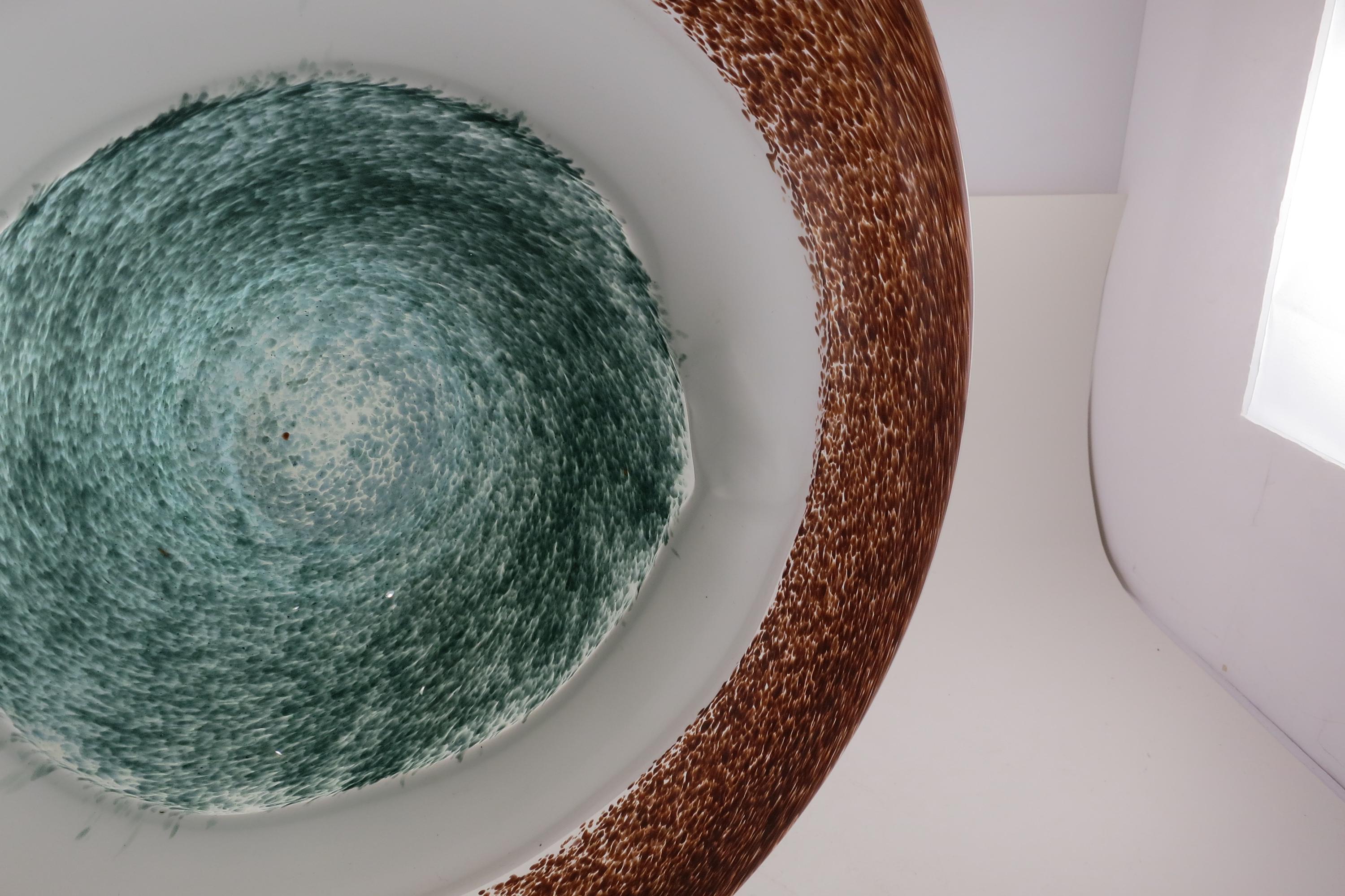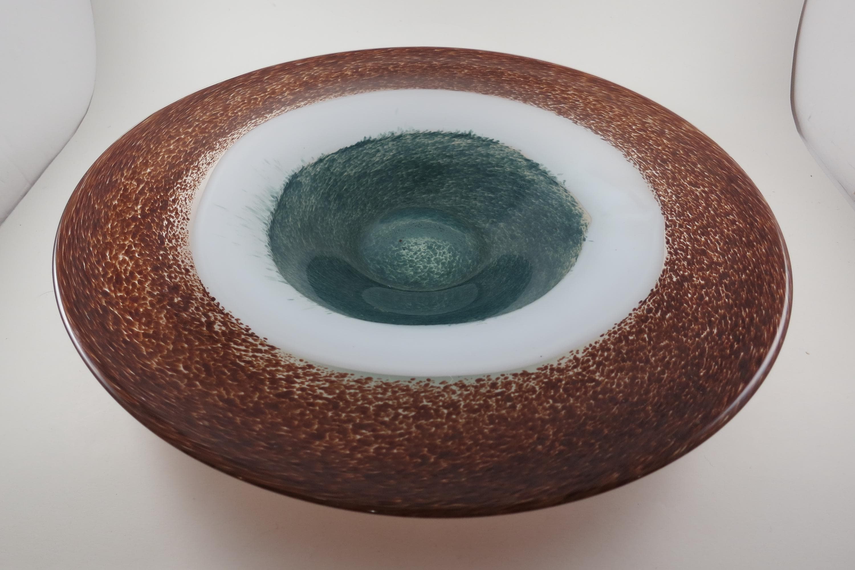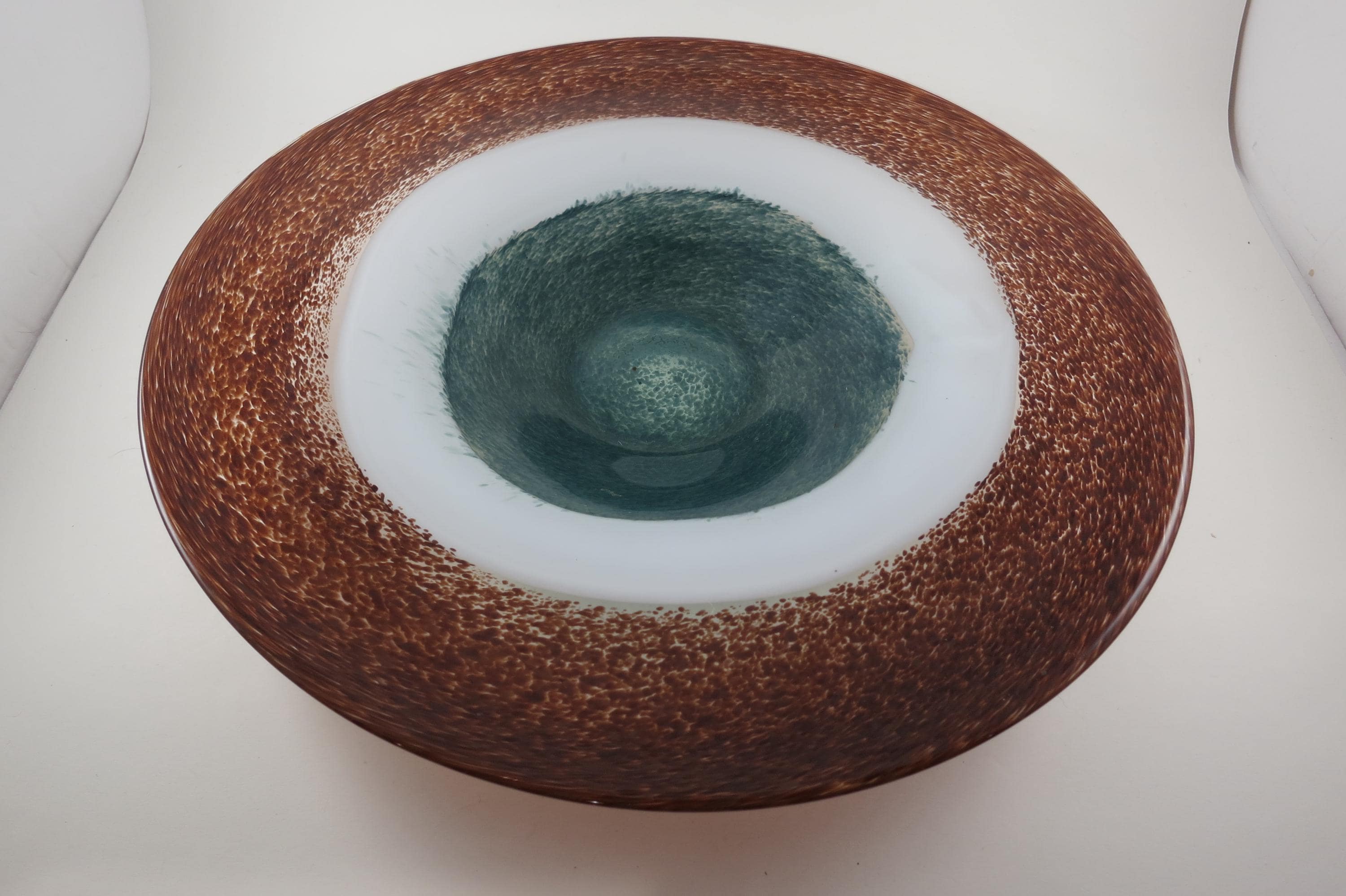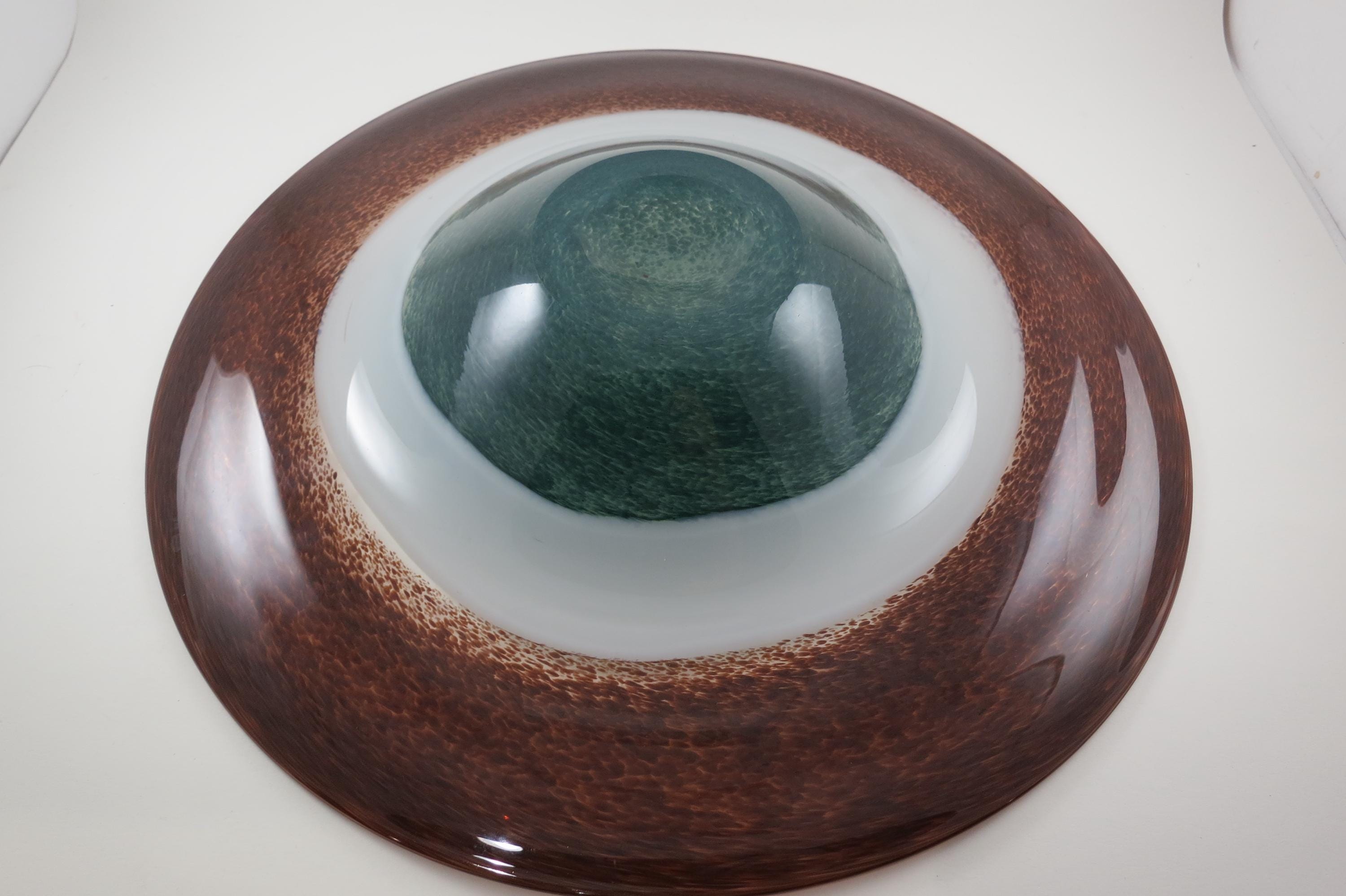 14 1/4 Inch Massive Round Art Glass "Eye" Center Display Bowl Pristine Condition. No damages, very nice piece that displays wonderfully, though it is a little "different". Measures large 14 1/4 inches in diameter. Has brown glass around the edges, white in the middle and green in the center, giving it the illusion of a large eye! Very unique and unusual piece in Pristine condition with no damages.