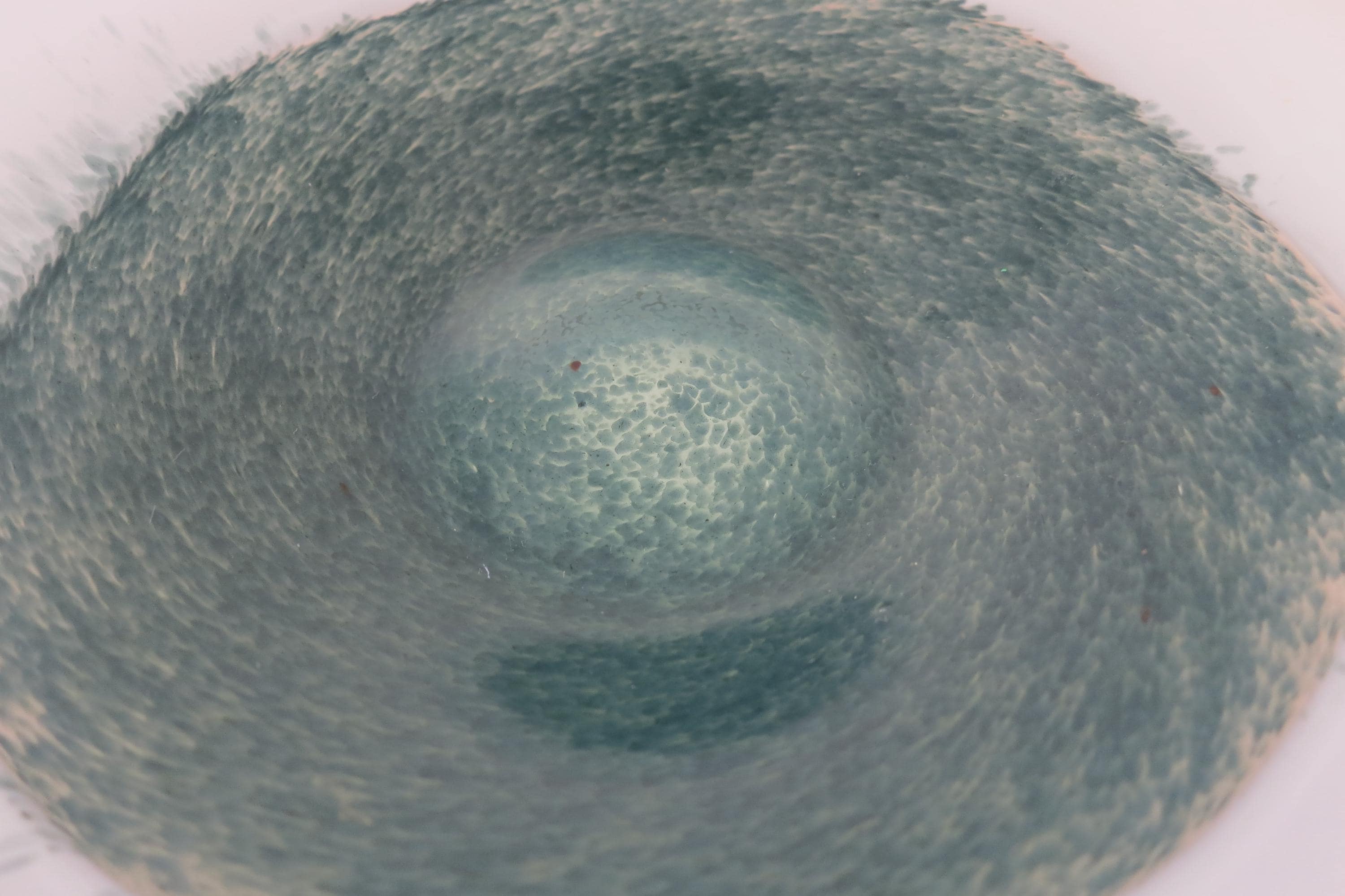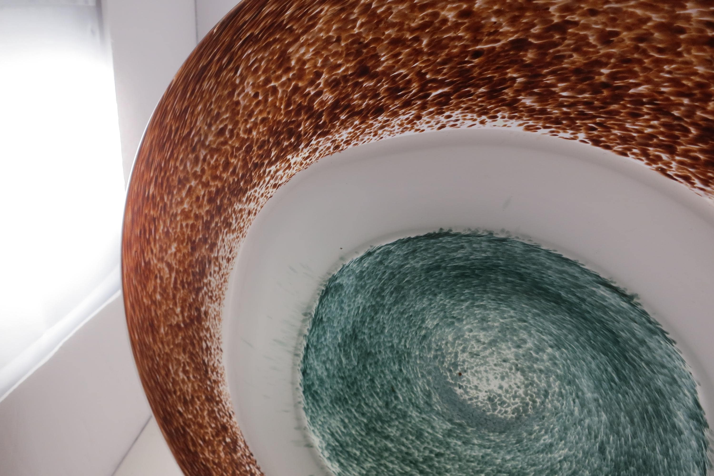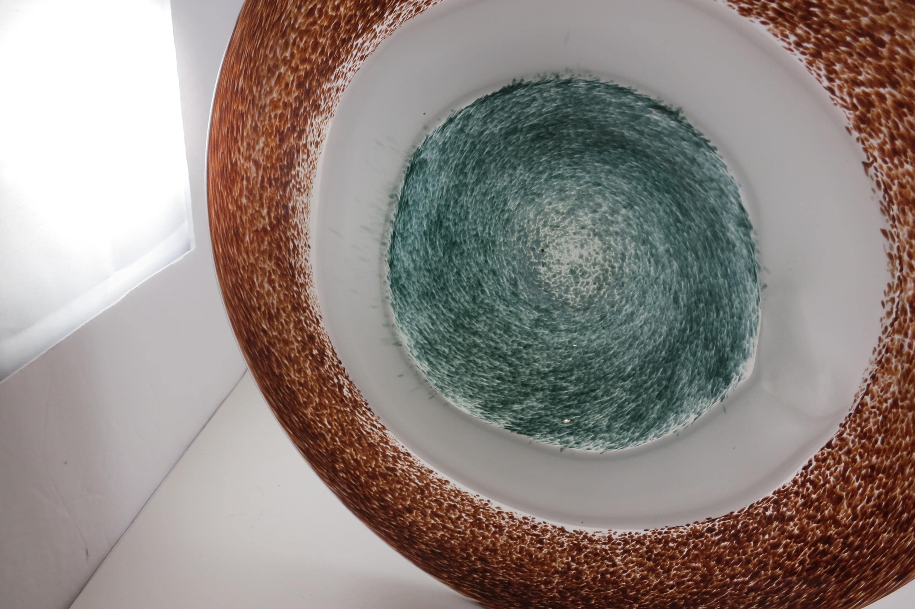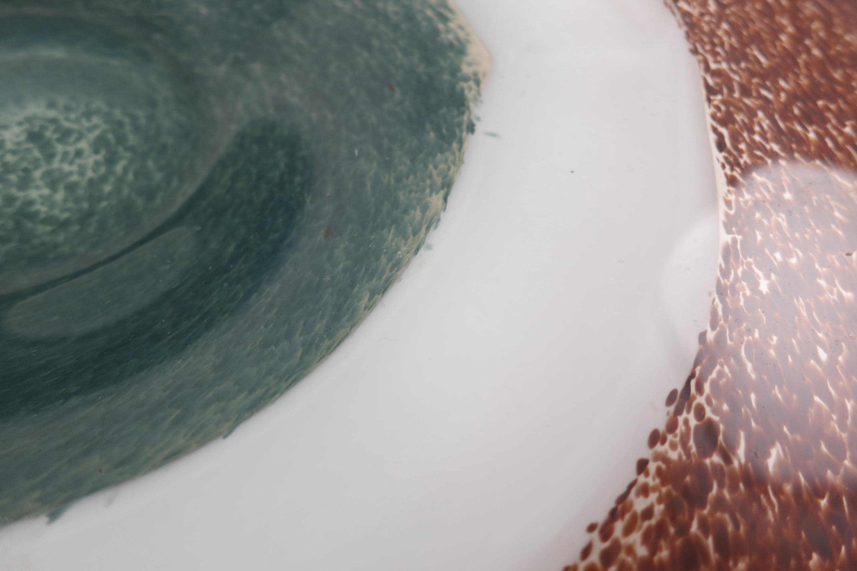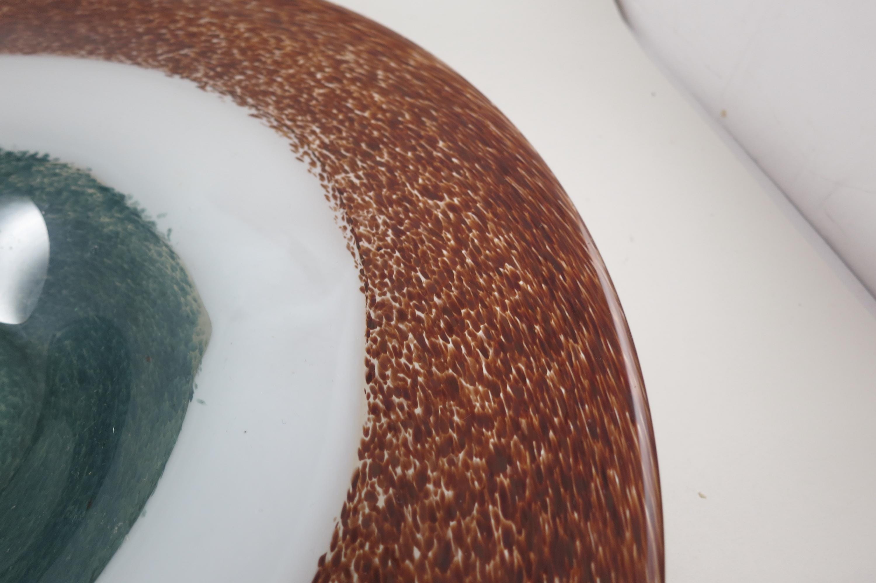 14 1/4 Inch Massive Round Art Glass "Eye" Center Display Bowl Pristine Condition. No damages, very nice piece that displays wonderfully, though it is a little "different". Measures large 14 1/4 inches in diameter. Has brown glass around the edges, white in the middle and green in the center, giving it the illusion of a large eye! Very unique and unusual piece in Pristine condition with no damages.