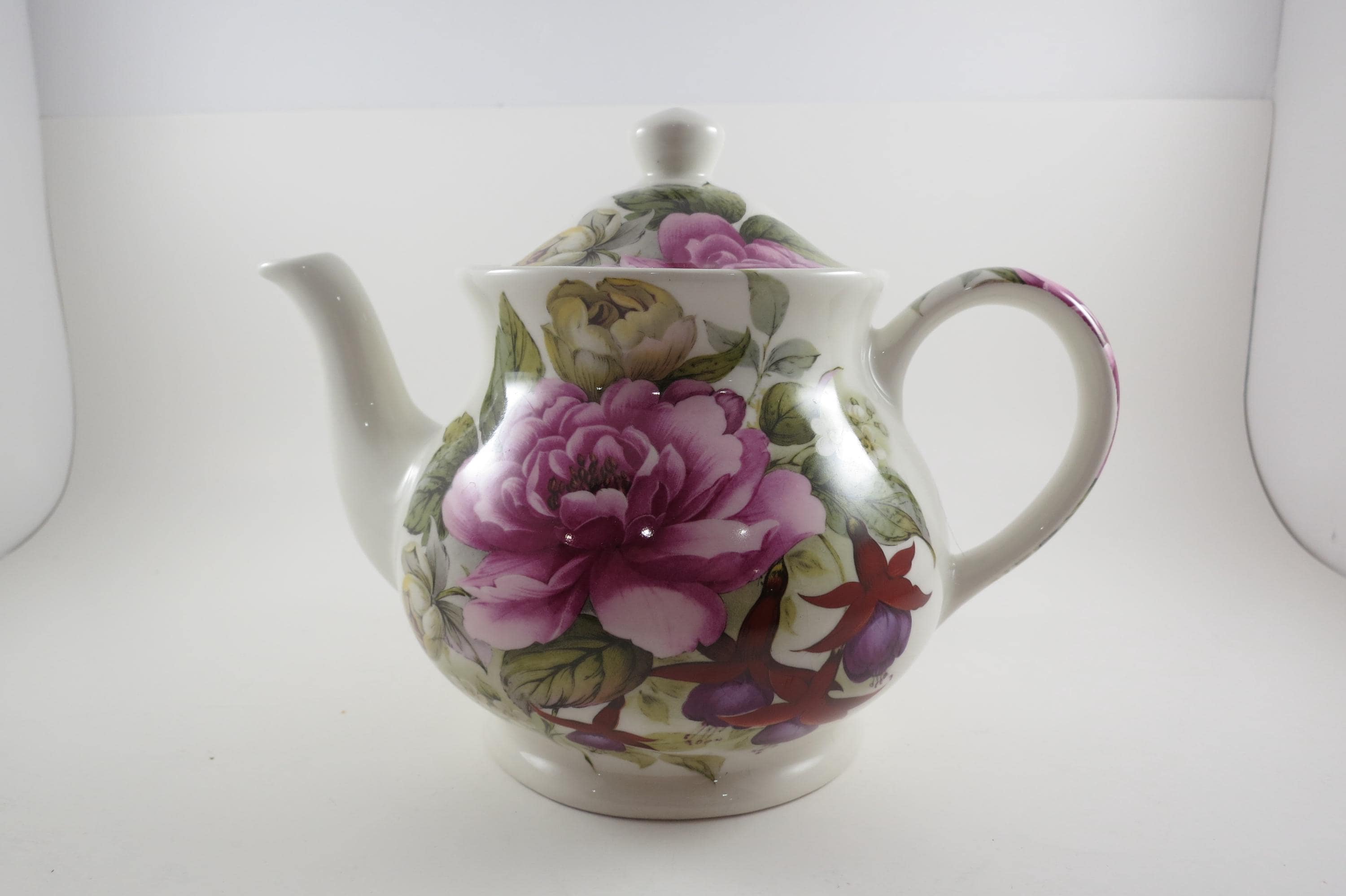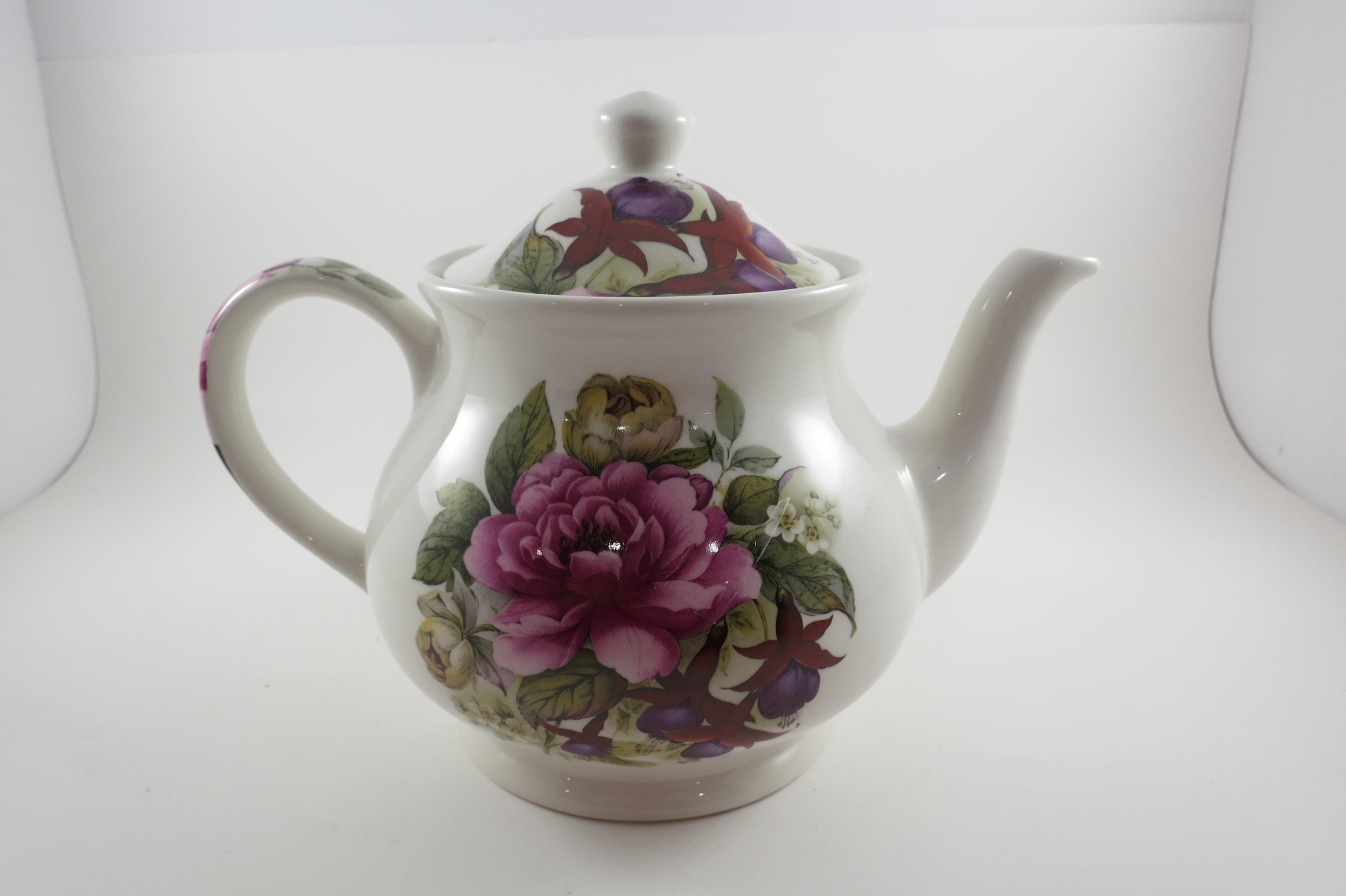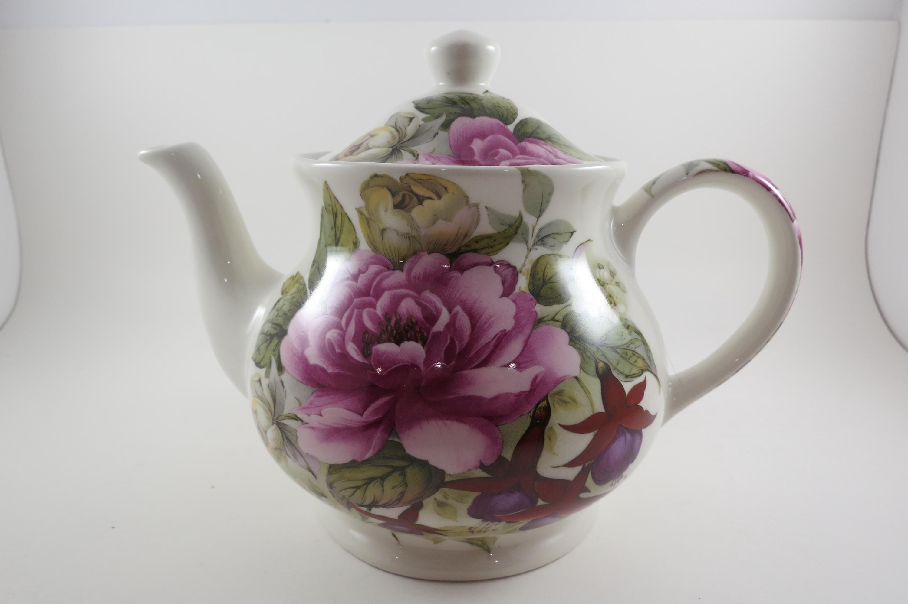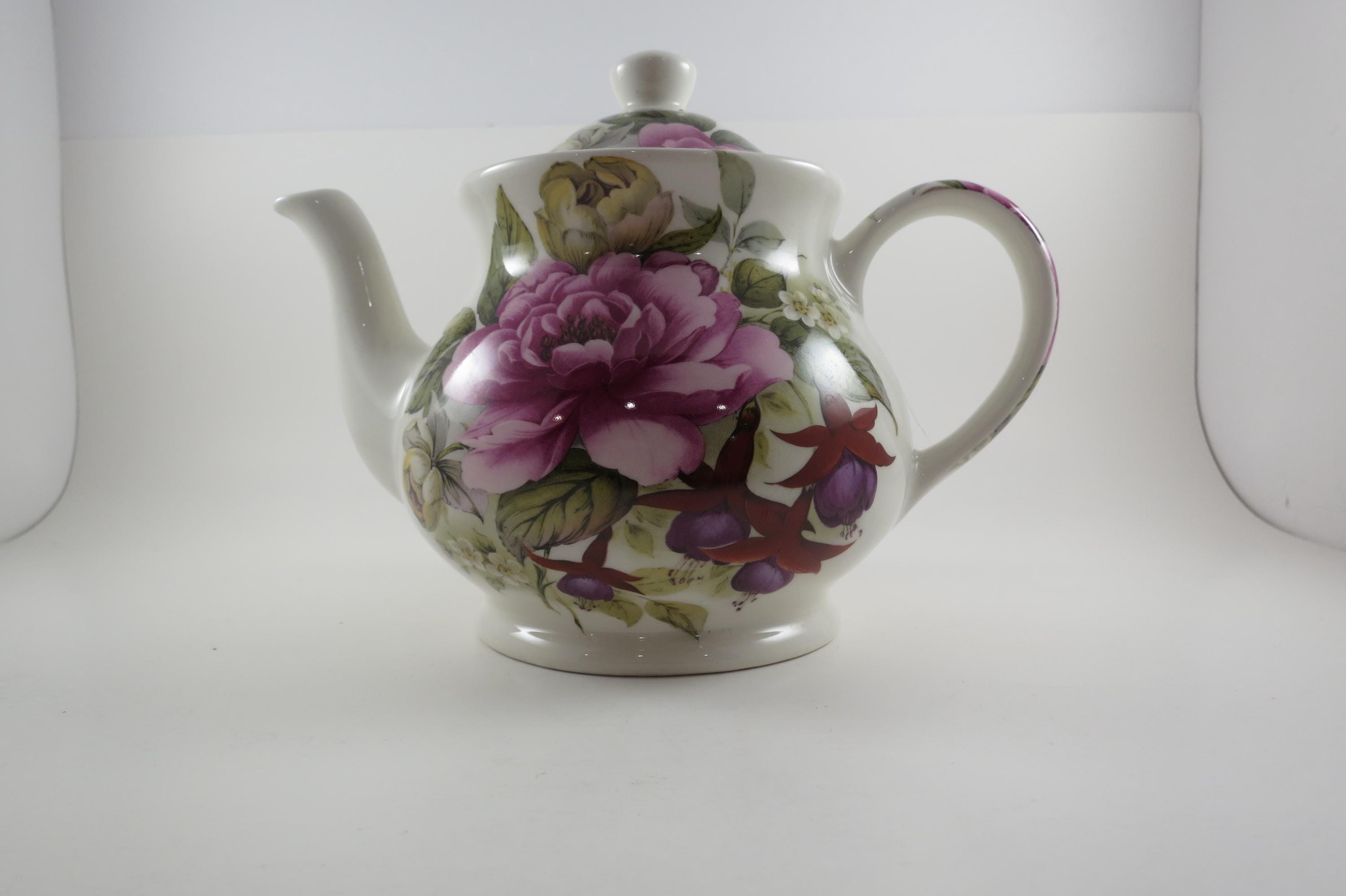 Vintage Sadler Windsor England China Teapot with Lid Peonies and Fuchsia Pristine Condition. Beautiful teapot measuring 9 inches wide and 7 inches tall. No damages, displays very nicely!