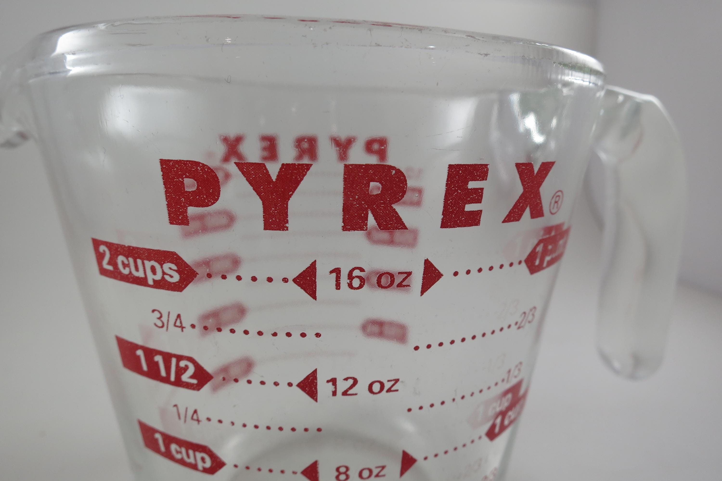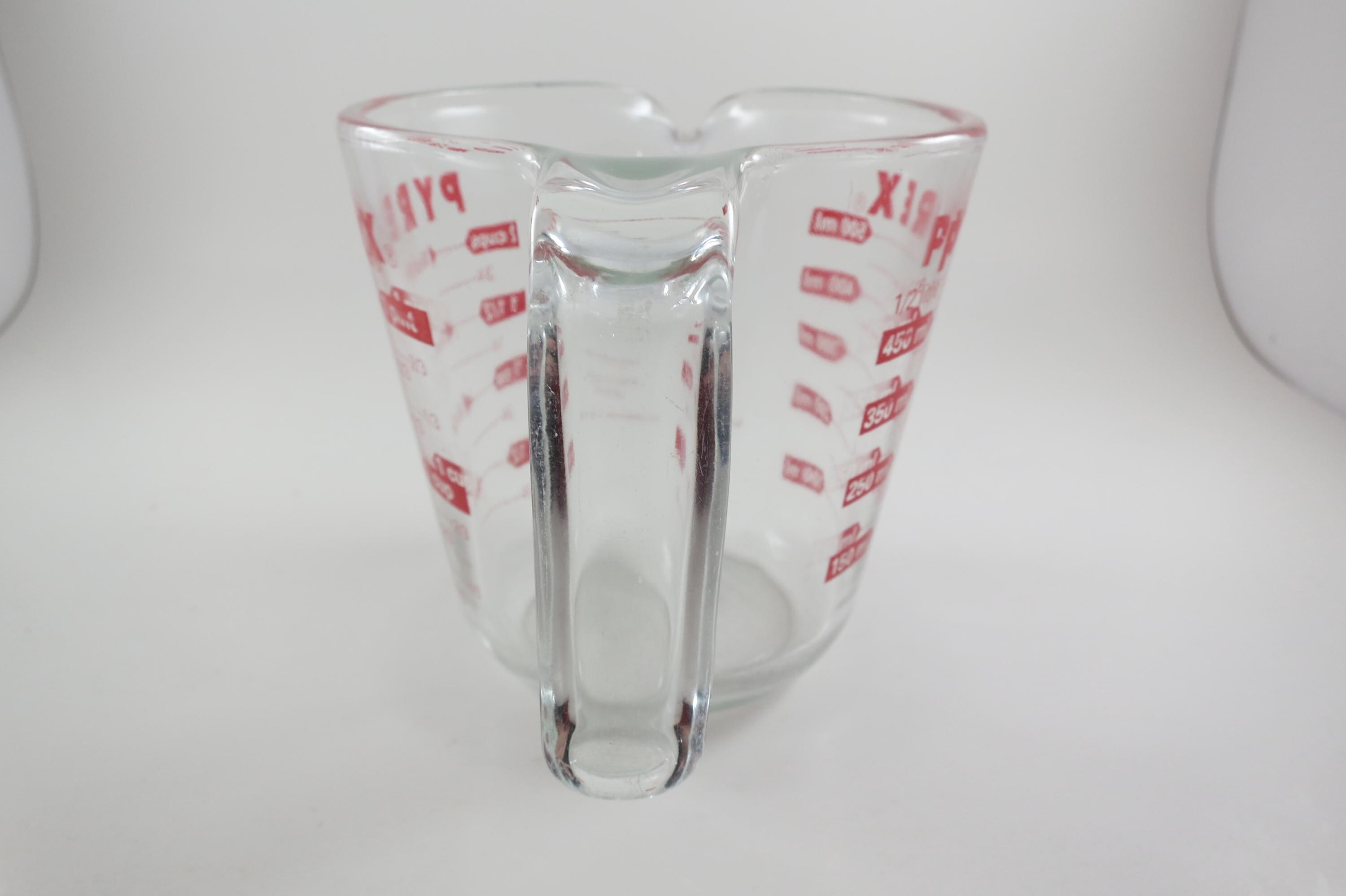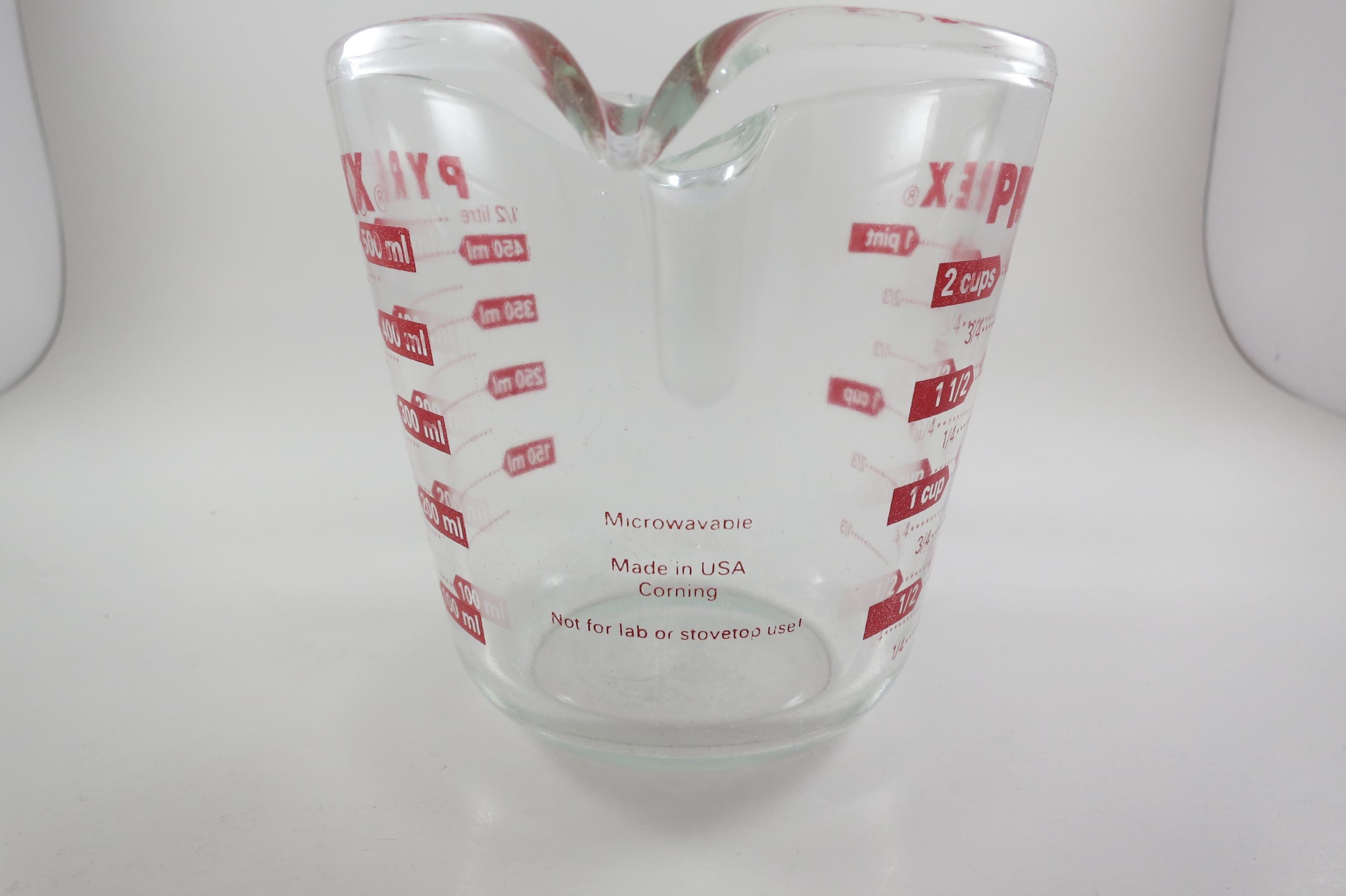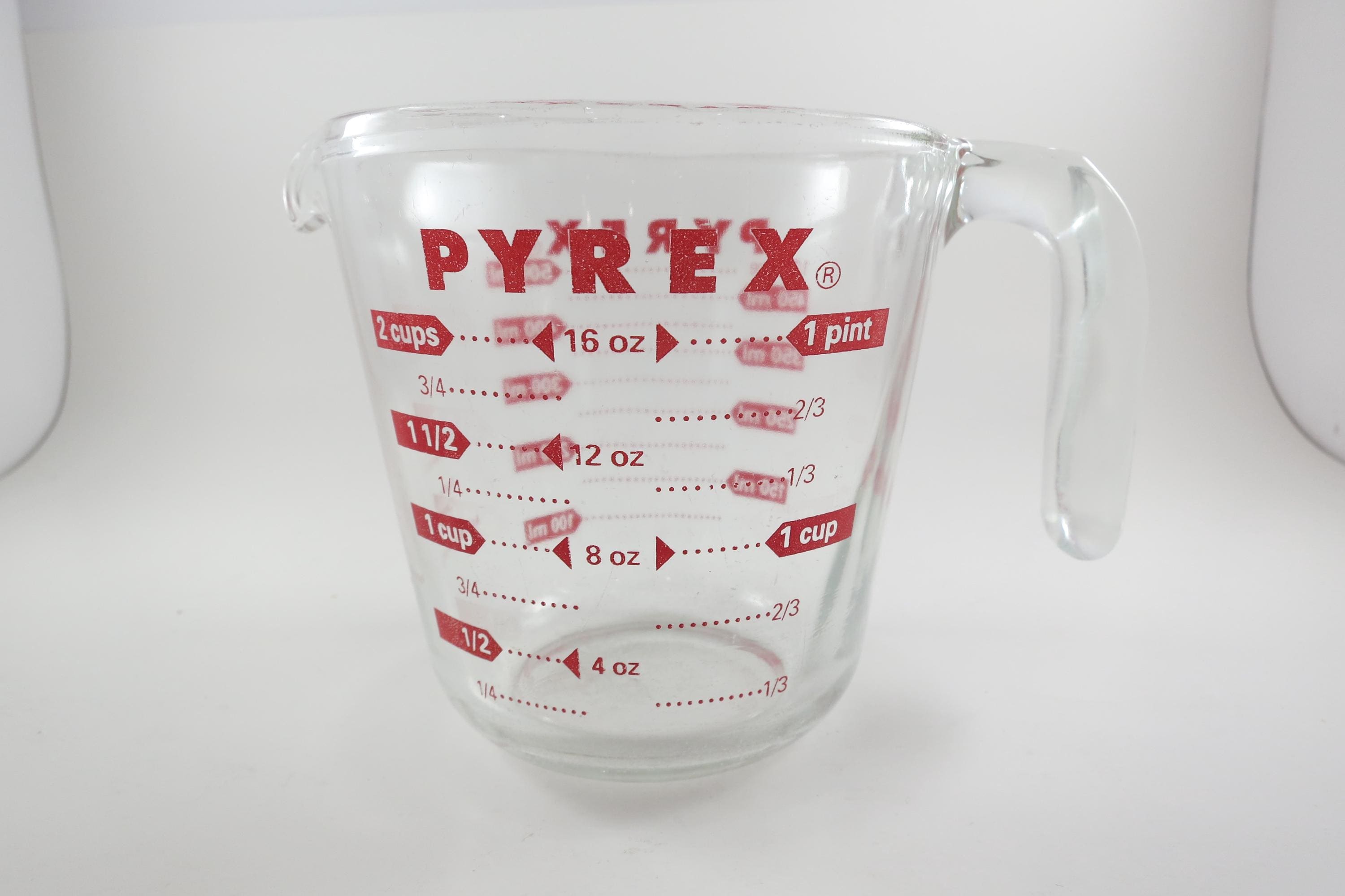Vintage Red Letter Pyrex 2 Cup Measuring Cup with Handle Excellent Condition, no chips, cracks or damages. Has use wear on the bottom.