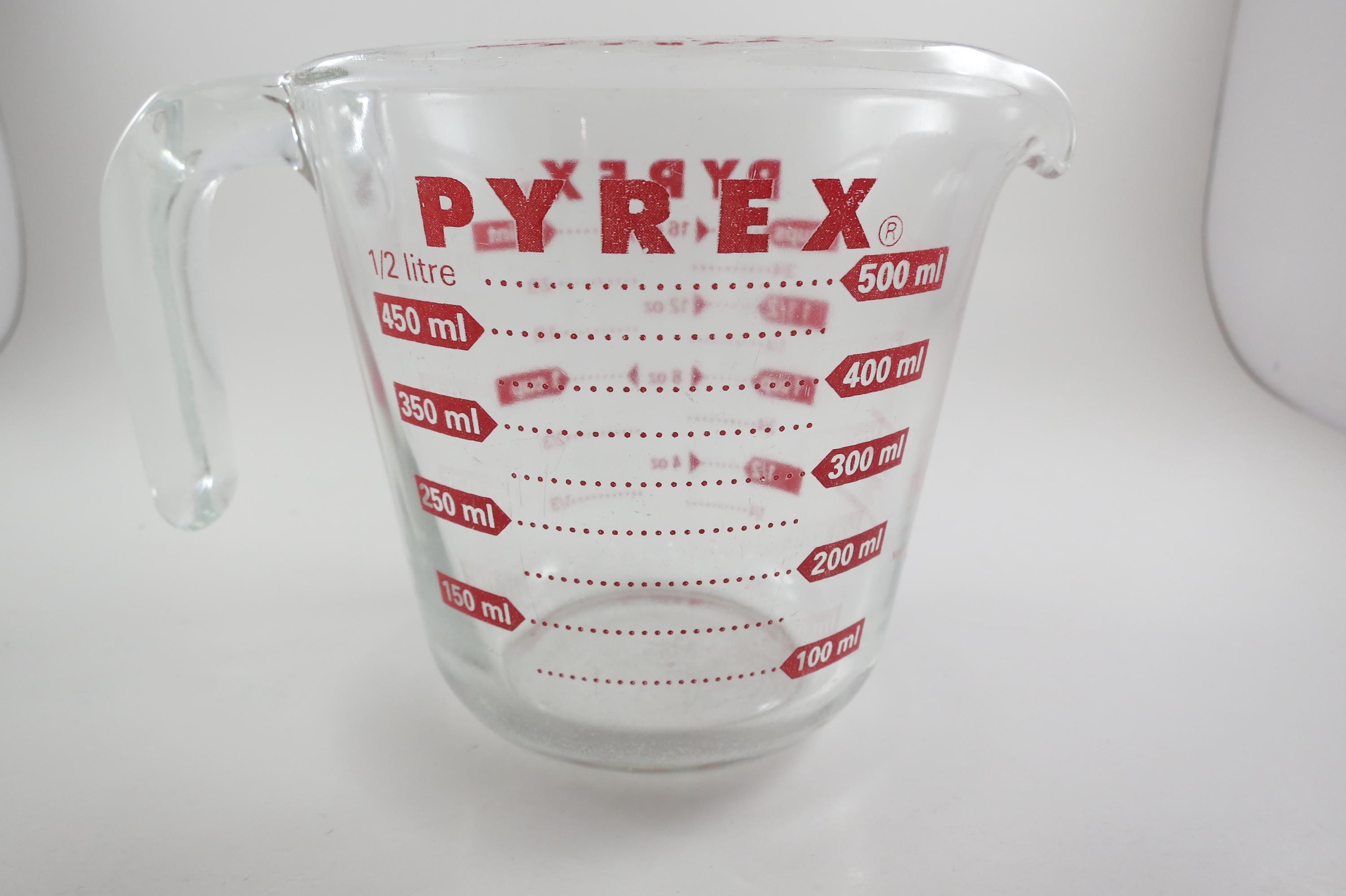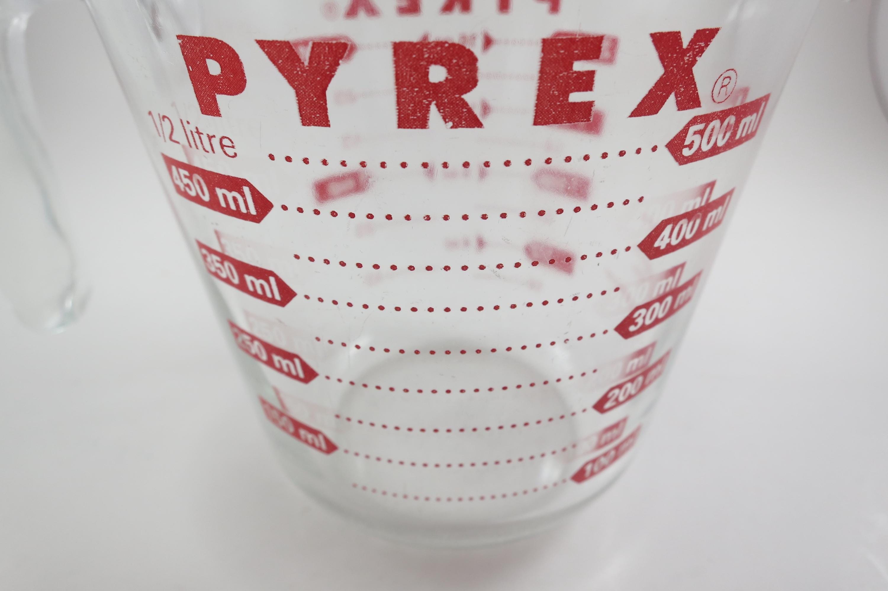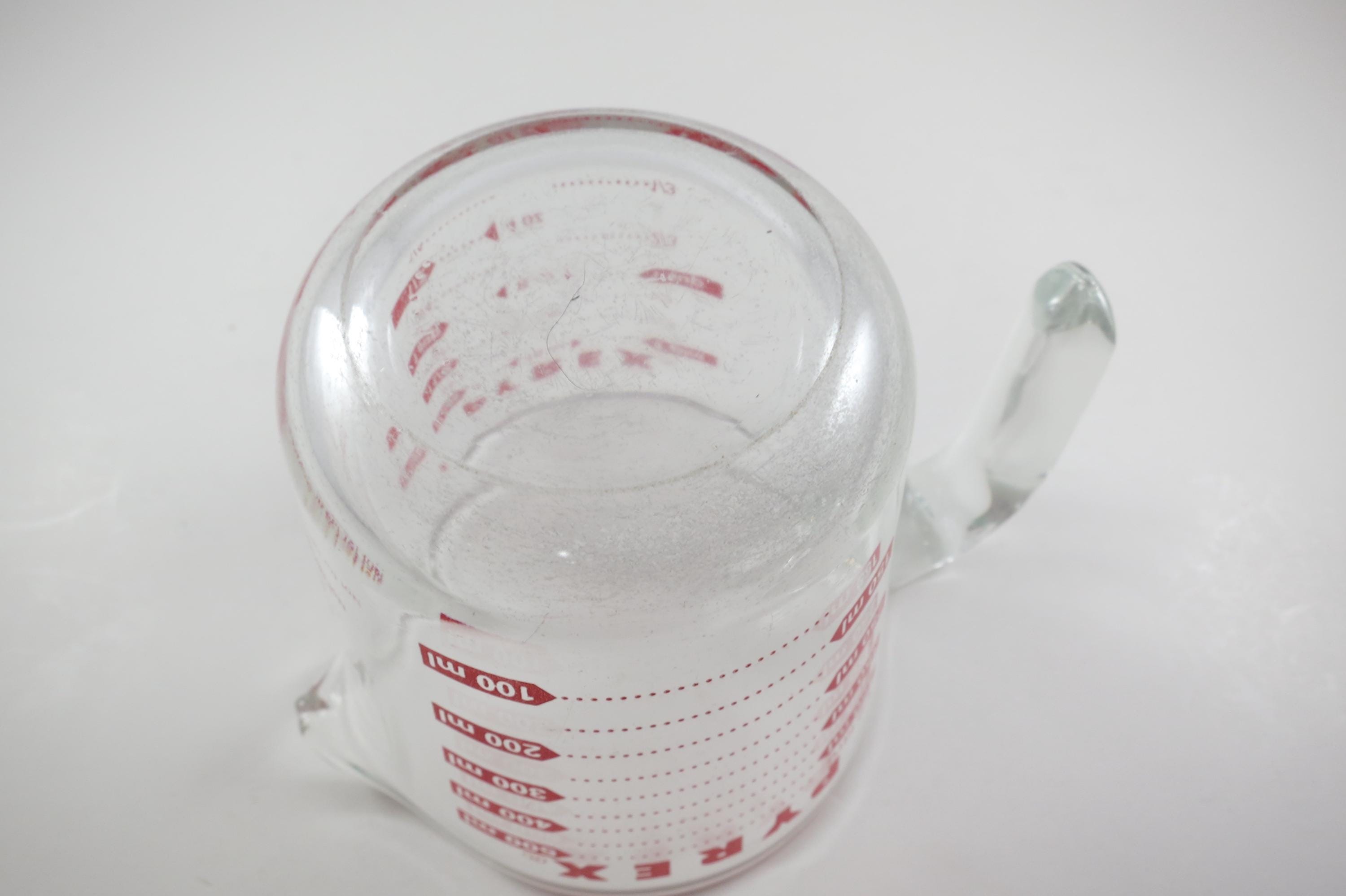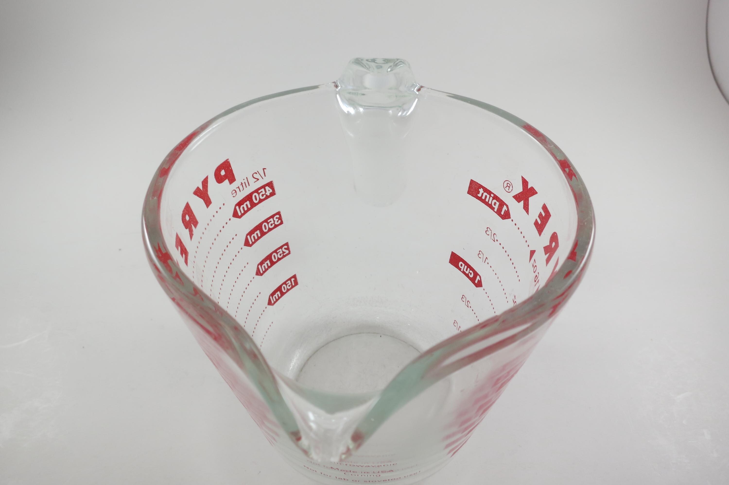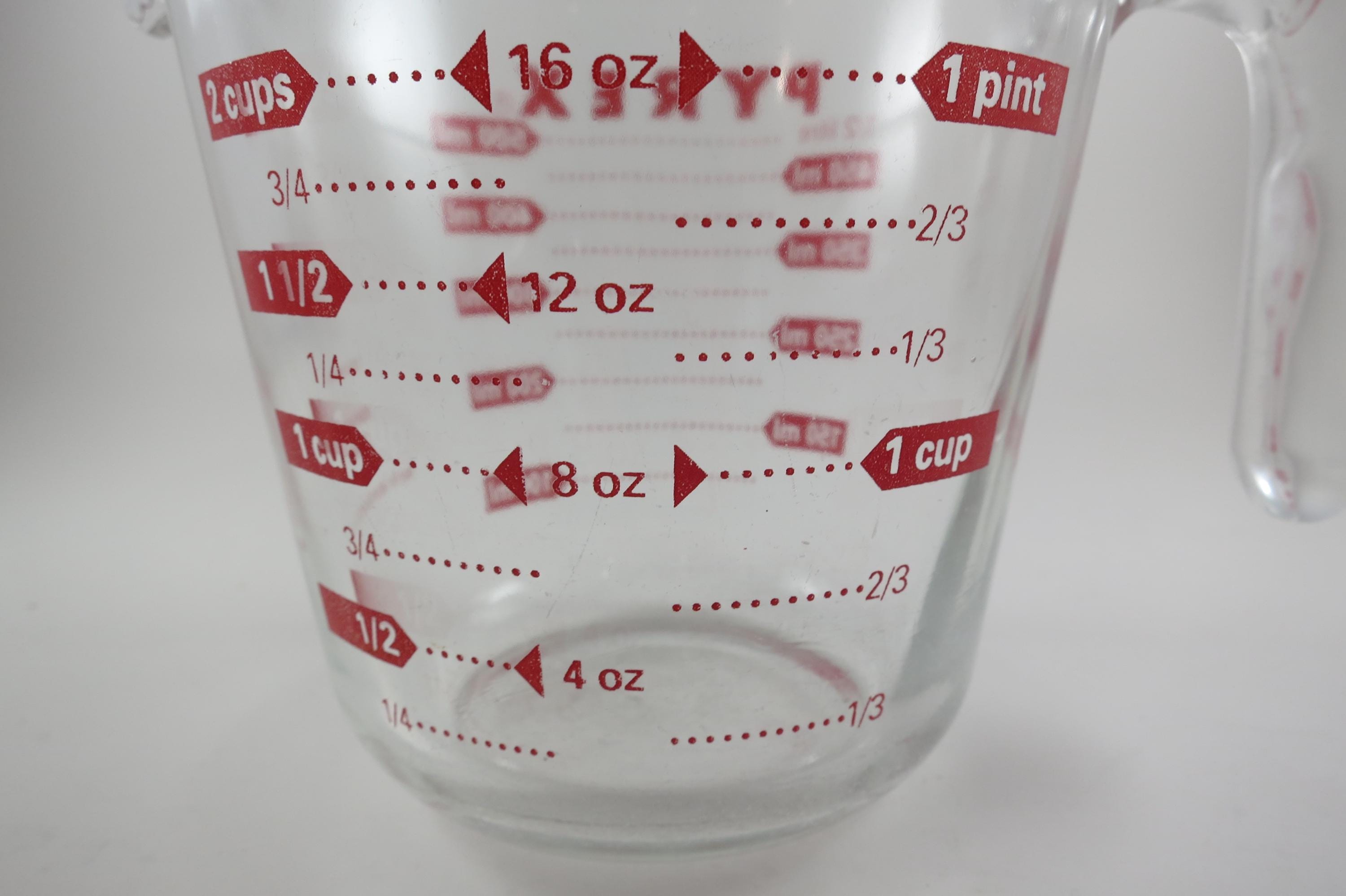 Vintage Red Letter Pyrex 2 Cup Measuring Cup with Handle Excellent Condition, no chips, cracks or damages. Has use wear on the bottom.