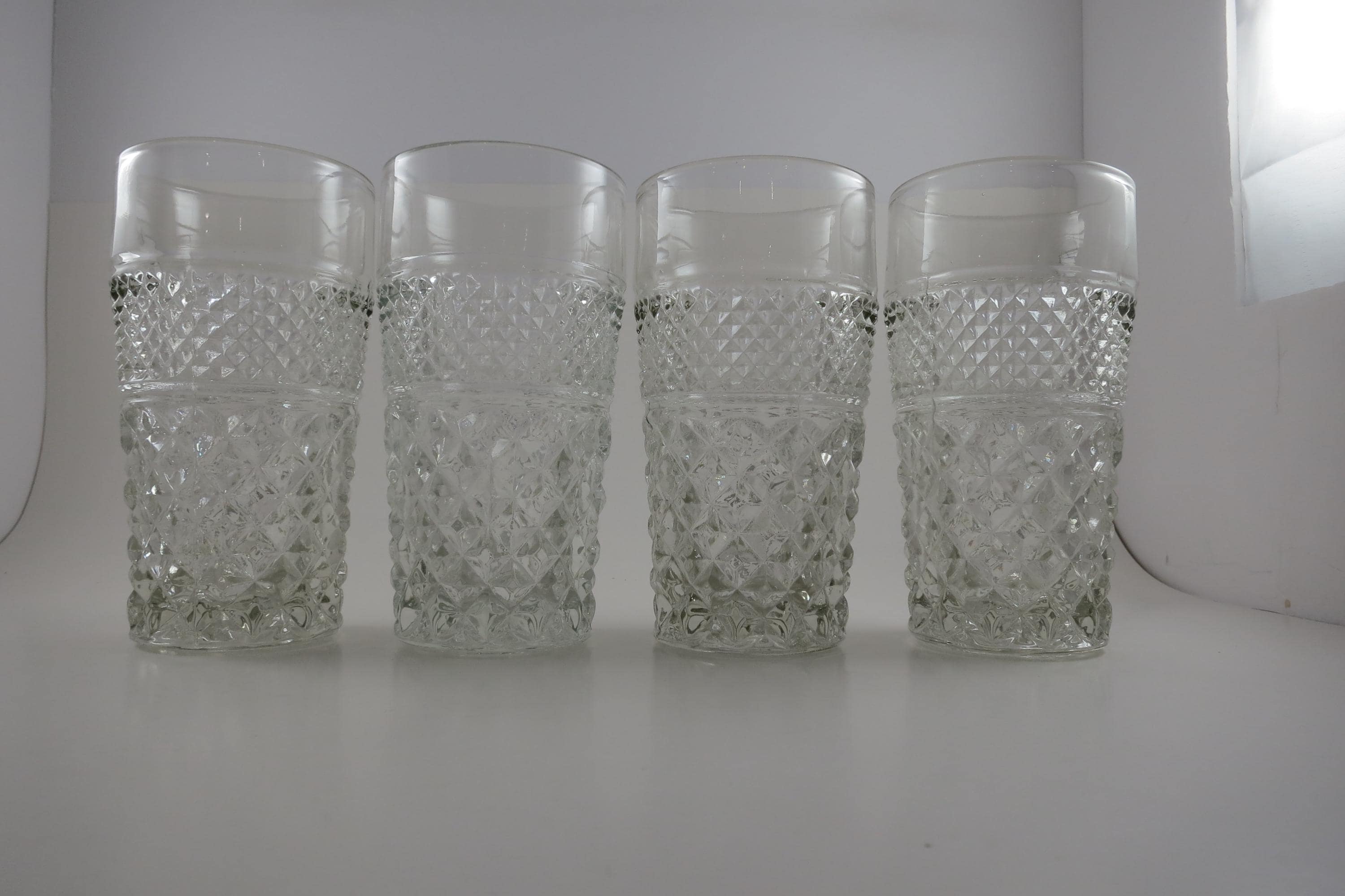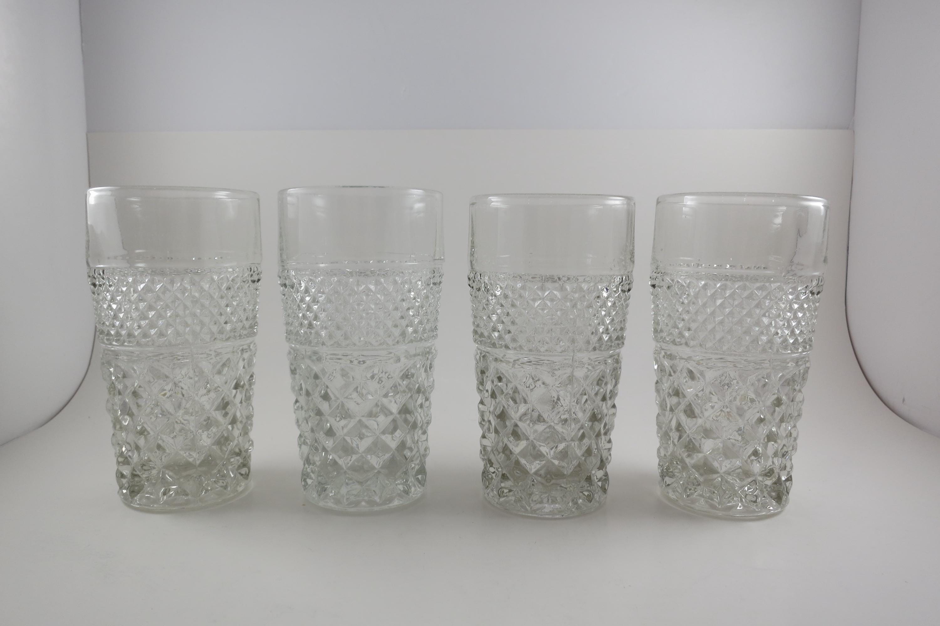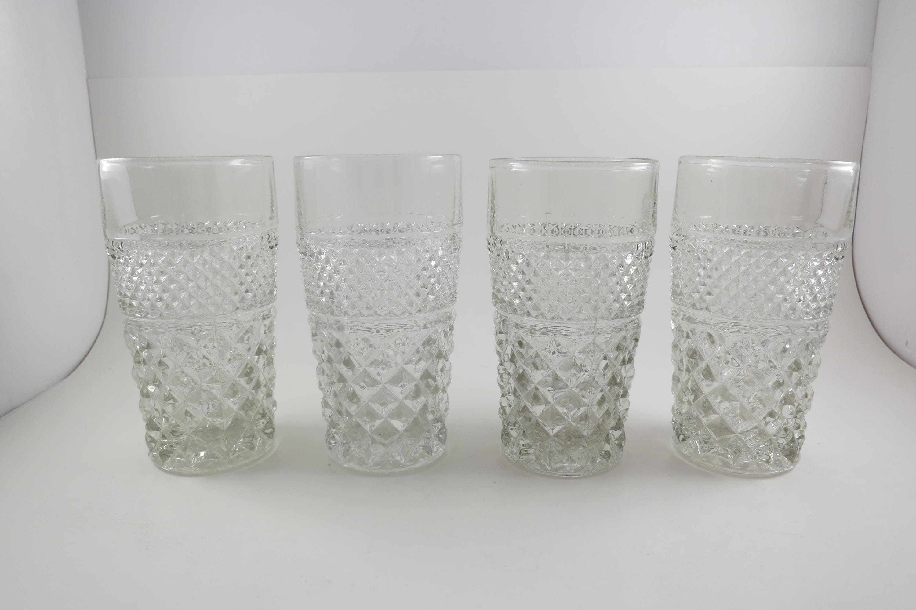 Set of Four Vintage Anchor Hocking Wexford 5 1/2 Inch 11 Ounce Flat Tumblers Clear Cut Diamond Pattern.