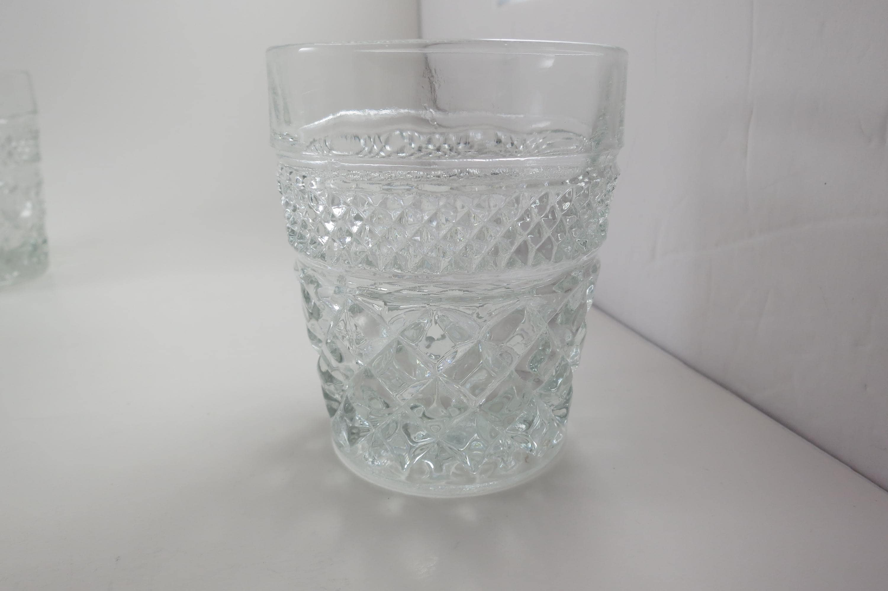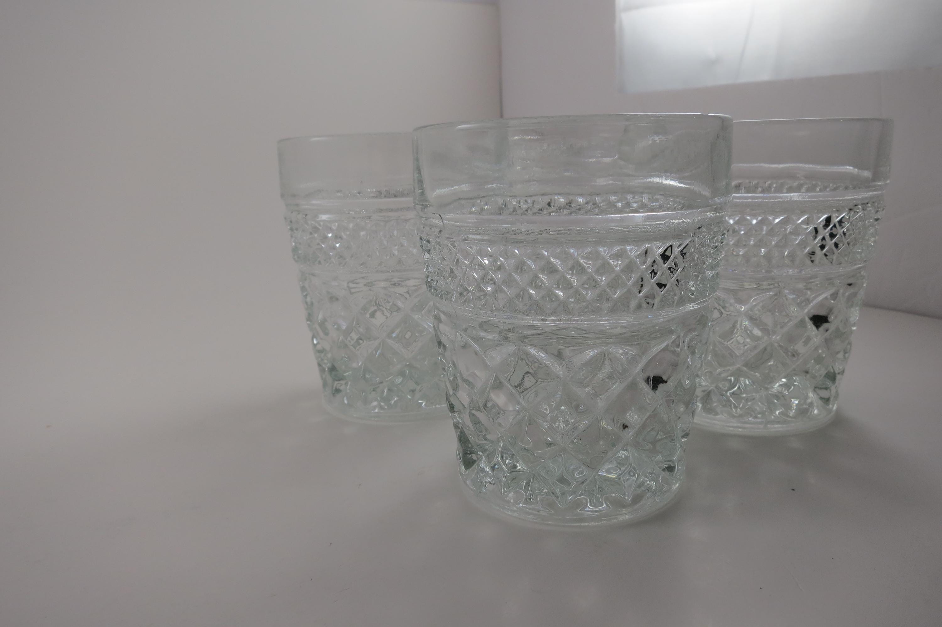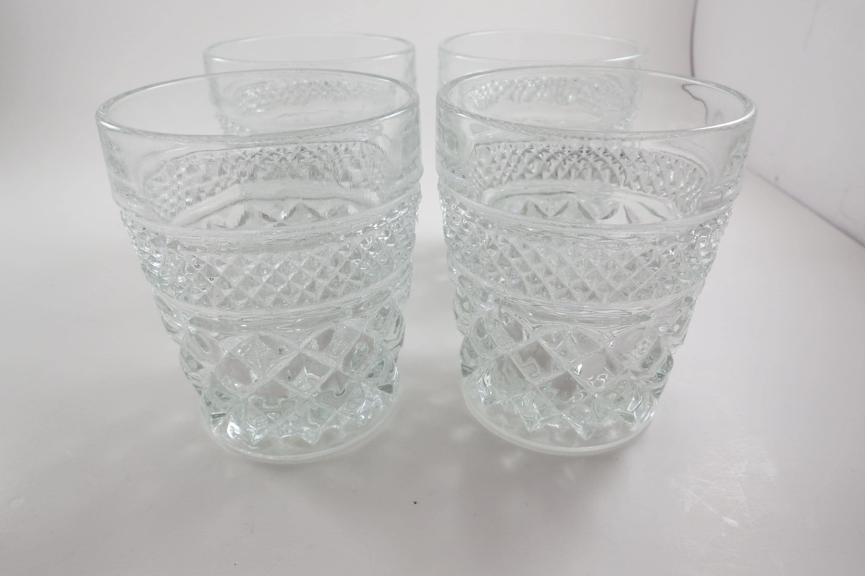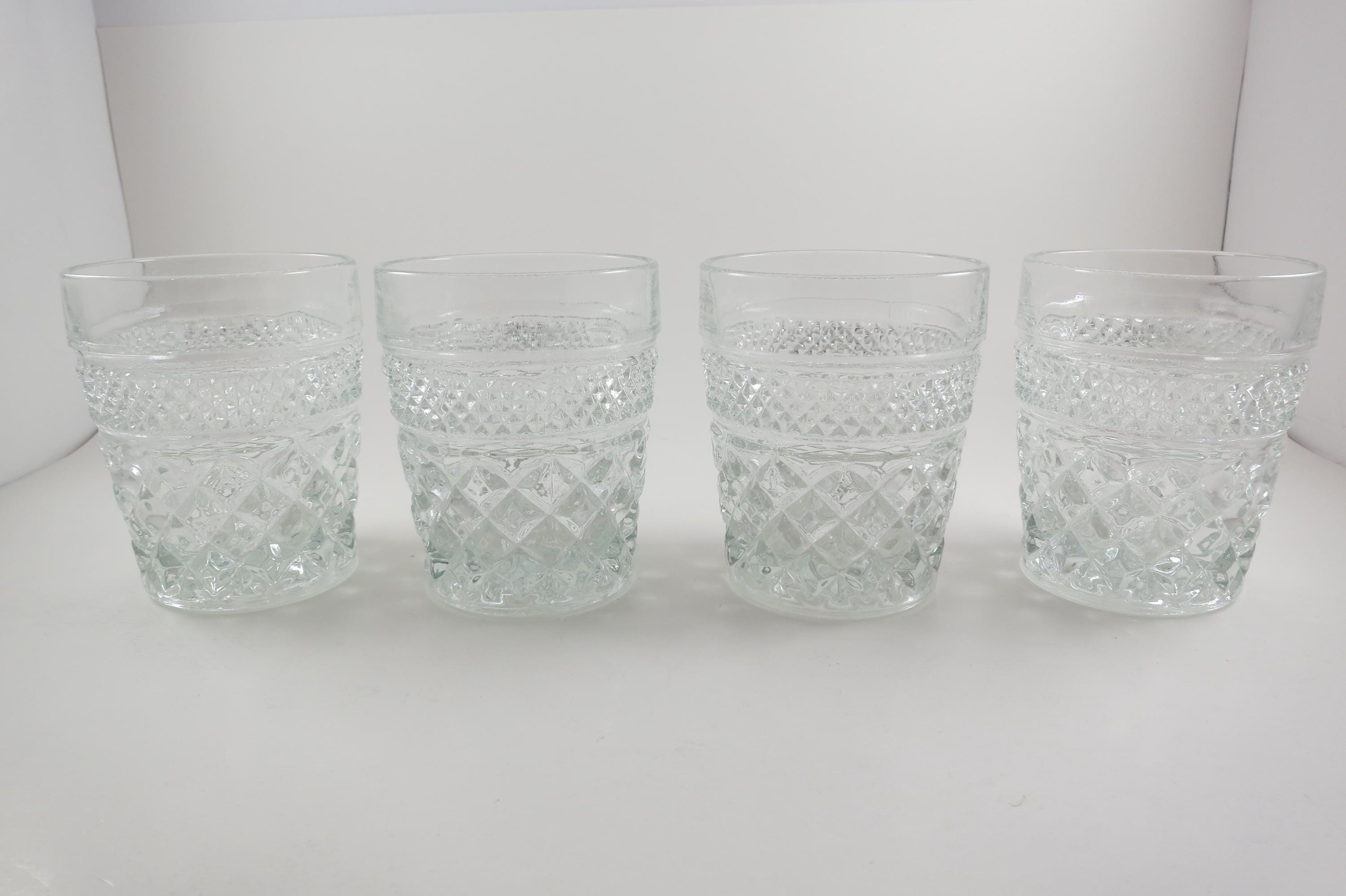 Set of Four Vintage Anchor Hocking Wexford 3 3/4 Inch Old Fashion Glasses Tumblers Clear Cut Diamond Pattern.