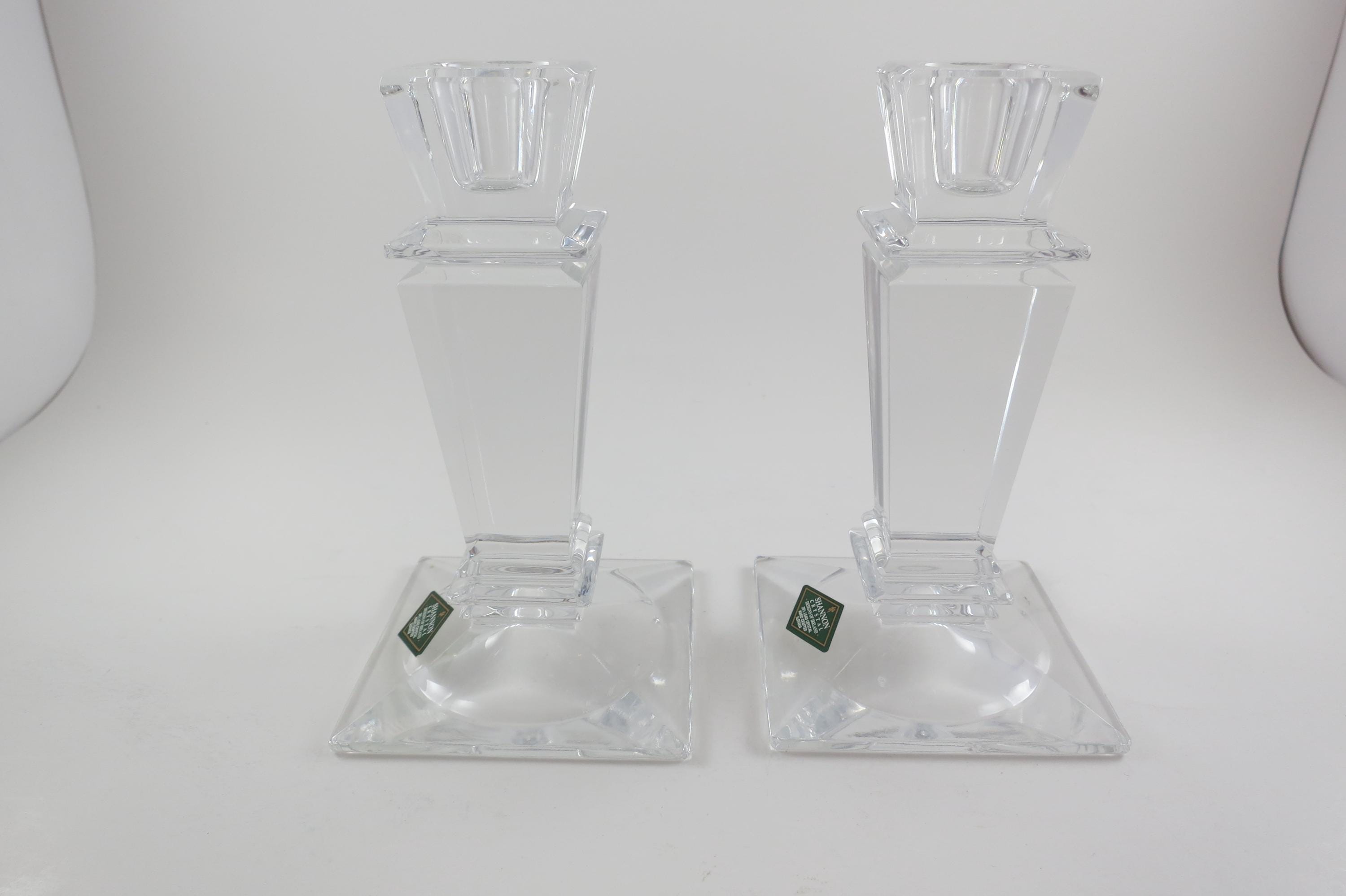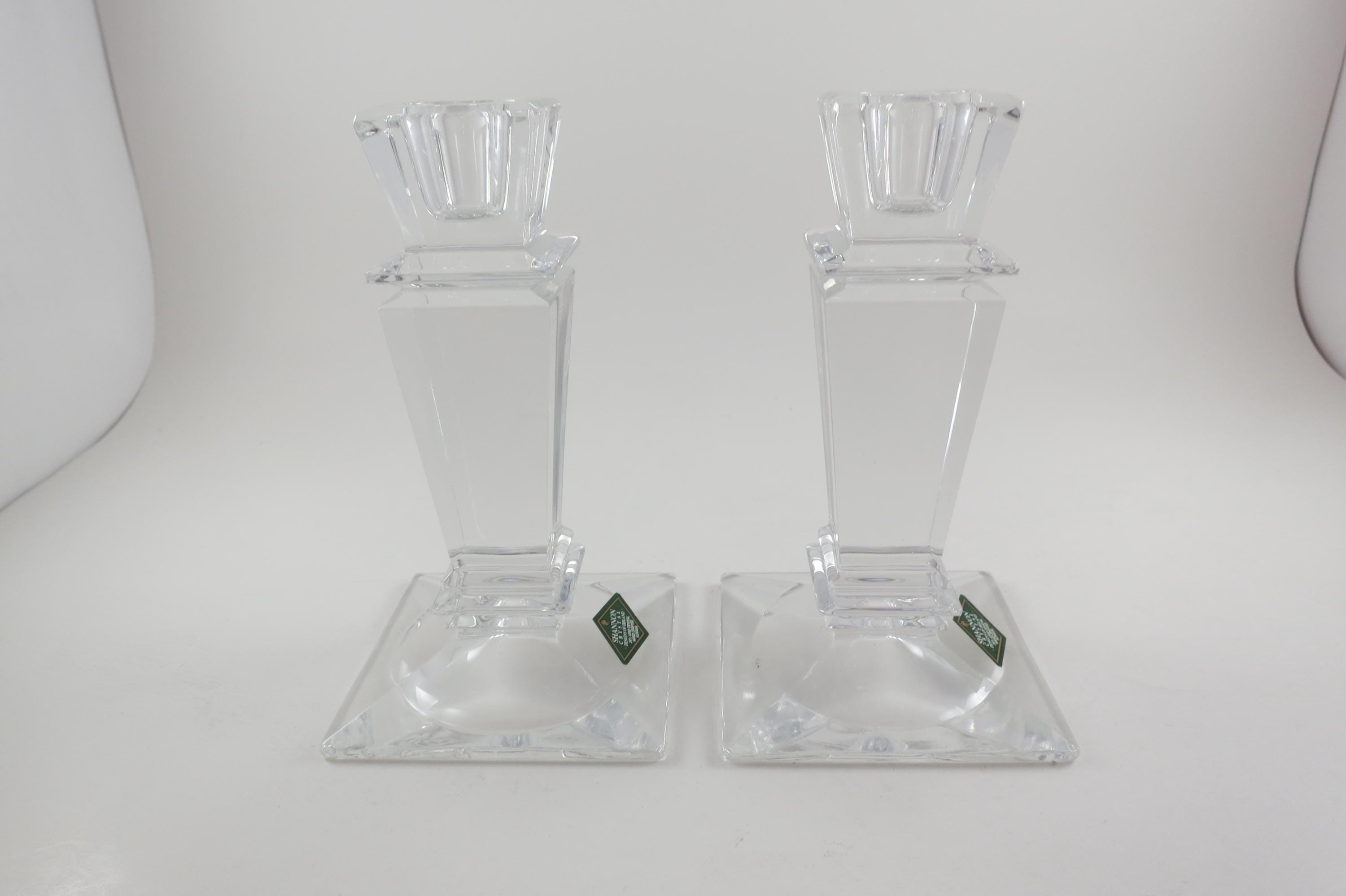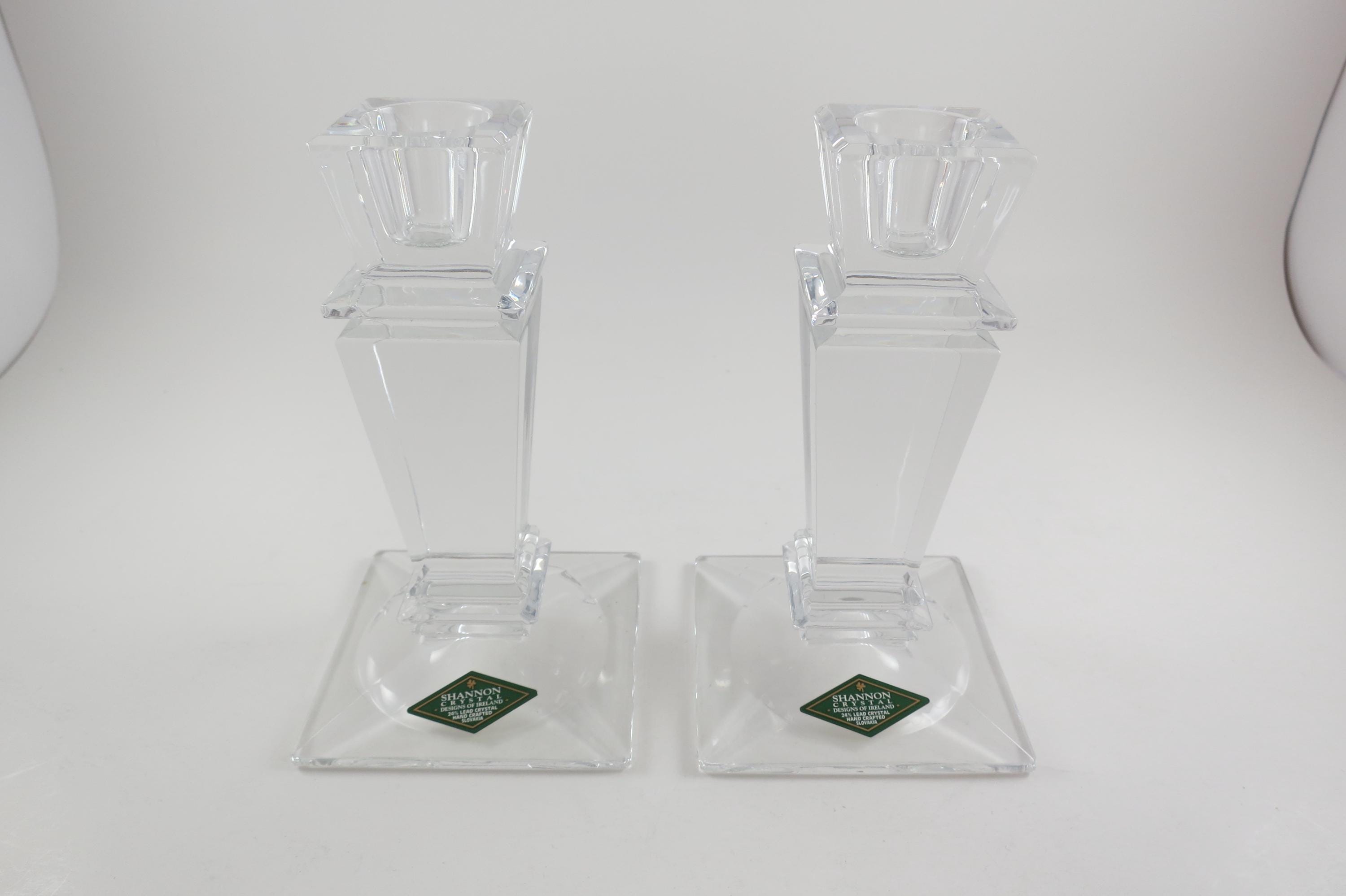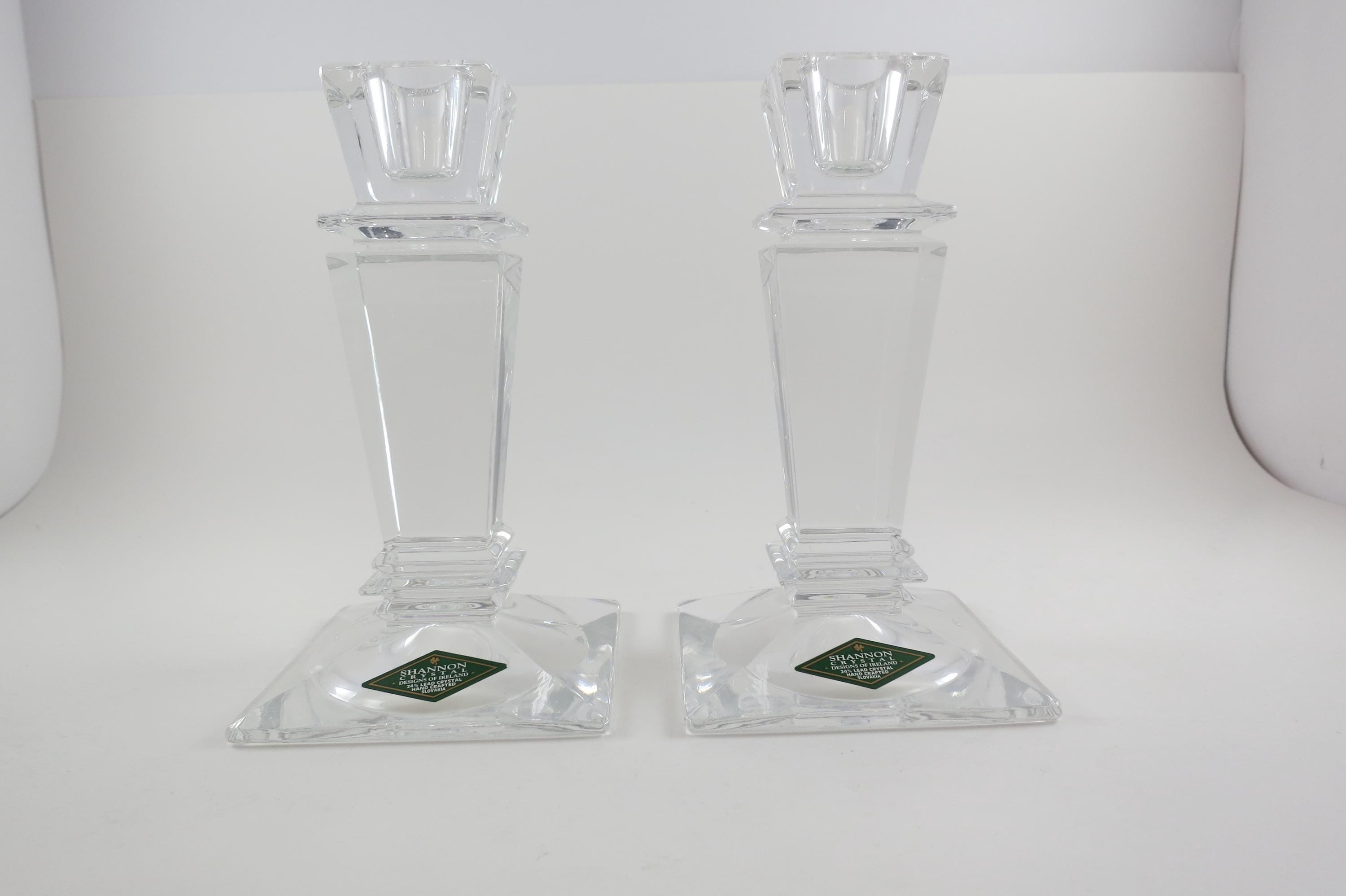 Pair of Vintage Shannon Crystal Ireland Candle Holders Like New Condition with Original Stickers. They measure 5 1/2 inches tall and are 3 1/4 by 3 1/4 at the base. Still with their original stickers.