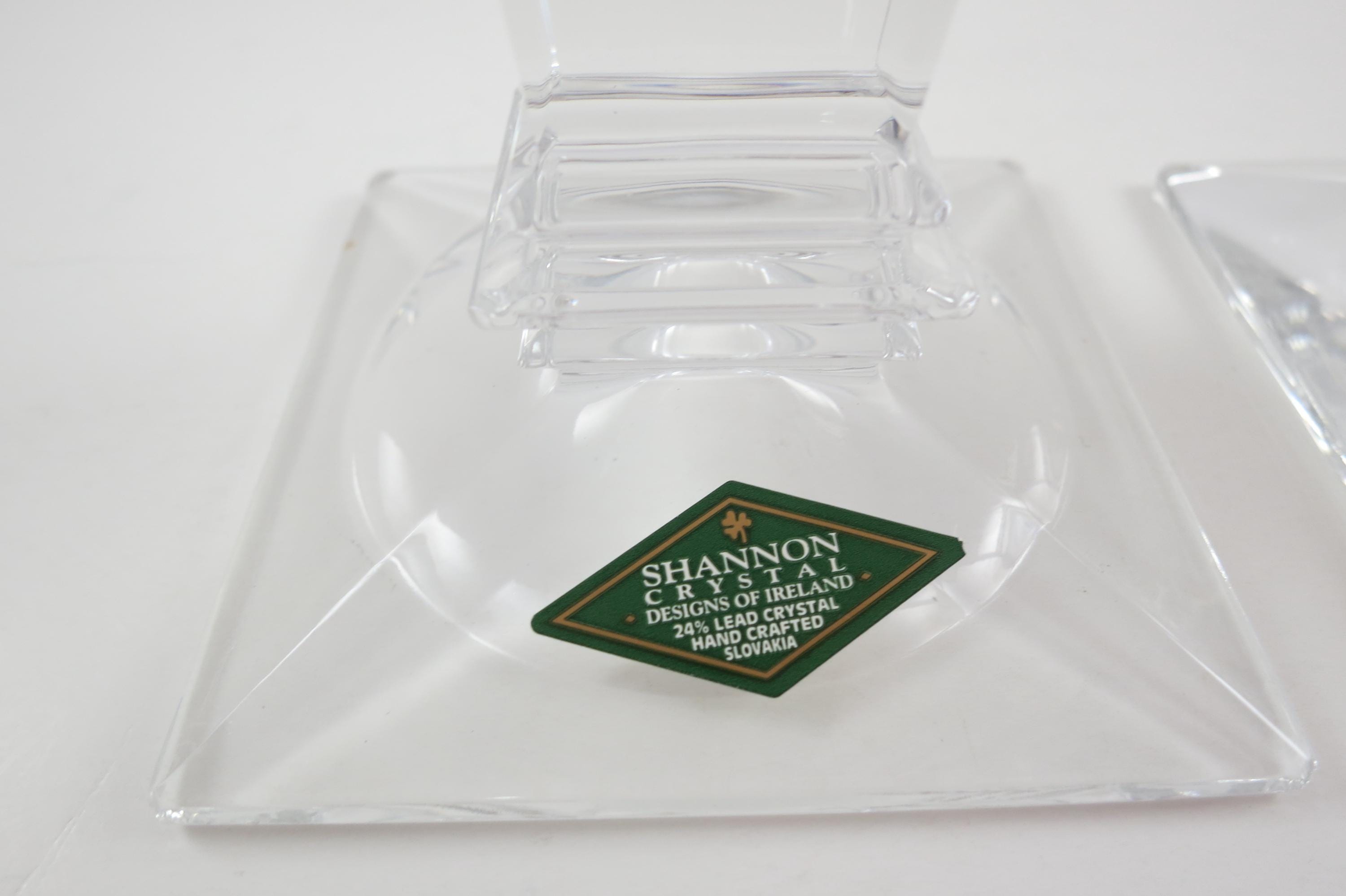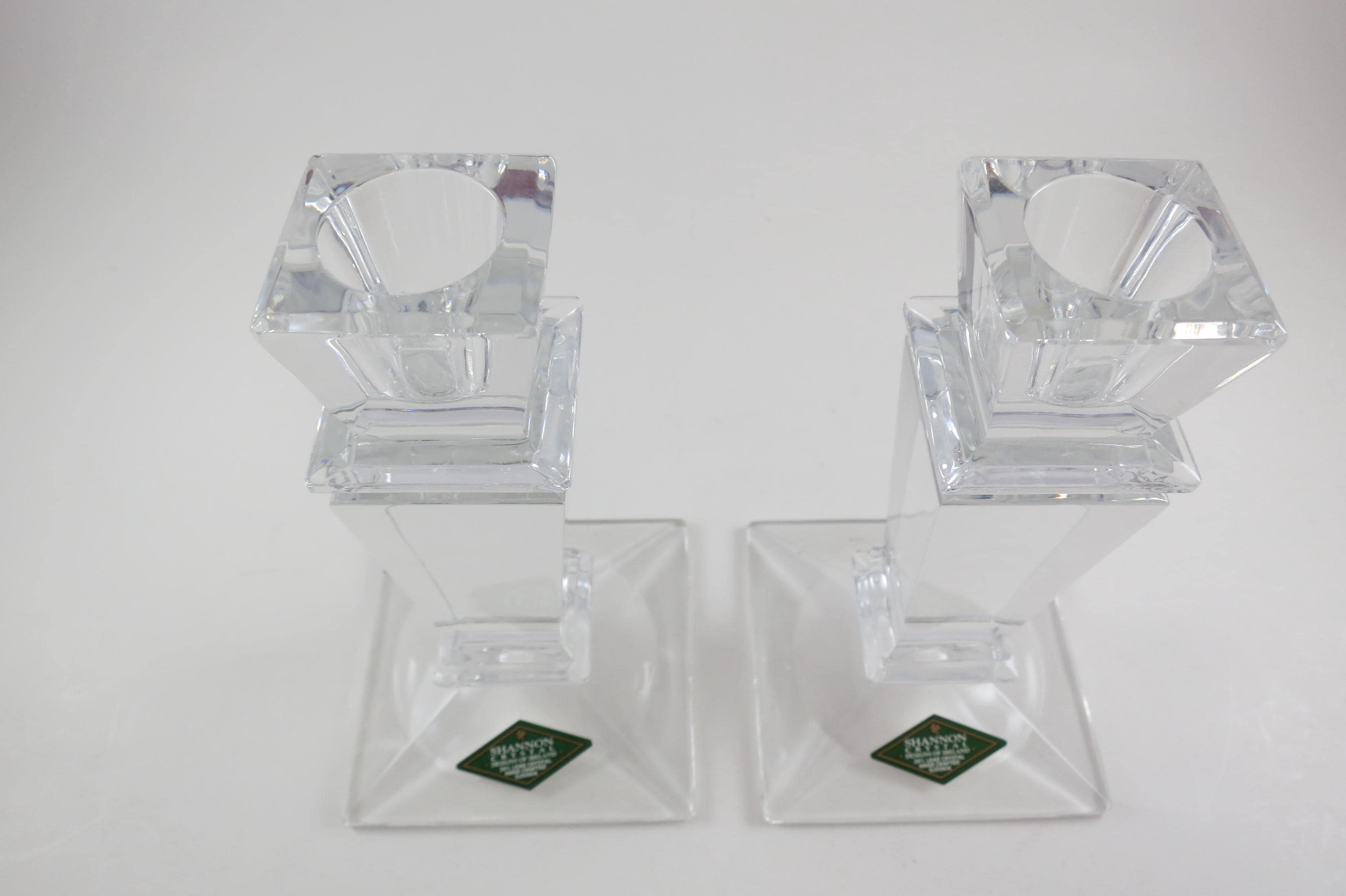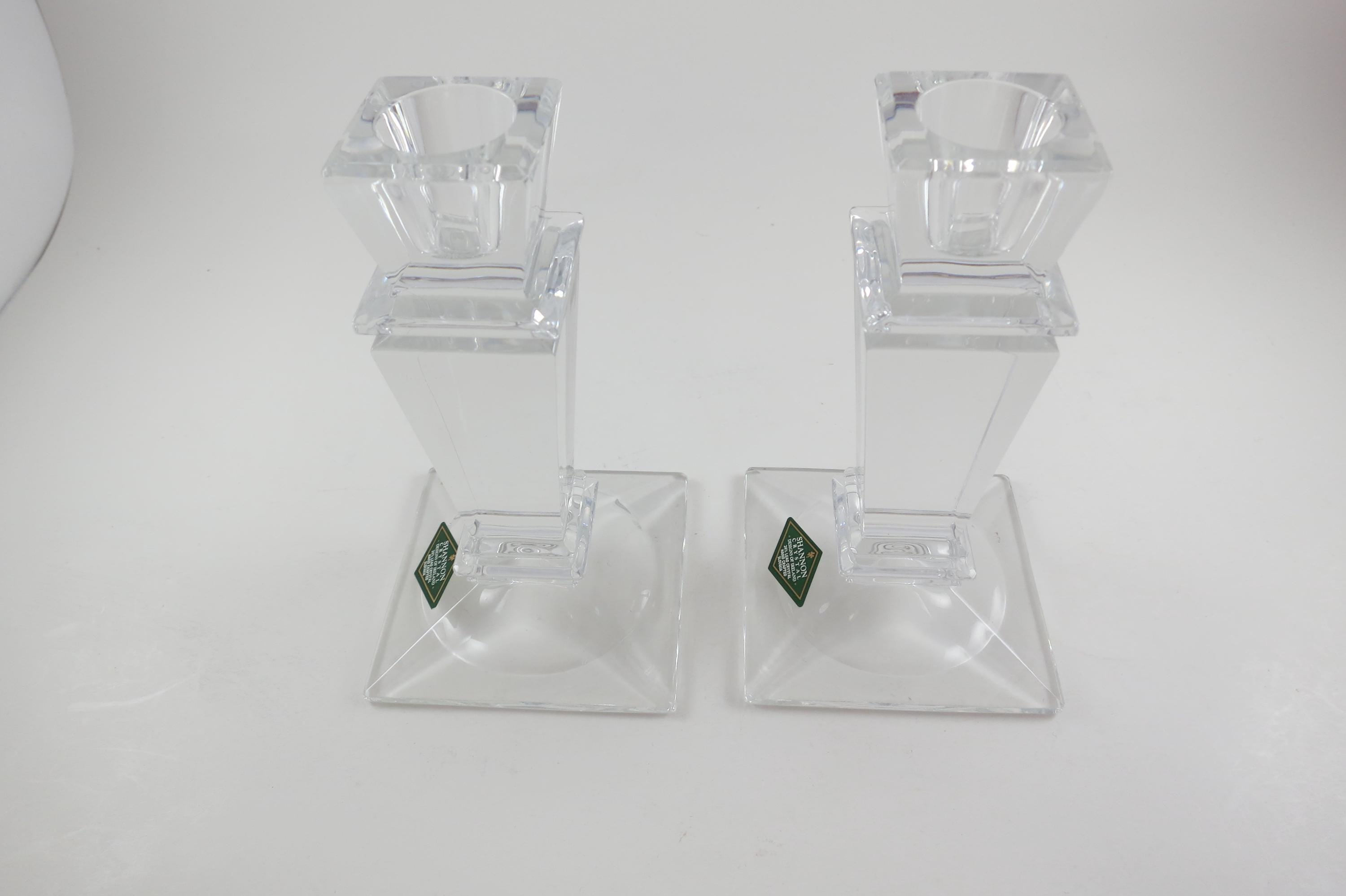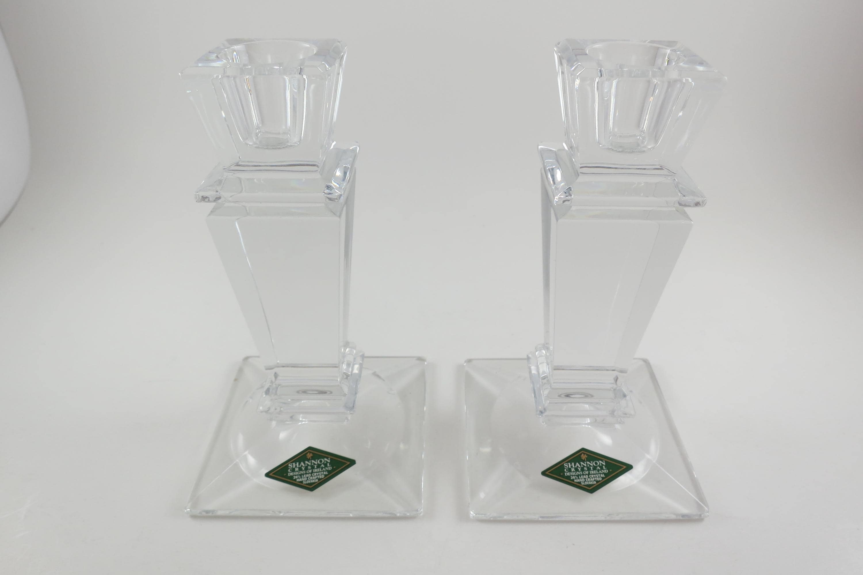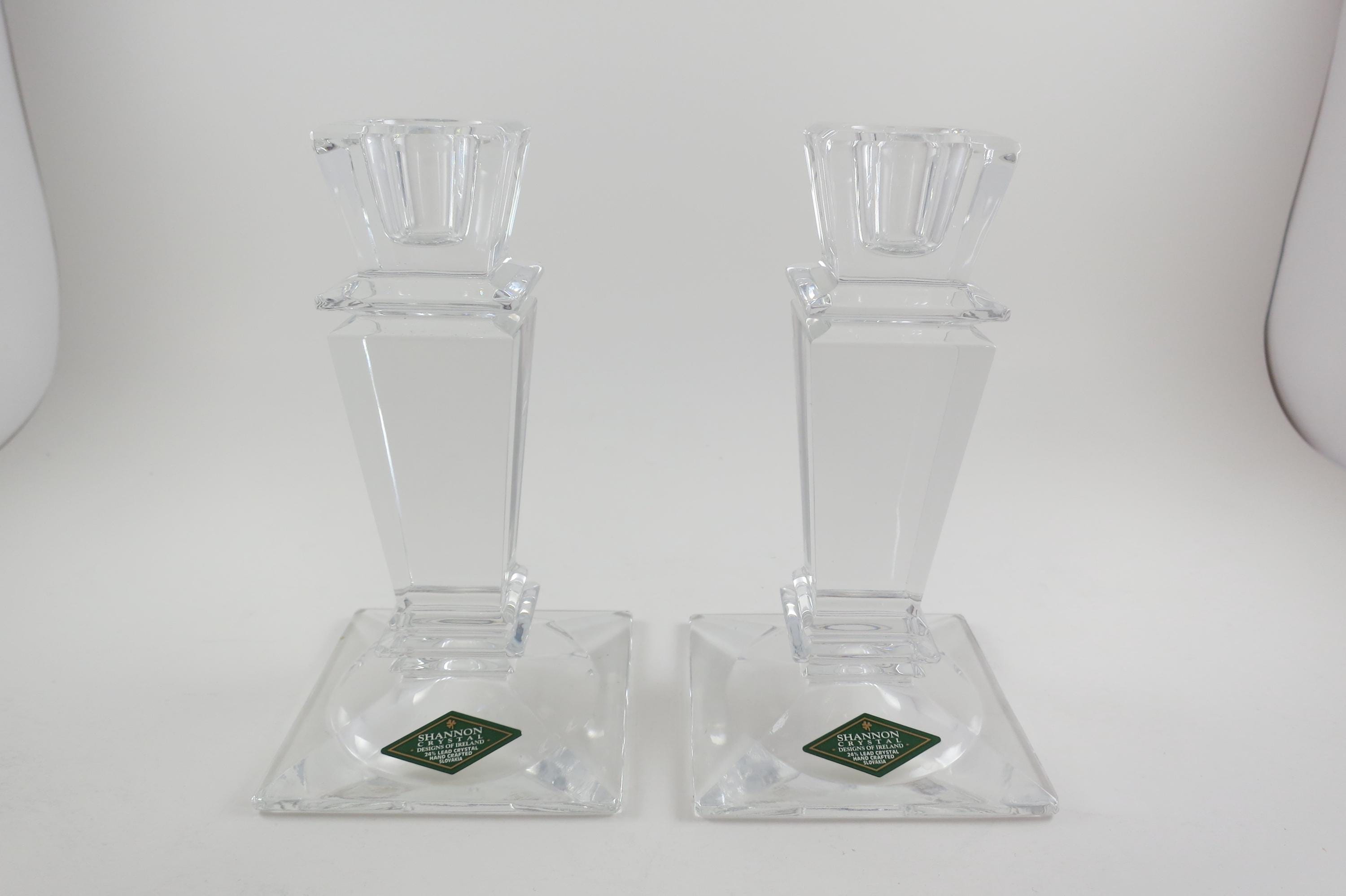 Pair of Vintage Shannon Crystal Ireland Candle Holders Like New Condition with Original Stickers. They measure 5 1/2 inches tall and are 3 1/4 by 3 1/4 at the base. Still with their original stickers.