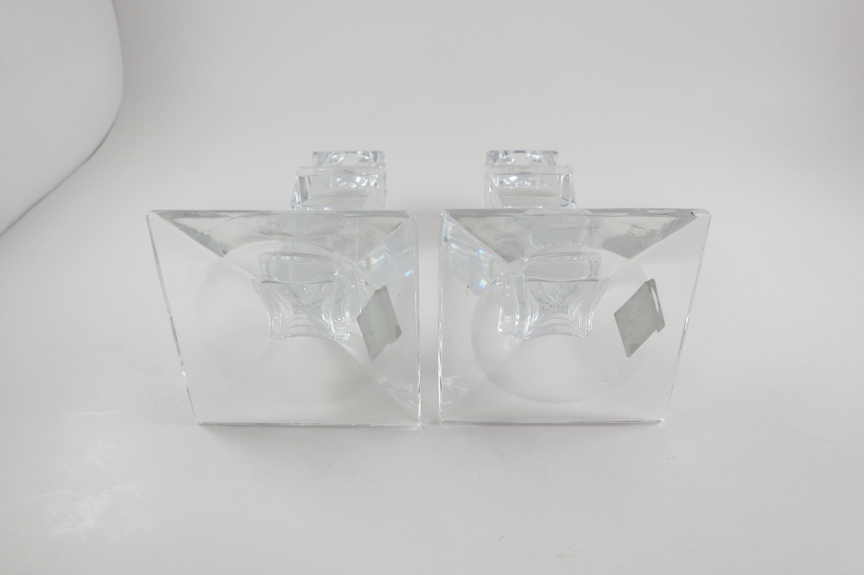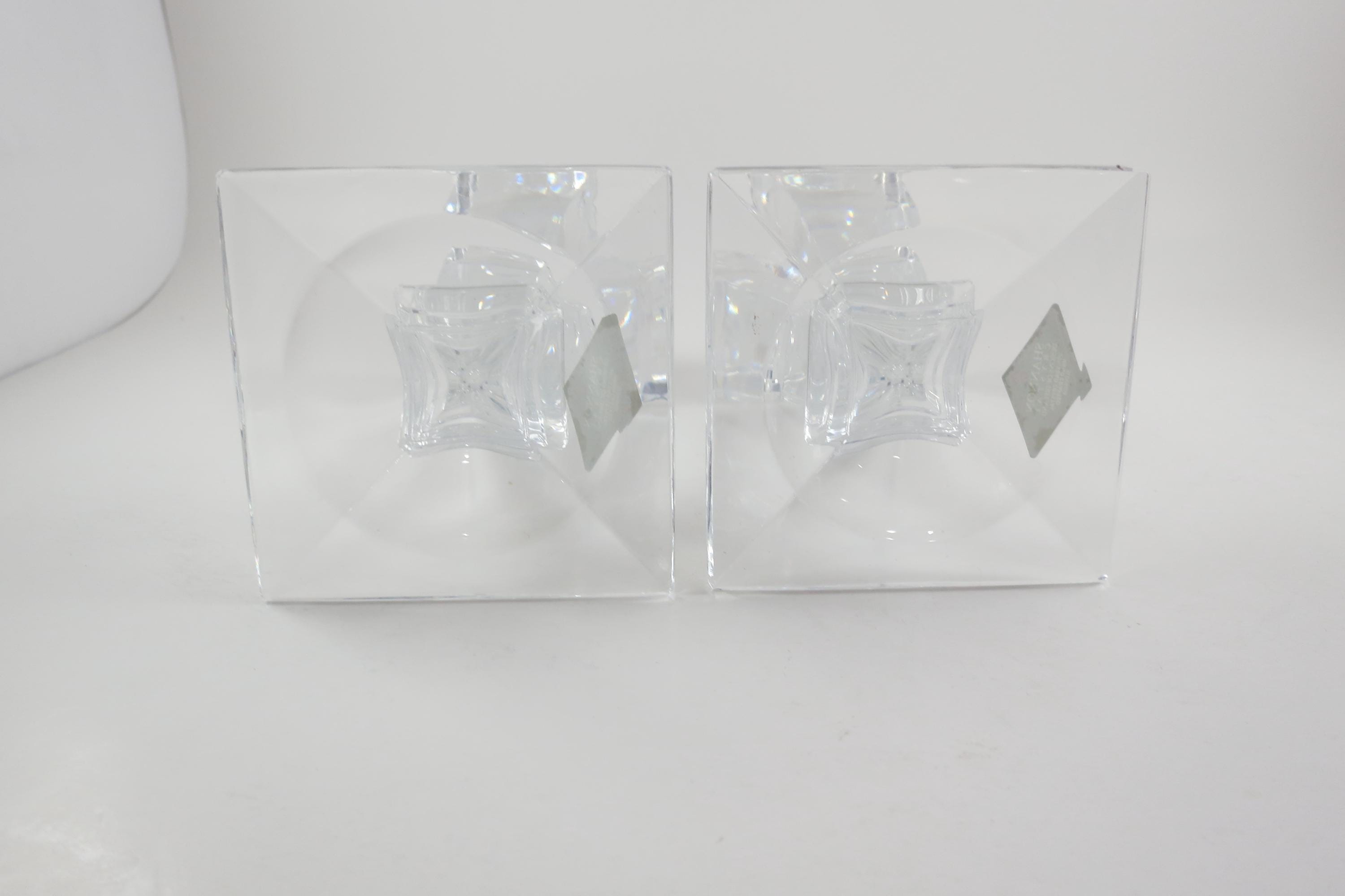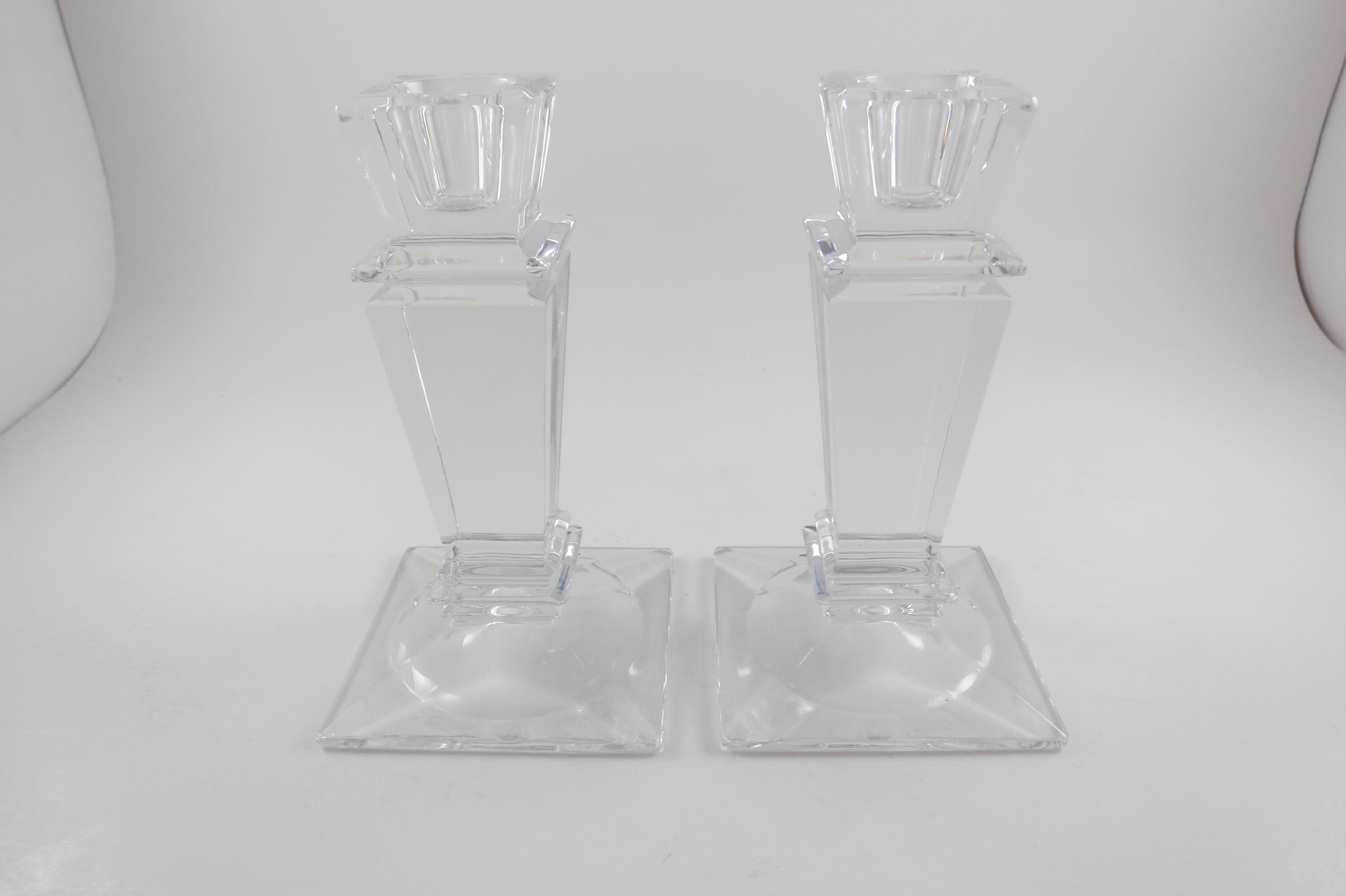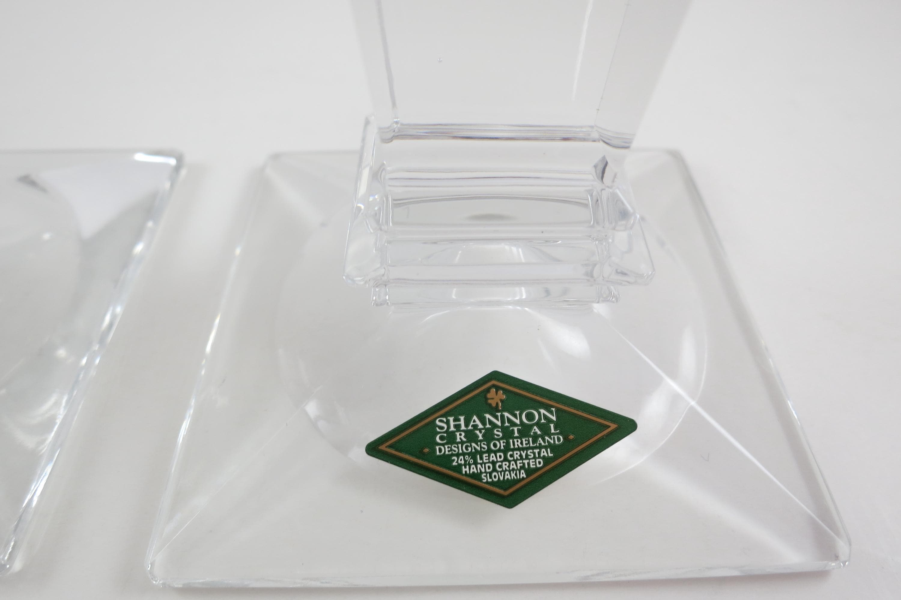 Pair of Vintage Shannon Crystal Ireland Candle Holders Like New Condition with Original Stickers. They measure 5 1/2 inches tall and are 3 1/4 by 3 1/4 at the base. Still with their original stickers.