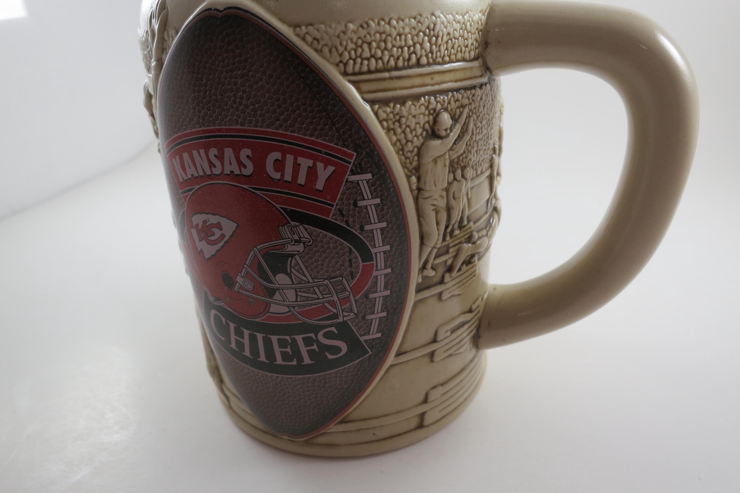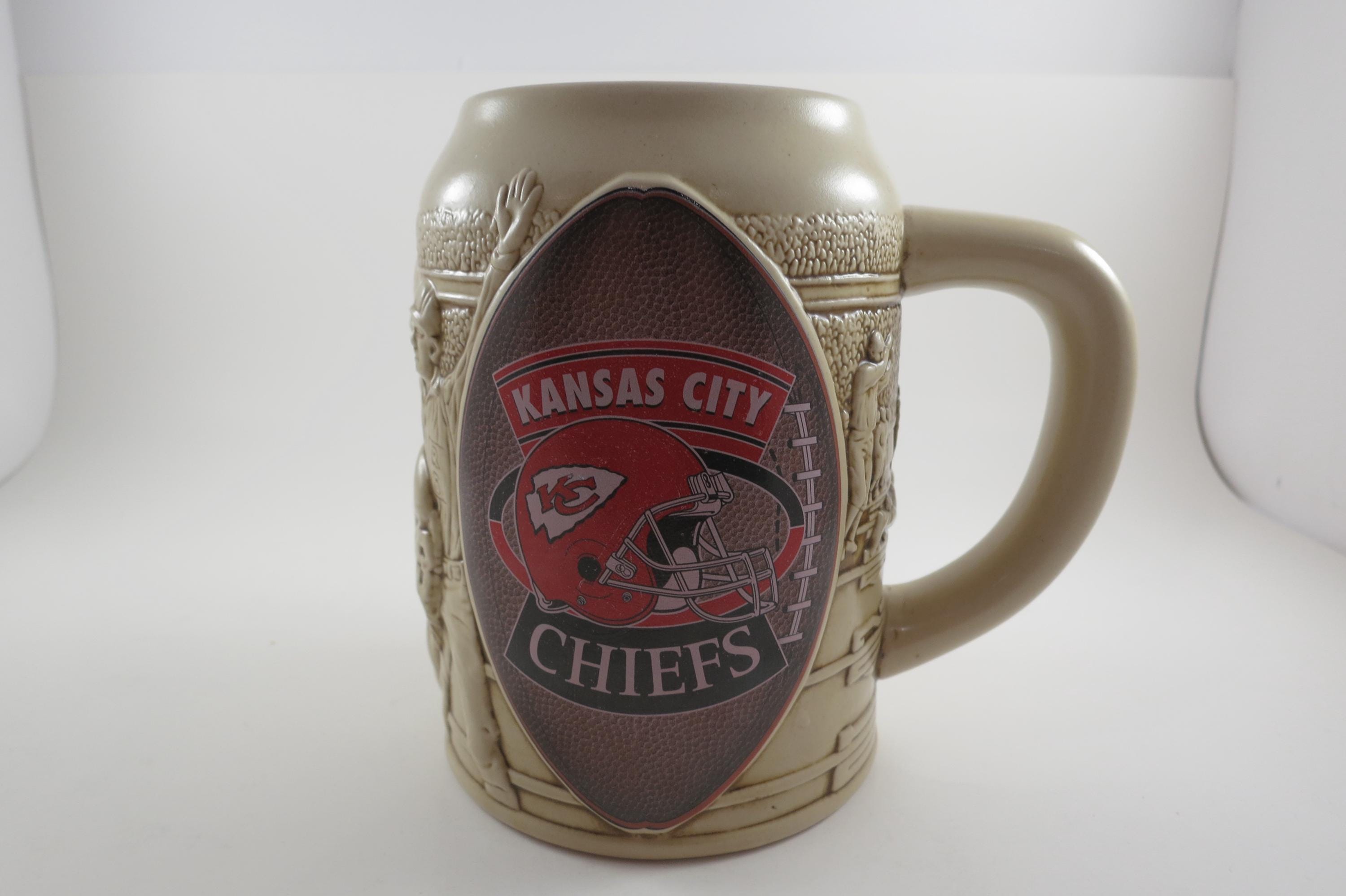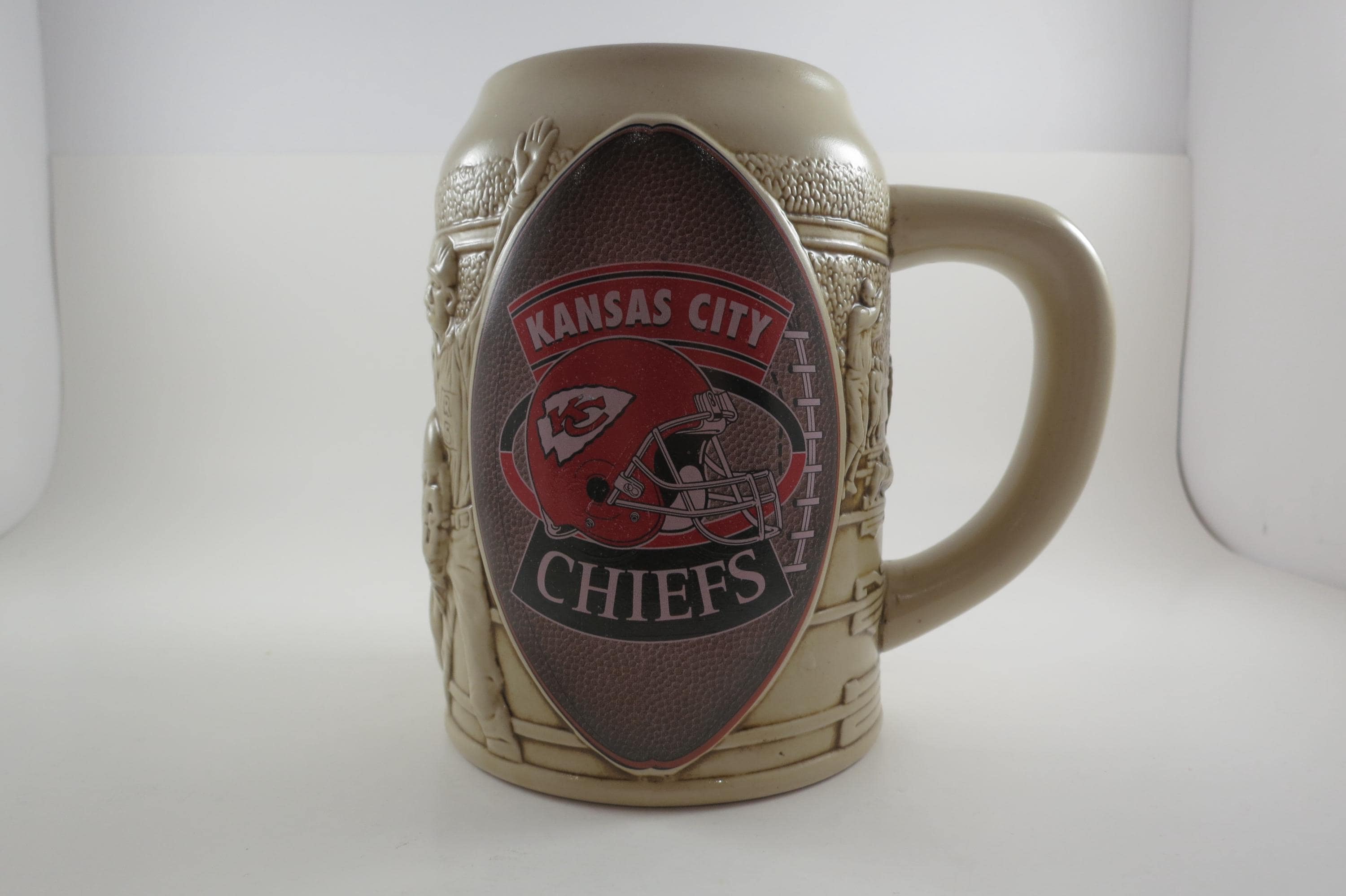 Vintage 1990's Kansas City KC Chiefs NFL Football Mug Stein Ceramic Brazil Pristine Condition. Measures 6 inches tall and 6 1/2 inches wide. Great gift for the Chiefs fan!