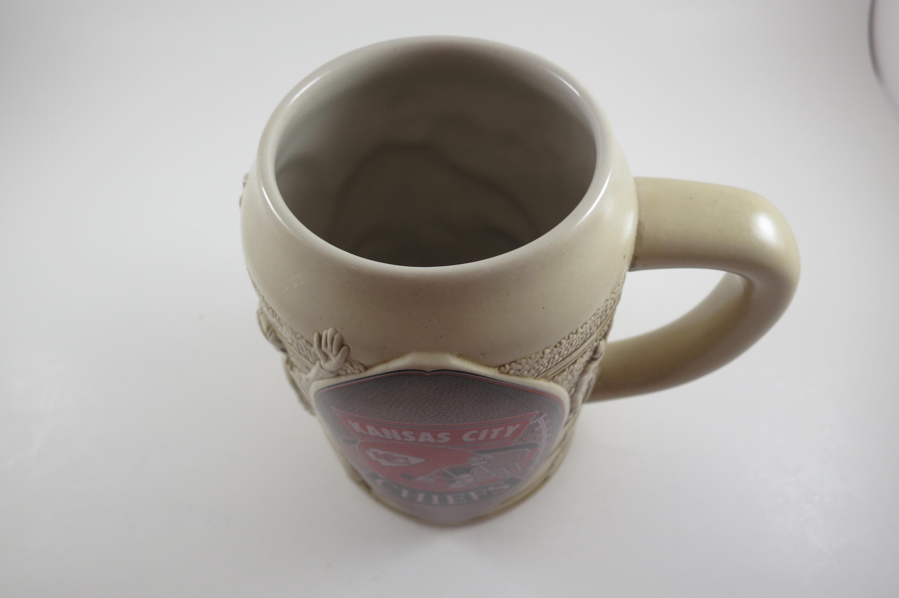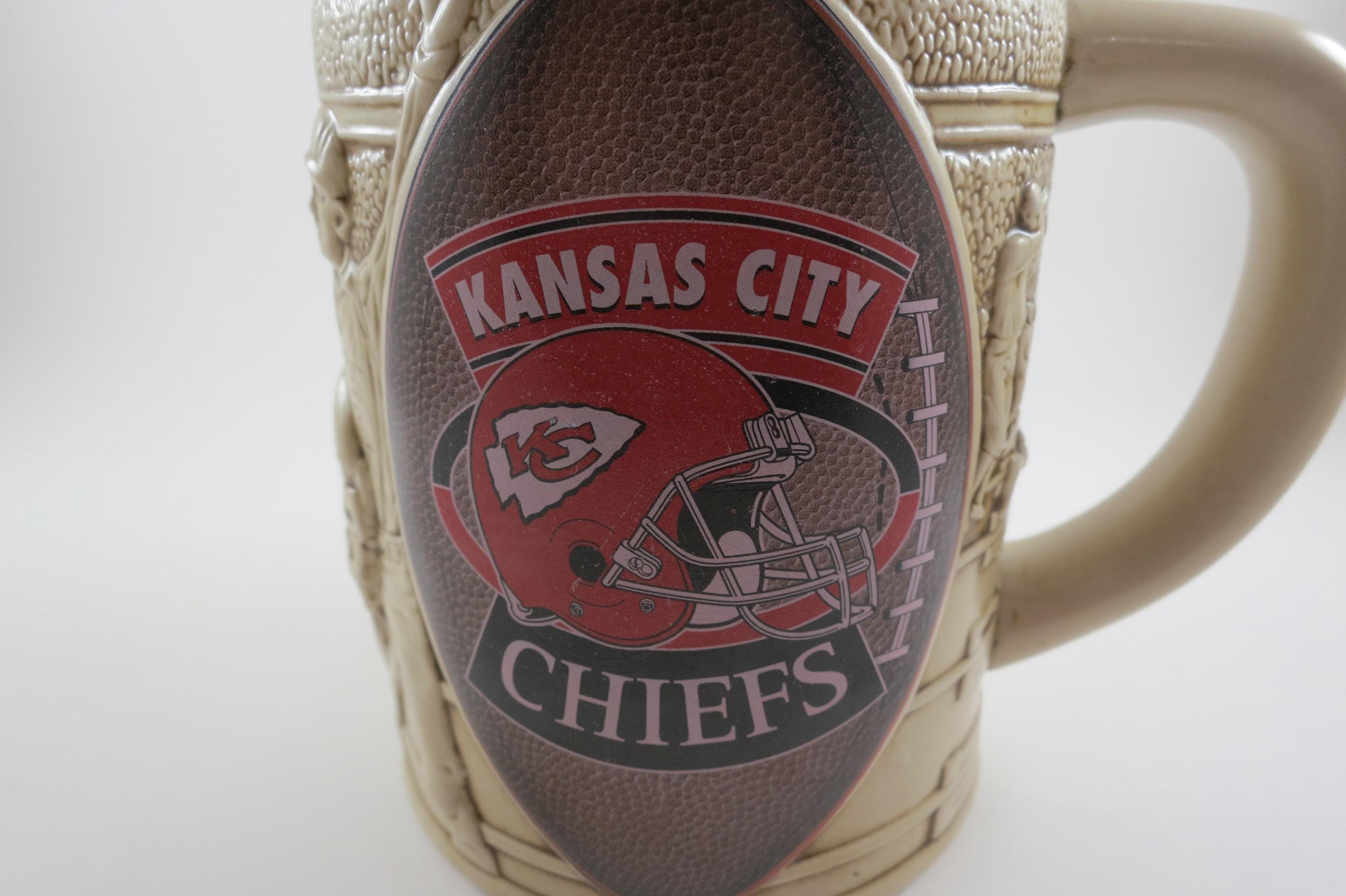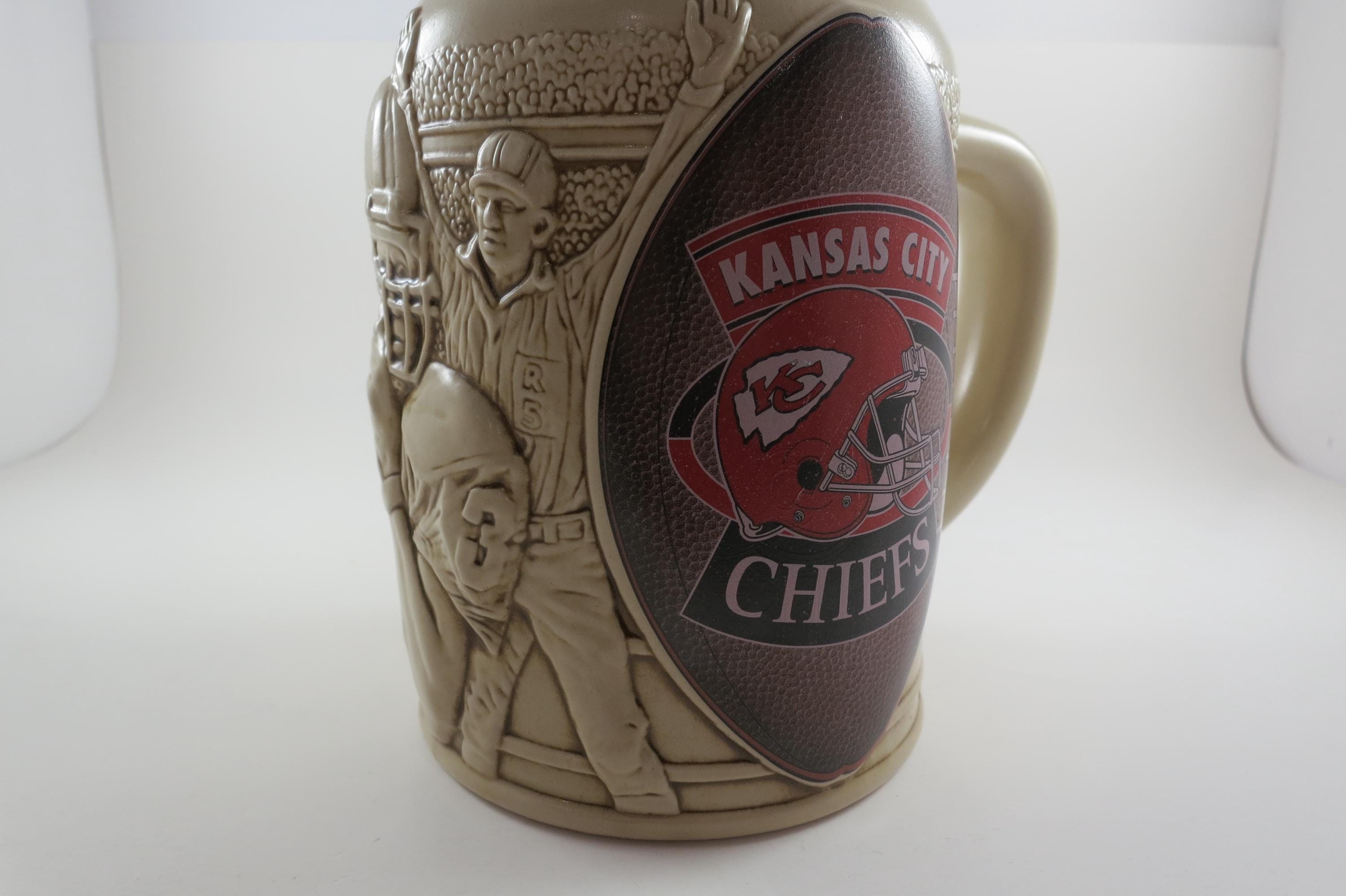 Vintage 1990's Kansas City KC Chiefs NFL Football Mug Stein Ceramic Brazil Pristine Condition. Measures 6 inches tall and 6 1/2 inches wide. Great gift for the Chiefs fan!