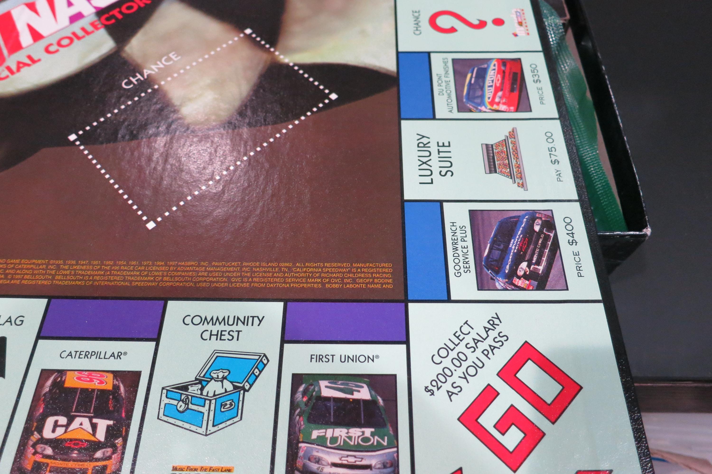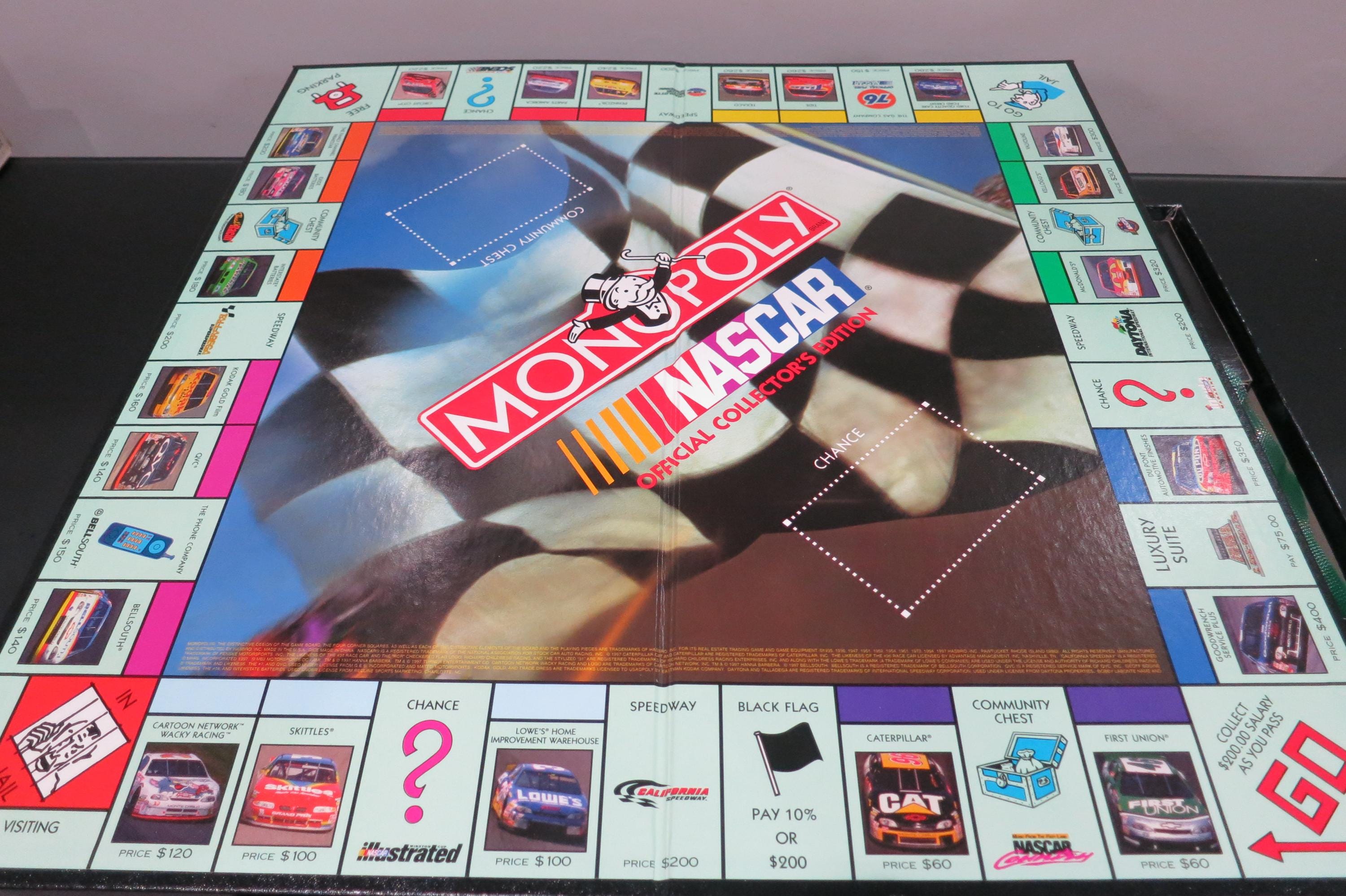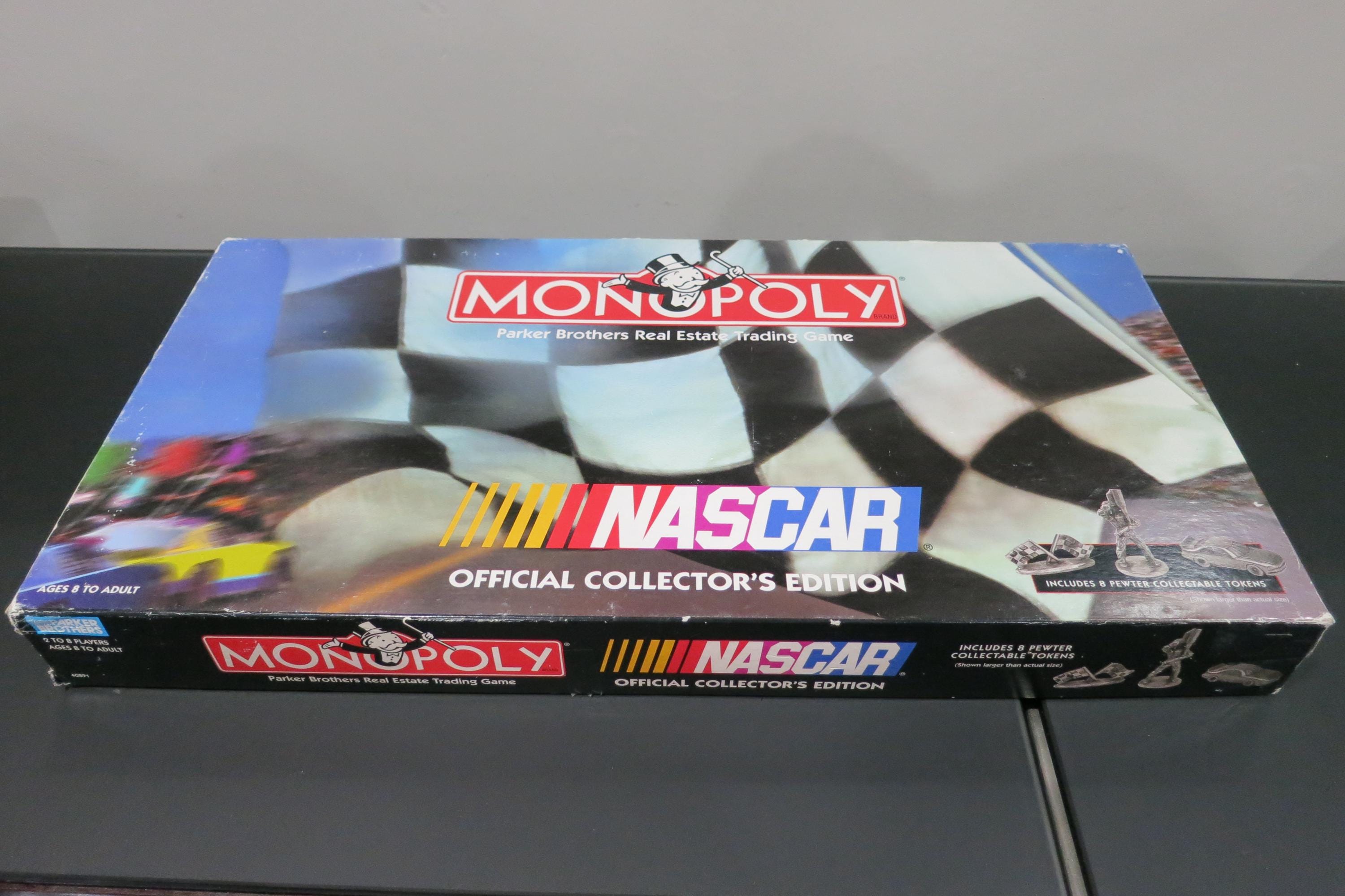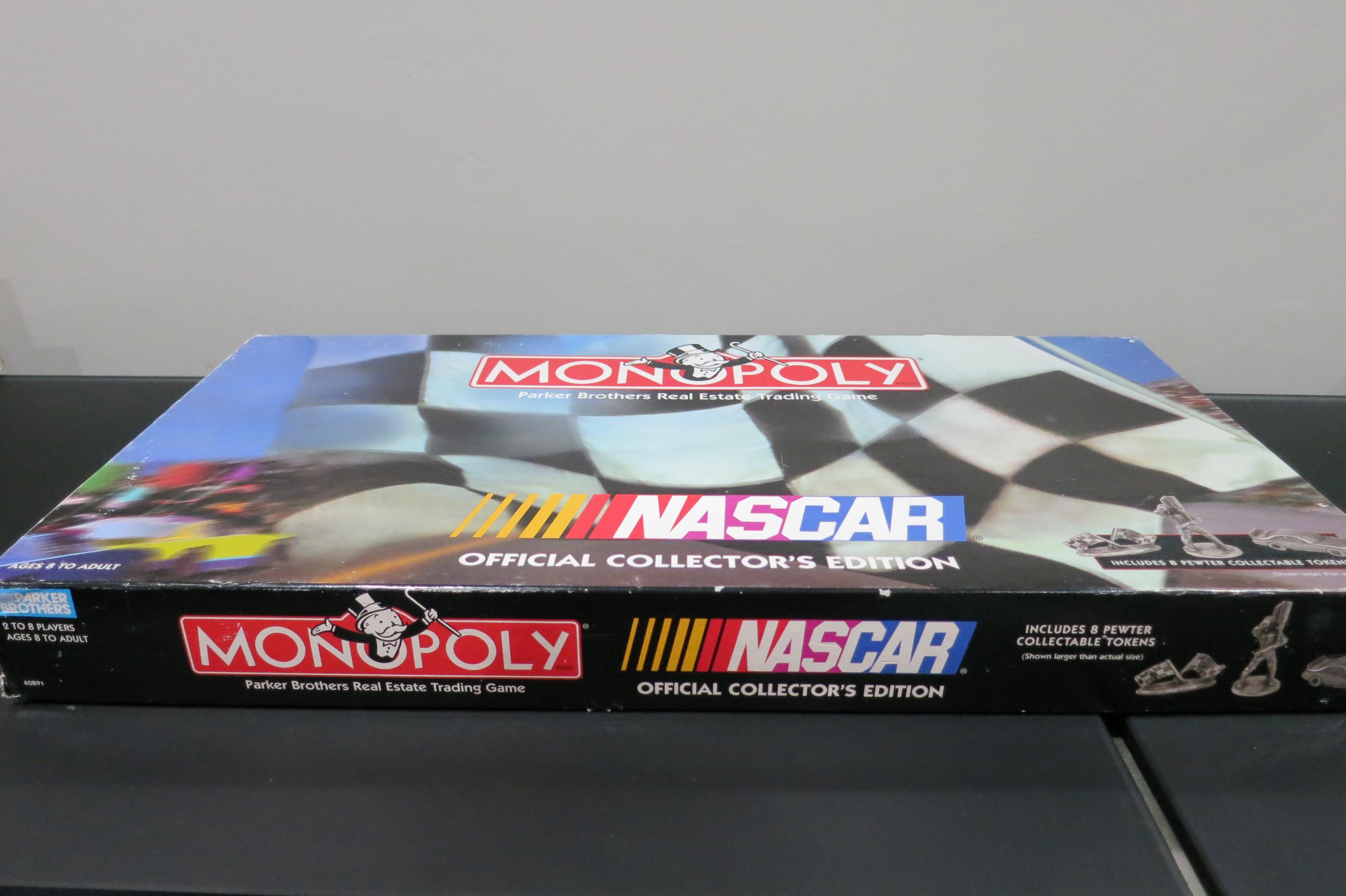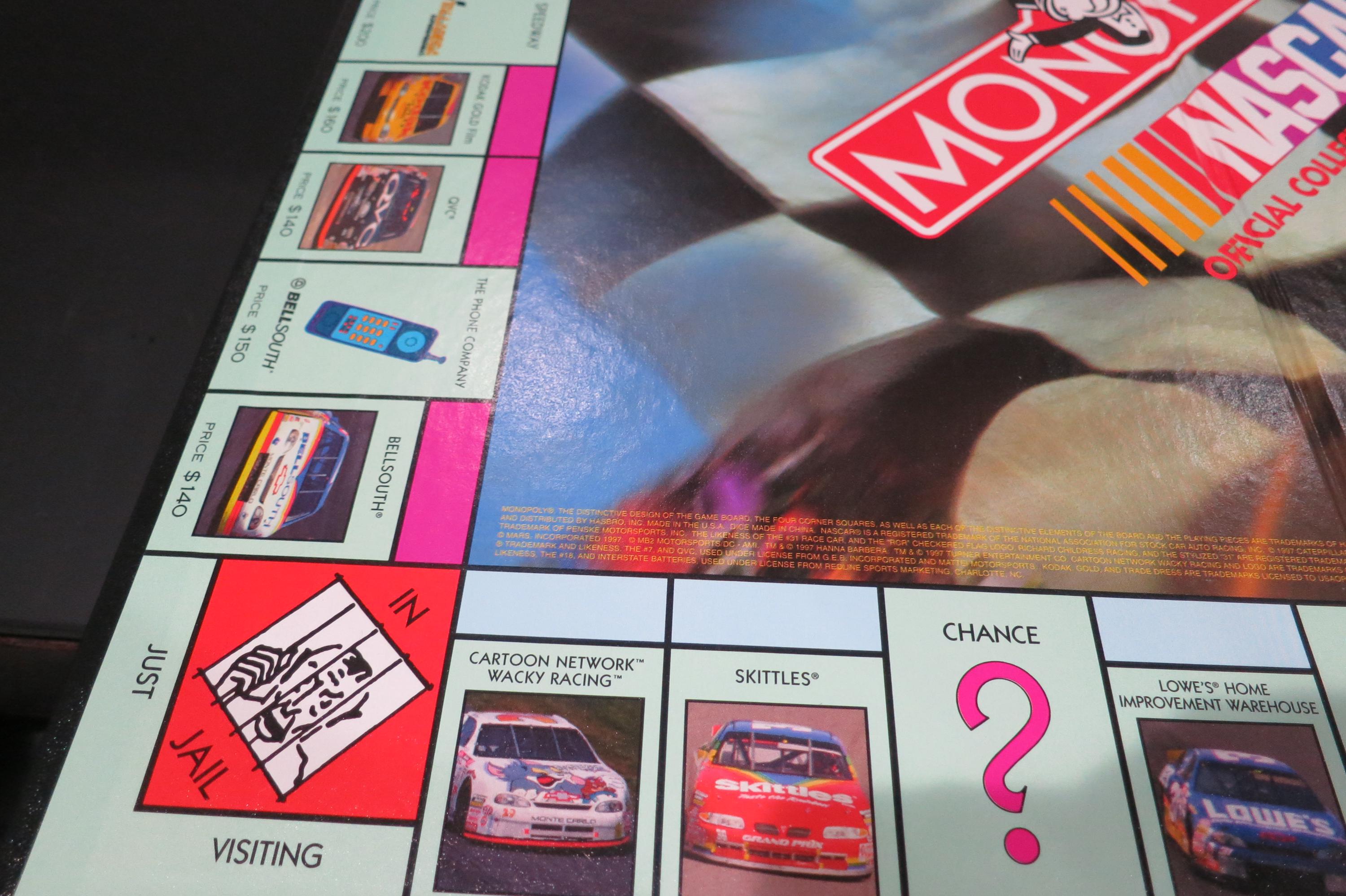 1997 Parker Brothers Board Game Monopoly Nascar Edition 100% Complete Ready to Play. Has 8 tokens, 5 are the original custom Nascar and the other three are replacement standard monopoly tokens. Original version!! Box shows some wear and has a couple taped corners.