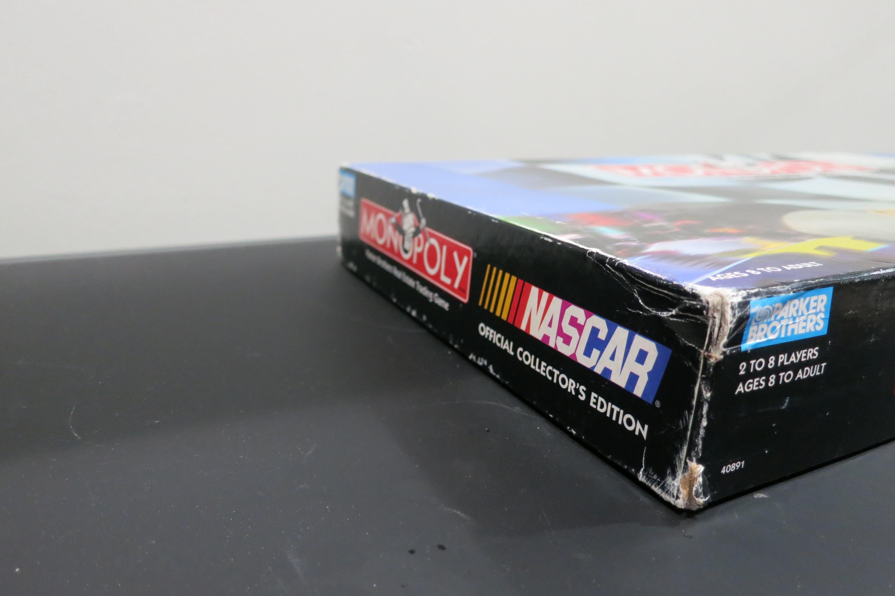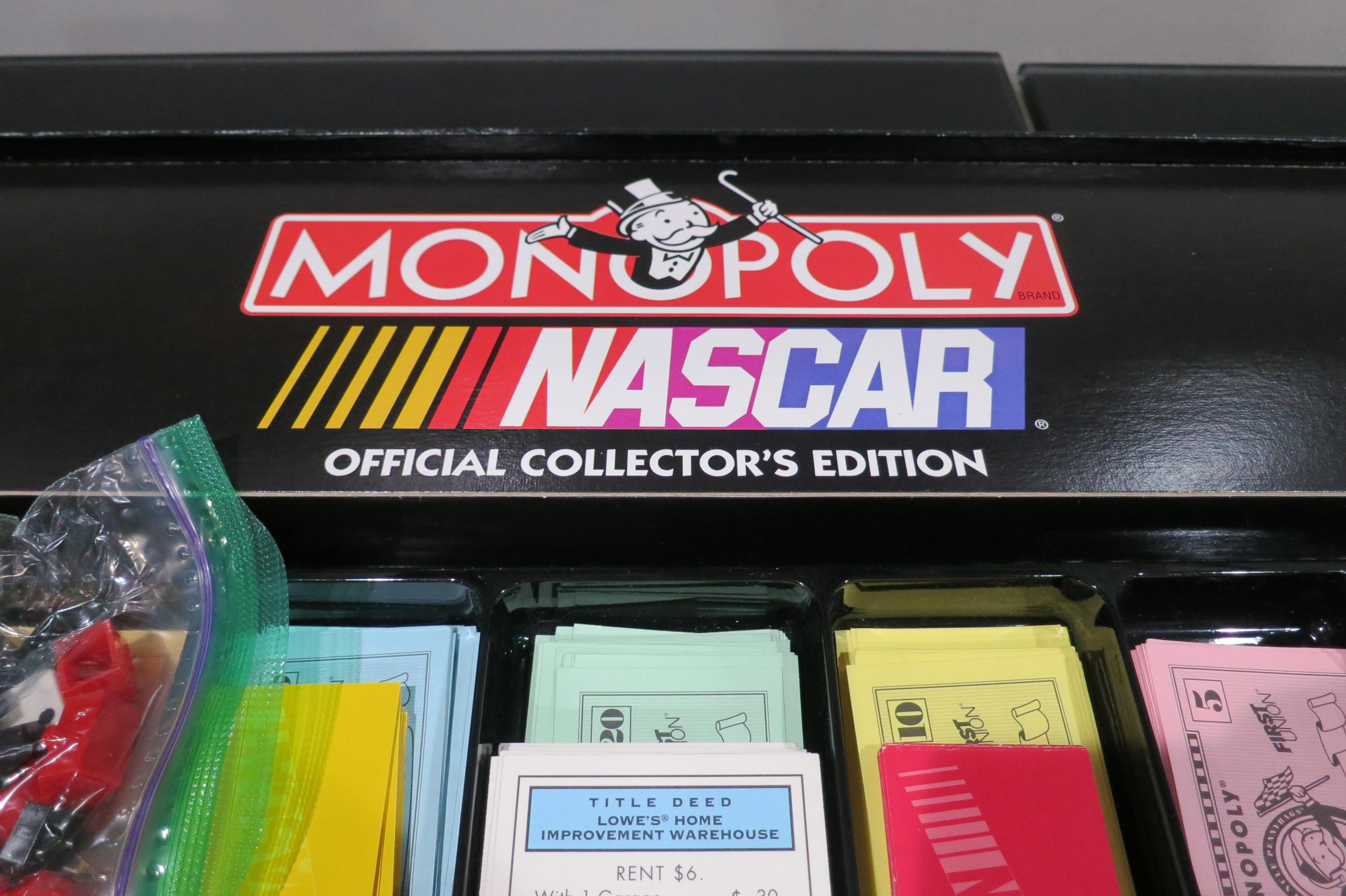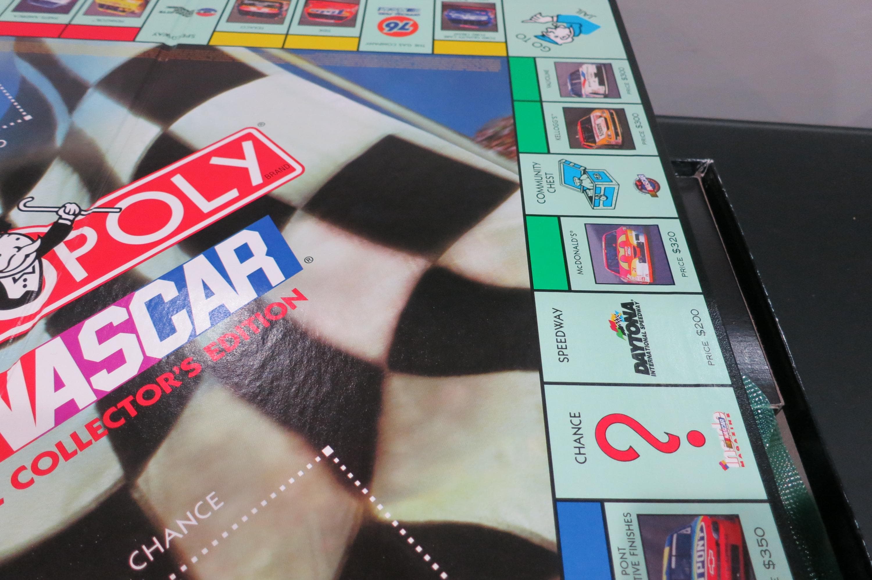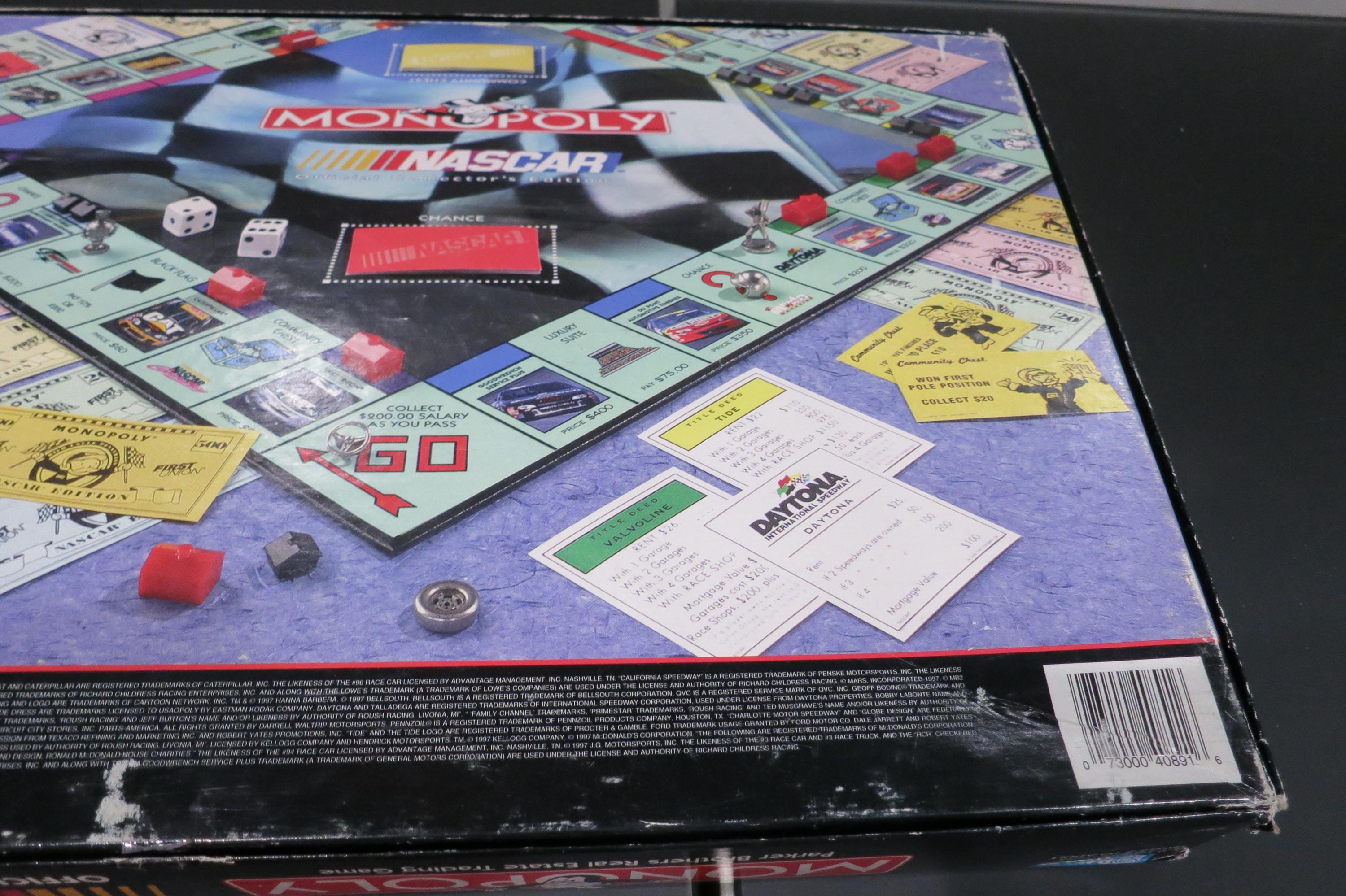1997 Parker Brothers Board Game Monopoly Nascar Edition 100% Complete Ready to Play. Has 8 tokens, 5 are the original custom Nascar and the other three are replacement standard monopoly tokens. Original version!! Box shows some wear and has a couple taped corners.
