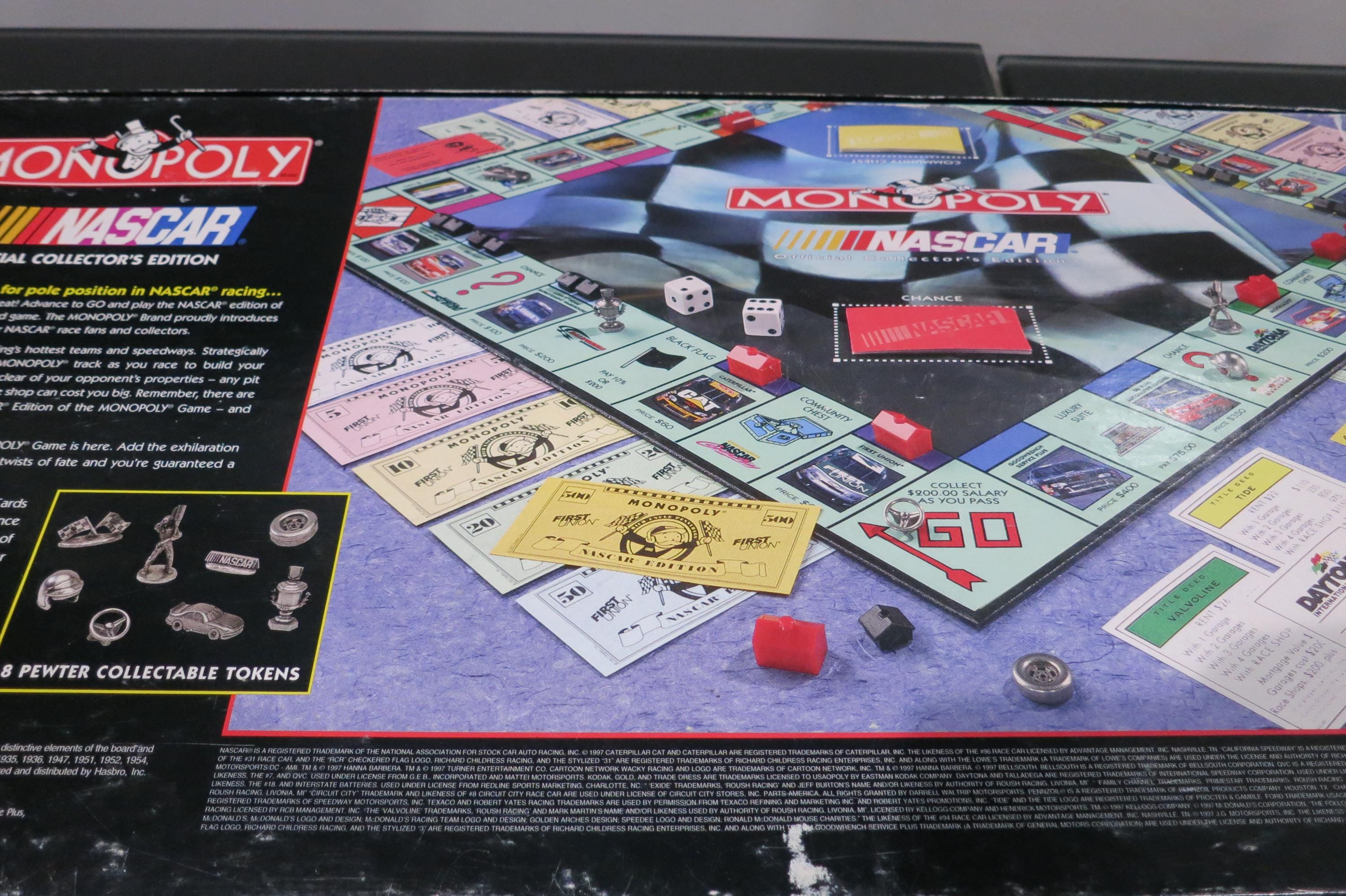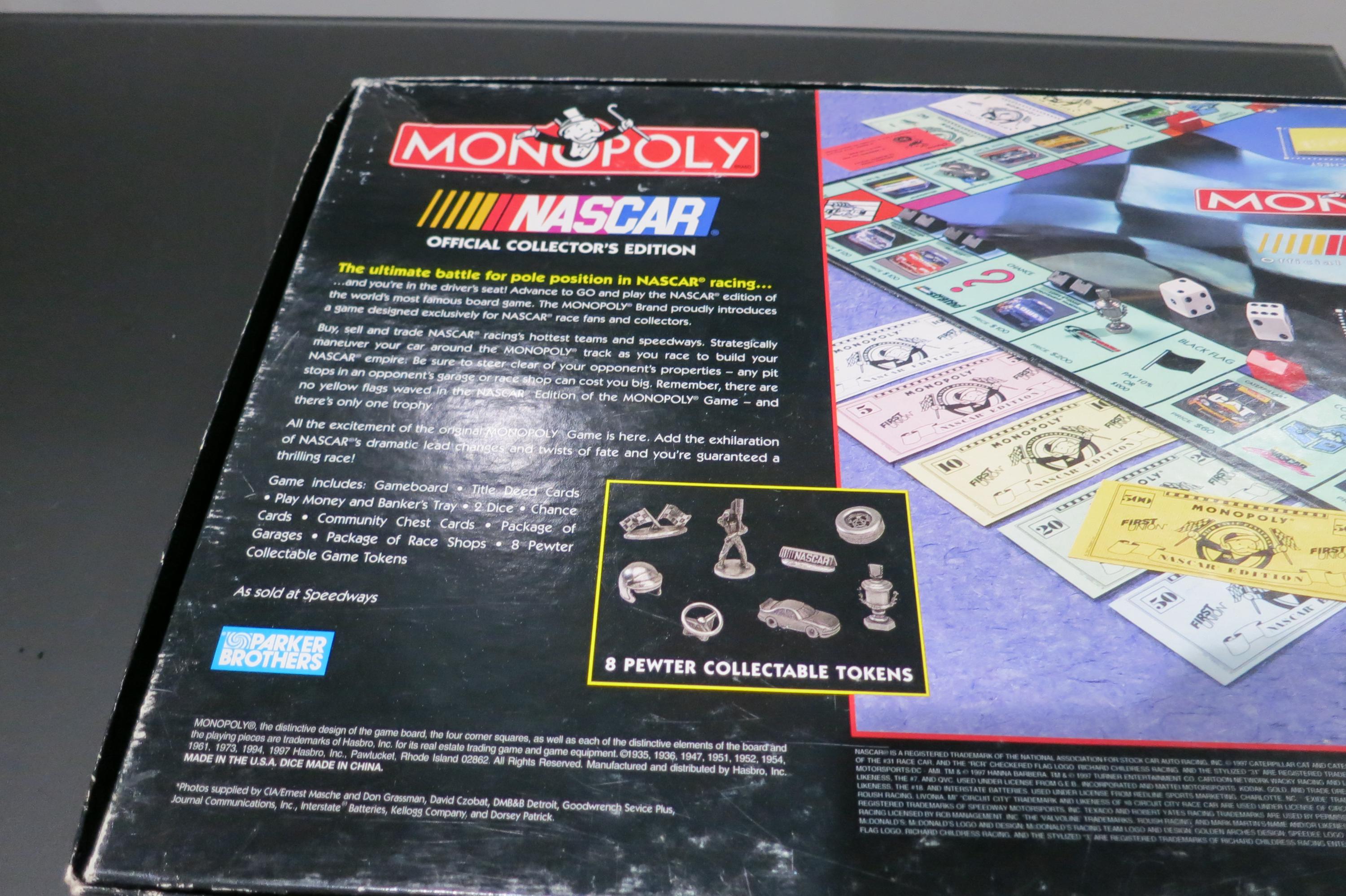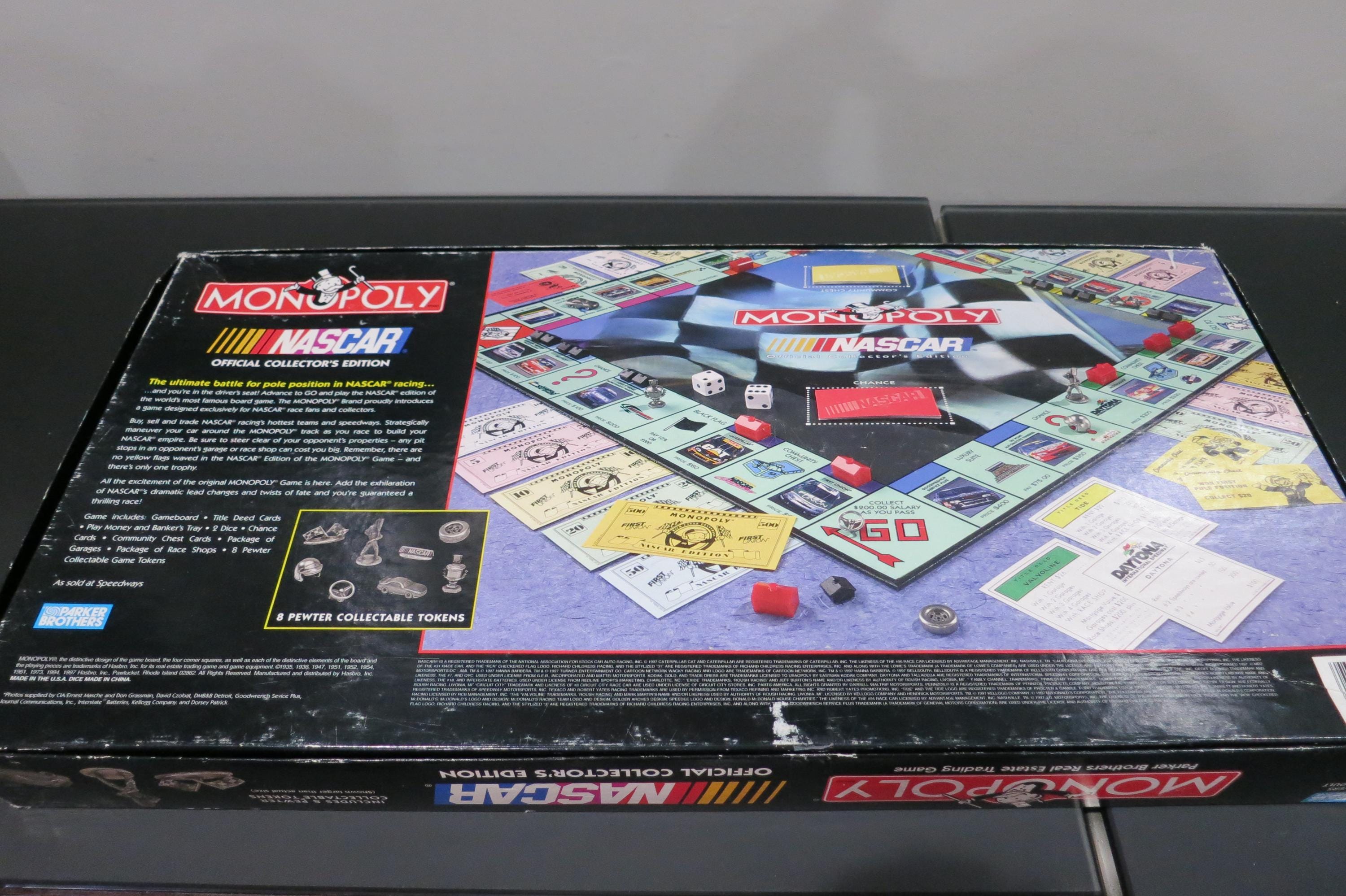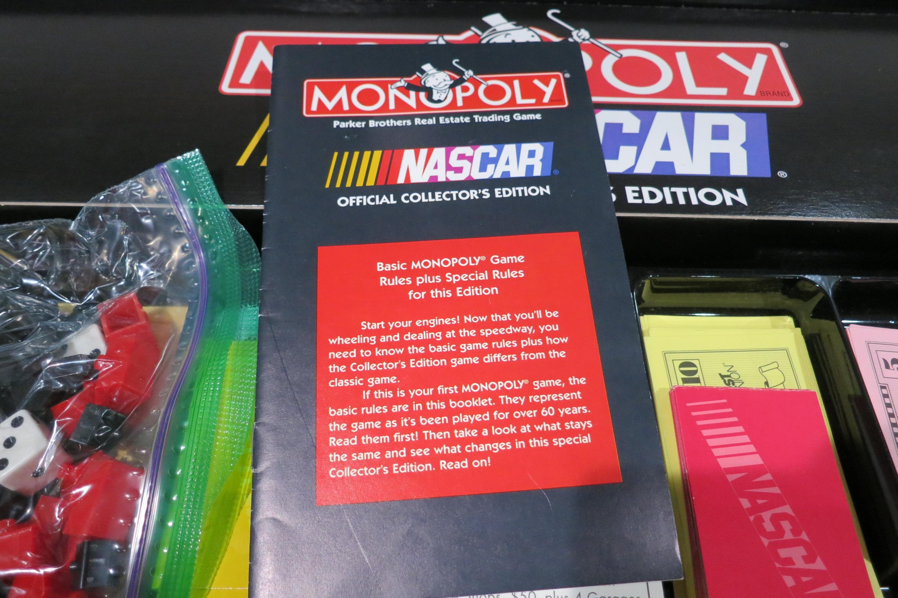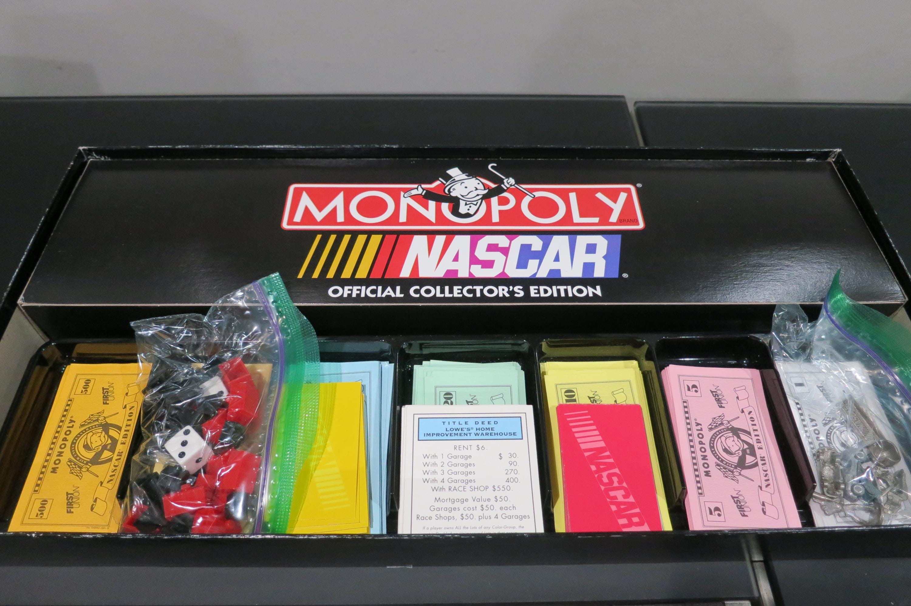 1997 Parker Brothers Board Game Monopoly Nascar Edition 100% Complete Ready to Play. Has 8 tokens, 5 are the original custom Nascar and the other three are replacement standard monopoly tokens. Original version!! Box shows some wear and has a couple taped corners.
