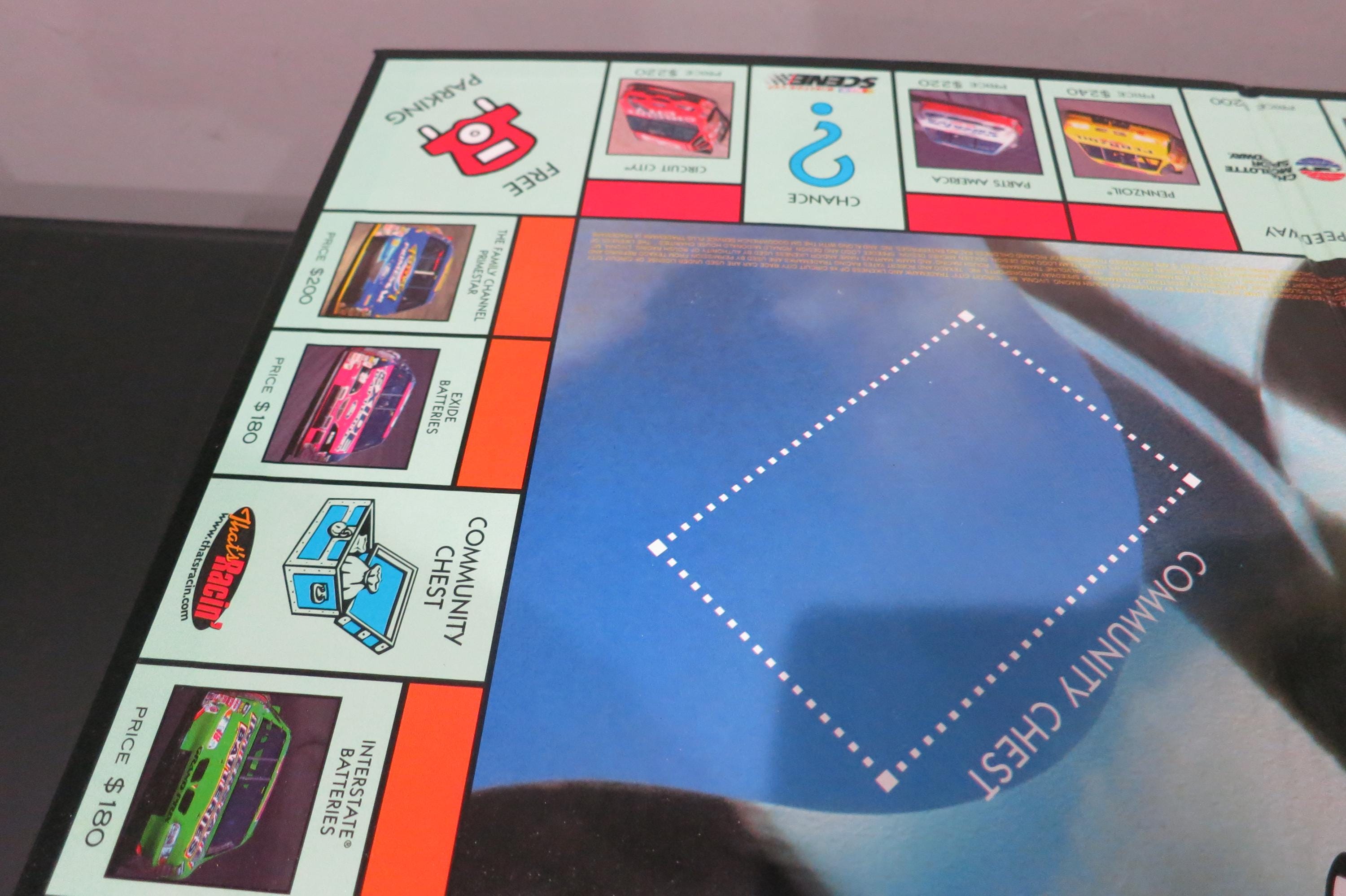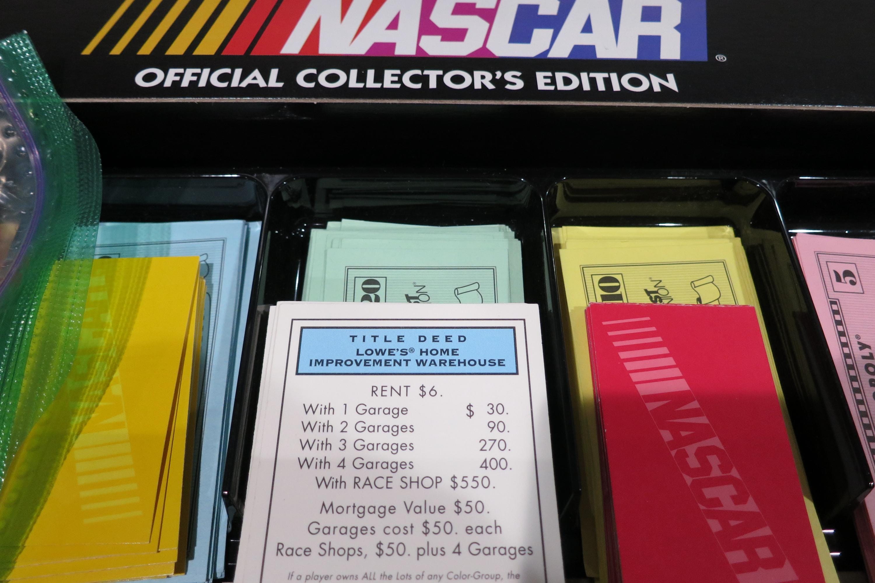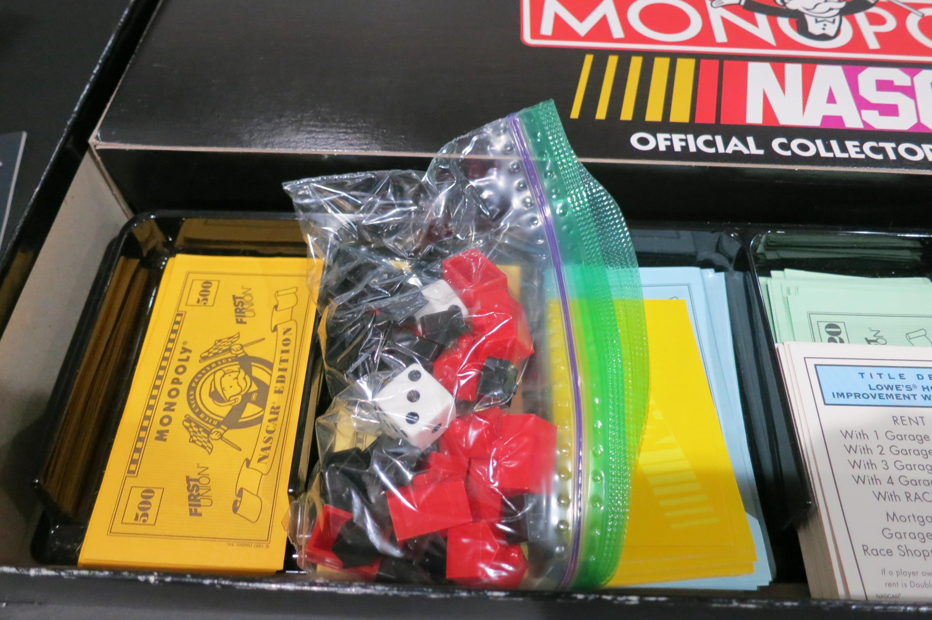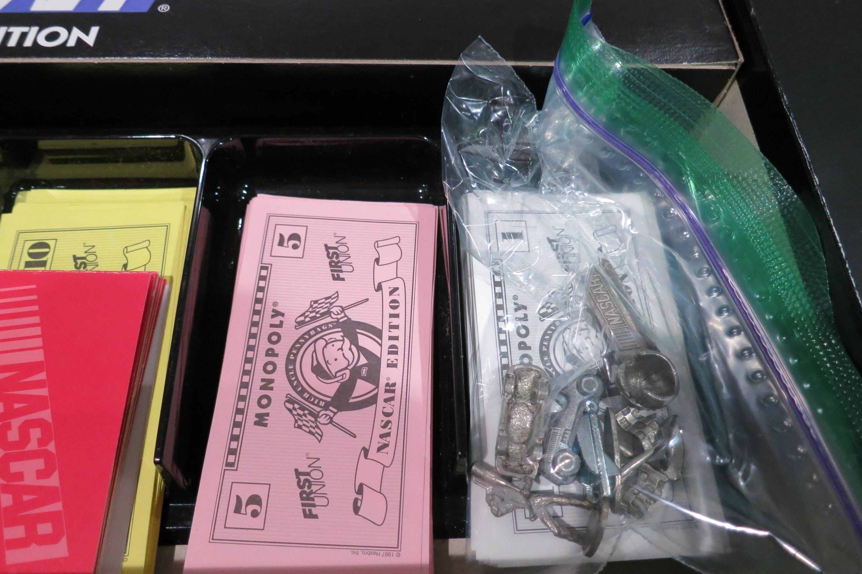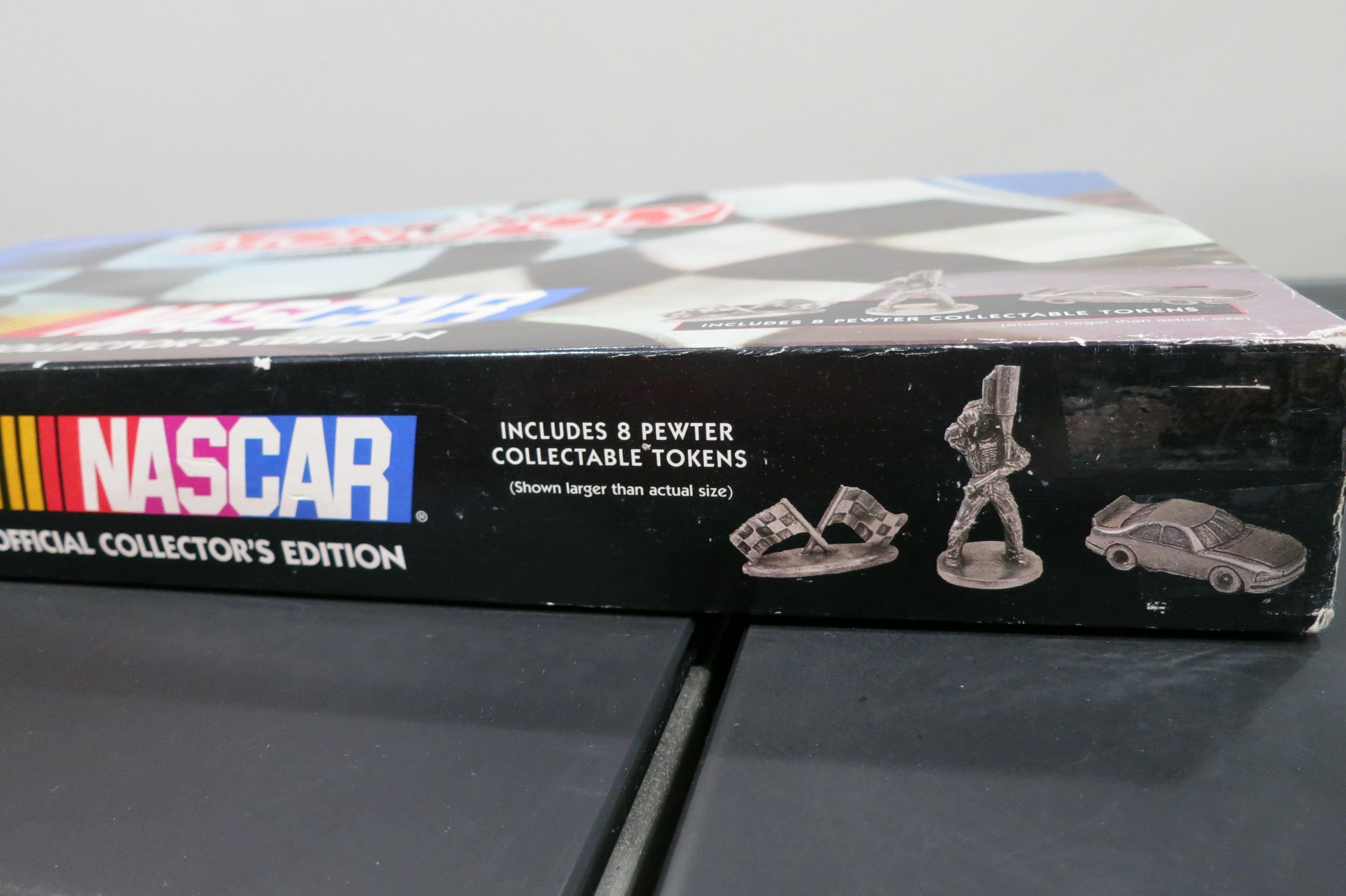 1997 Parker Brothers Board Game Monopoly Nascar Edition 100% Complete Ready to Play. Has 8 tokens, 5 are the original custom Nascar and the other three are replacement standard monopoly tokens. Original version!! Box shows some wear and has a couple taped corners.