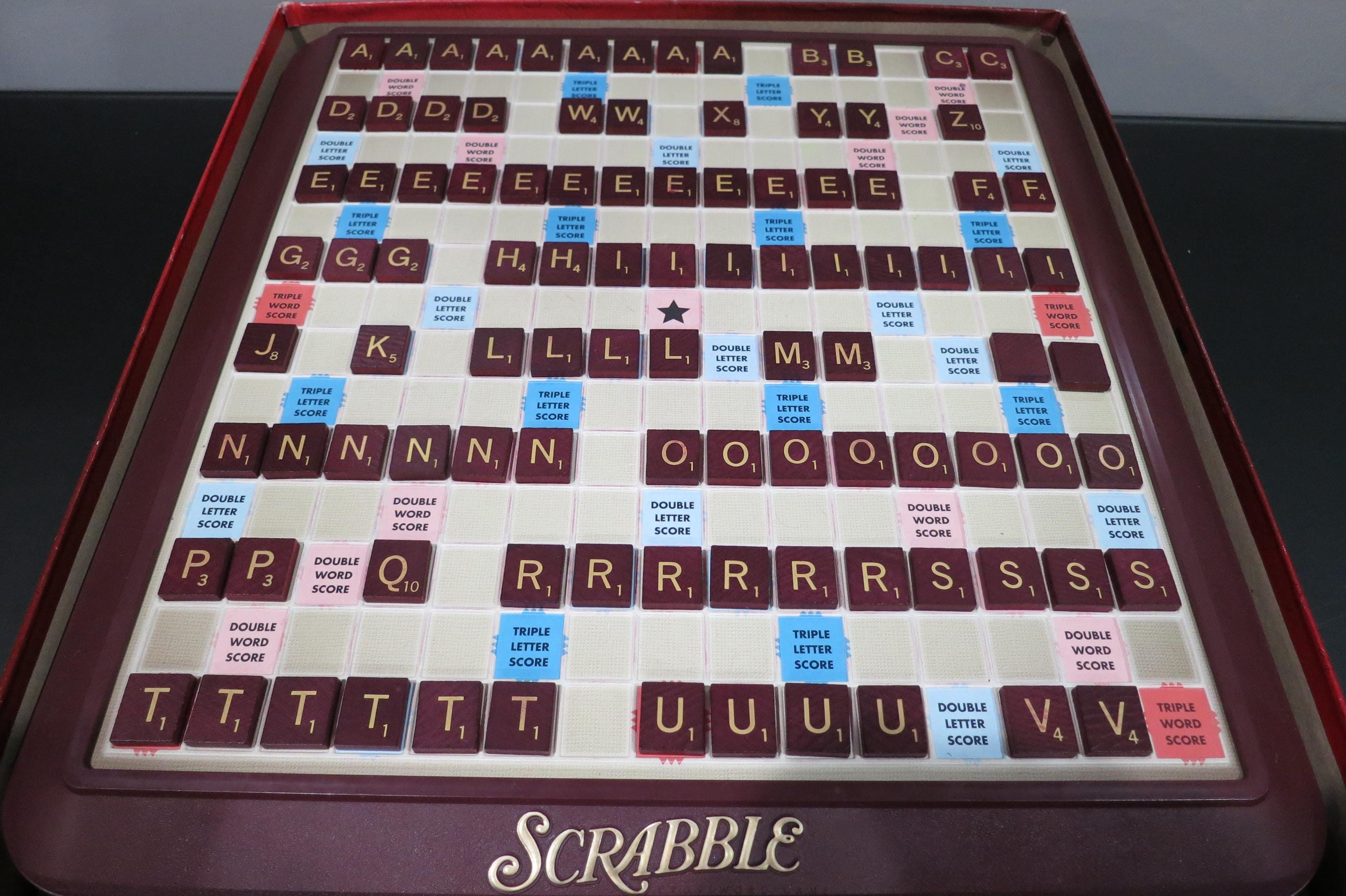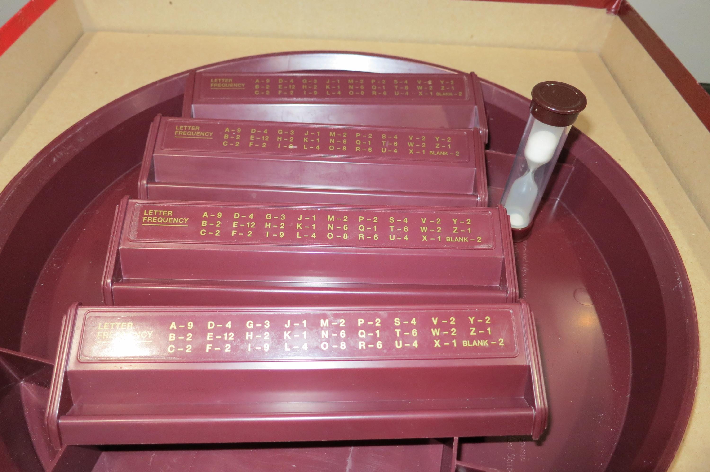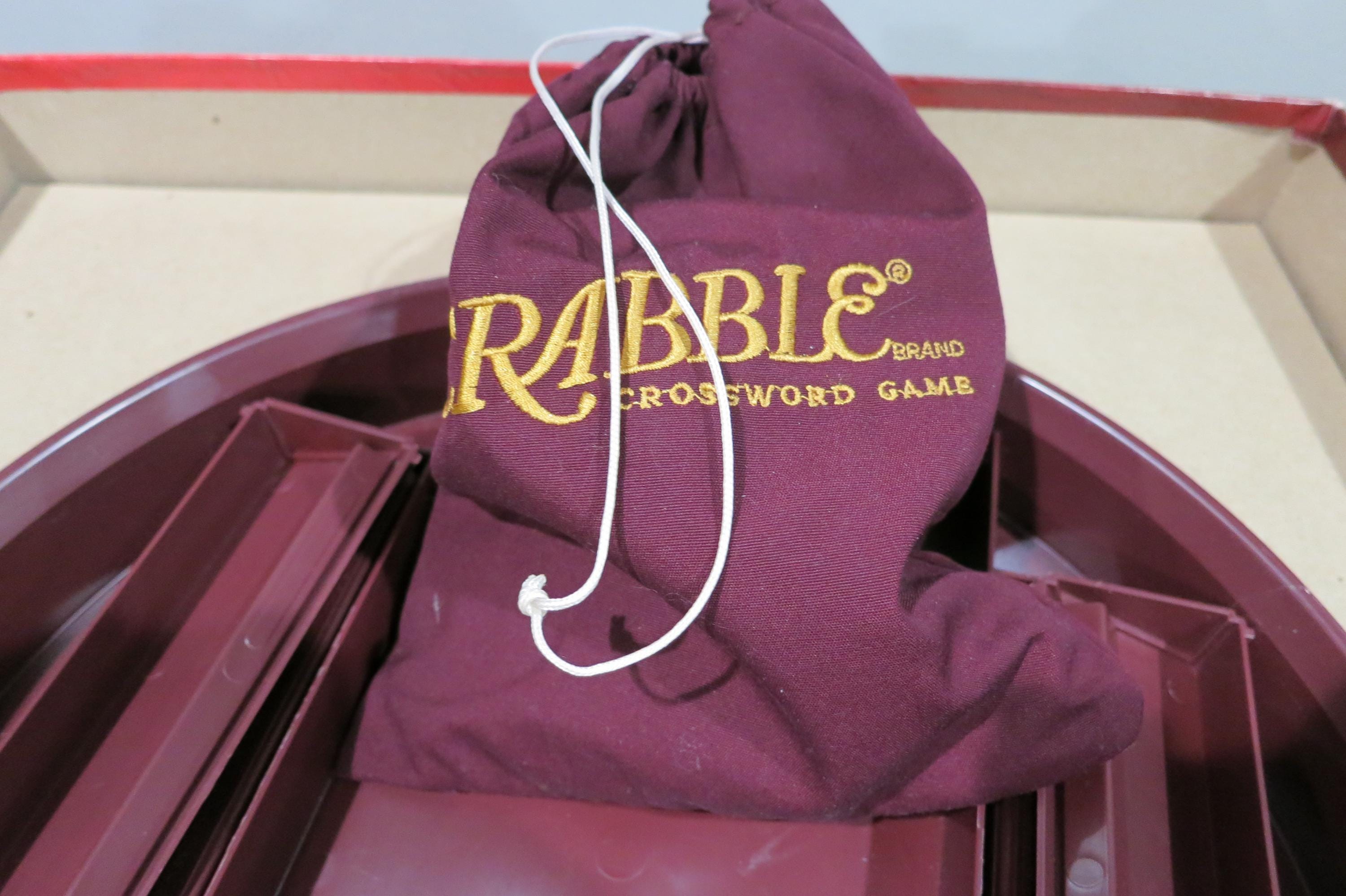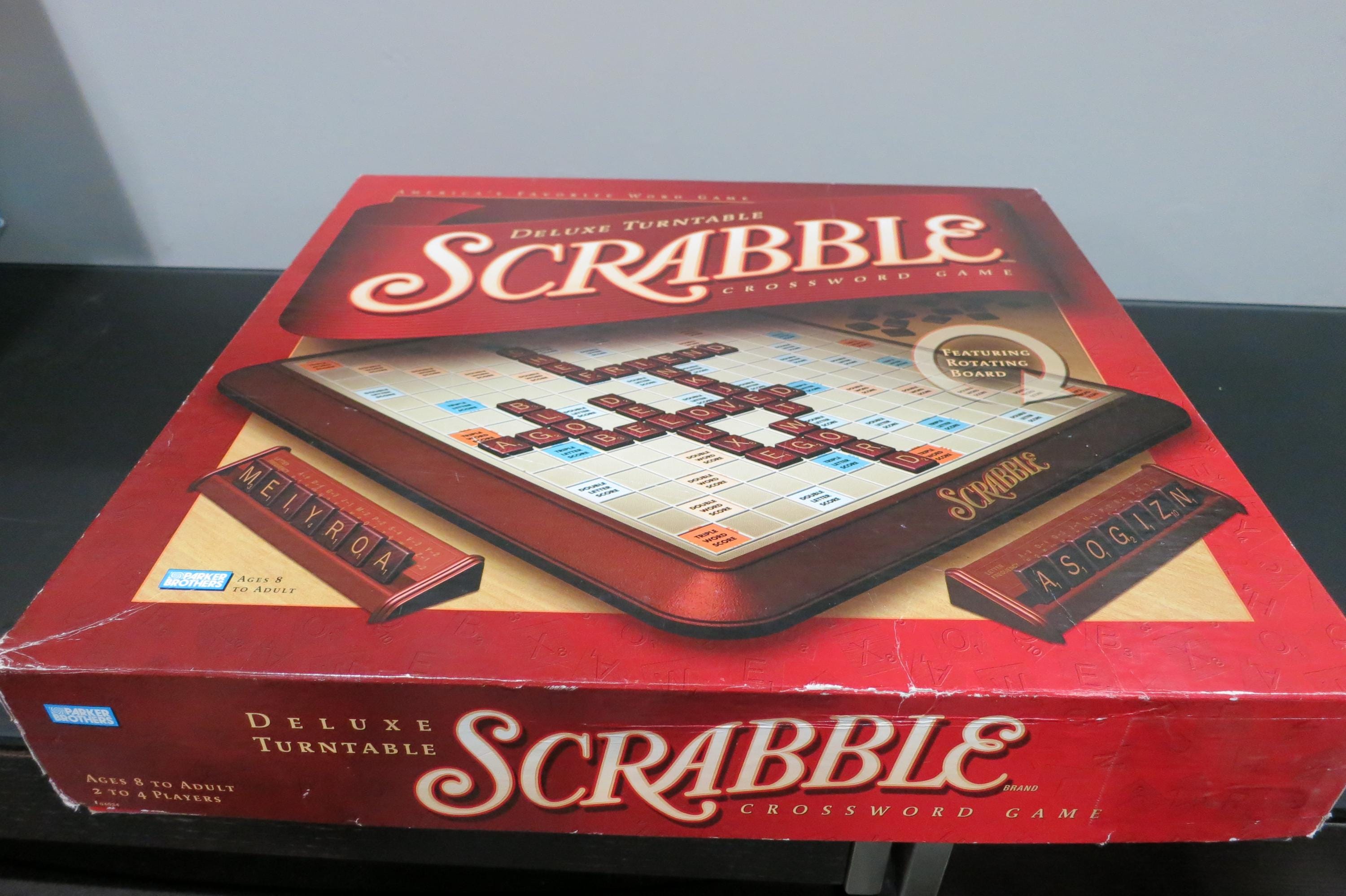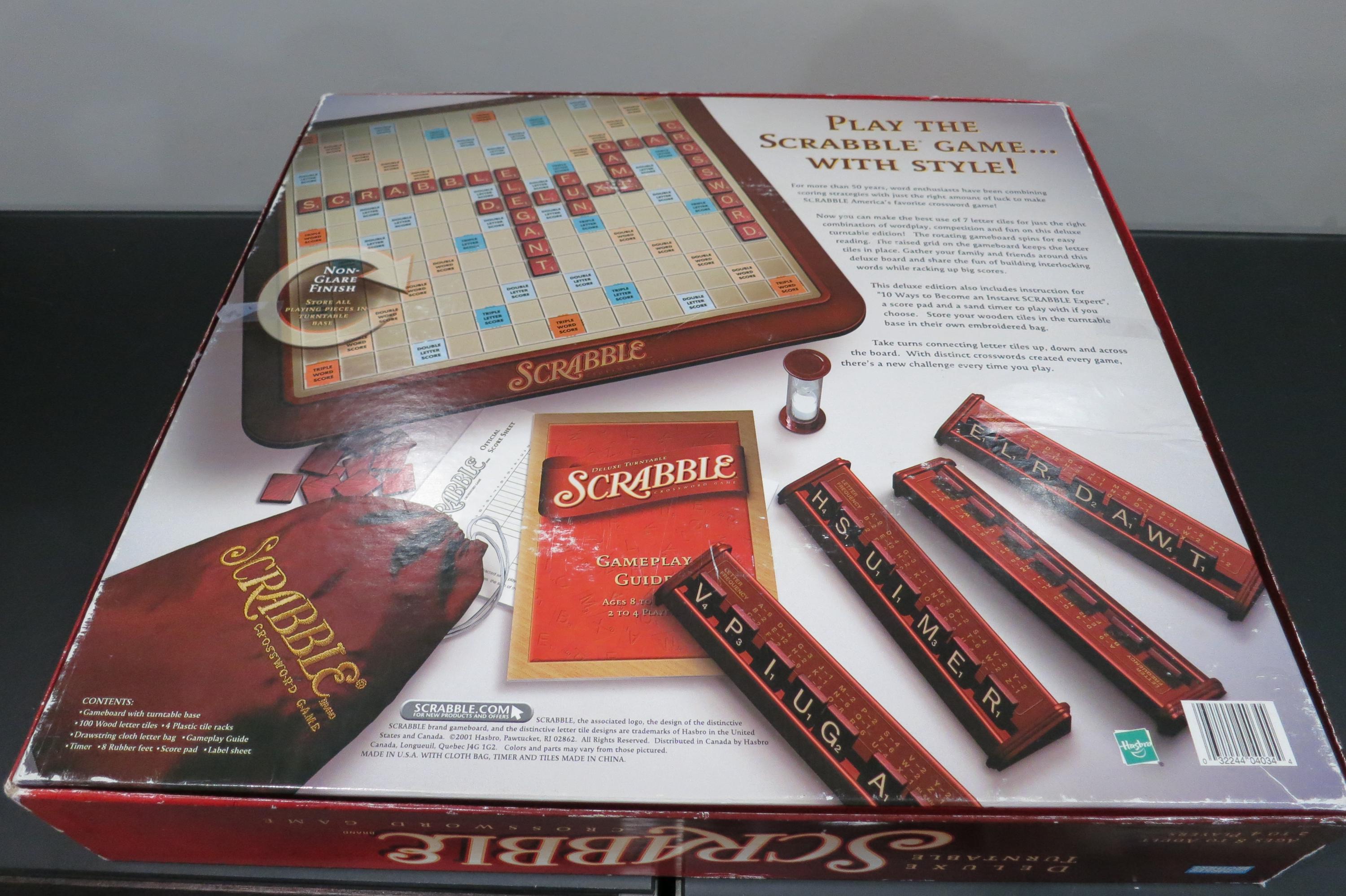 2001 Deluxe Collectors Edition Turntable Scrabble Milton Bradley 100% Complete Excellent Condition Wood Tiles. Great Game!! Excellent Condition! Hours of fun. Has red tiles, score pad, and embroidered tile bag. Rotating board, timer and instructions. Box shows light wear. Perfect Gift!!