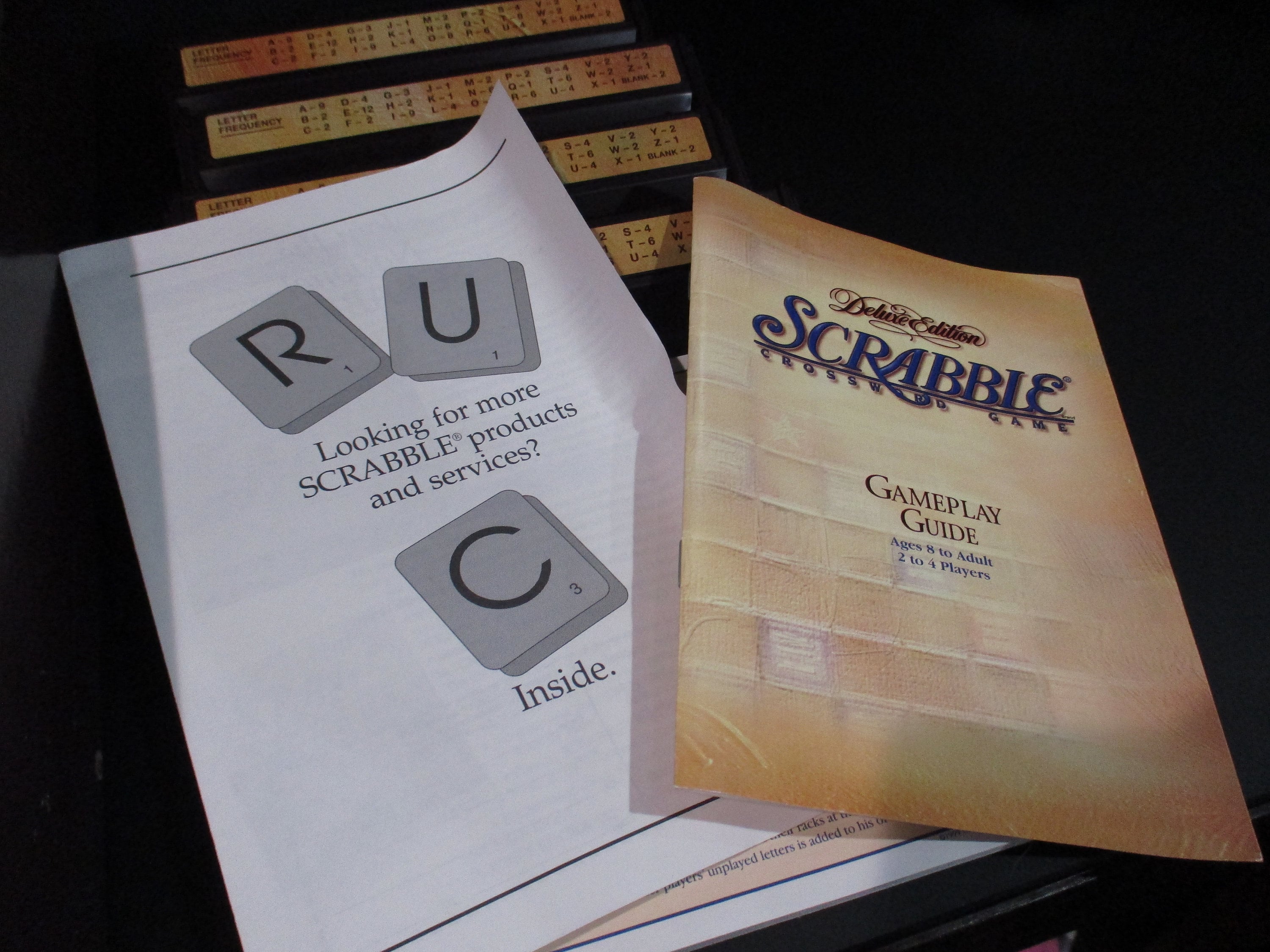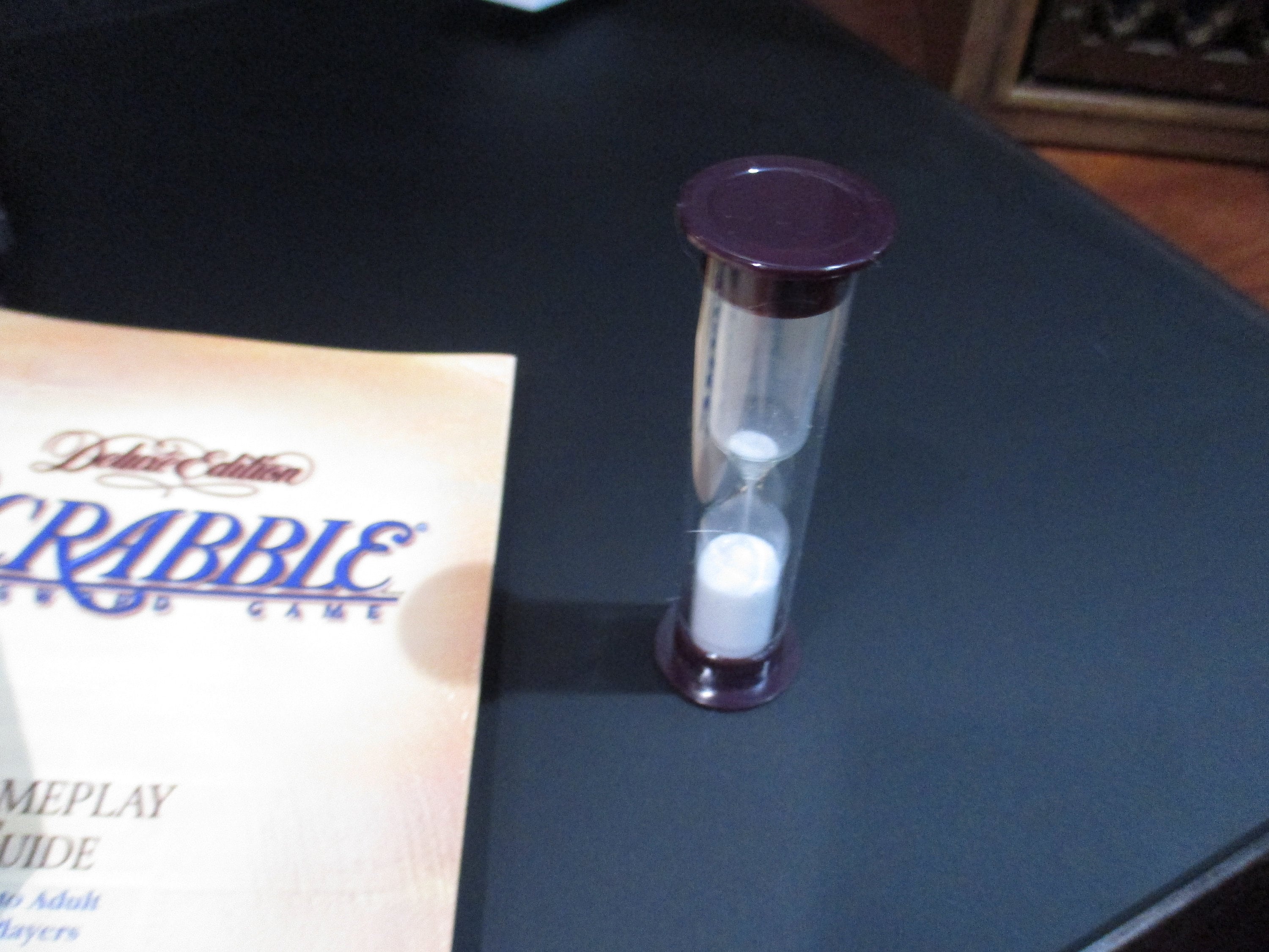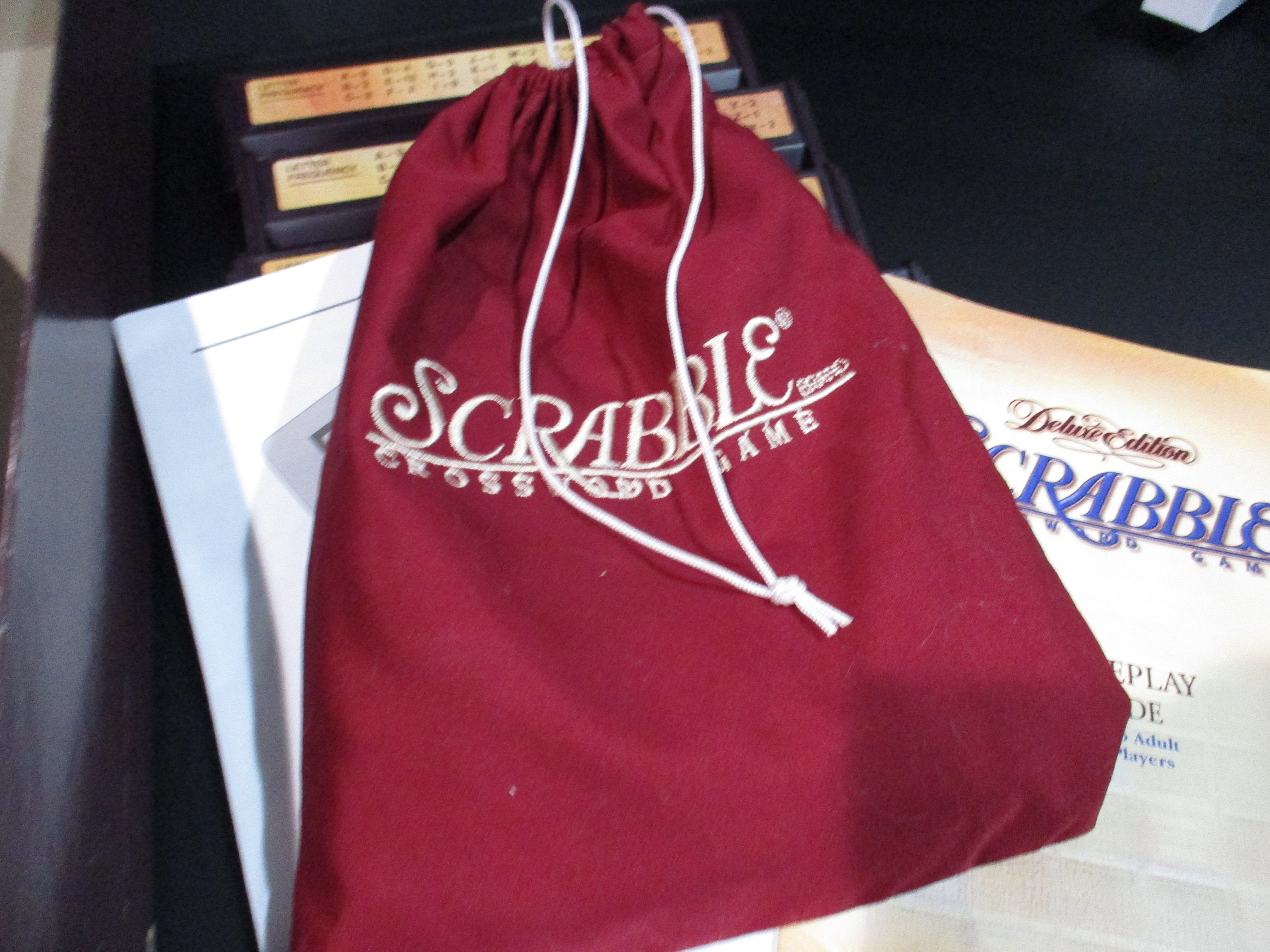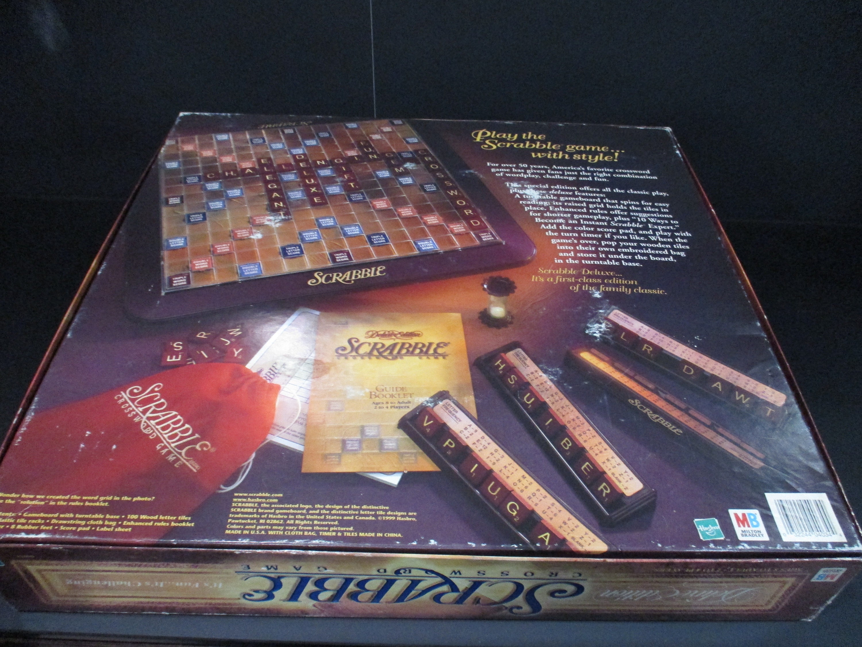 Vintage 1999 Deluxe Collectors Edition Turntable Scrabble Milton Bradley 100% Complete Excellent Condition Wood Tiles. Great Game, Hours of enjoyment! Includes the fancy red and gold tiles and embroidered tile bag, instructions and timer. Box shows normal wear for the age and size. Great Gift with Free Shipping