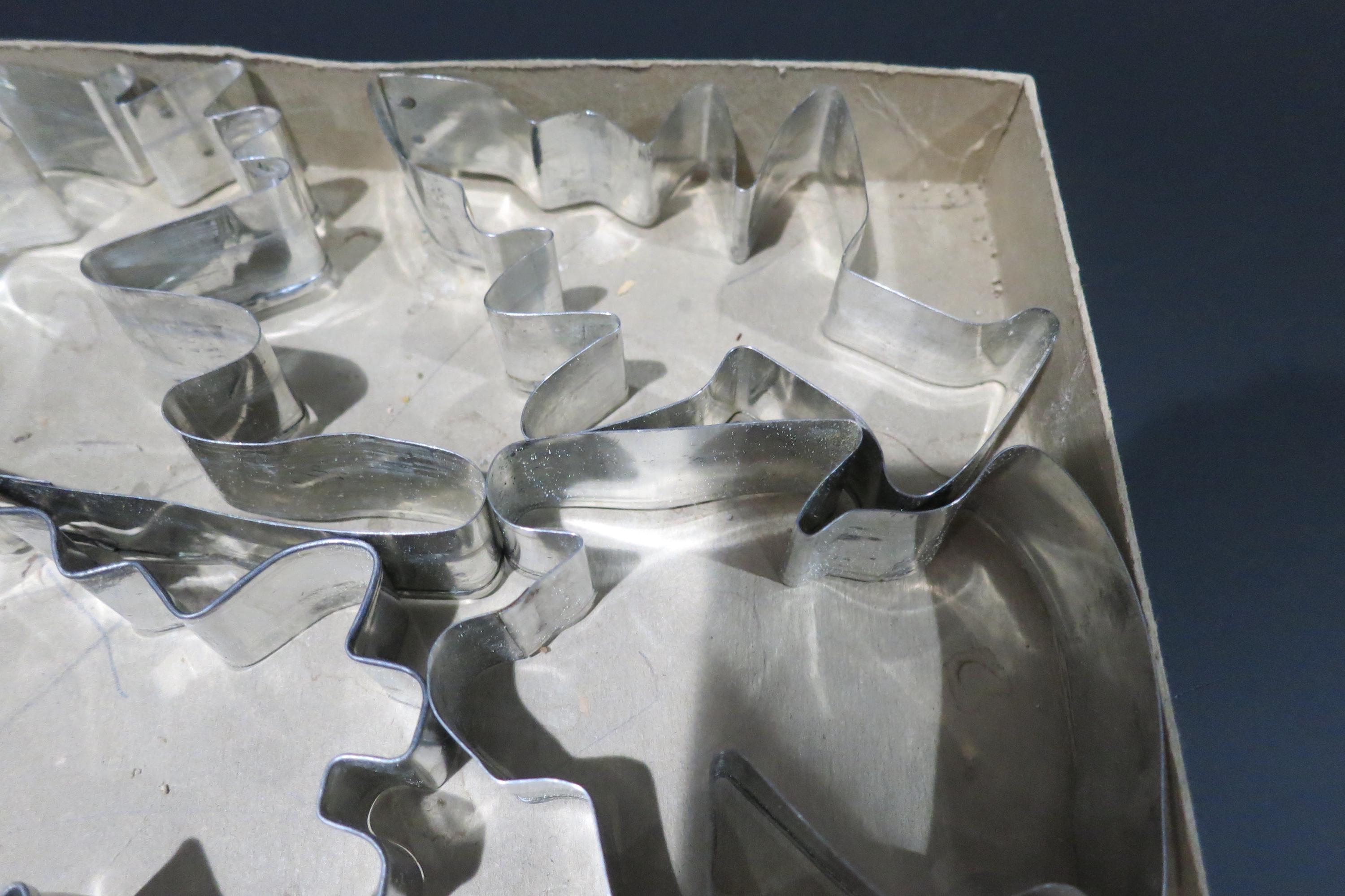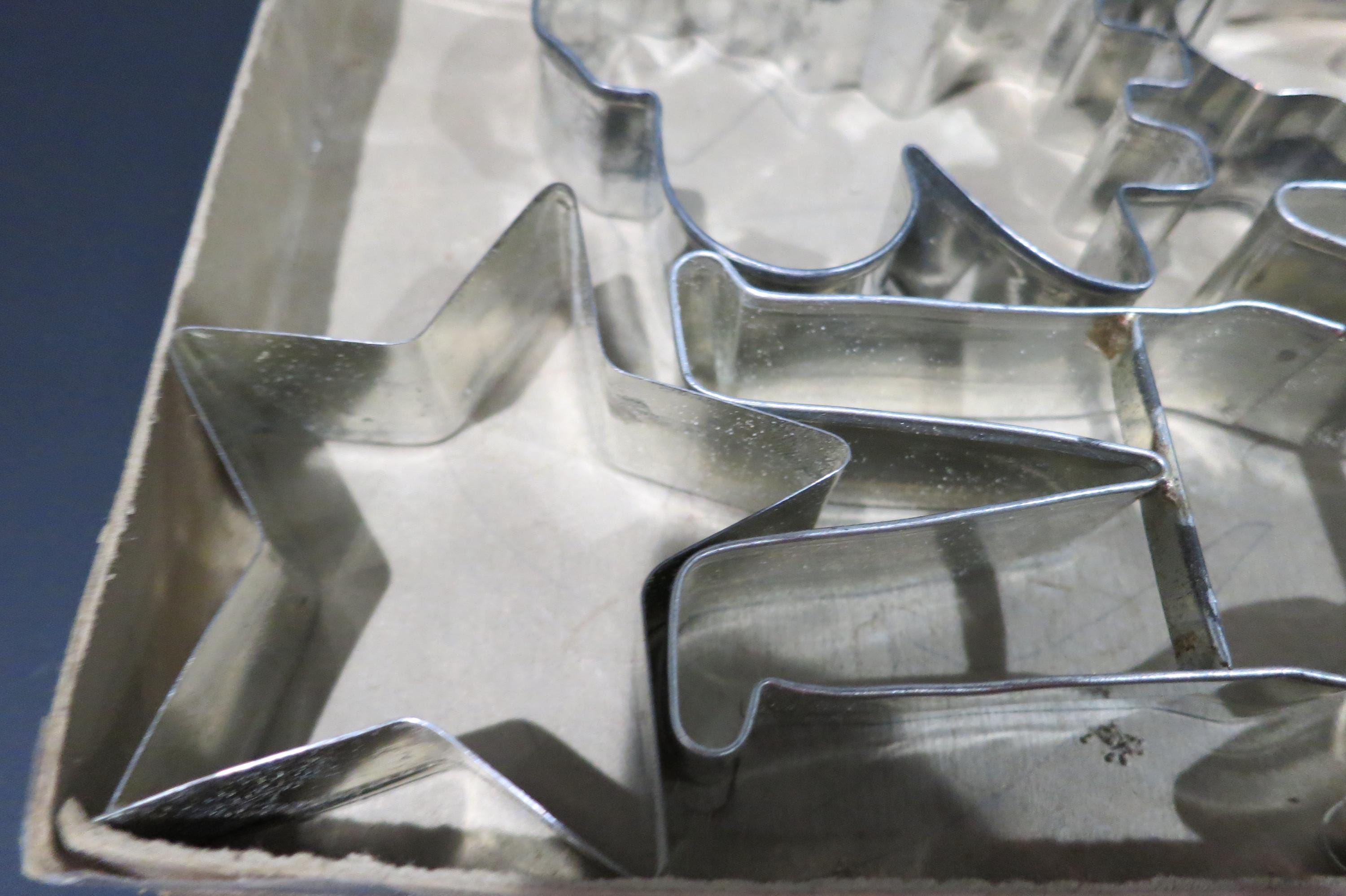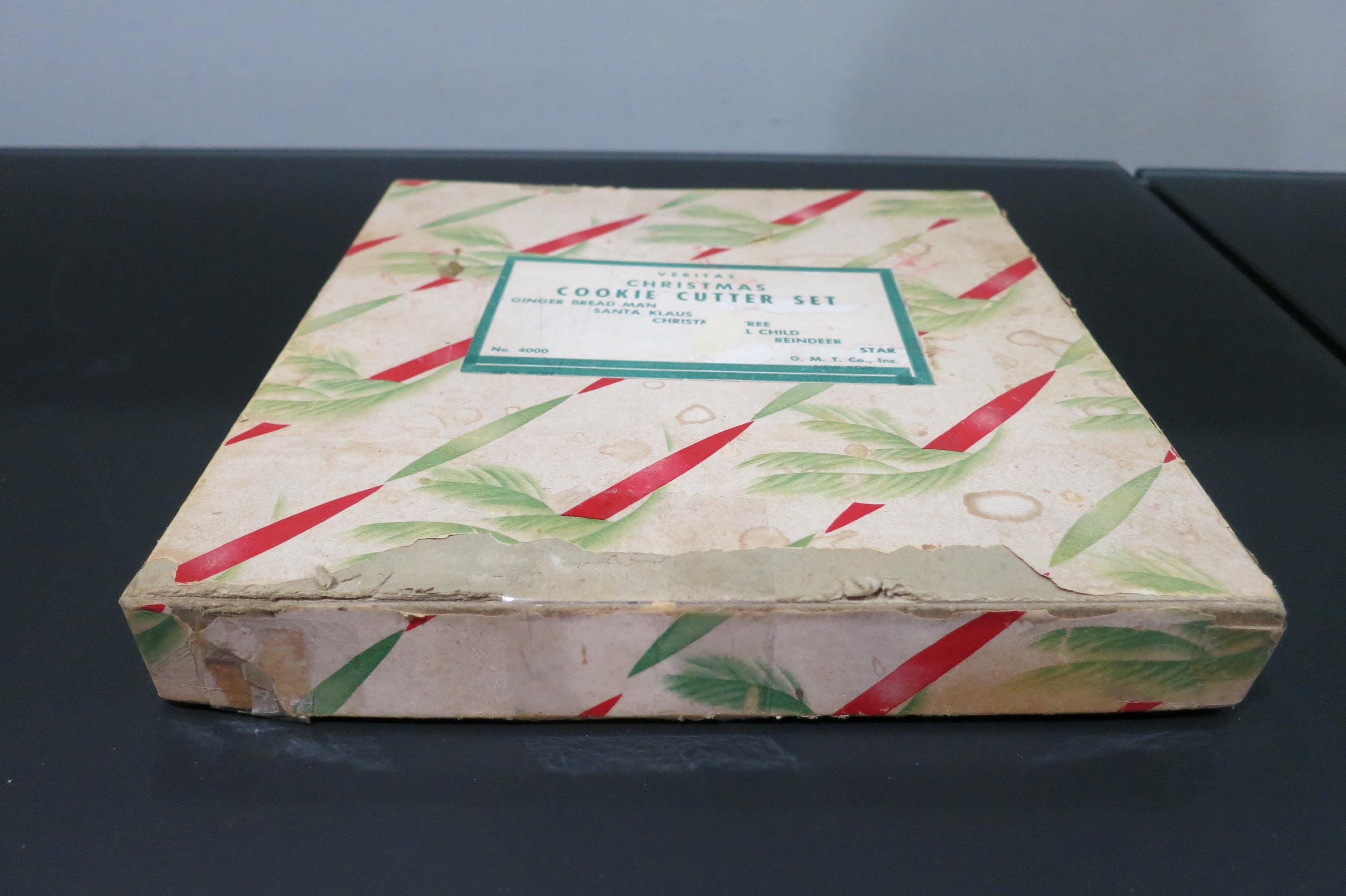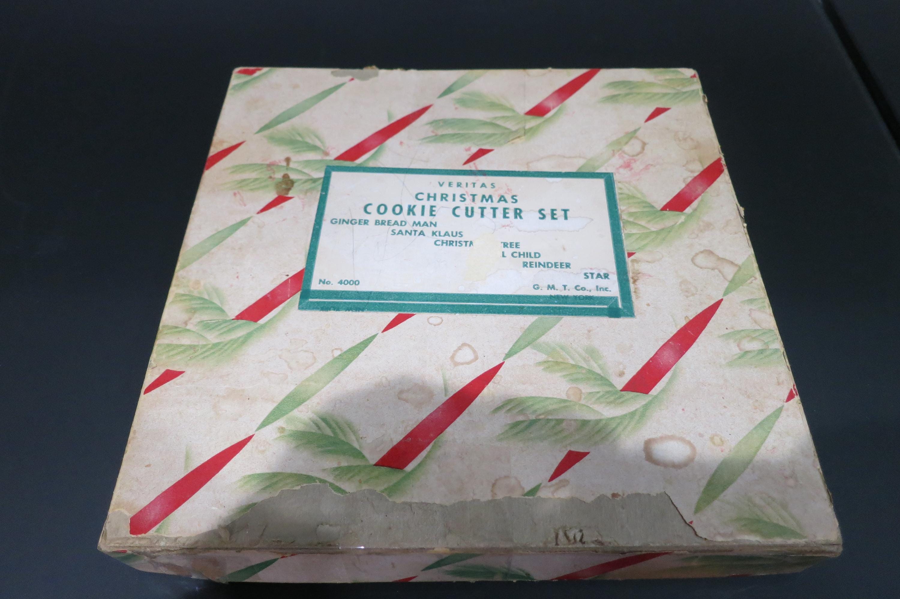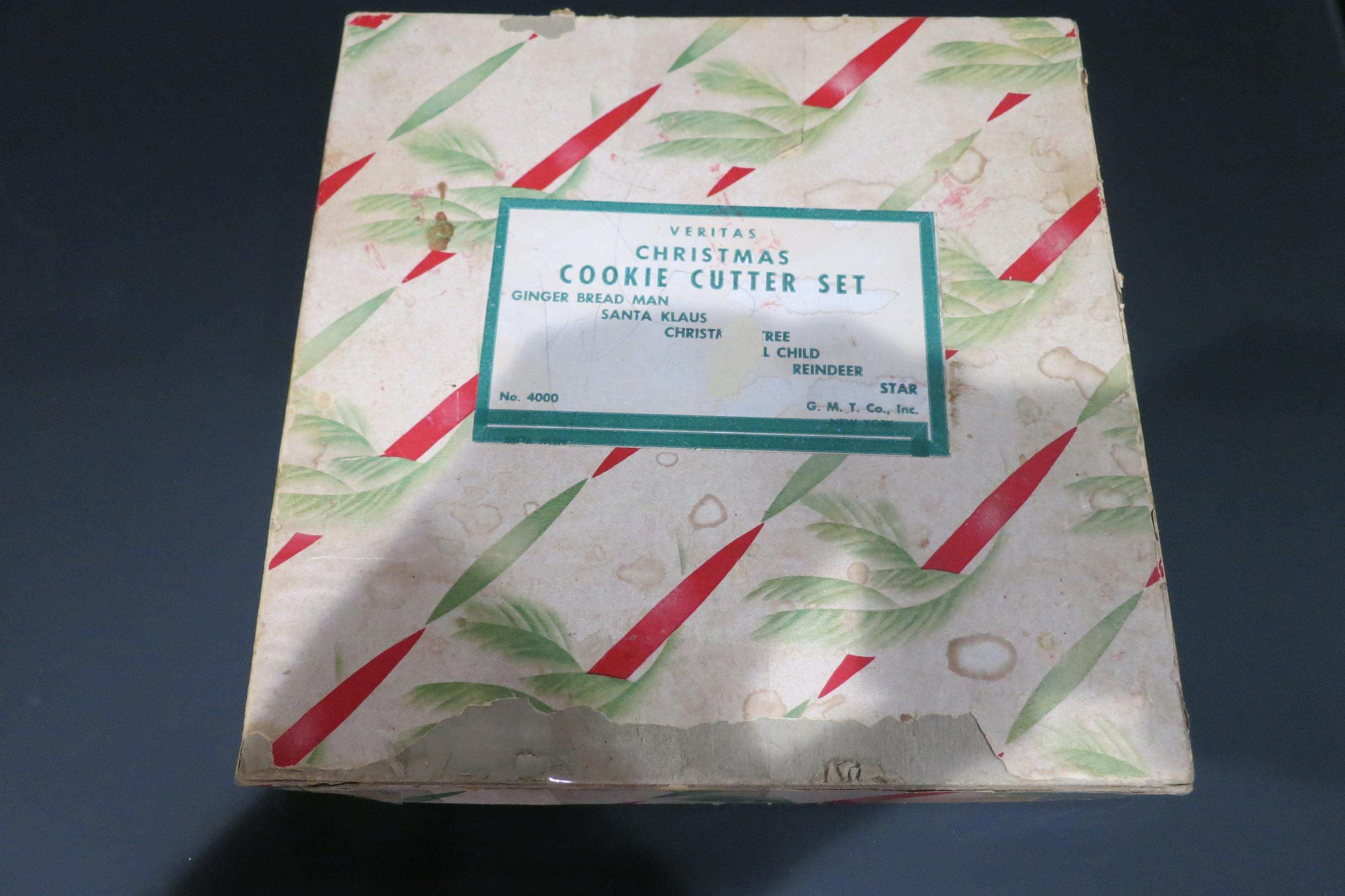 Vintage 1950's Veritas Christmas Cookie Cutter Set Tin 7 Piece Set Reindeer Star Christmas Tree Angel More. Box is in poor condition and is literally taped together! Cutters are all in excellent condition.