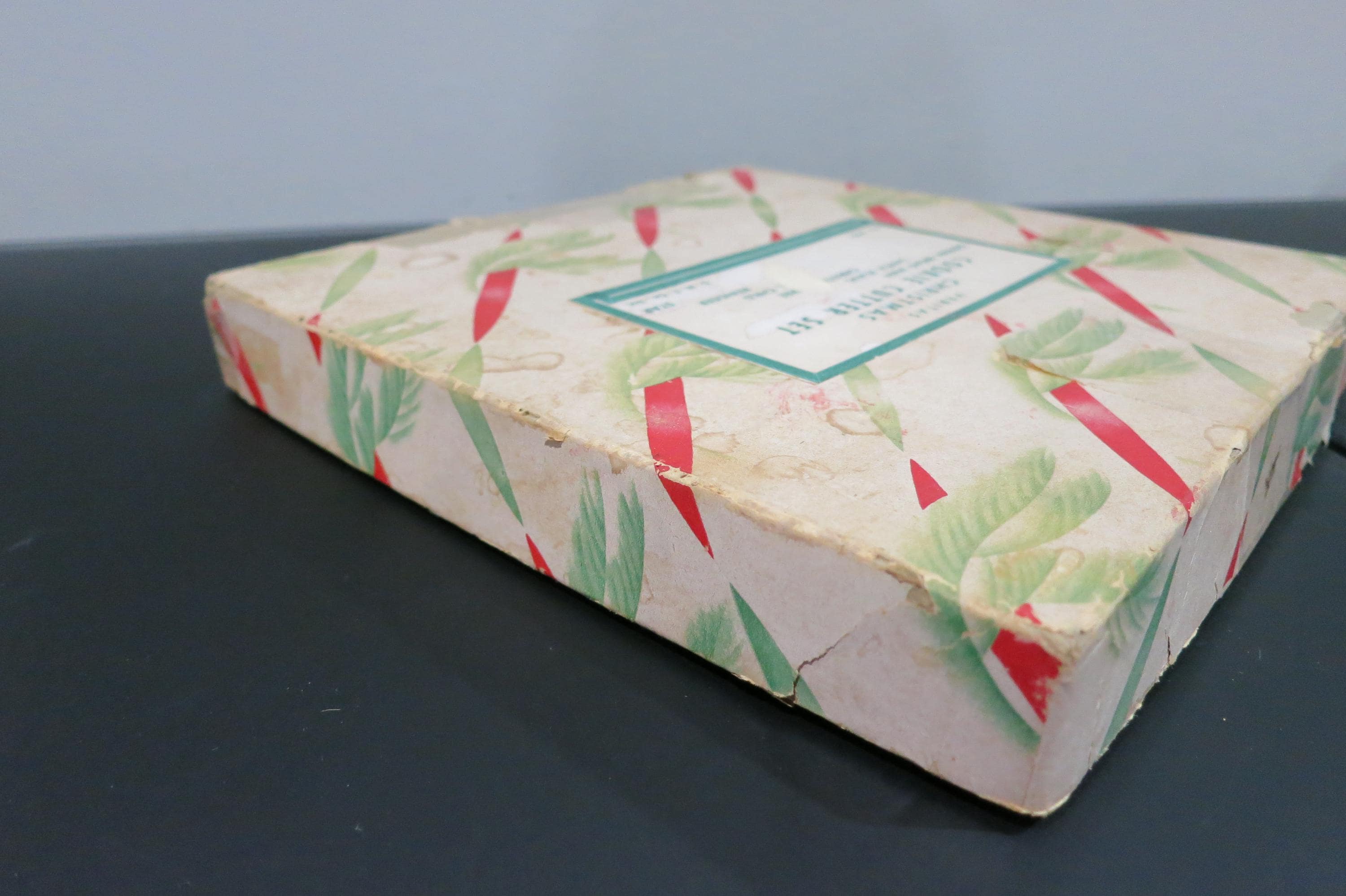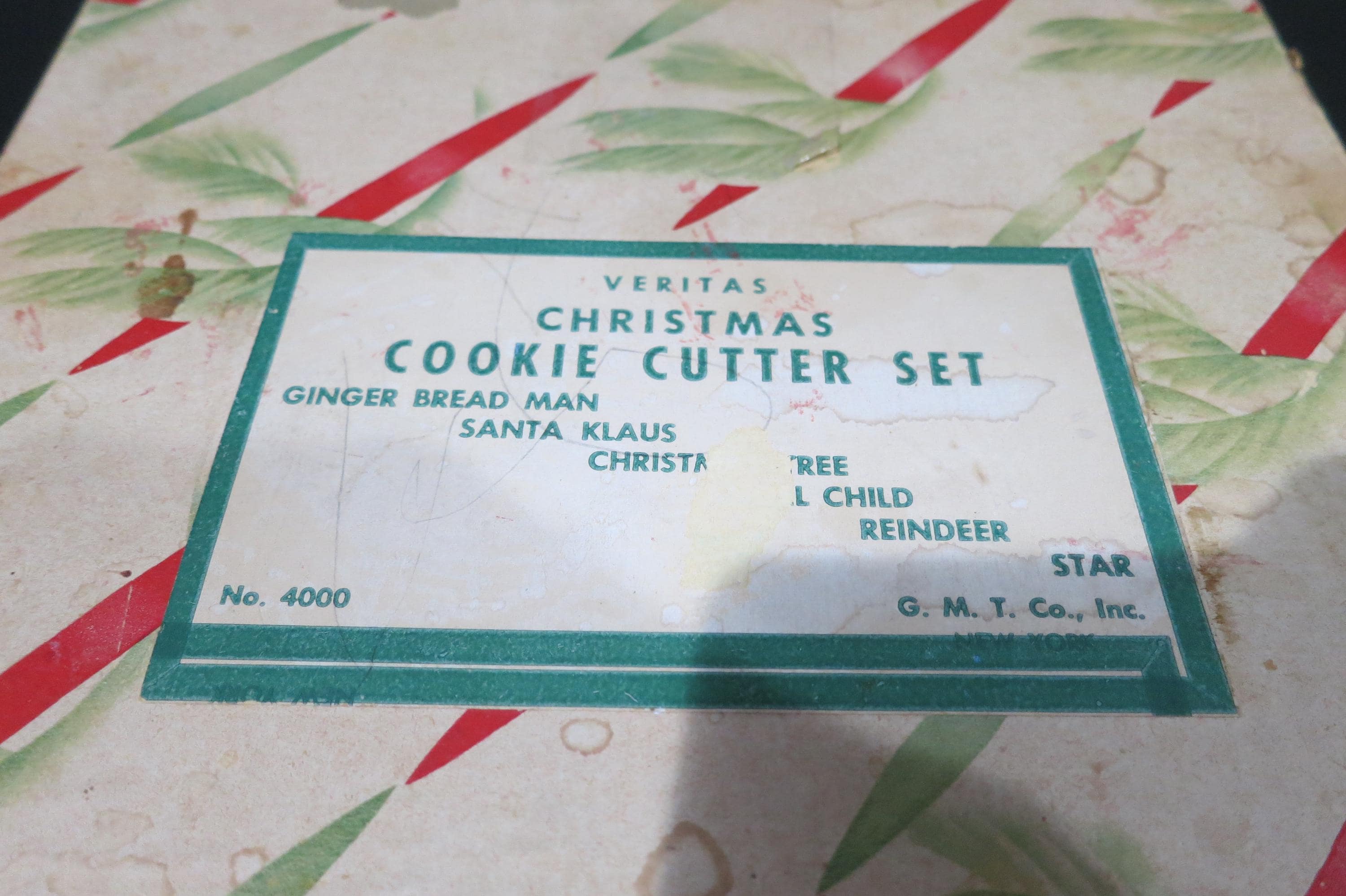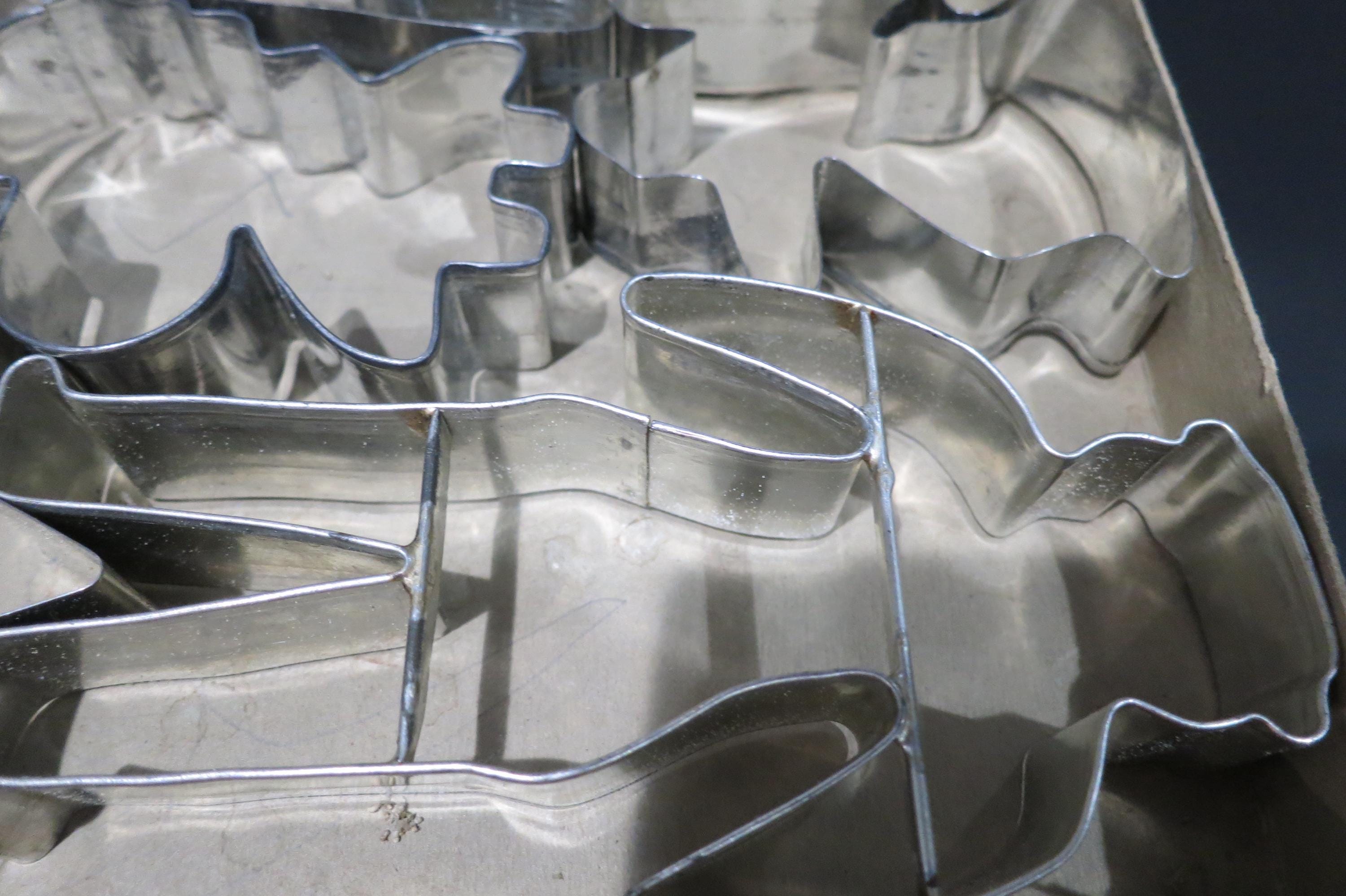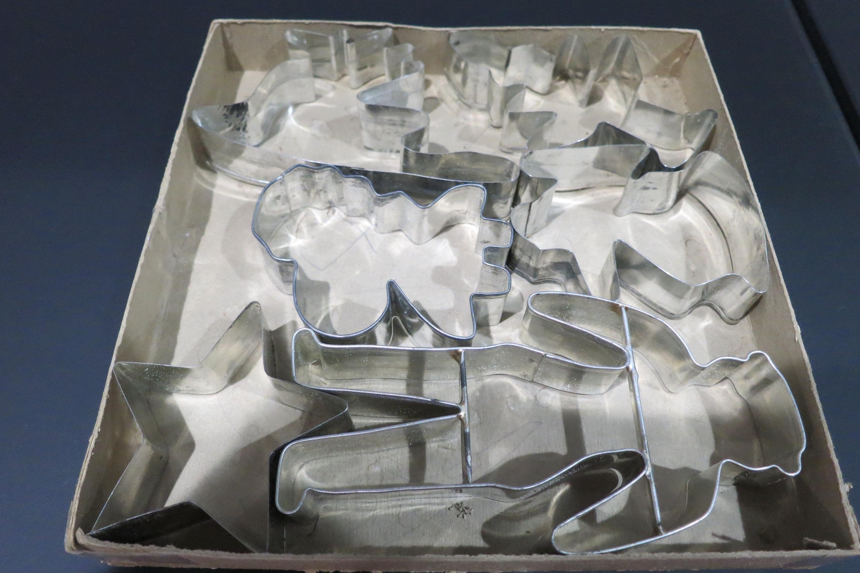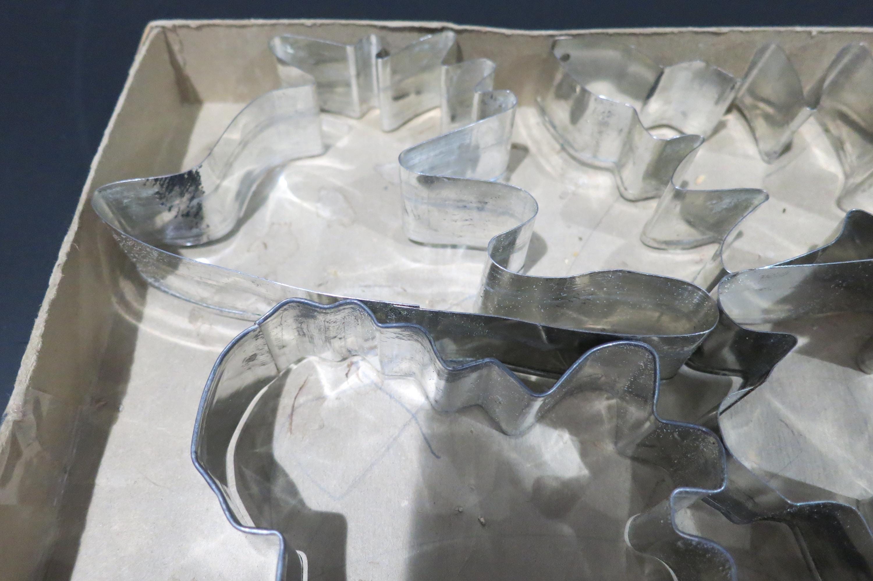 Vintage 1950's Veritas Christmas Cookie Cutter Set Tin 7 Piece Set Reindeer Star Christmas Tree Angel More. Box is in poor condition and is literally taped together! Cutters are all in excellent condition.