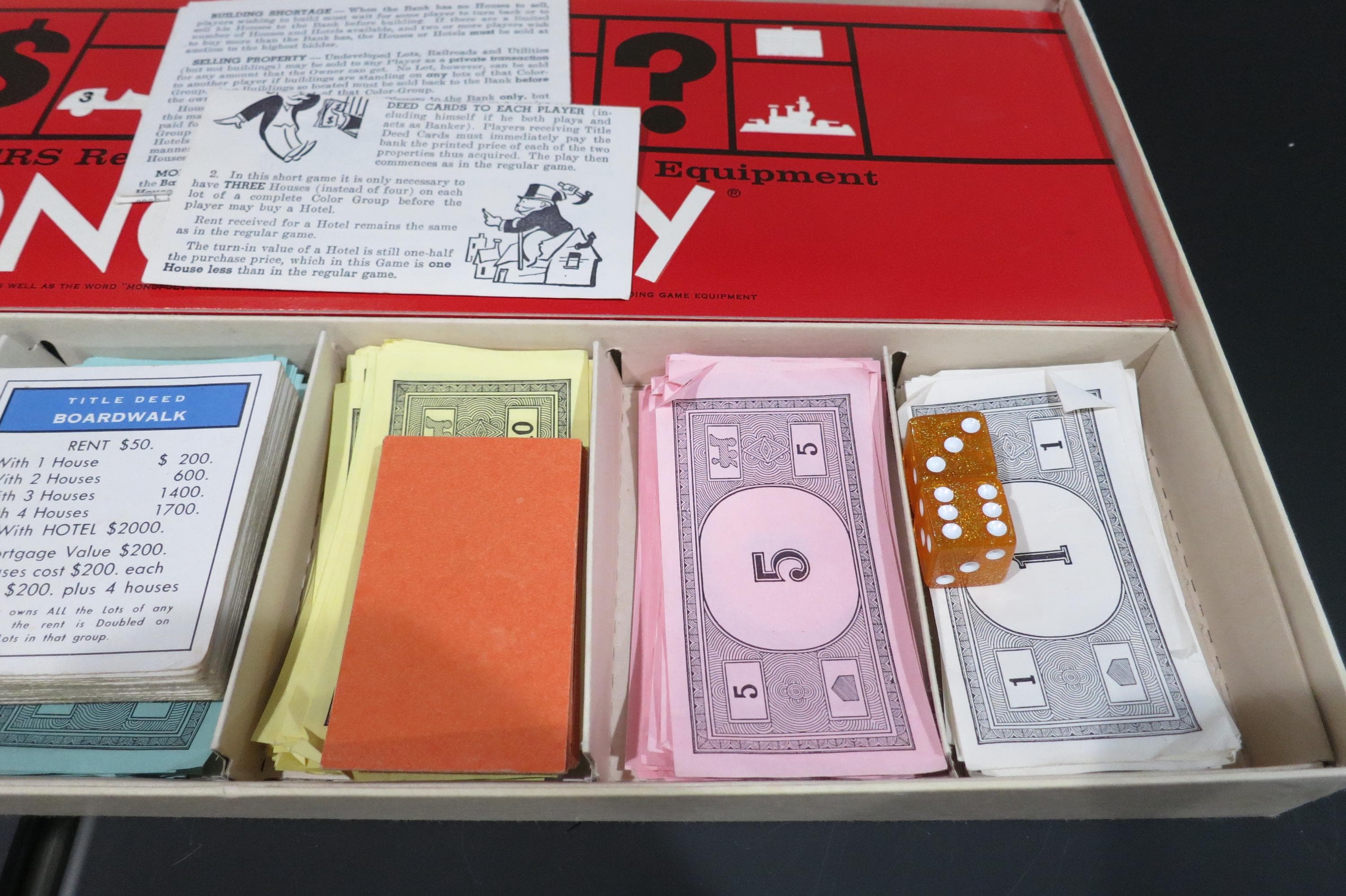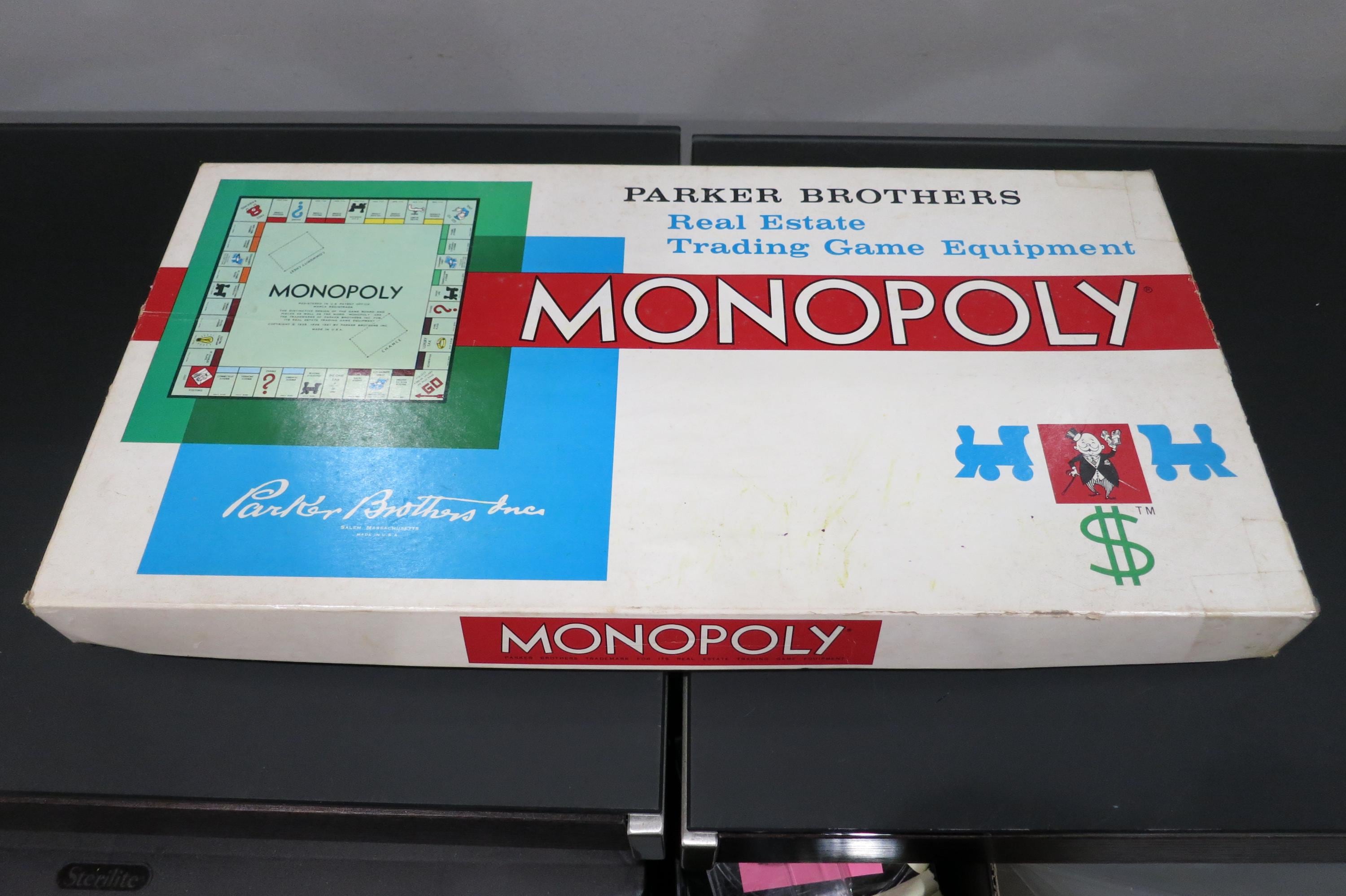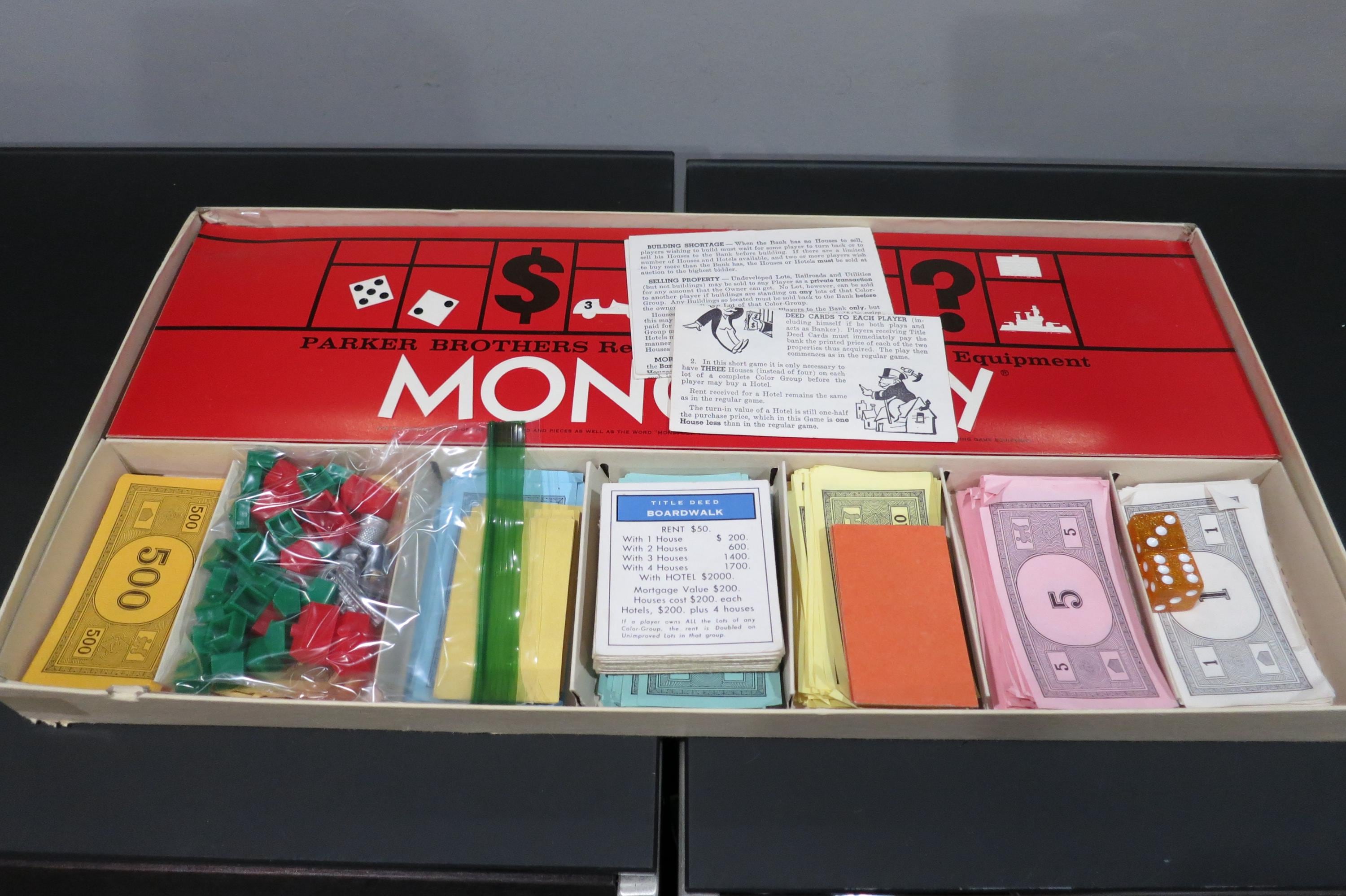 1961 Monopoly Board Game Parker Brothers 100% Complete Well Used Condition. This game shows 64 years of use! If you want a well worn but still complete version for whatever purpose this one is perfect. The box has taped corners and general wear. Community Chest and Chance Cards are worn, as are all the title deed cards. Includes the original board, which is in pretty rough condition. Neat 64 year old Monopoly Game, has probably been played hundreds of times!