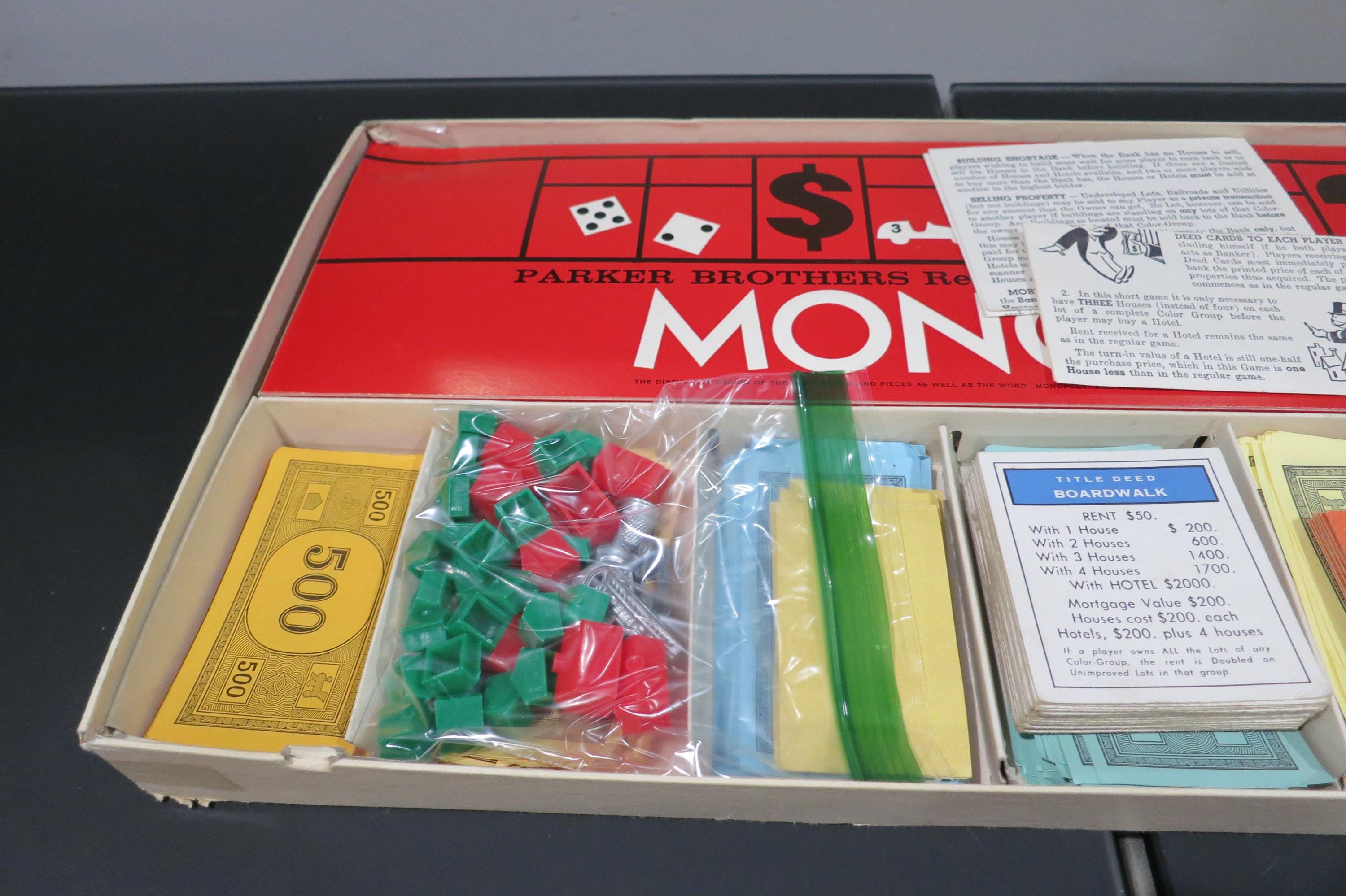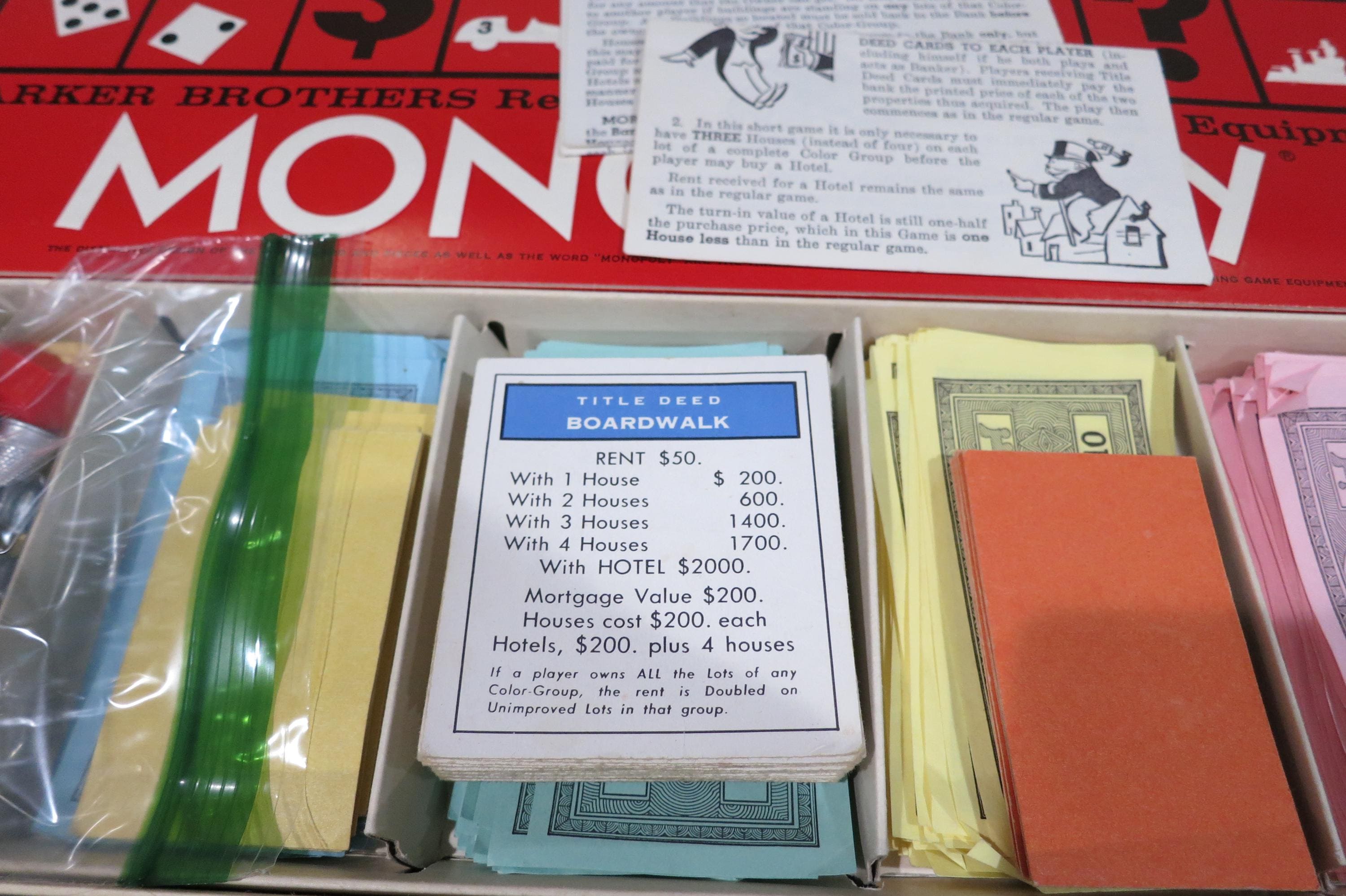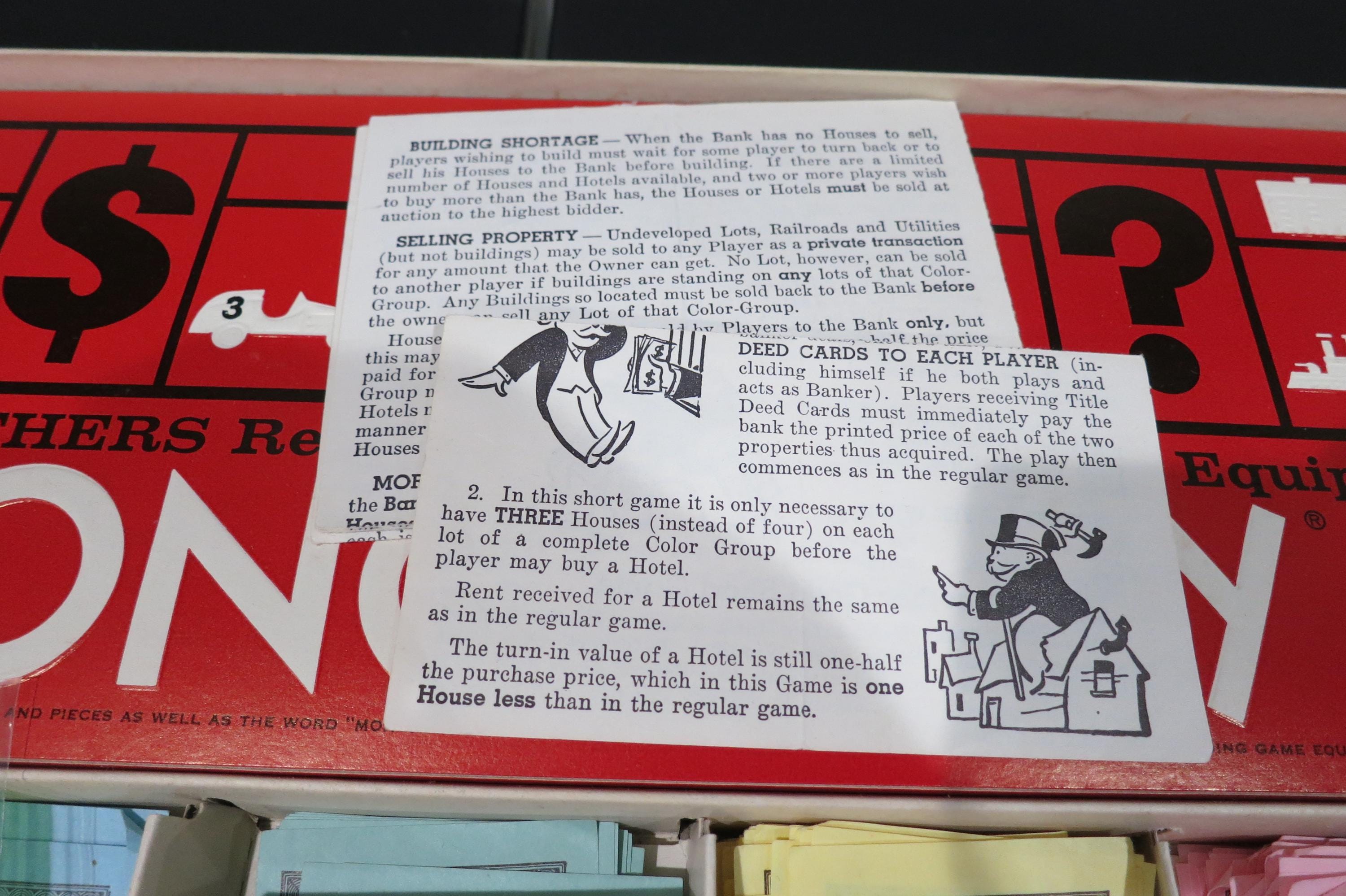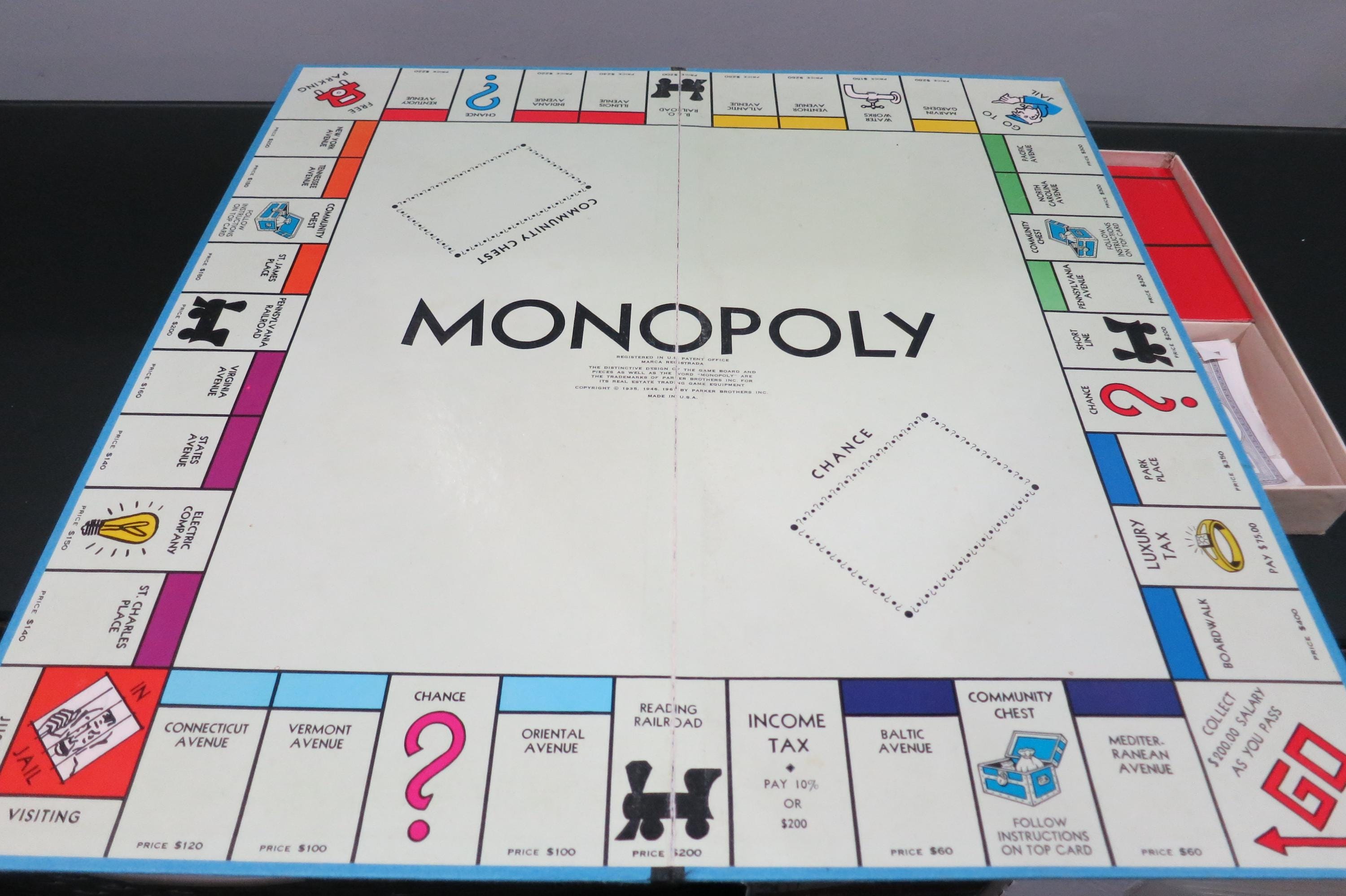 1961 Monopoly Board Game Parker Brothers 100% Complete Well Used Condition. This game shows 64 years of use! If you want a well worn but still complete version for whatever purpose this one is perfect. The box has taped corners and general wear. Community Chest and Chance Cards are worn, as are all the title deed cards. Includes the original board, which is in pretty rough condition. Neat 64 year old Monopoly Game, has probably been played hundreds of times!