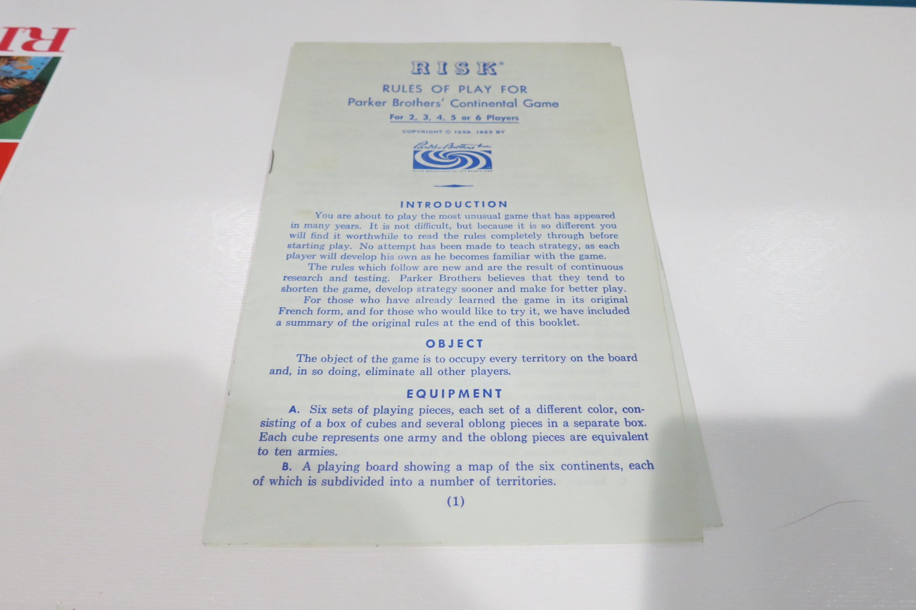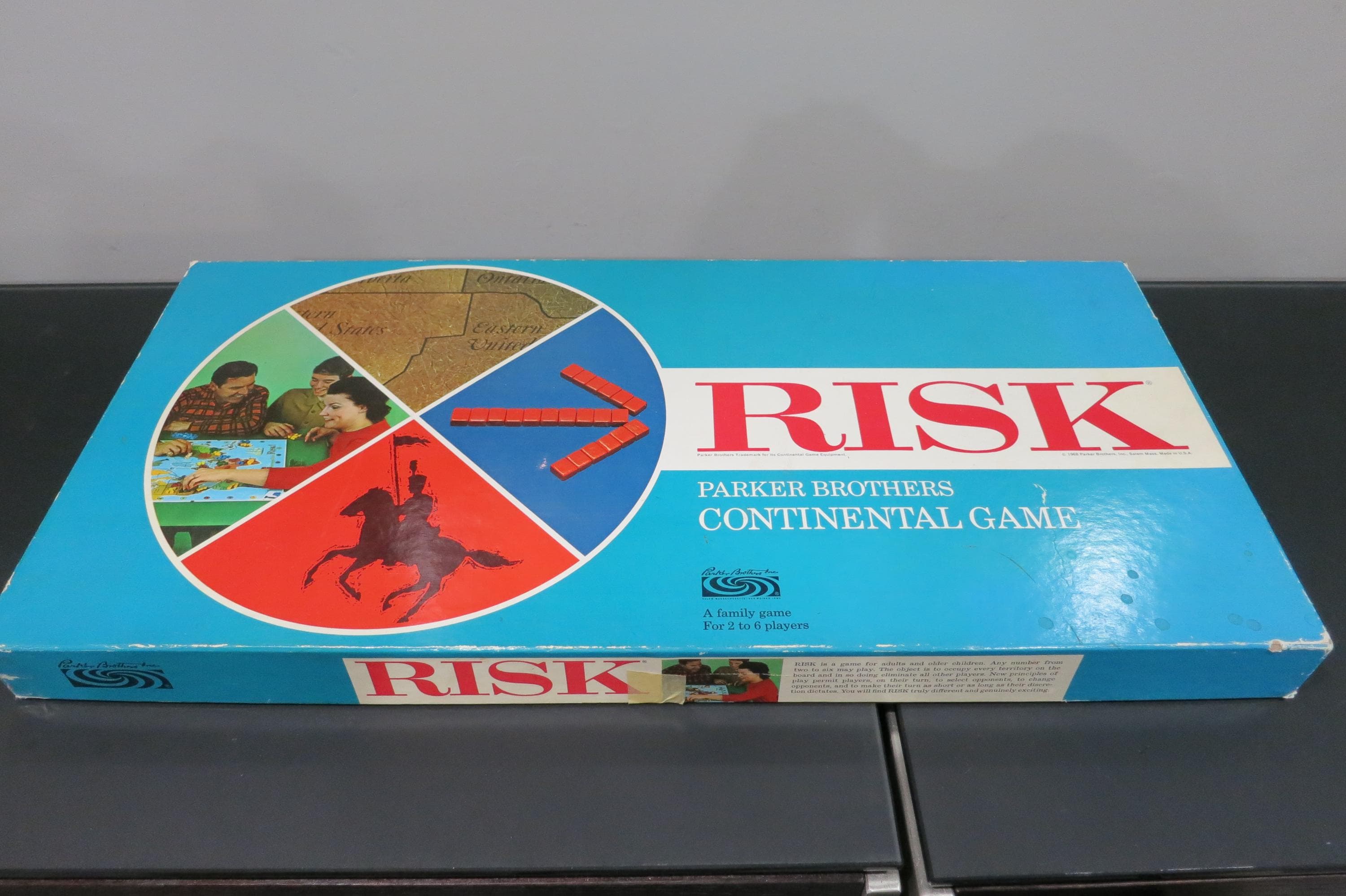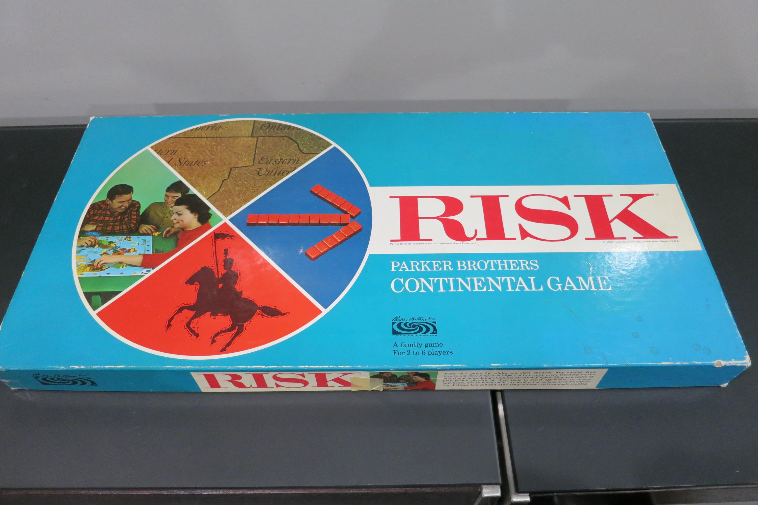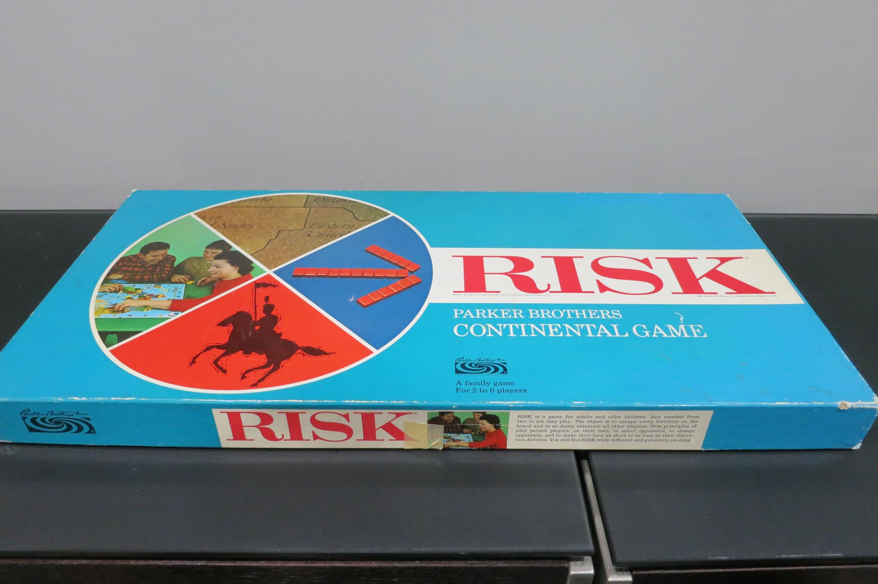 Vintage 1968 Parker Brothers Board Game RISK 100% Complete Excellent Condition Wooden Playing Pieces . Can provide hours upon hours of enjoyment. Includes the original instructions. Much neater than the brand new in the store version!! This one has wooden playing pieces. Very nice set. Box has 2 taped corners and wear to the bottom.