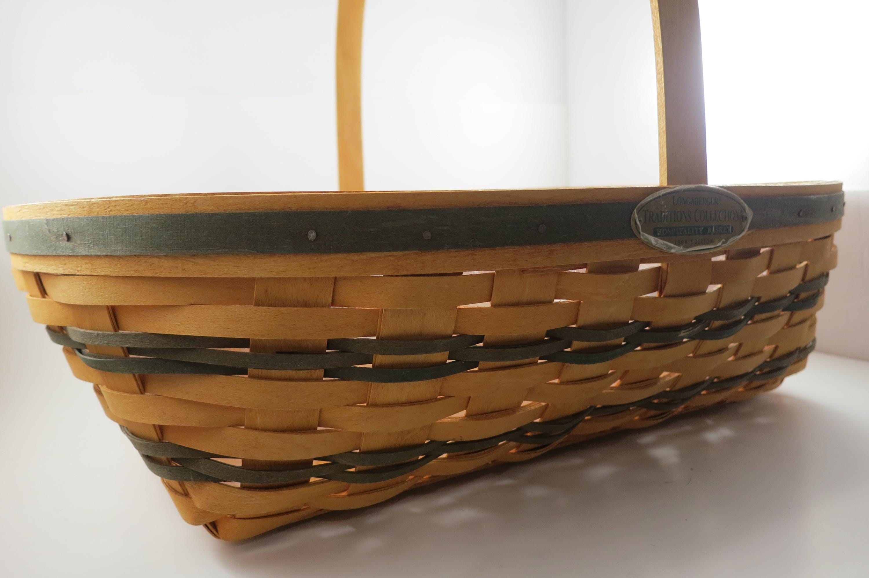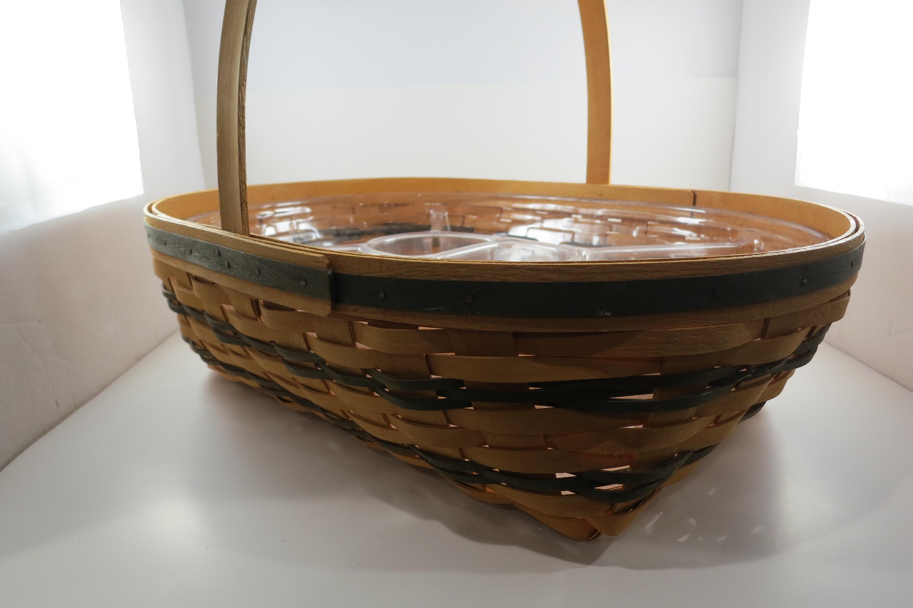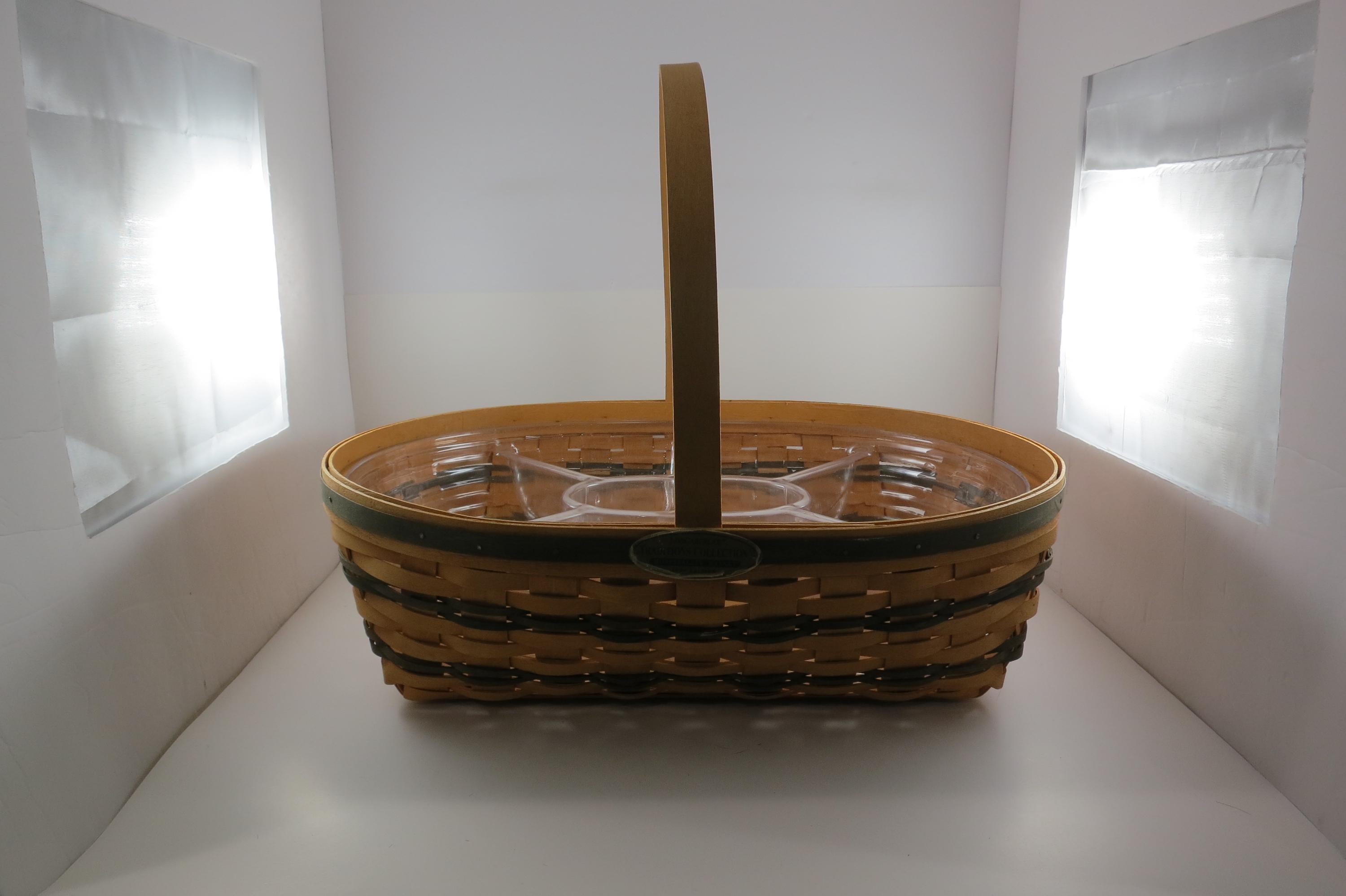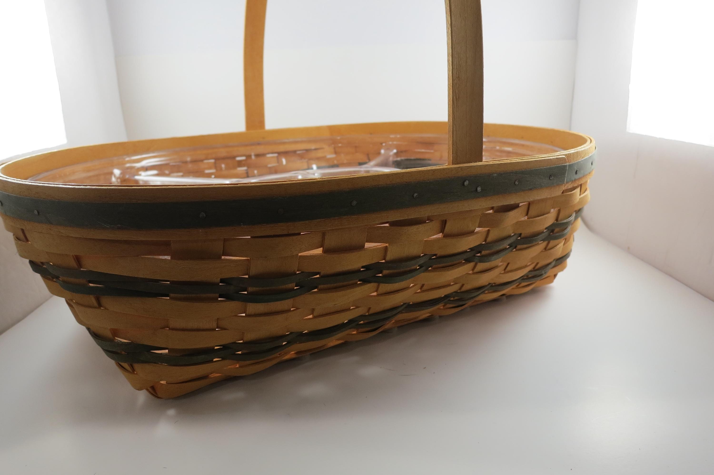 1998 Longaberger Fixed Handle Large Hospitality Traditions Basket with Divided Protector Excellent Condition. No damages, beautiful basket! Measures 18 1/4 inches long, 14 inches wide and 5 1/4 inches tall. (with the handle included height is 14 1/2 inches) As with all Authentic Longabergers, this one is artist initialed and dated on the bottom. Includes the plastic protector which is divided into 7 sections. Green Accent. Beautiful Basket!