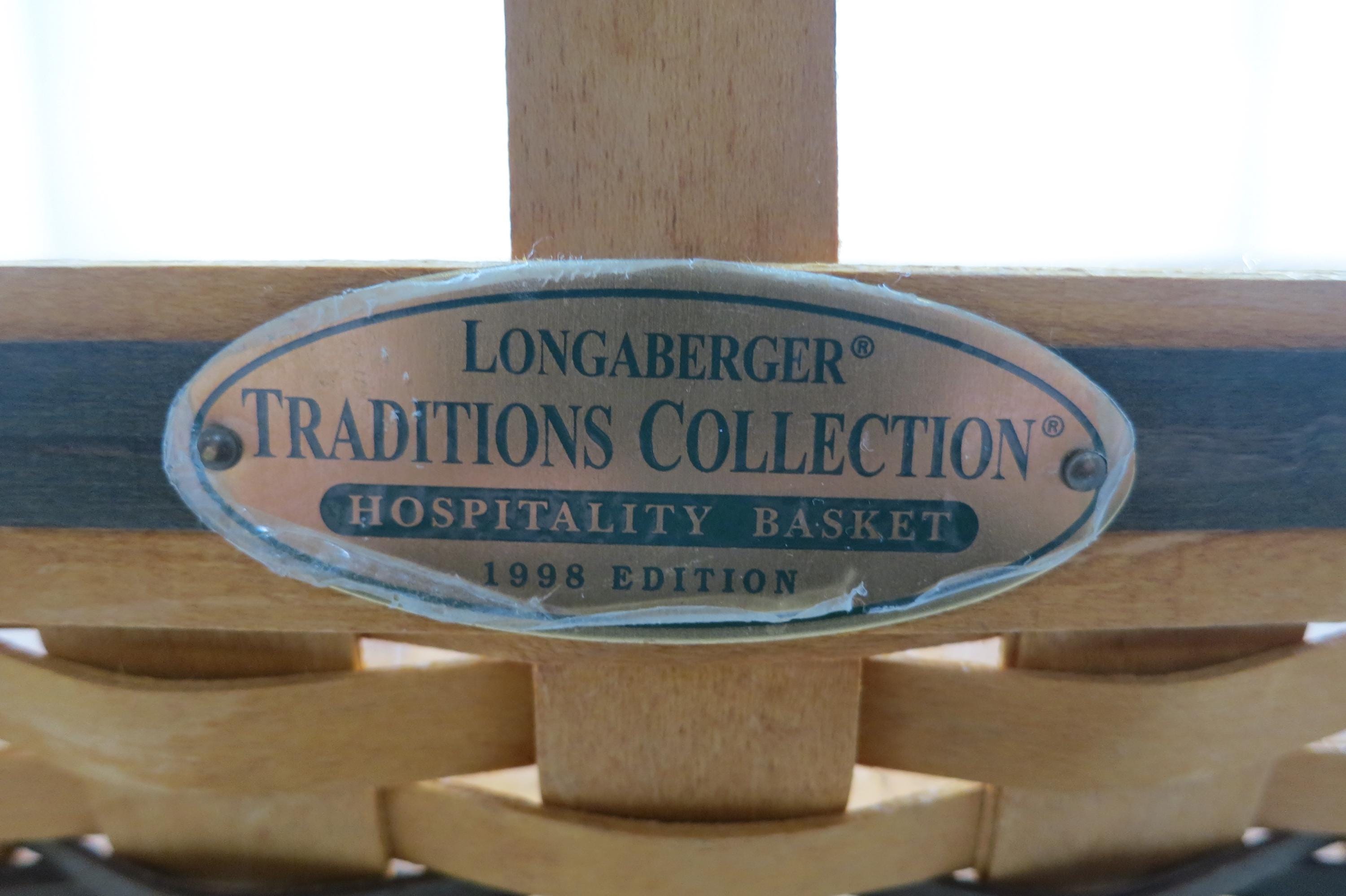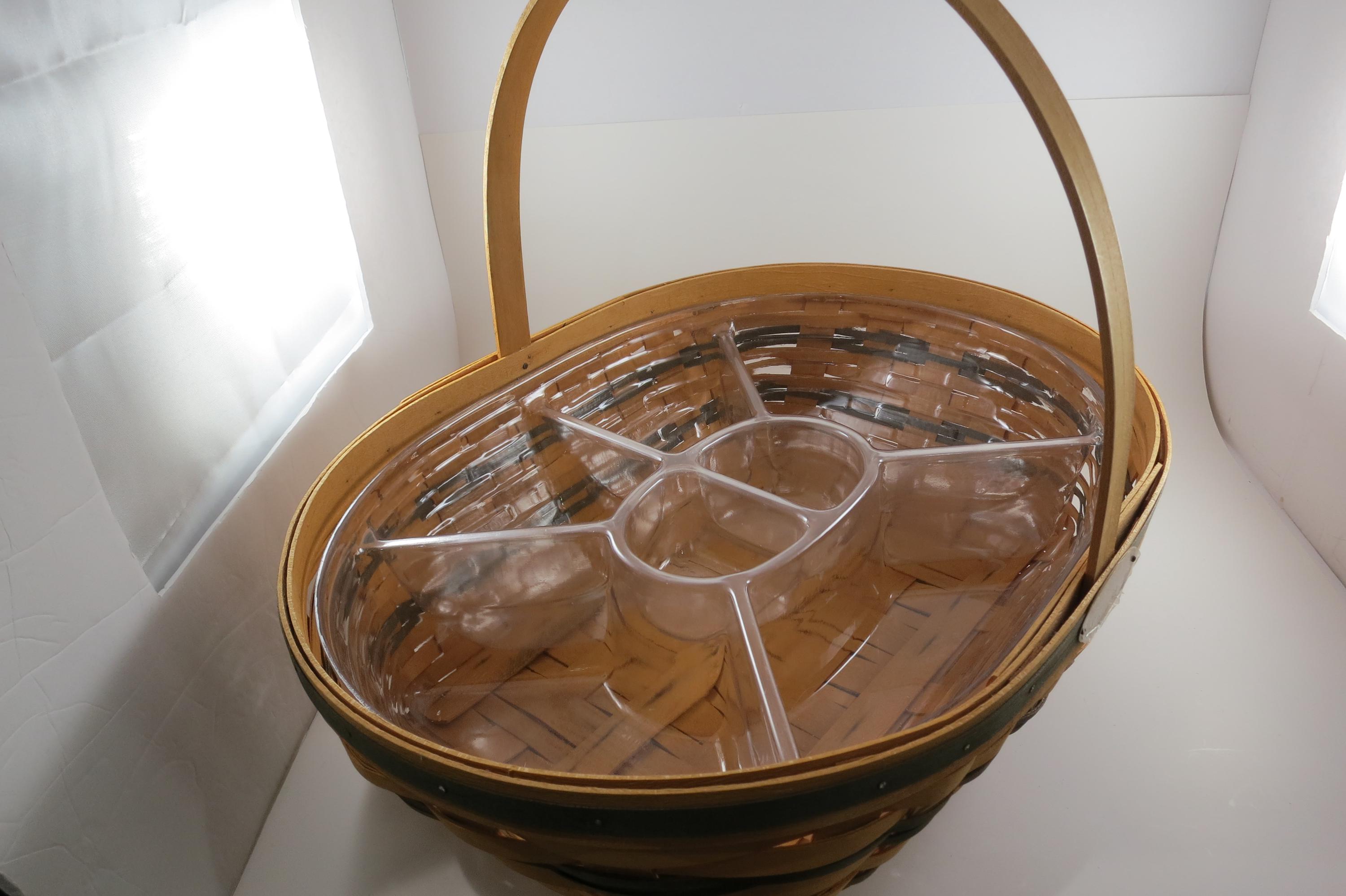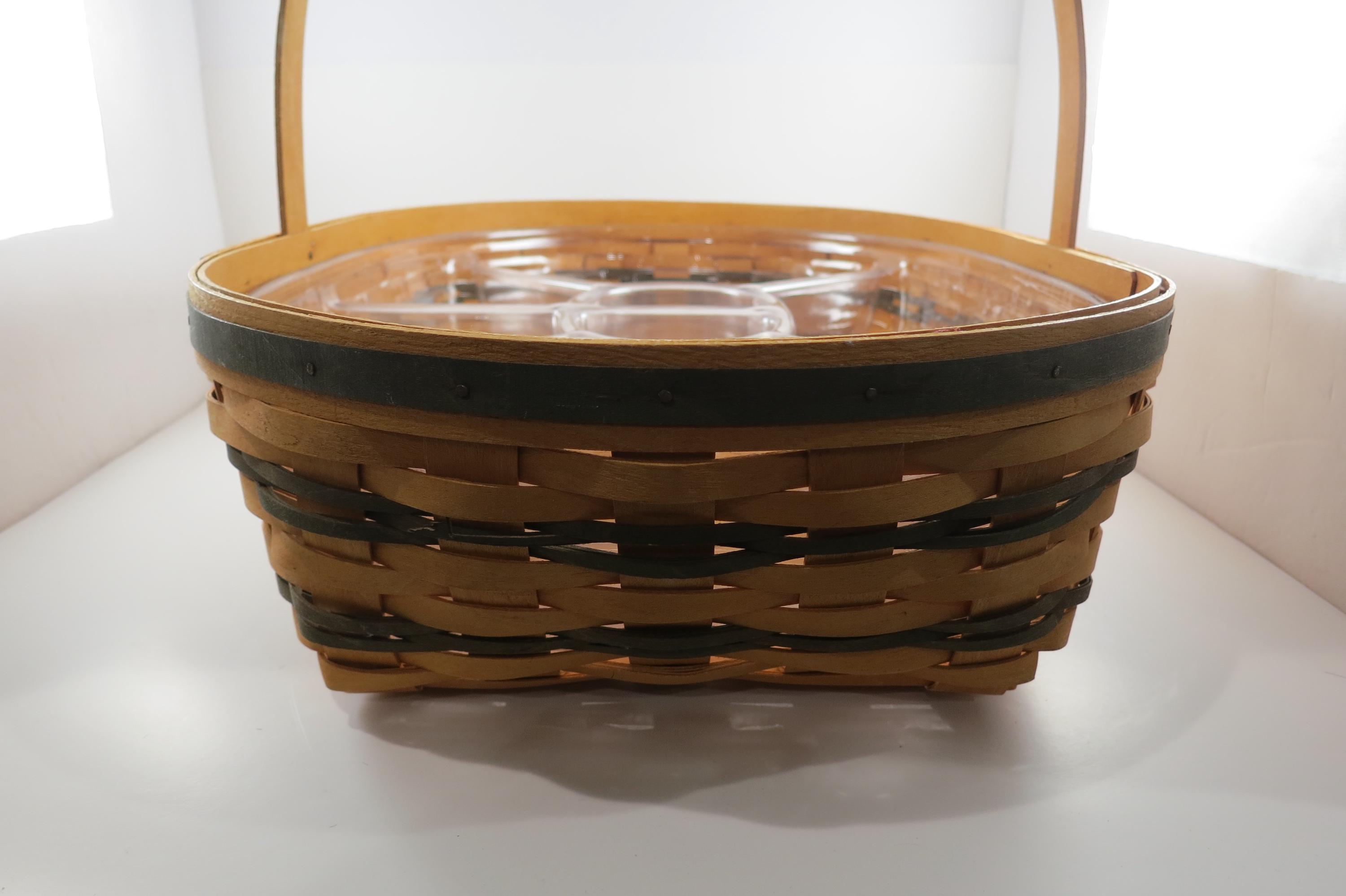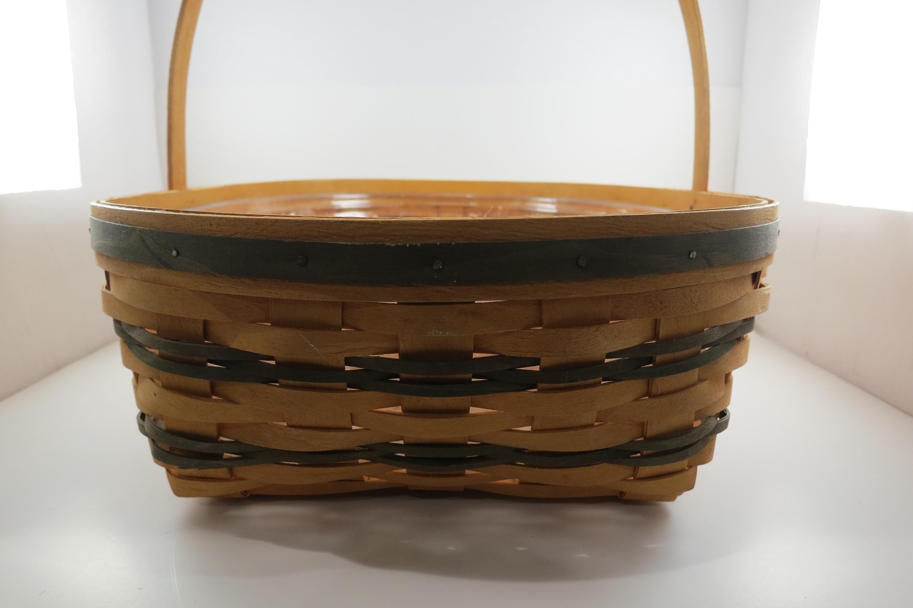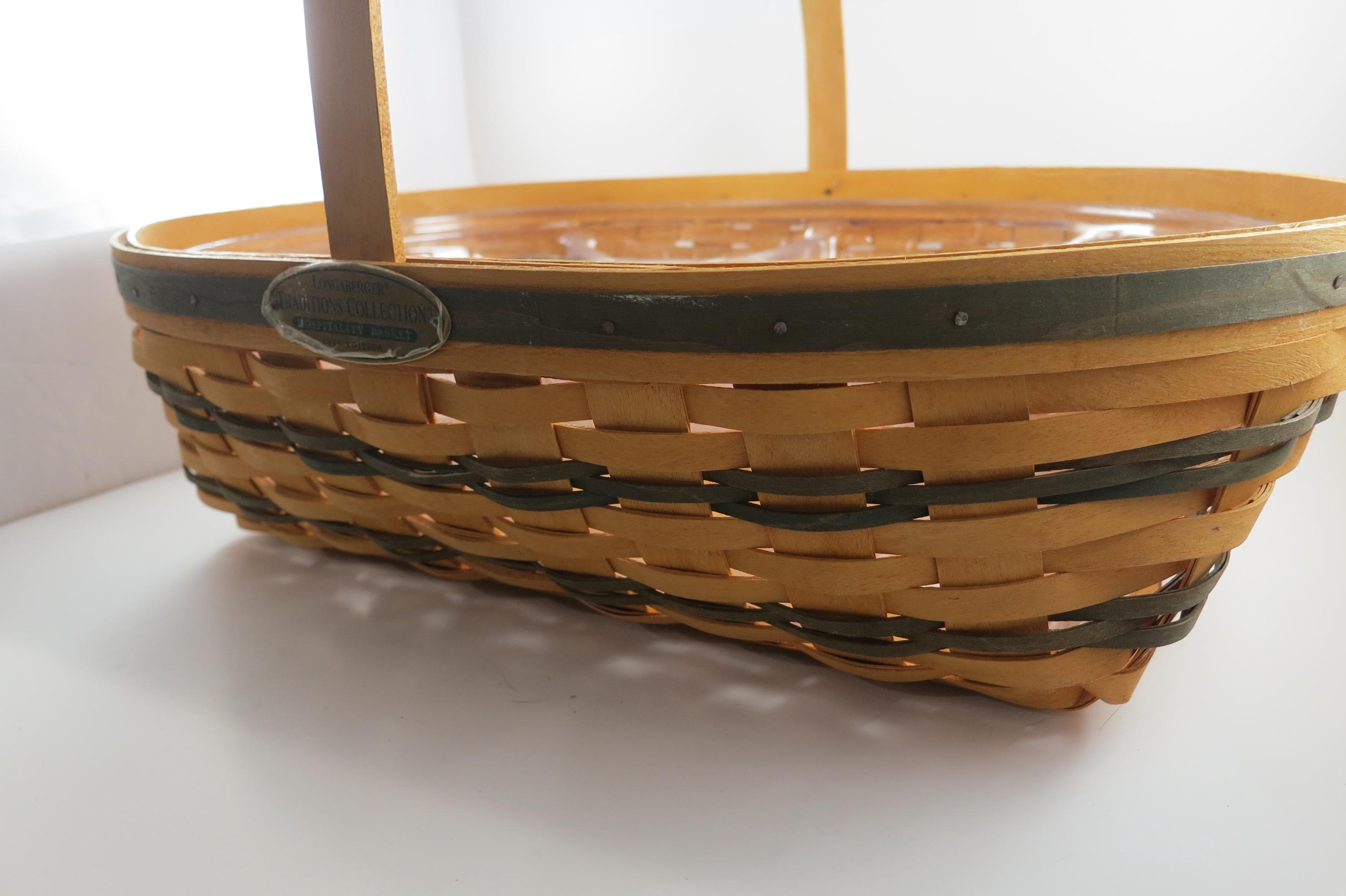 1998 Longaberger Fixed Handle Large Hospitality Traditions Basket with Divided Protector Excellent Condition. No damages, beautiful basket! Measures 18 1/4 inches long, 14 inches wide and 5 1/4 inches tall. (with the handle included height is 14 1/2 inches) As with all Authentic Longabergers, this one is artist initialed and dated on the bottom. Includes the plastic protector which is divided into 7 sections. Green Accent. Beautiful Basket!