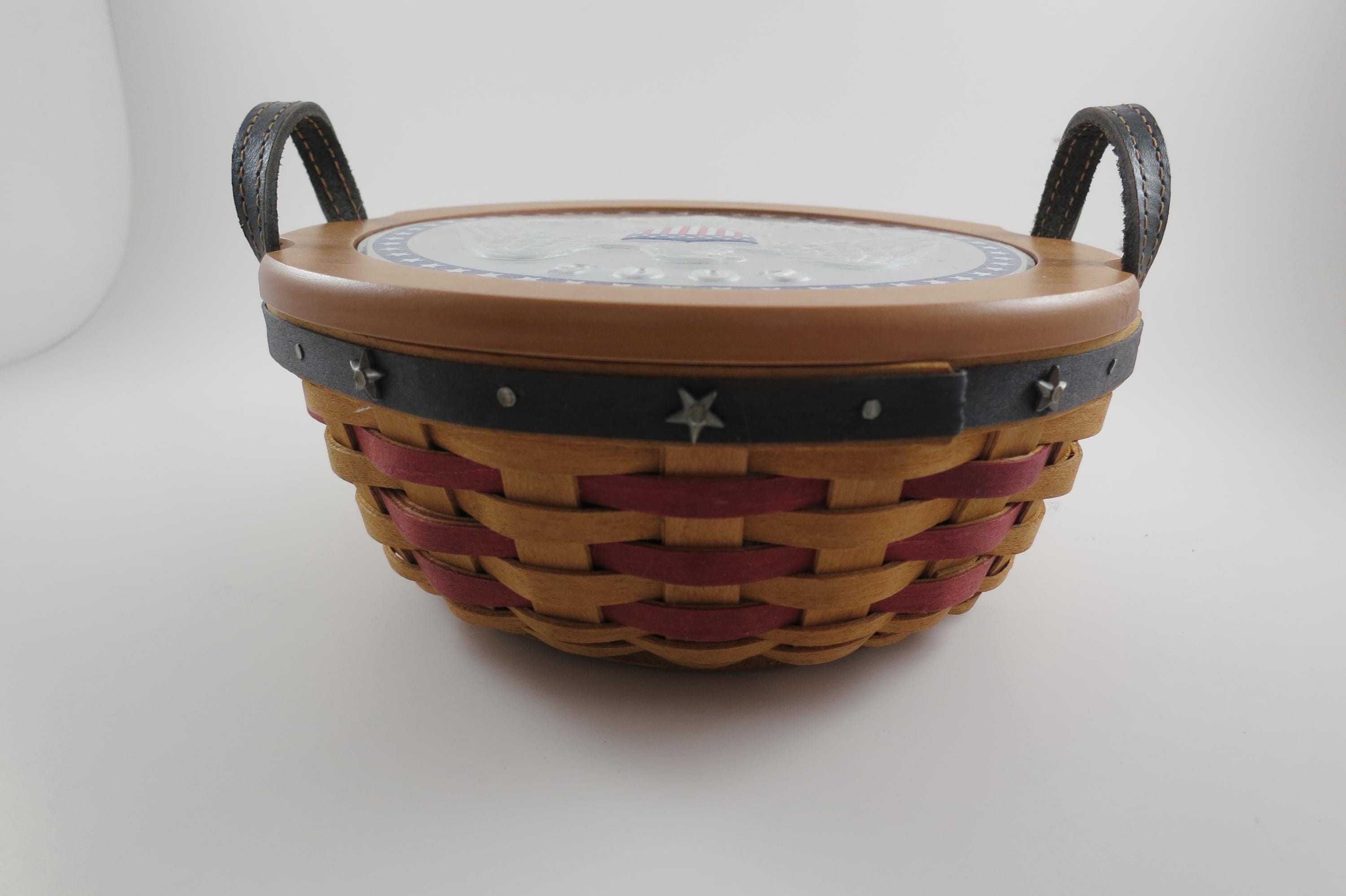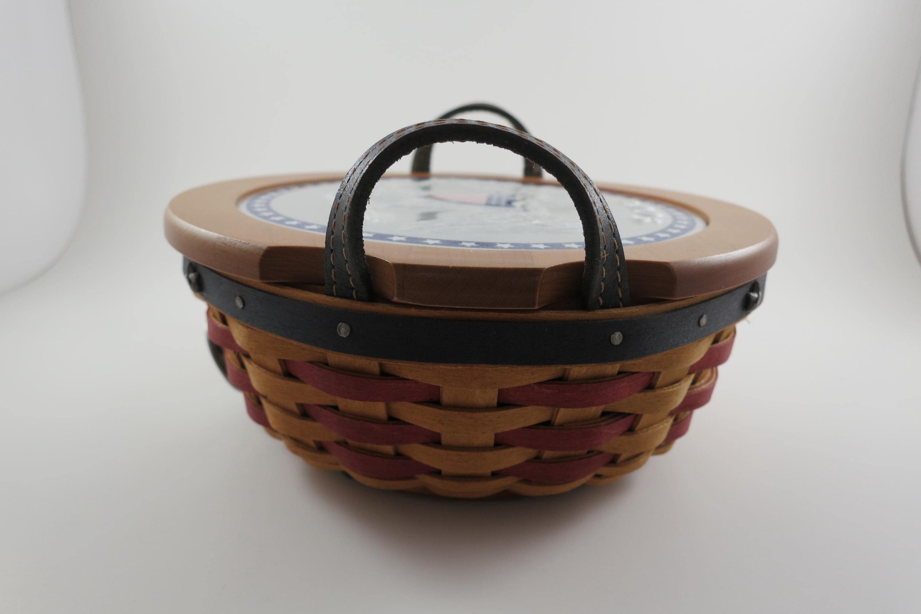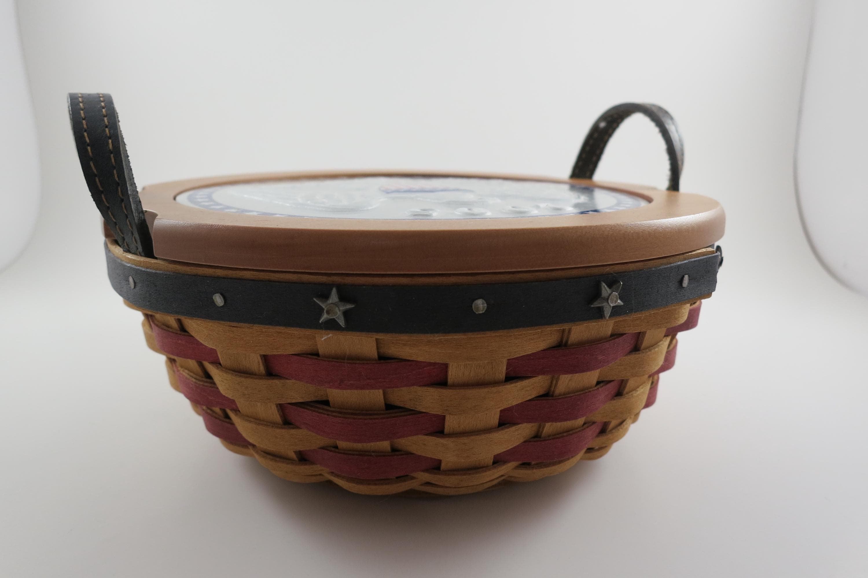 No damages, beautiful basket! Measures 7 1/2 Inches Diameter and 3 Inches Tall. Has the plastic protector and the cloth inner liner and well as the wooden lid and Tie On. As with all Authentic Longabergers, this one is artist initialed and dated on the bottom.