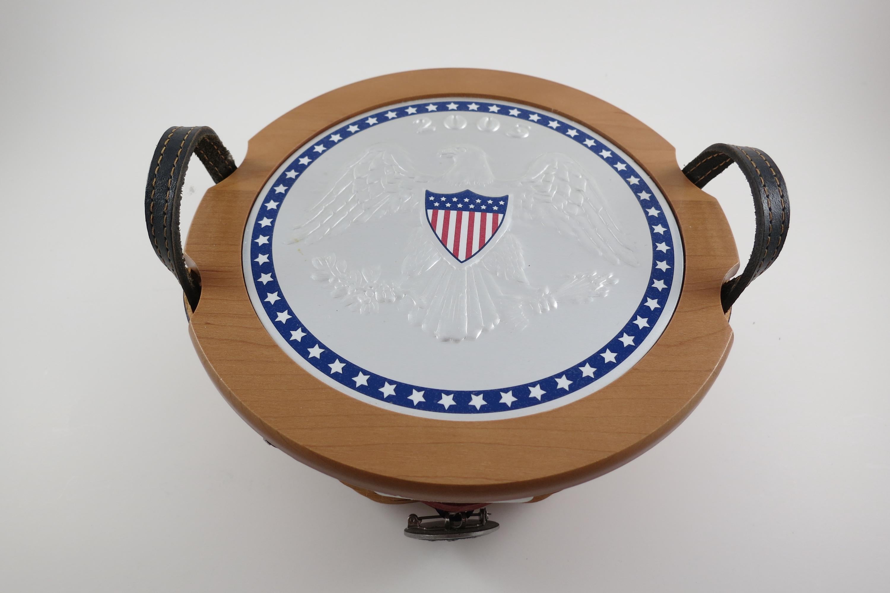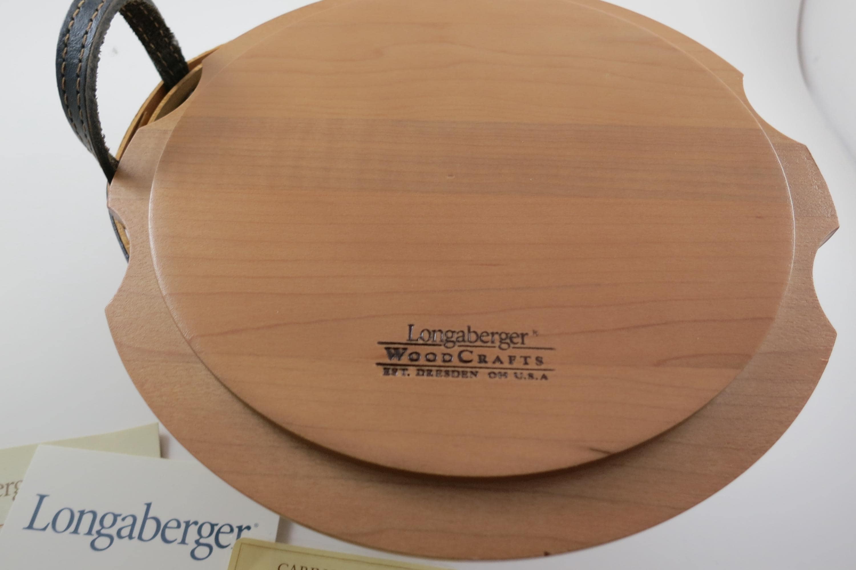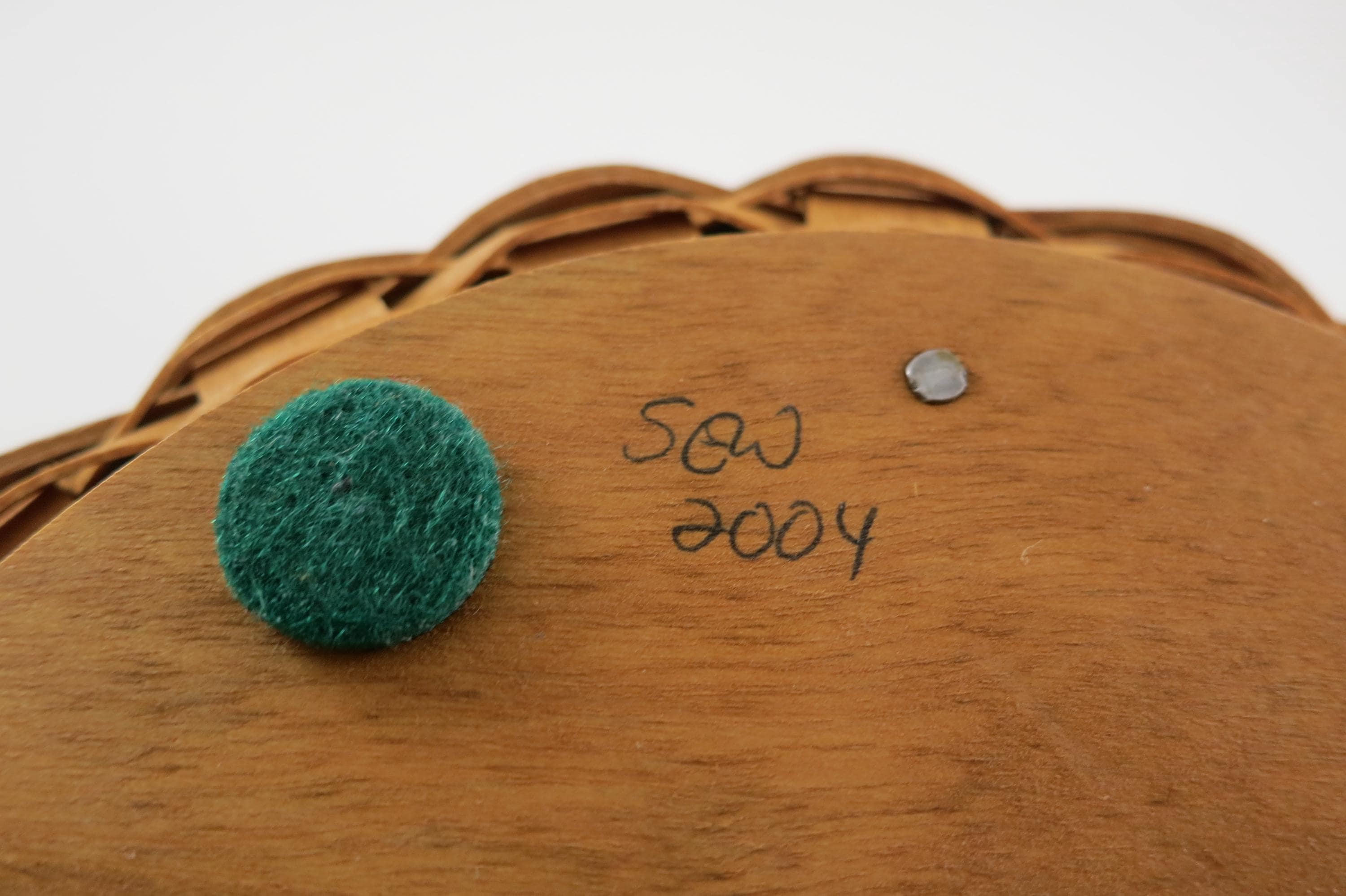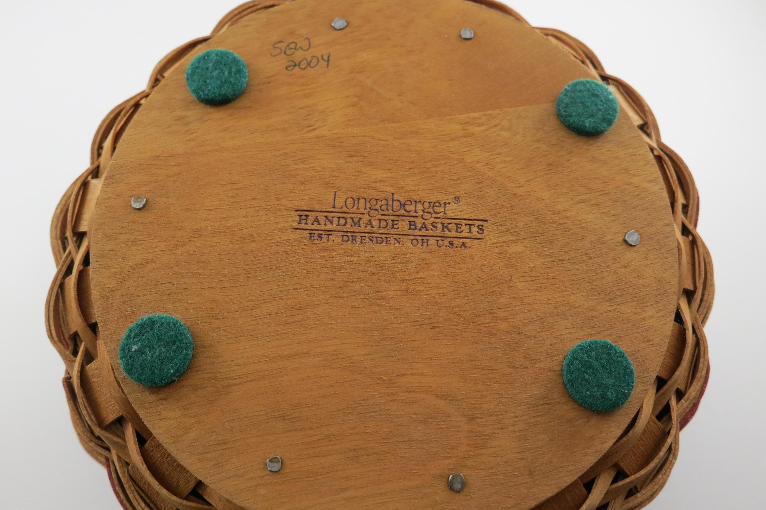 No damages, beautiful basket! Measures 7 1/2 Inches Diameter and 3 Inches Tall. Has the plastic protector and the cloth inner liner and well as the wooden lid and Tie On. As with all Authentic Longabergers, this one is artist initialed and dated on the bottom.