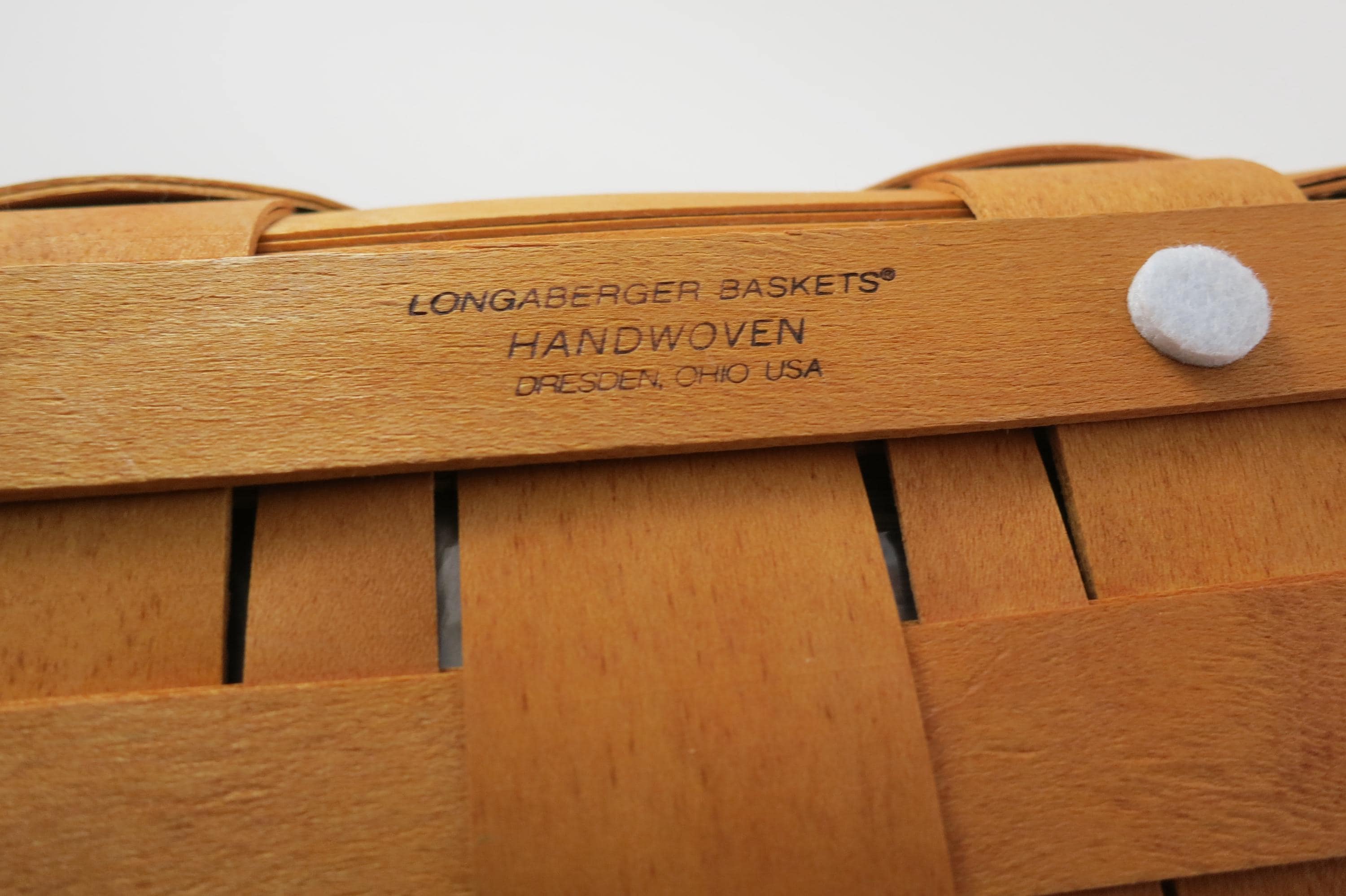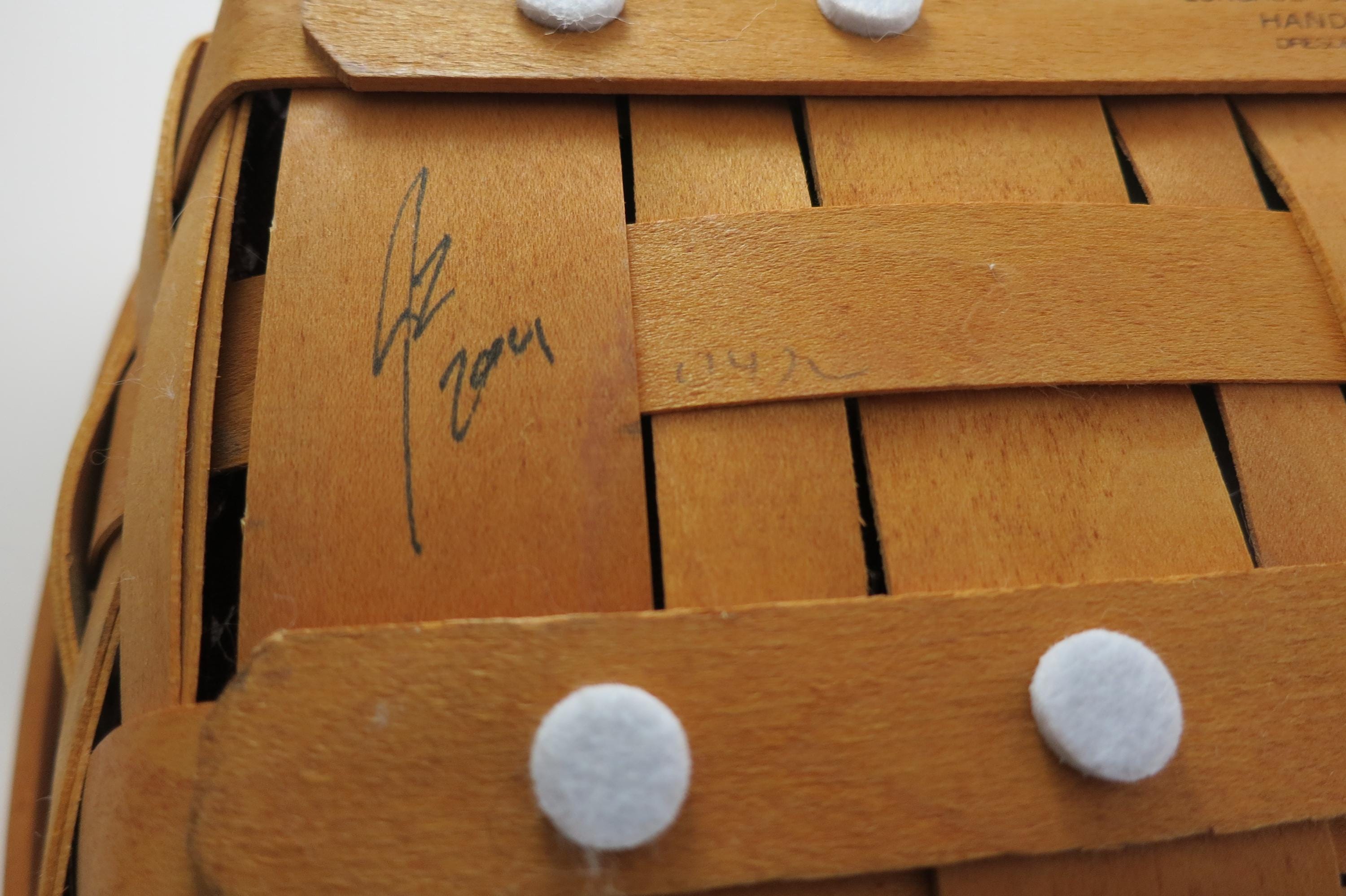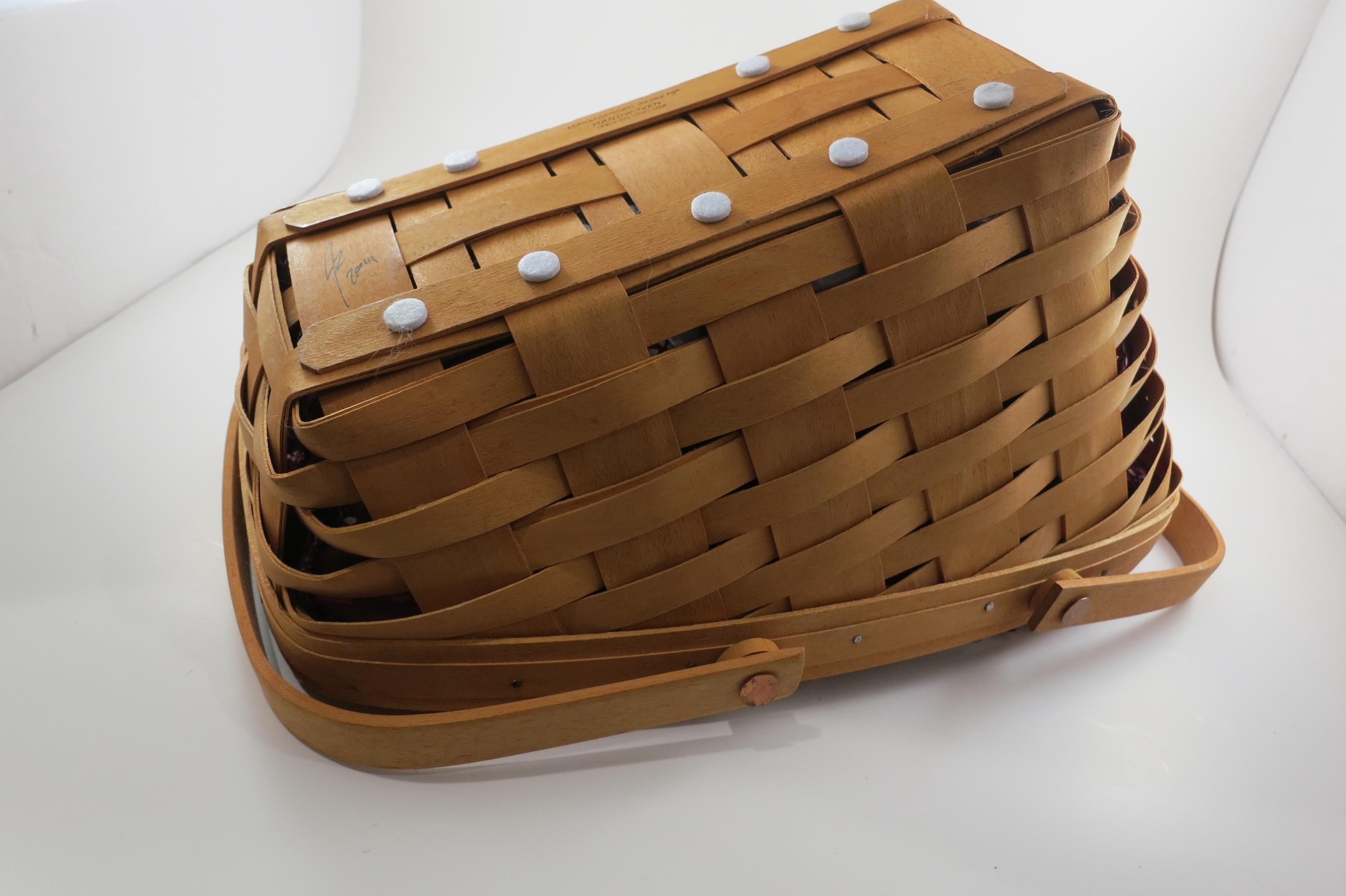 No damages, beautiful basket! Measures 12 Inches long, 8 1/2 inches wide, 8 inches tall in the back and 3 inches tall in the front. Has double swing handles, a divided plastic protector and a red cloth liner. As with all Authentic Longabergers, this one is artist initialed and dated on the bottom.