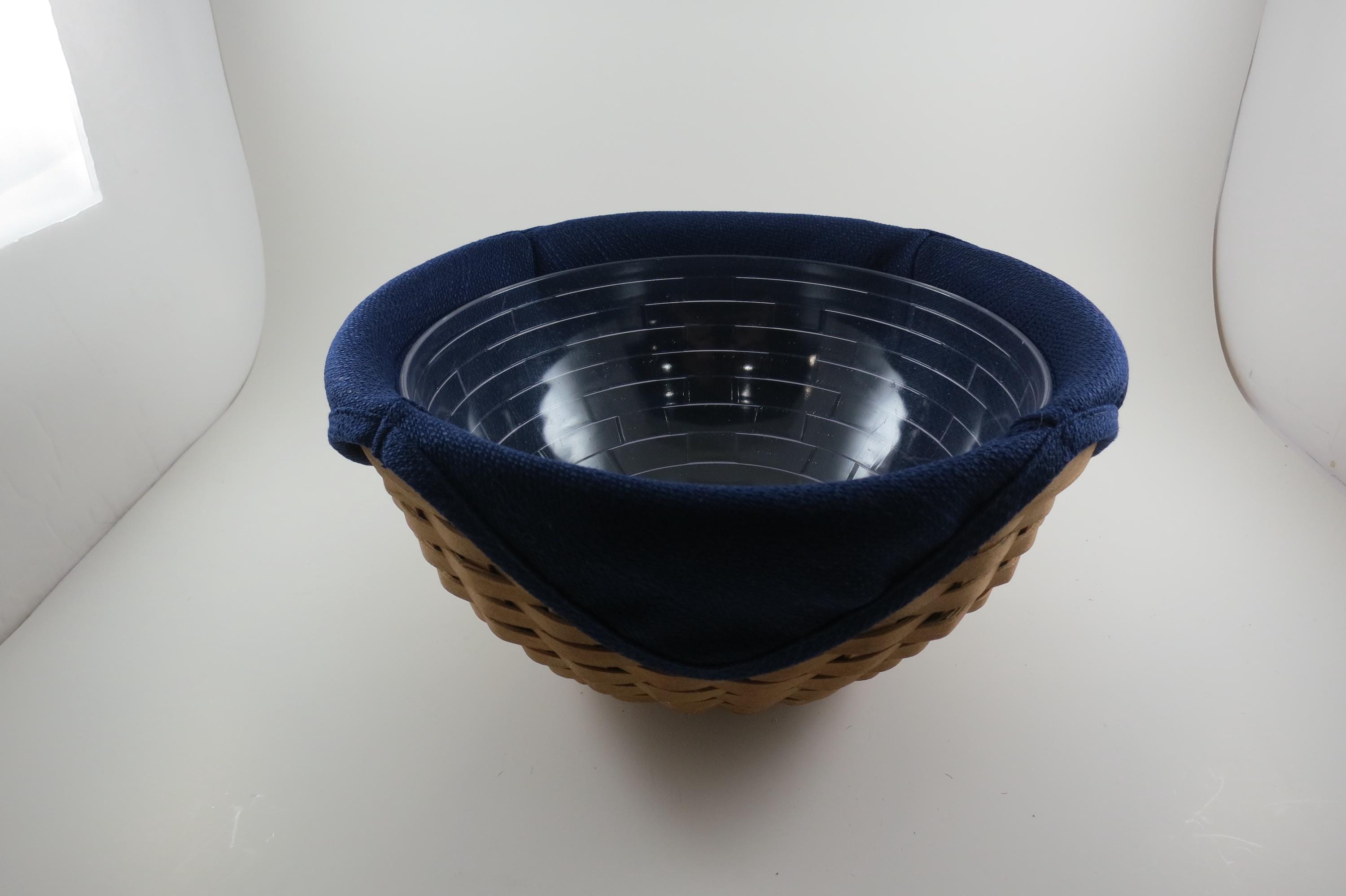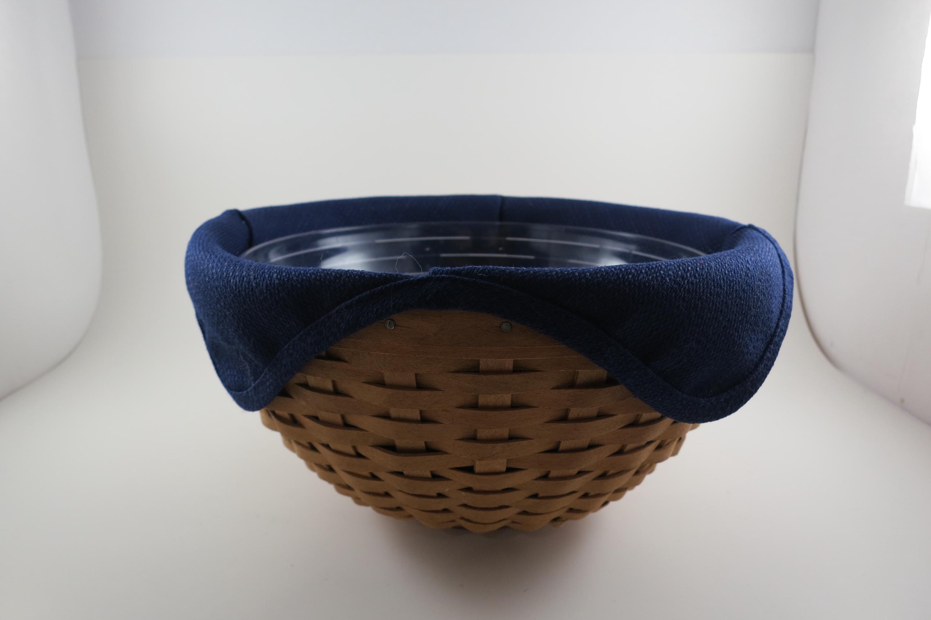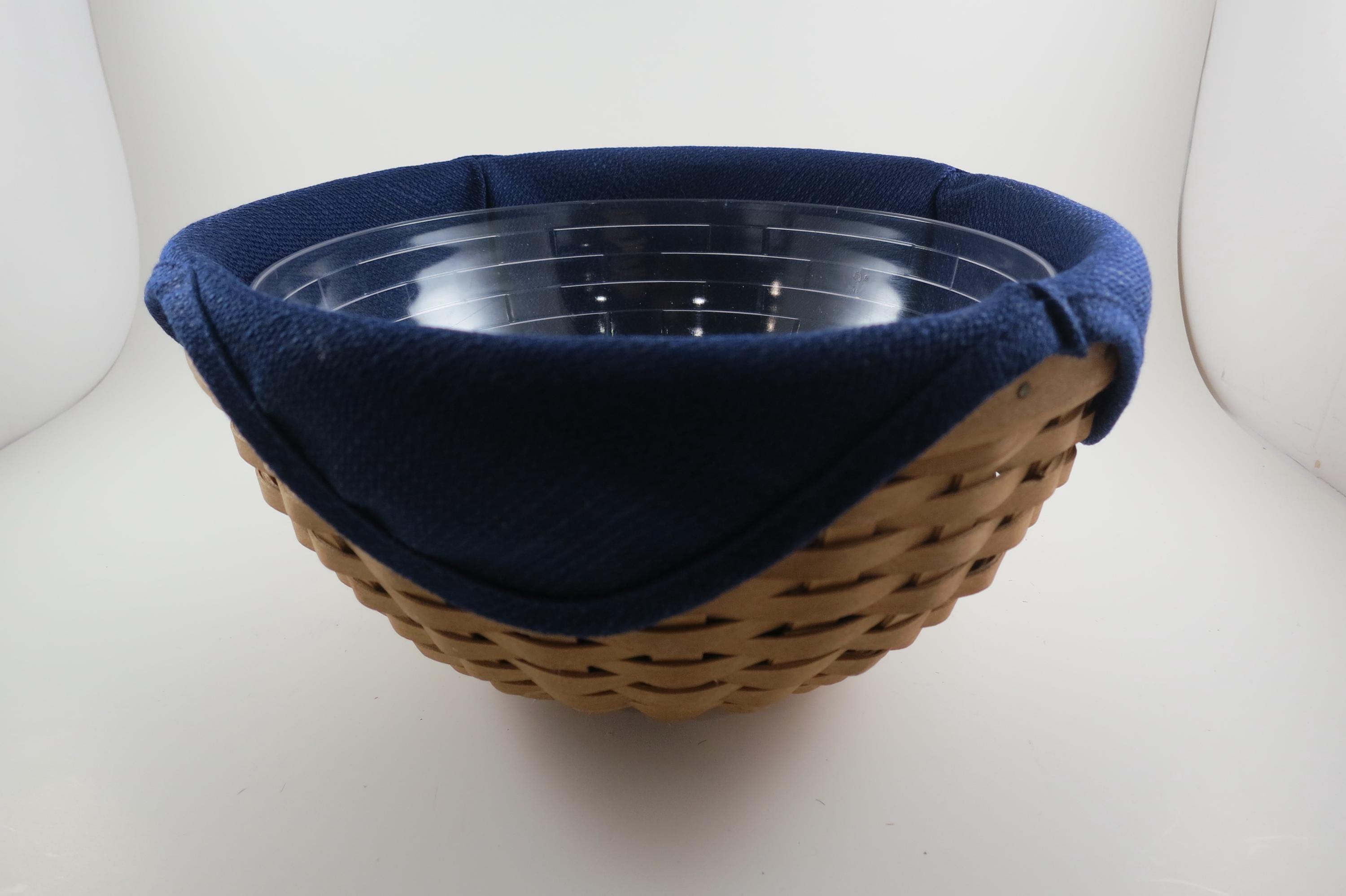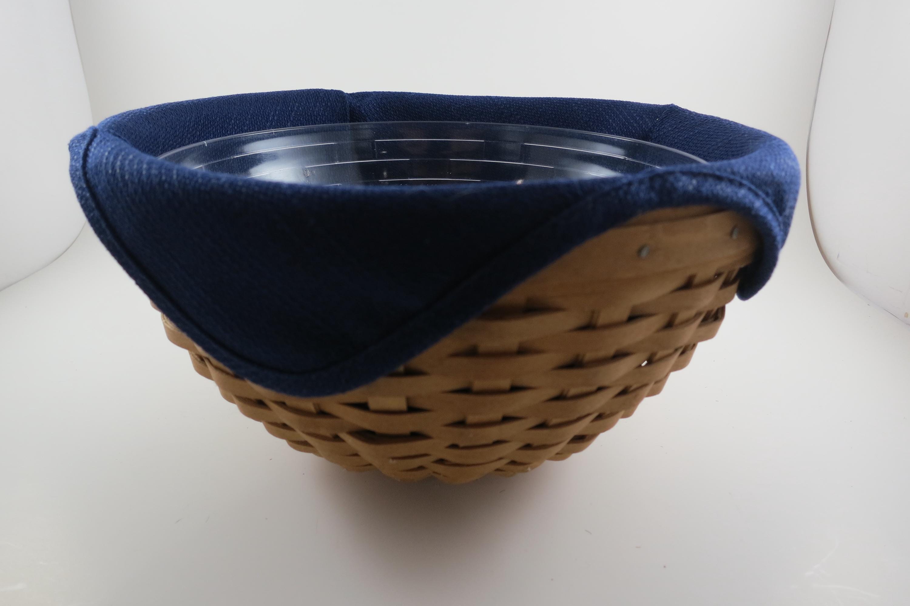 2002 Longaberger 9 Inch Bowl Basket Wooden Base Signed and Dated Excellent Condition Blue Cloth Liner and Plastic Protector. No damages, beautiful basket! Measures 9 inches in diameter and 5 1/8 inches tall. As with all Authentic Longabergers, this one is artist initialed and dated on the bottom. Also includes a blue over the rim liner and plastic protector.