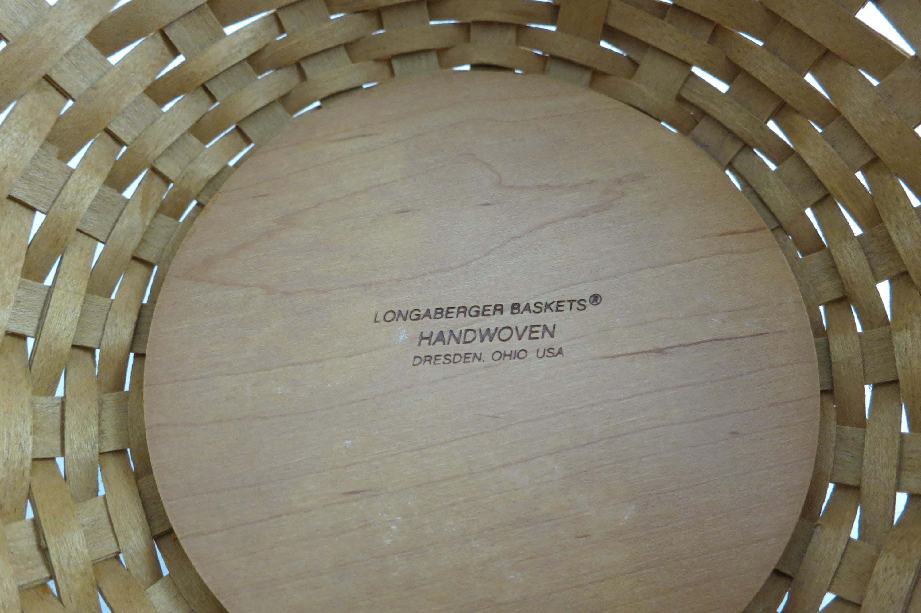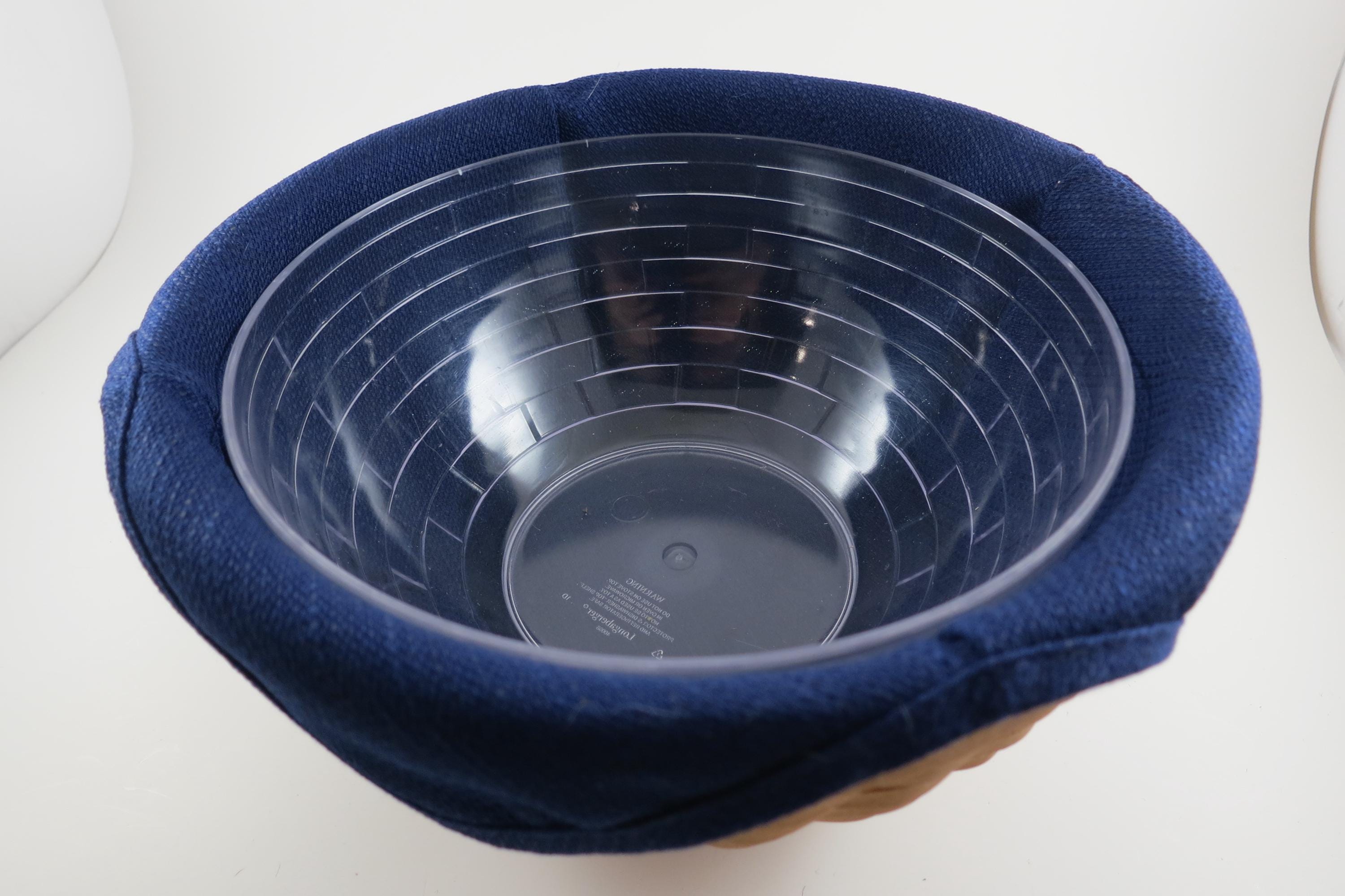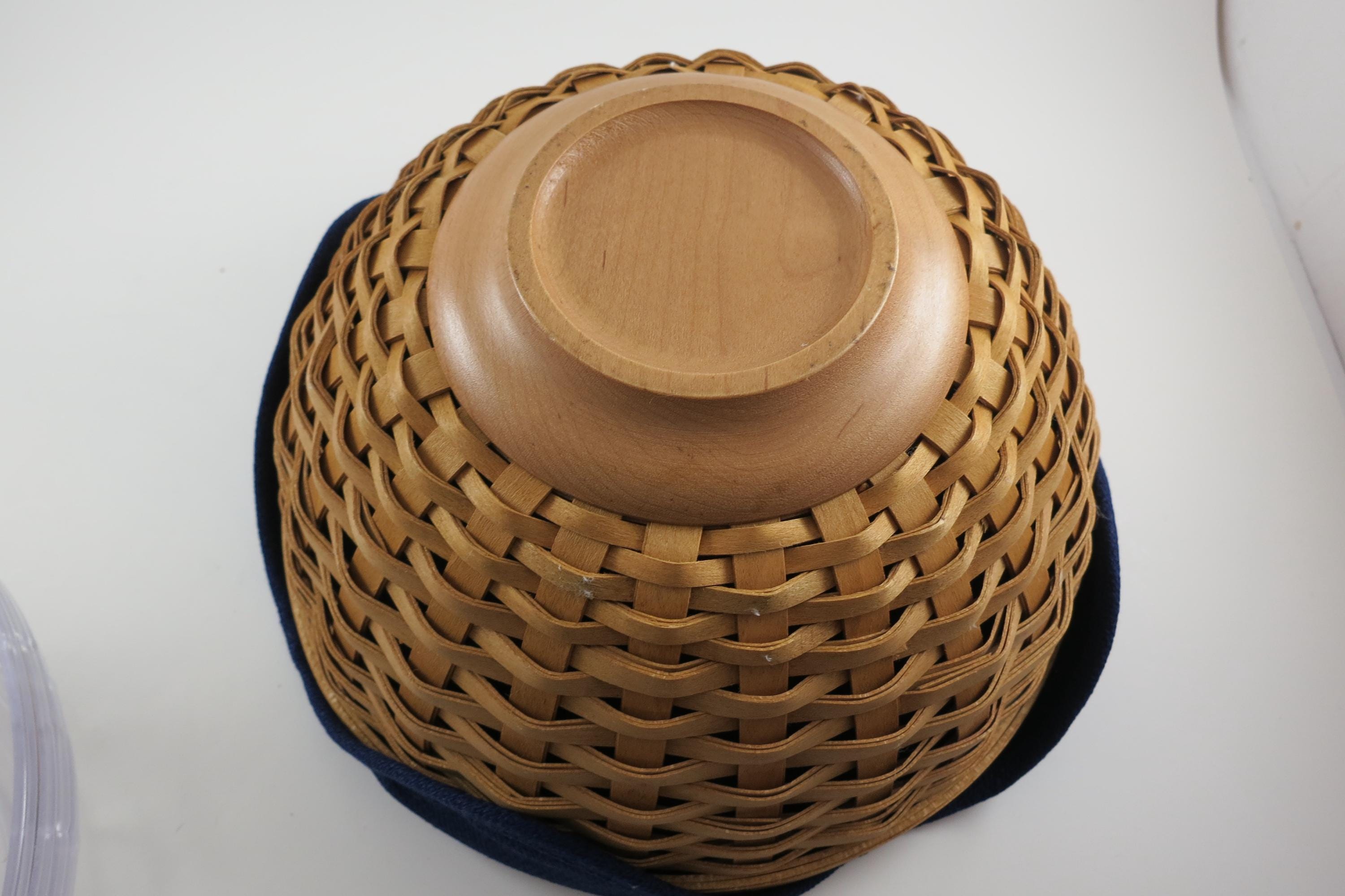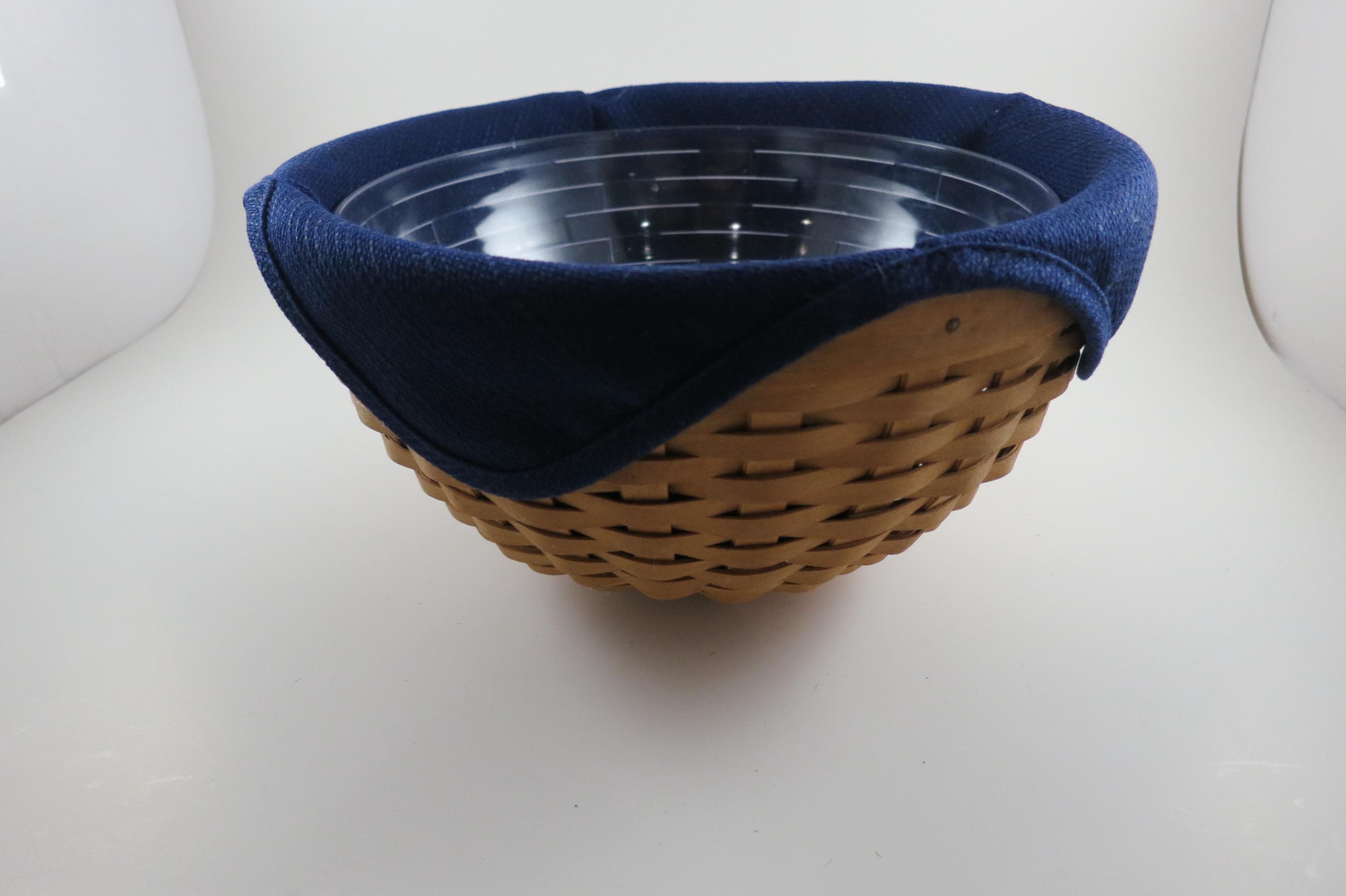 2002 Longaberger 9 Inch Bowl Basket Wooden Base Signed and Dated Excellent Condition Blue Cloth Liner and Plastic Protector. No damages, beautiful basket! Measures 9 inches in diameter and 5 1/8 inches tall. As with all Authentic Longabergers, this one is artist initialed and dated on the bottom. Also includes a blue over the rim liner and plastic protector.