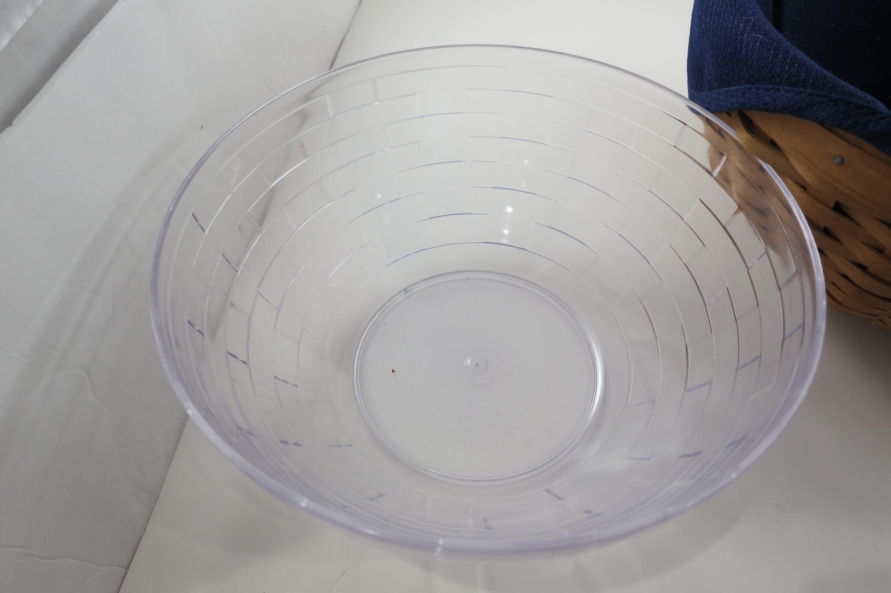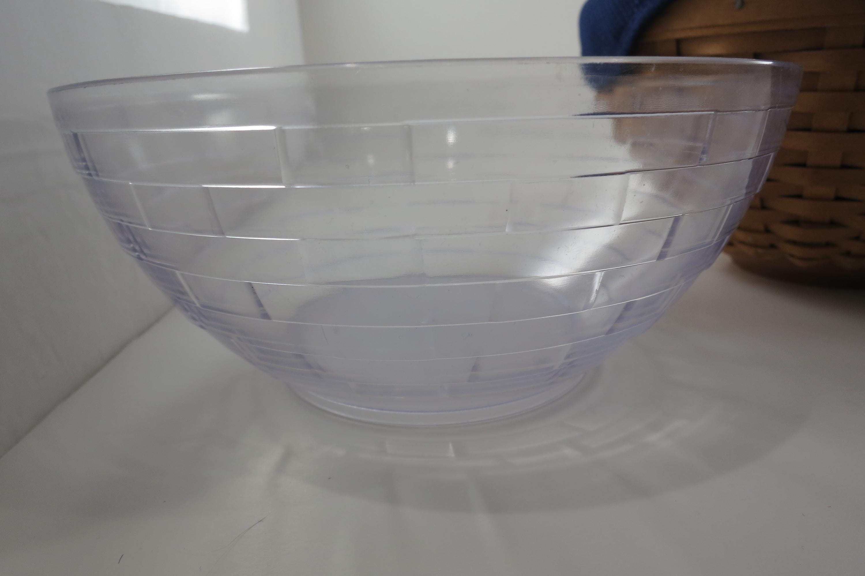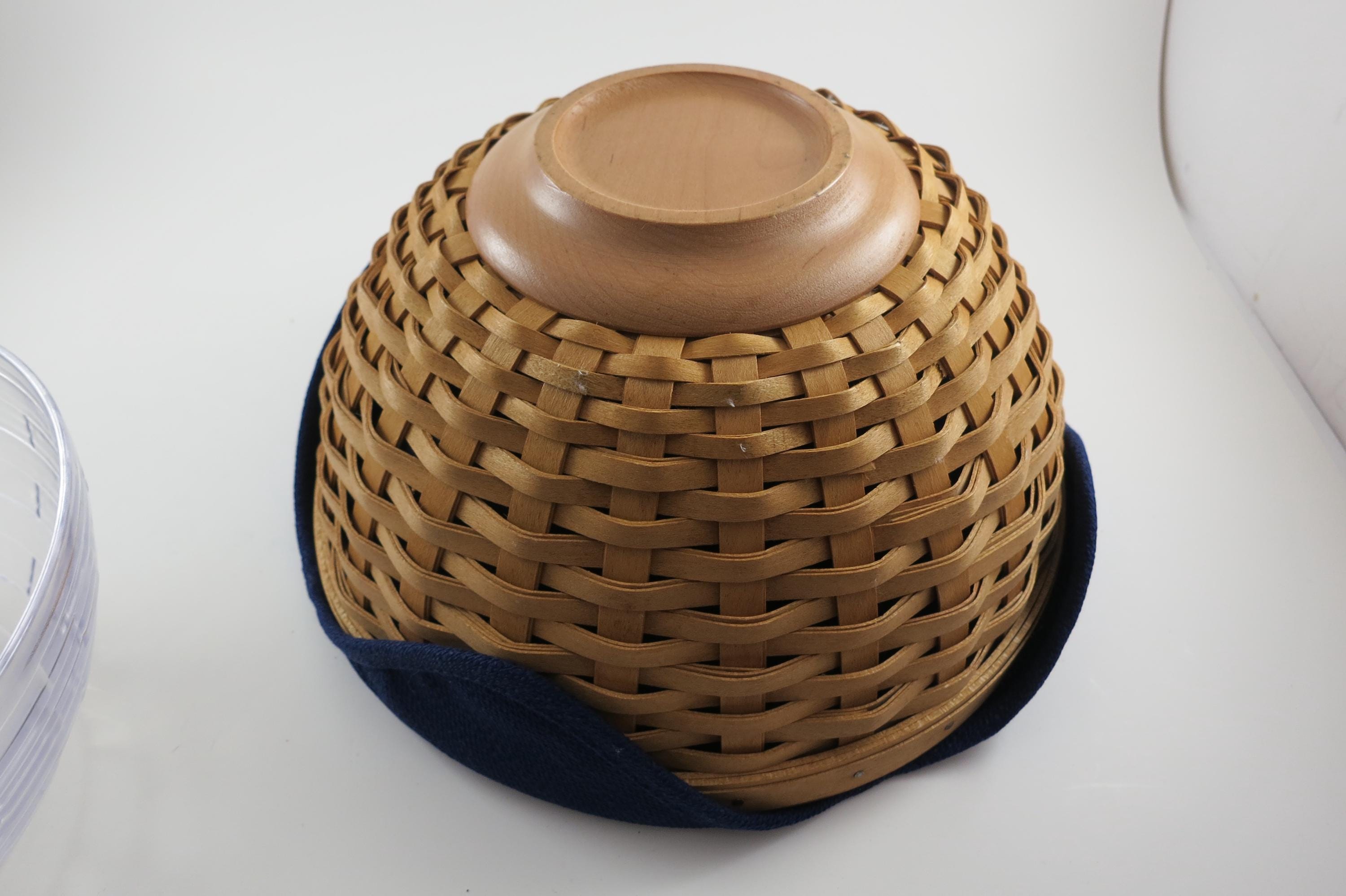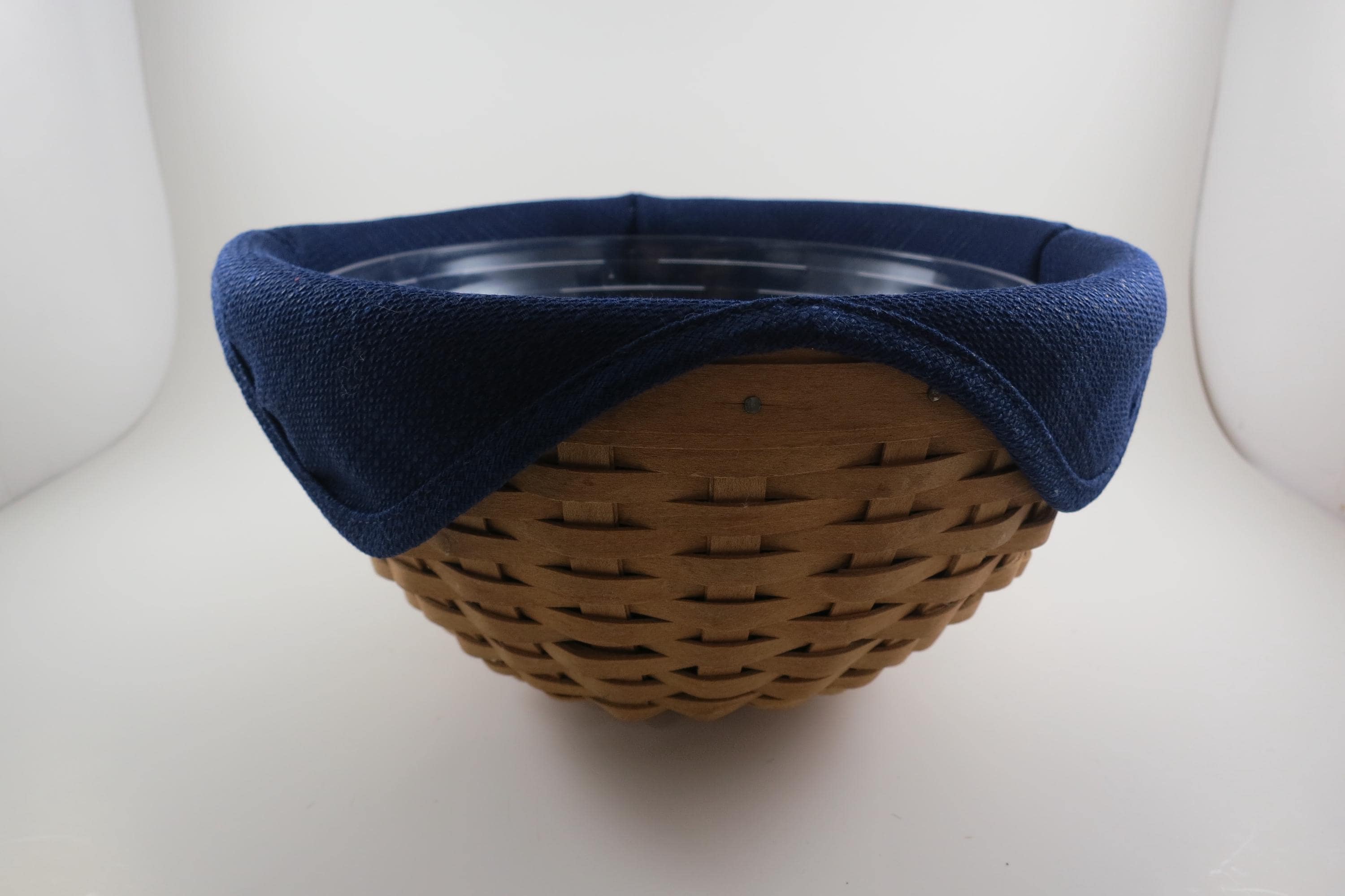 2002 Longaberger 9 Inch Bowl Basket Wooden Base Signed and Dated Excellent Condition Blue Cloth Liner and Plastic Protector. No damages, beautiful basket! Measures 9 inches in diameter and 5 1/8 inches tall. As with all Authentic Longabergers, this one is artist initialed and dated on the bottom. Also includes a blue over the rim liner and plastic protector.