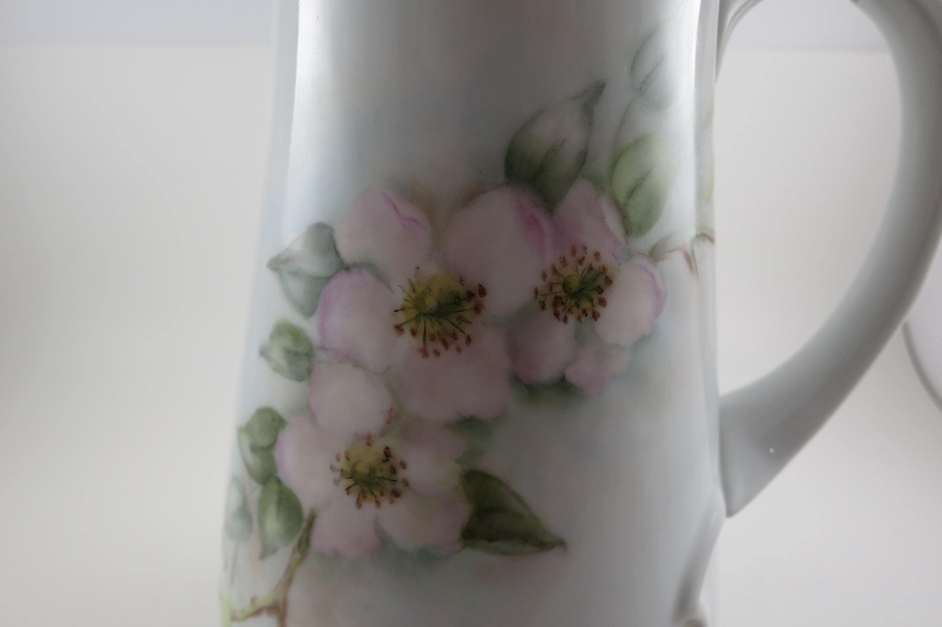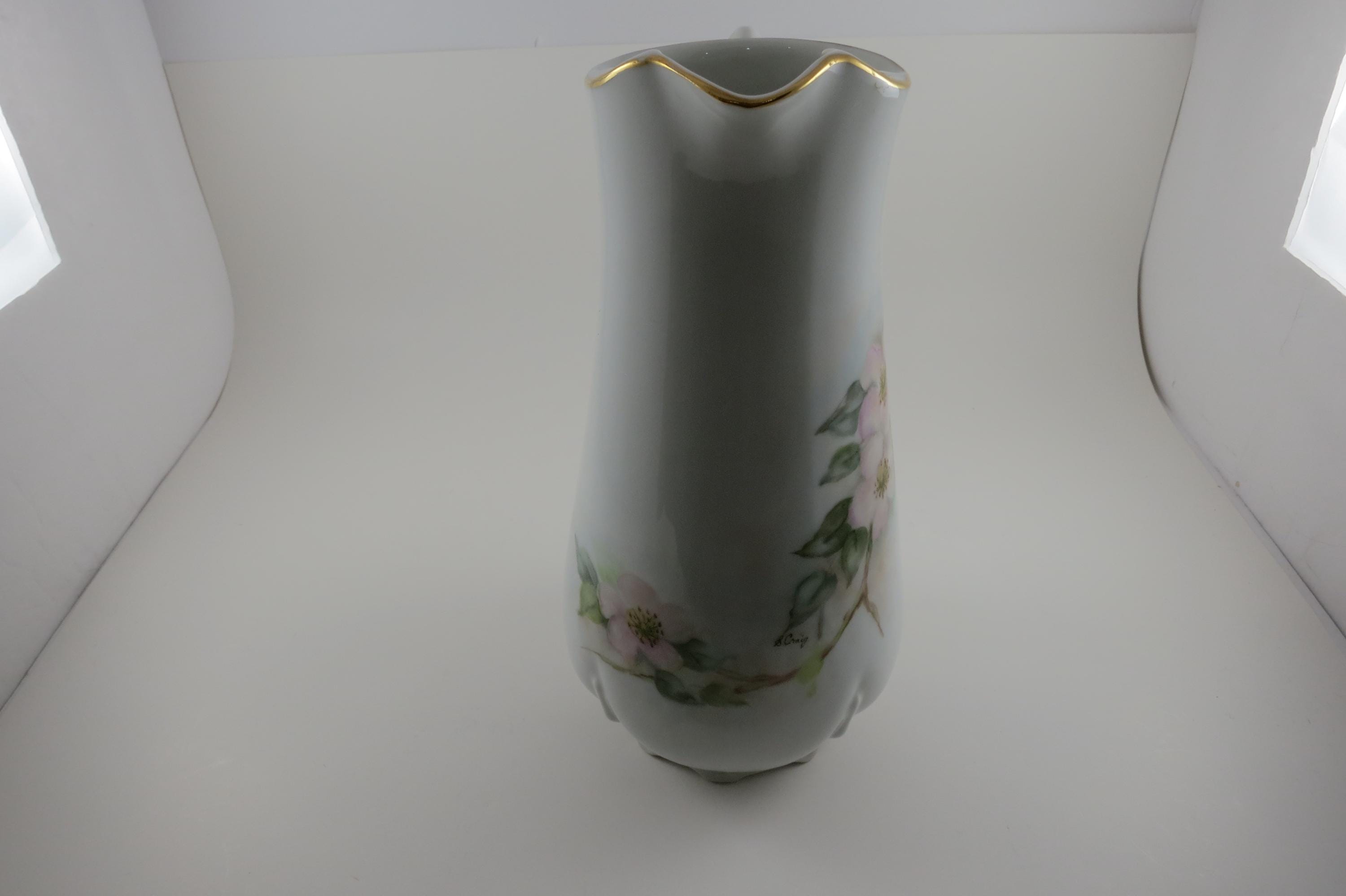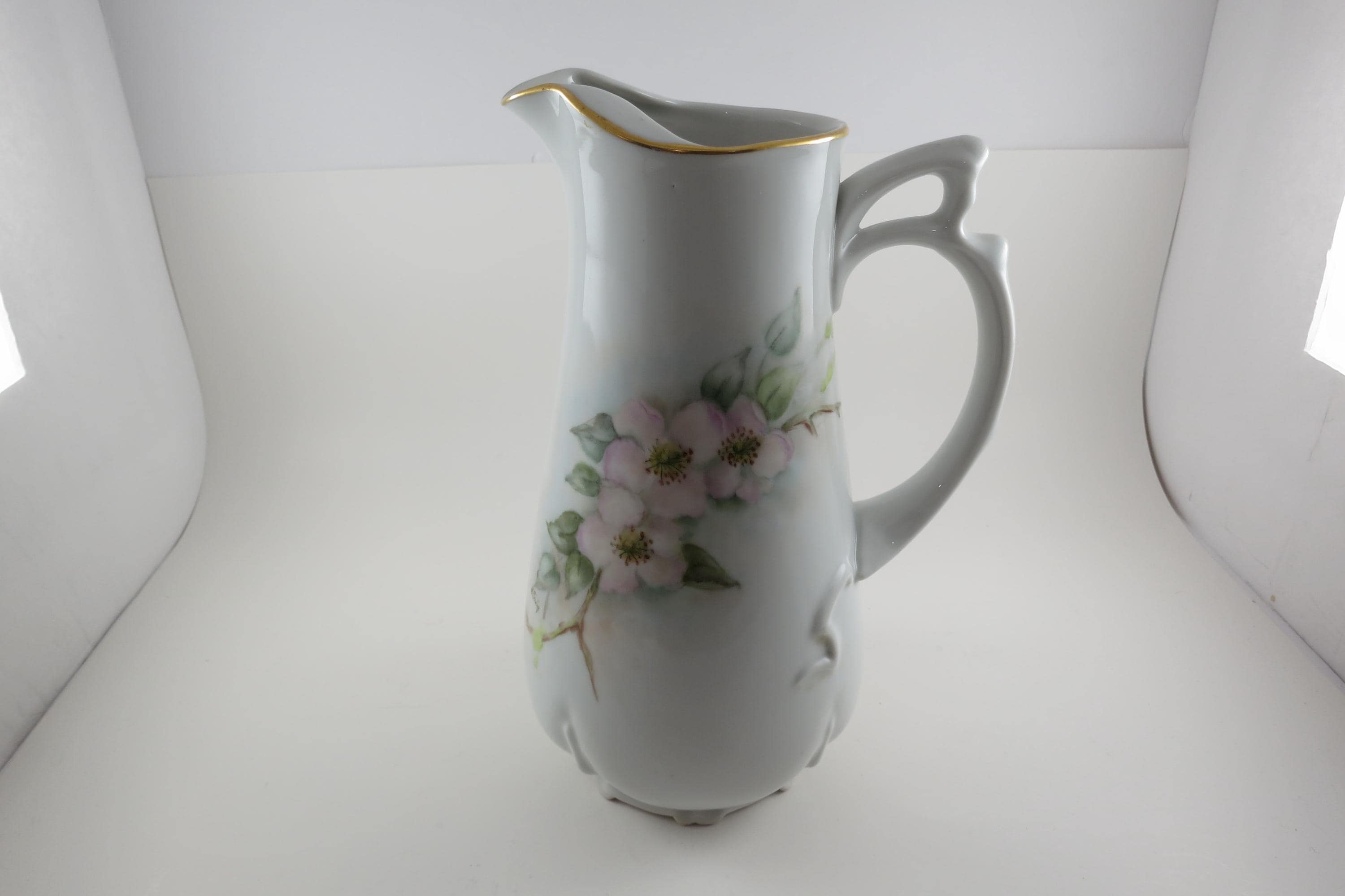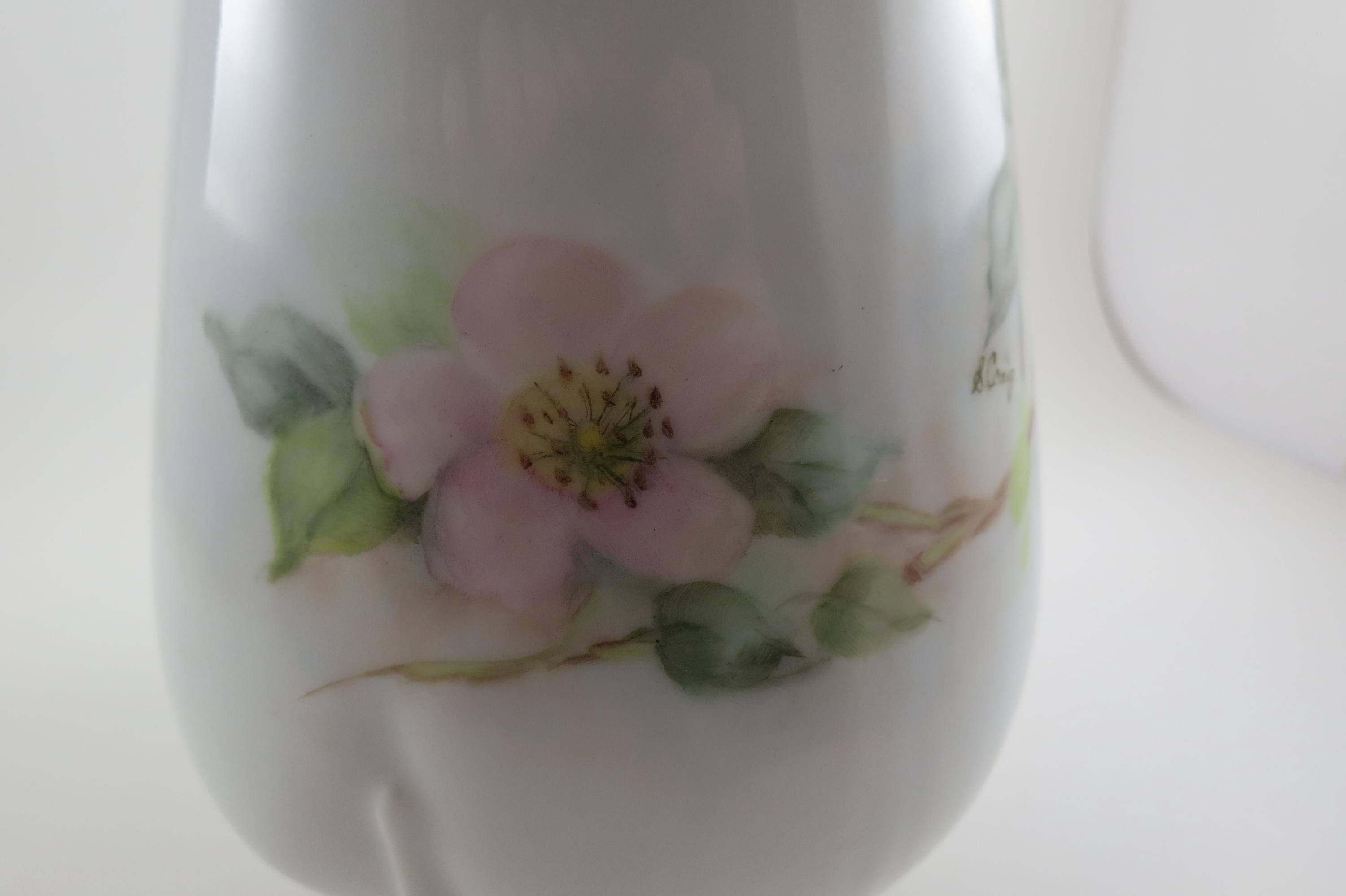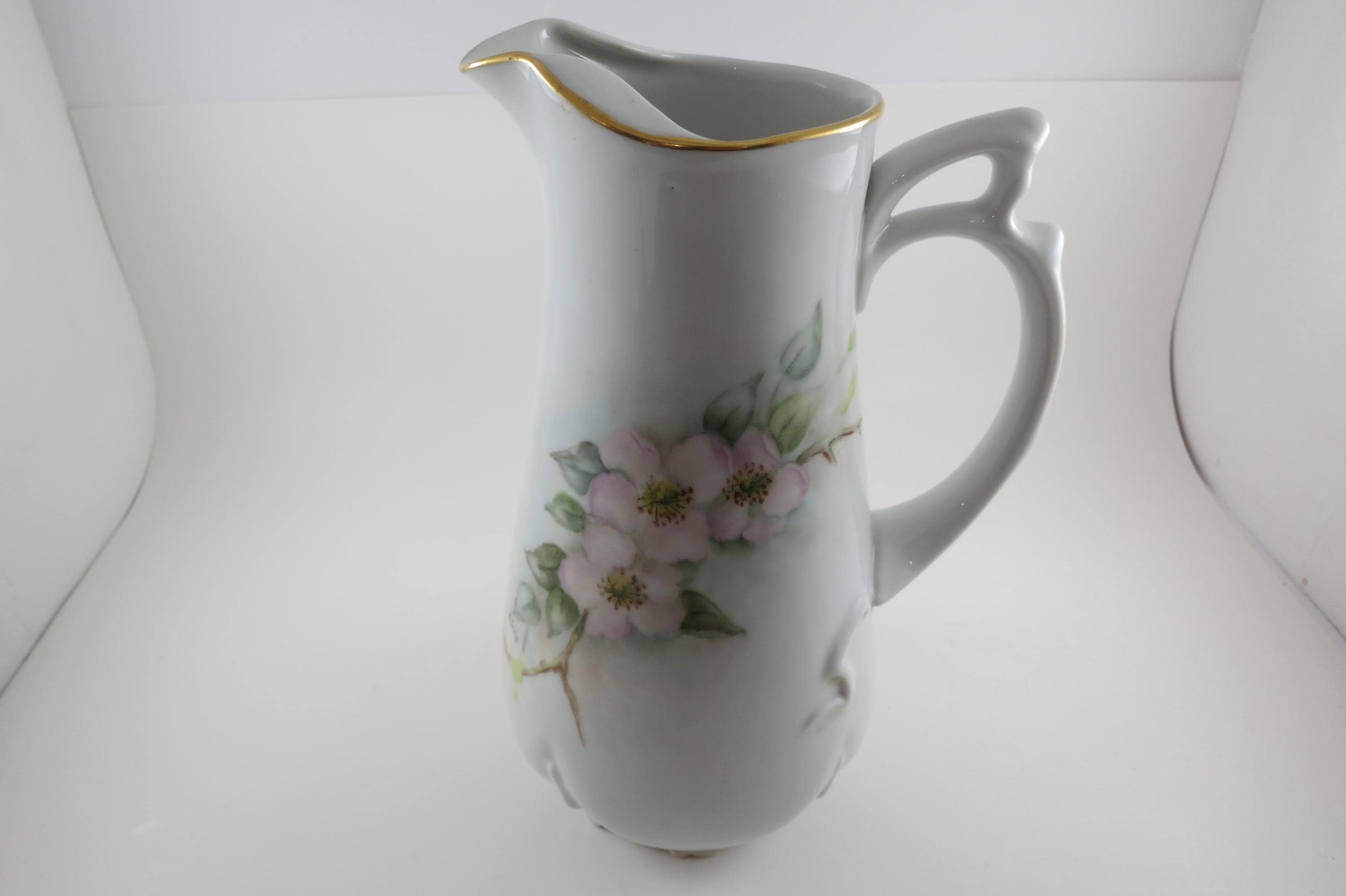 Large Porcelain Water Pitcher Hand Painted Unbranded Pink Roses Artist Signed 10 1/4 Inches Tall