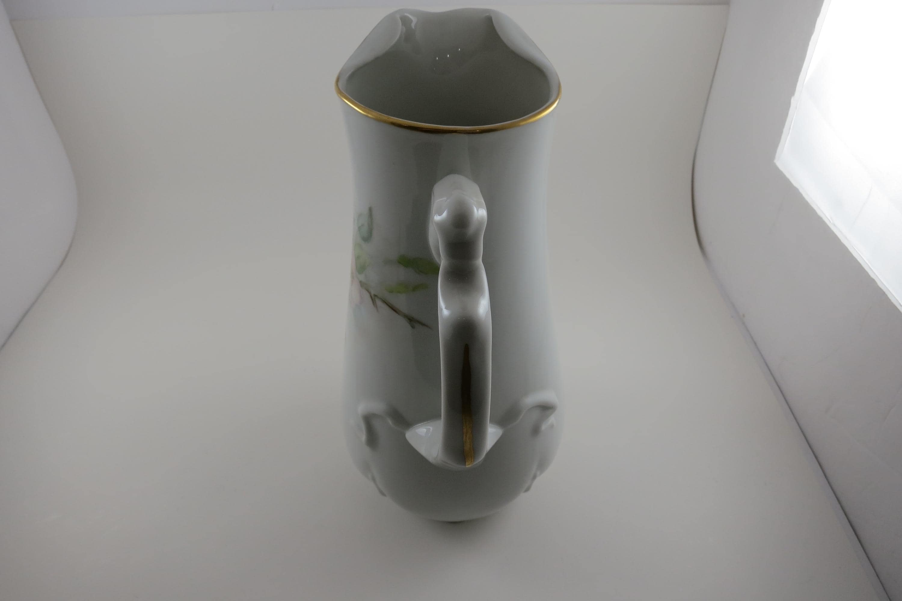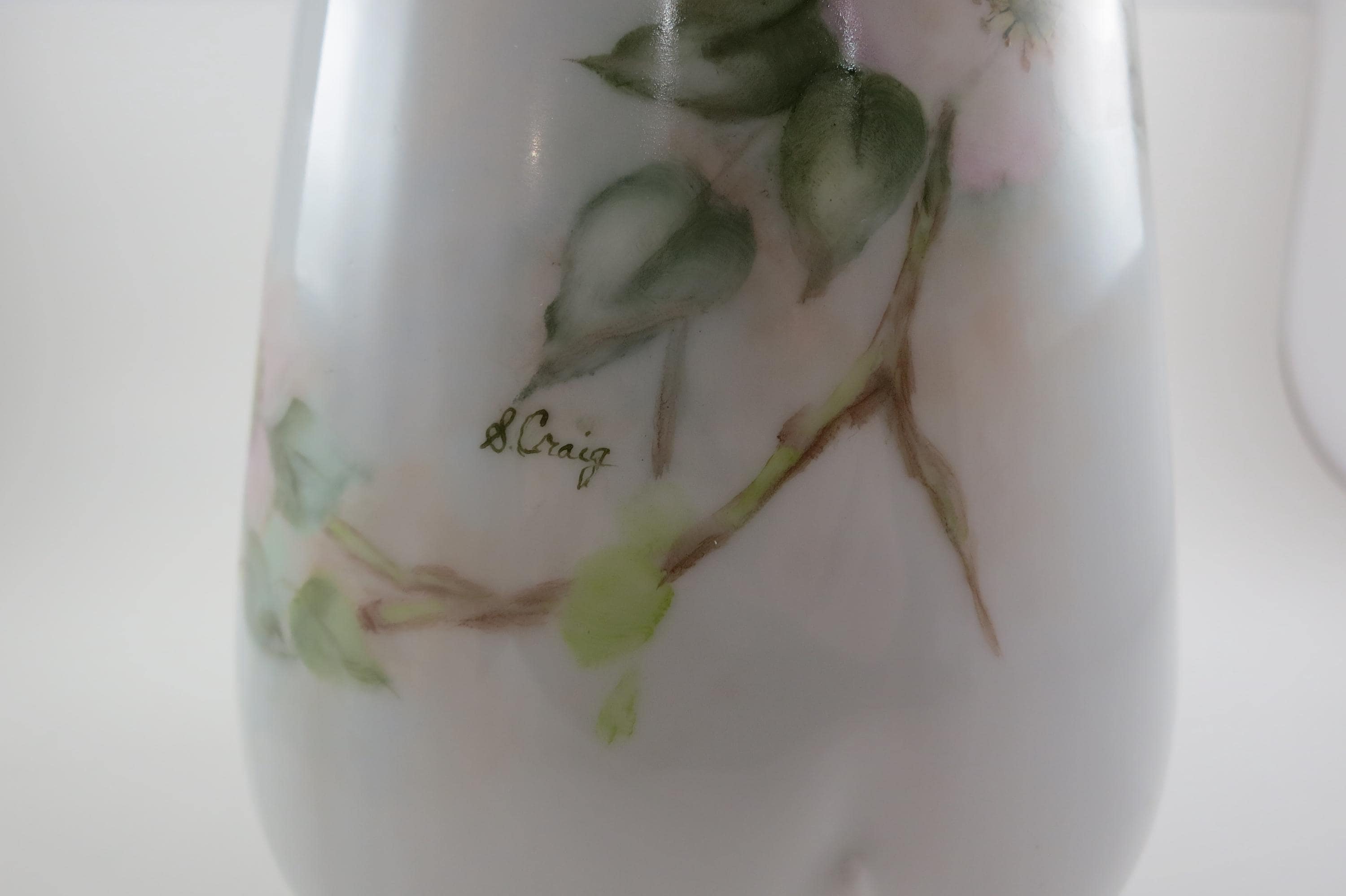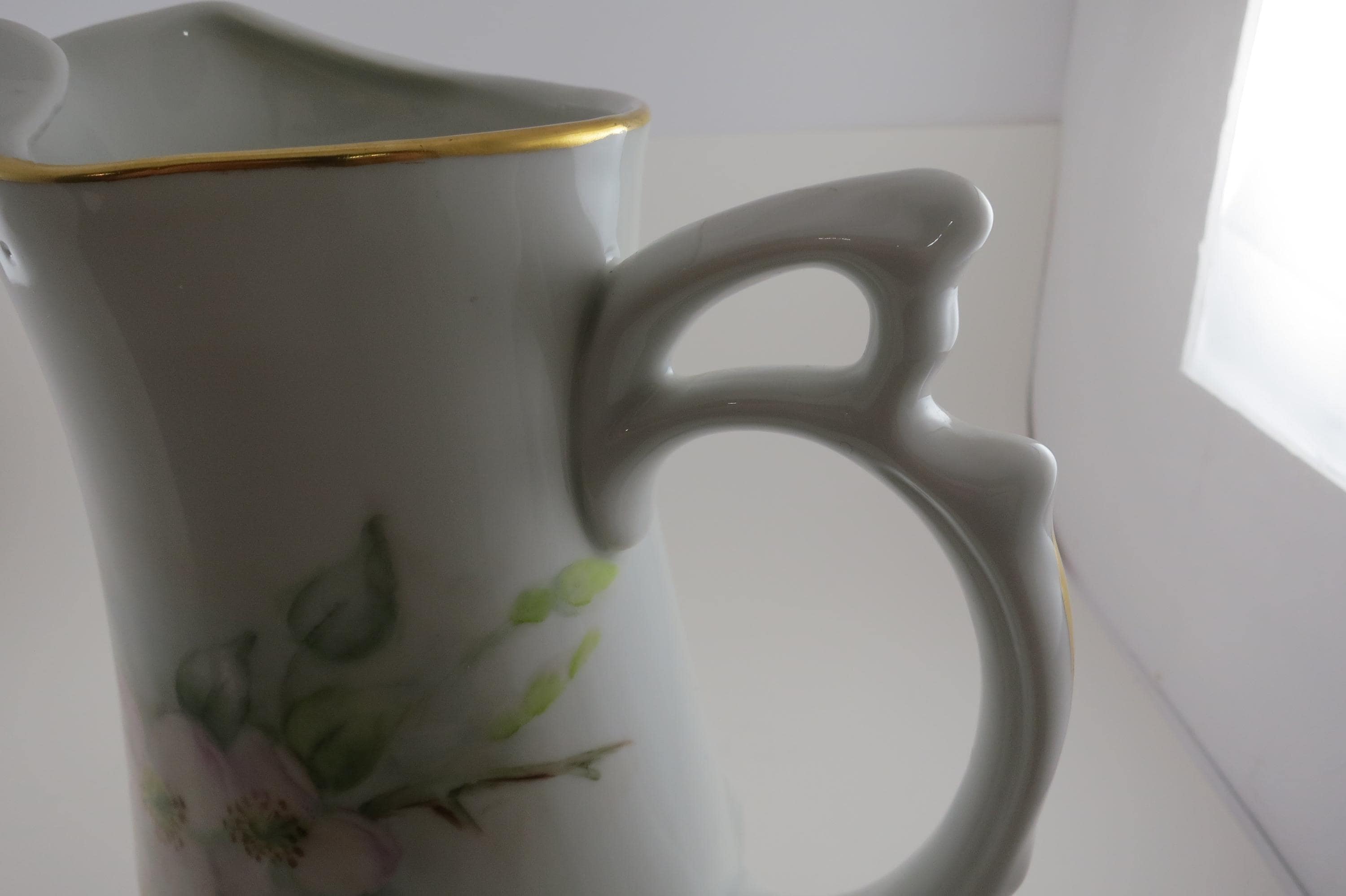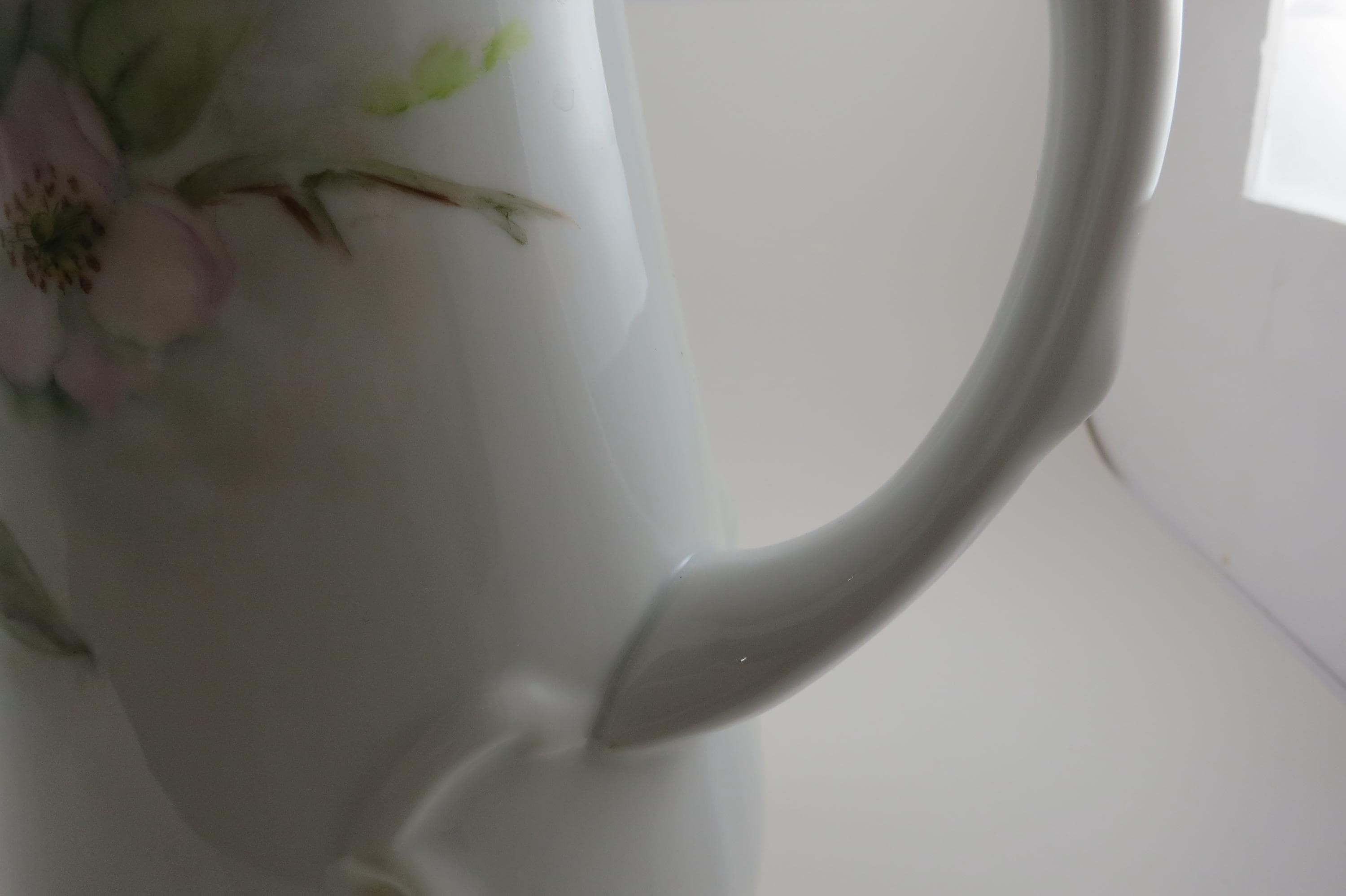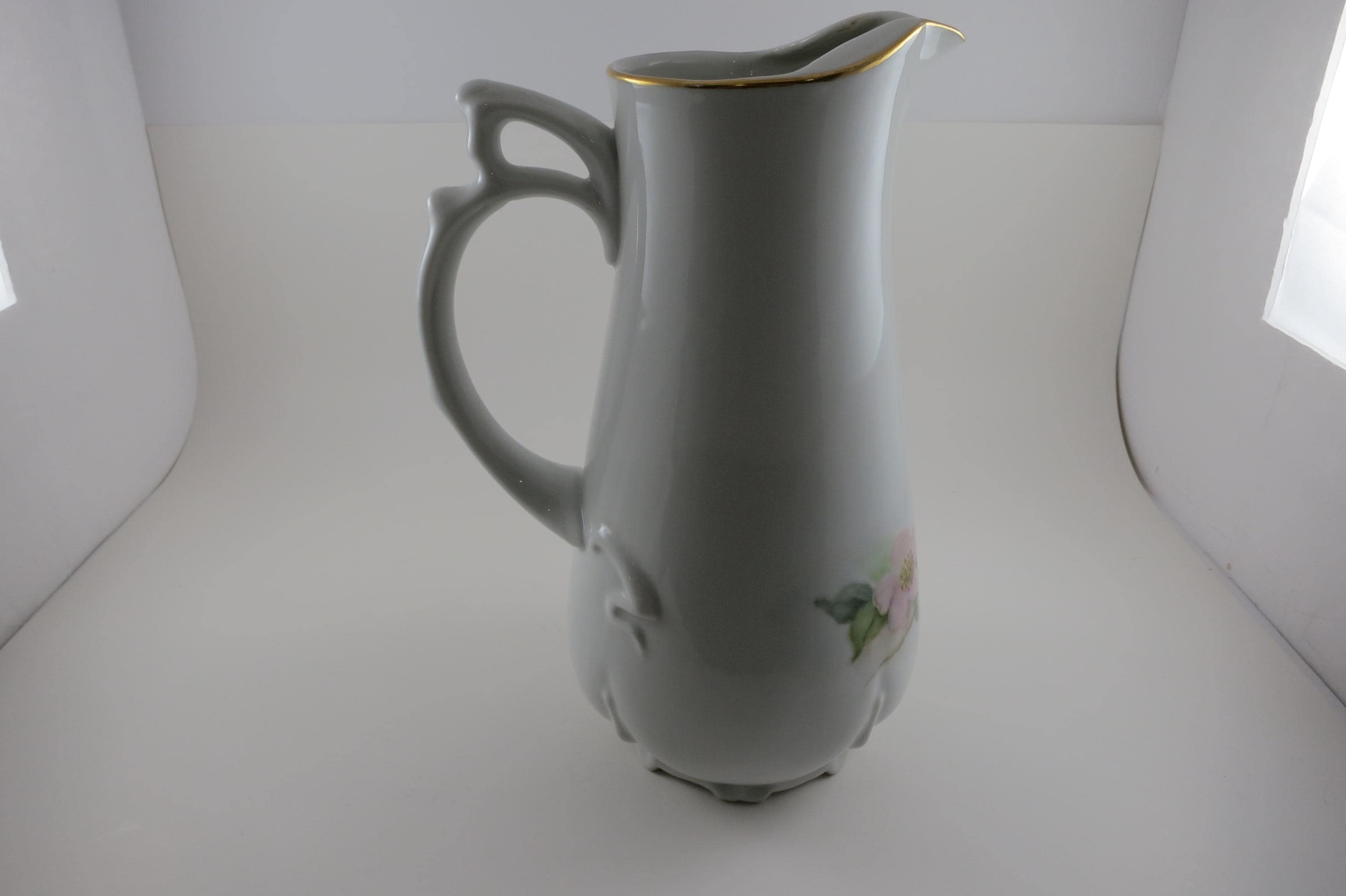 Large Porcelain Water Pitcher Hand Painted Unbranded Pink Roses Artist Signed 10 1/4 Inches Tall