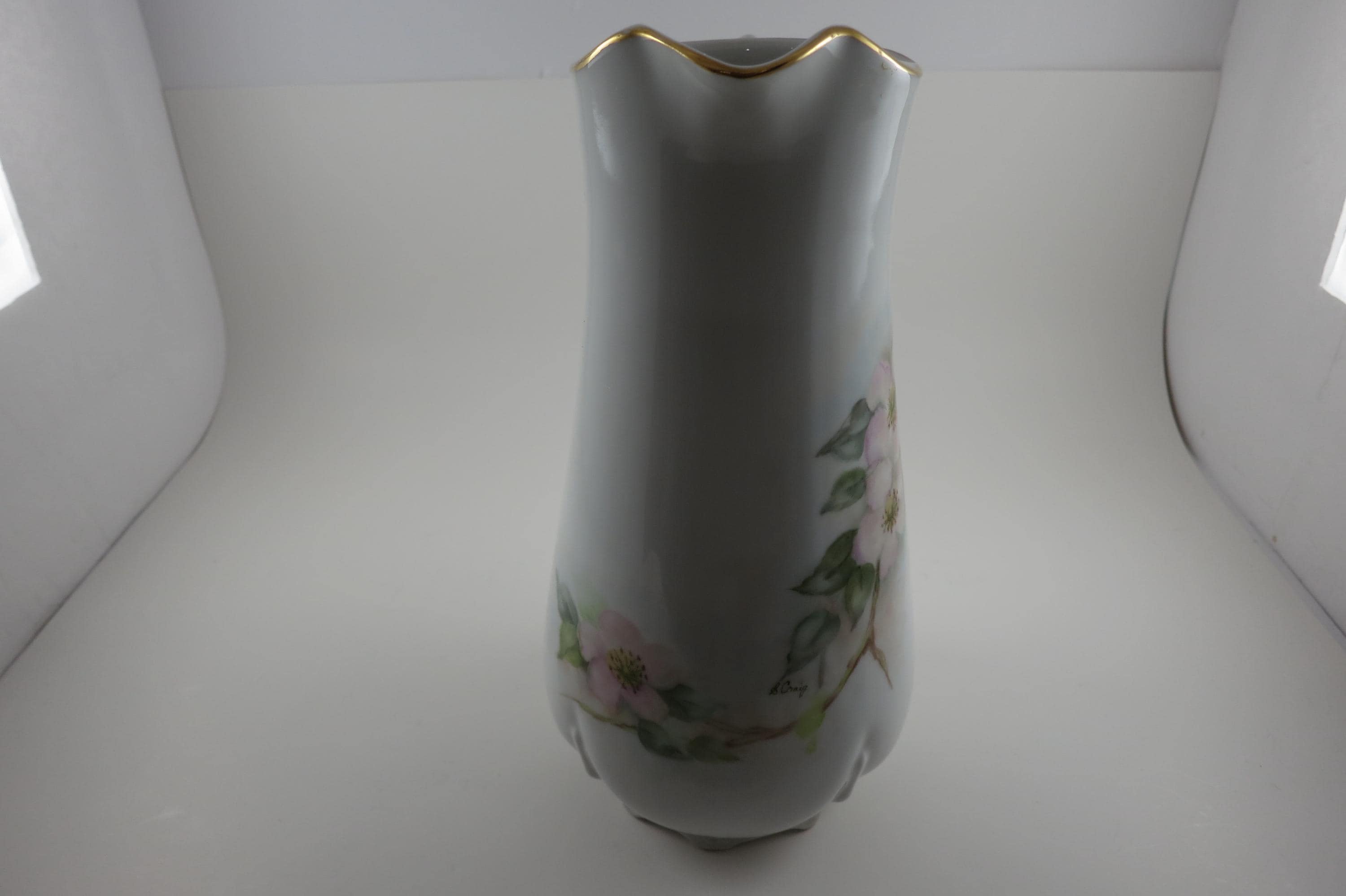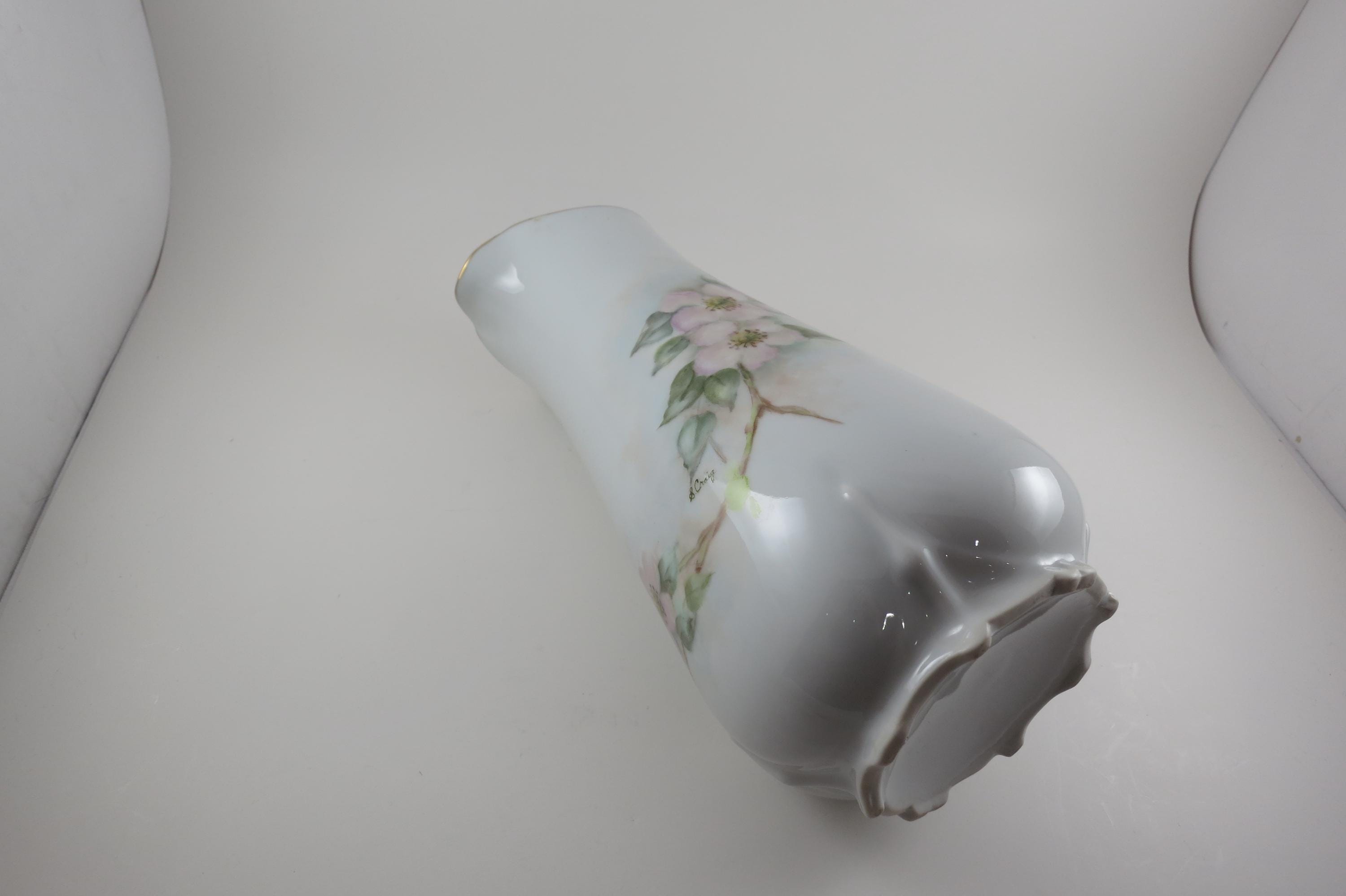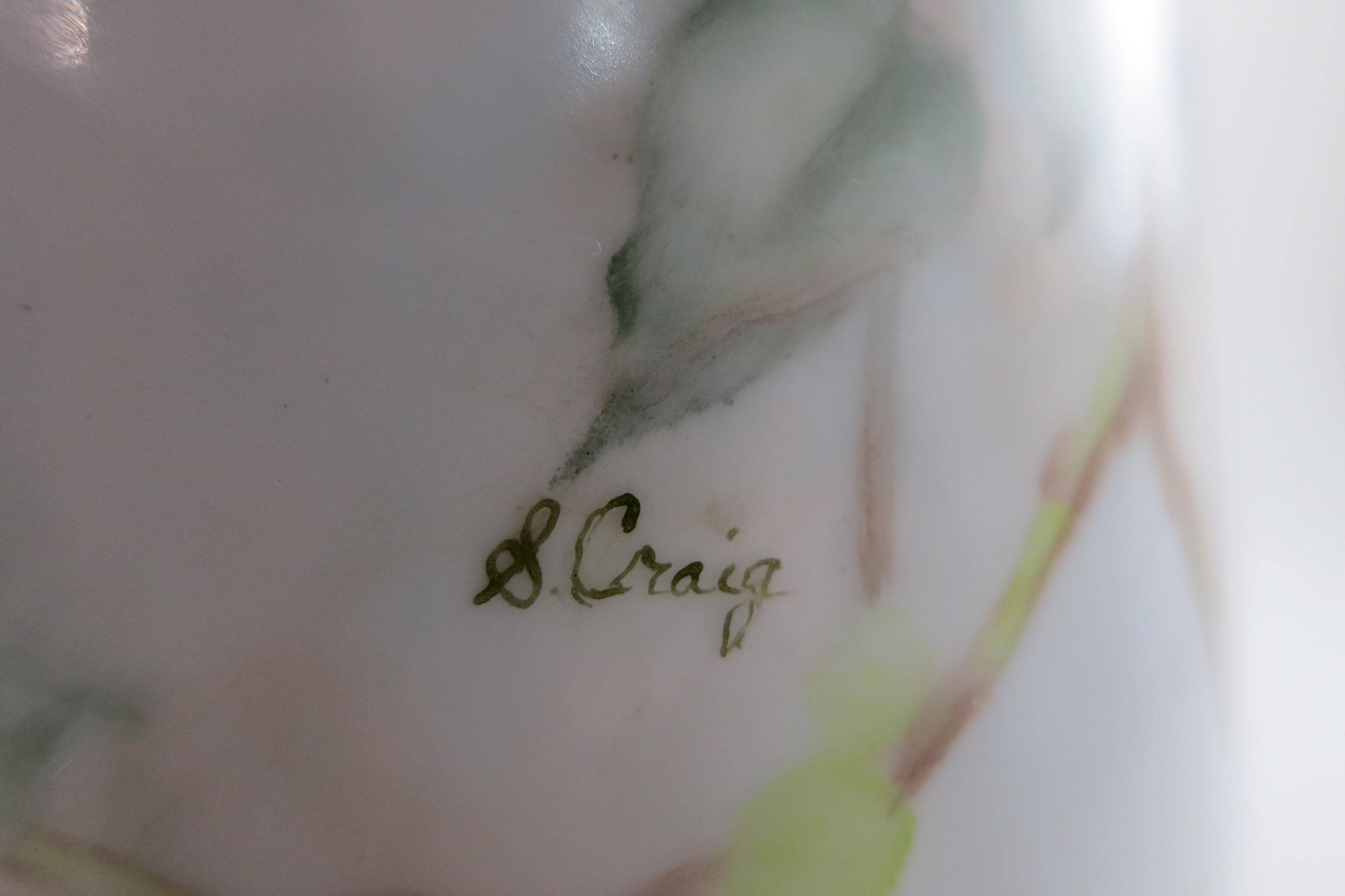 Wonderful old piece that looks great on the counter. Artist Signed. (S Craig) It measures 10 1/4 inches tall and 6 1/2 inches wide from lip to outer handle. Has gold trim. No chips, cracks or damages.