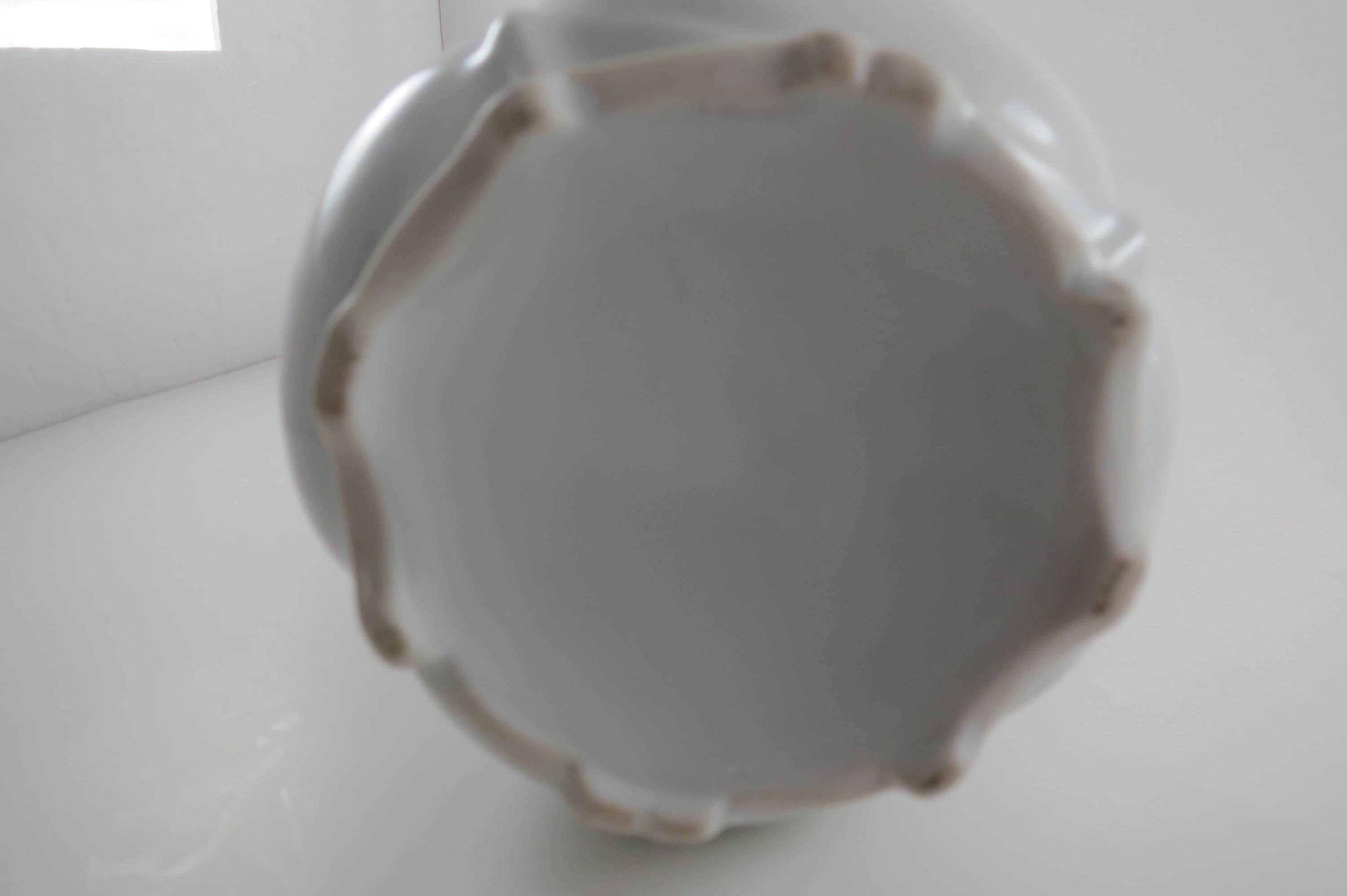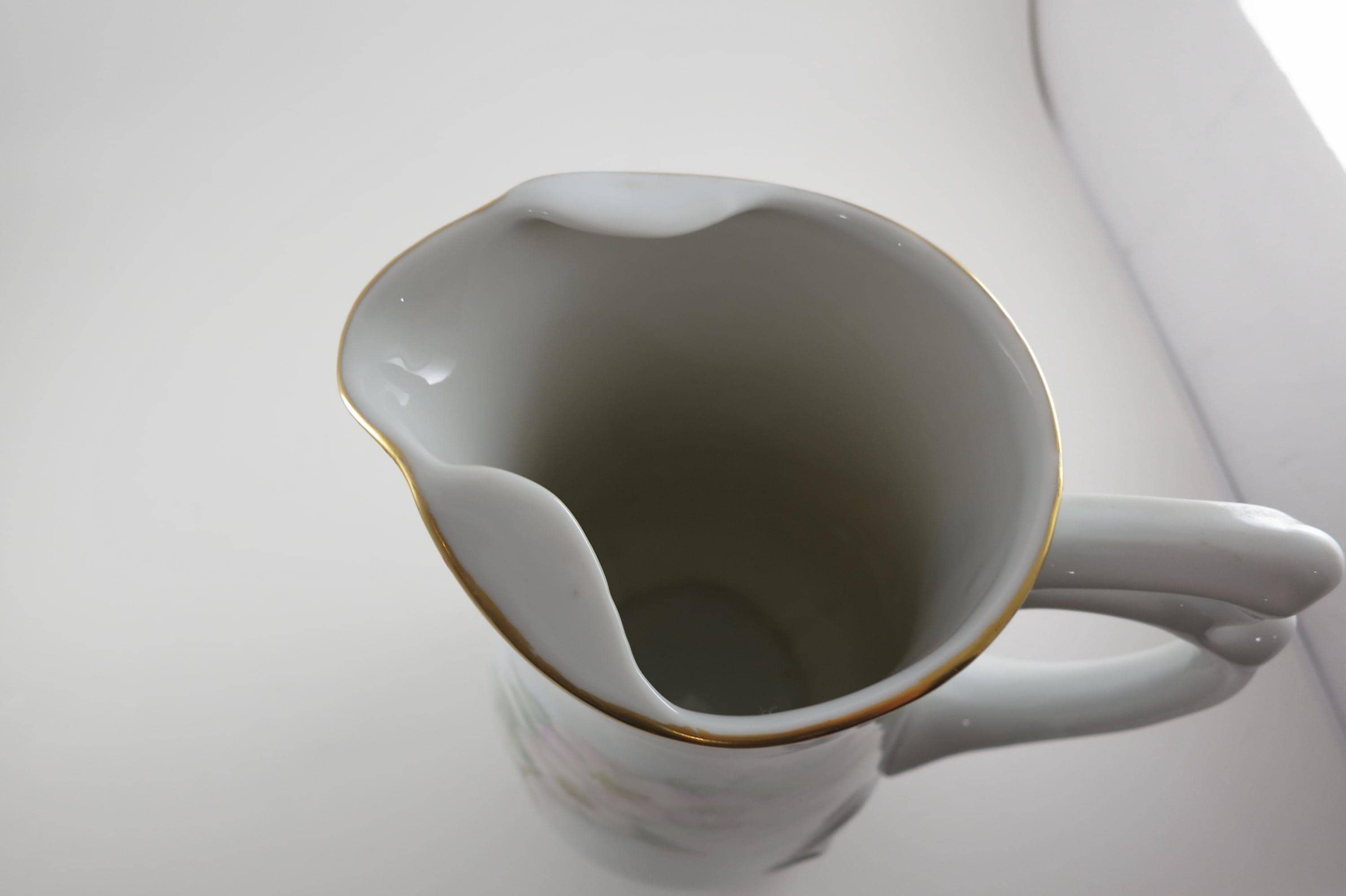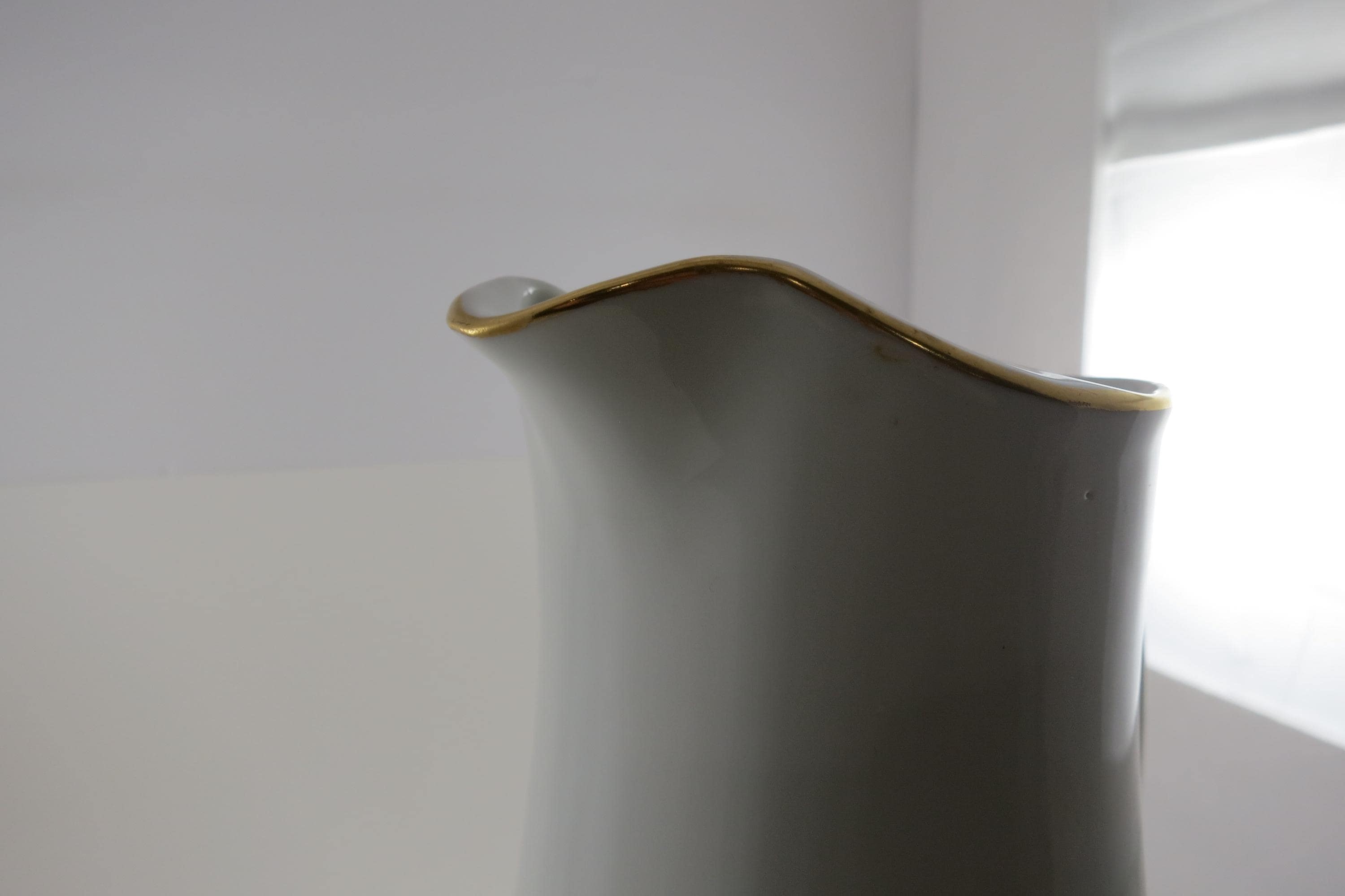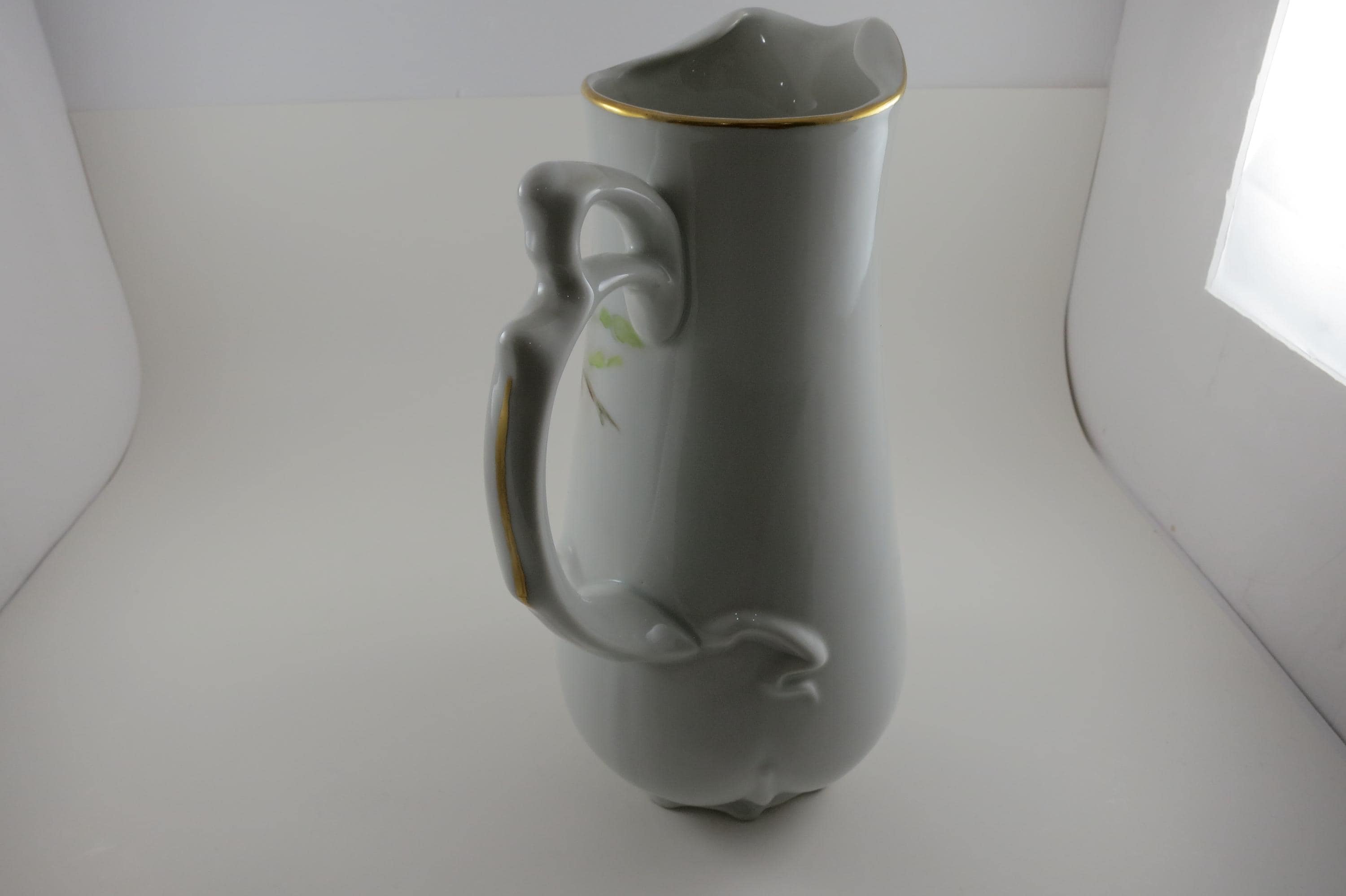 Wonderful old piece that looks great on the counter. Artist Signed. (S Craig) It measures 10 1/4 inches tall and 6 1/2 inches wide from lip to outer handle. Has gold trim. No chips, cracks or damages.