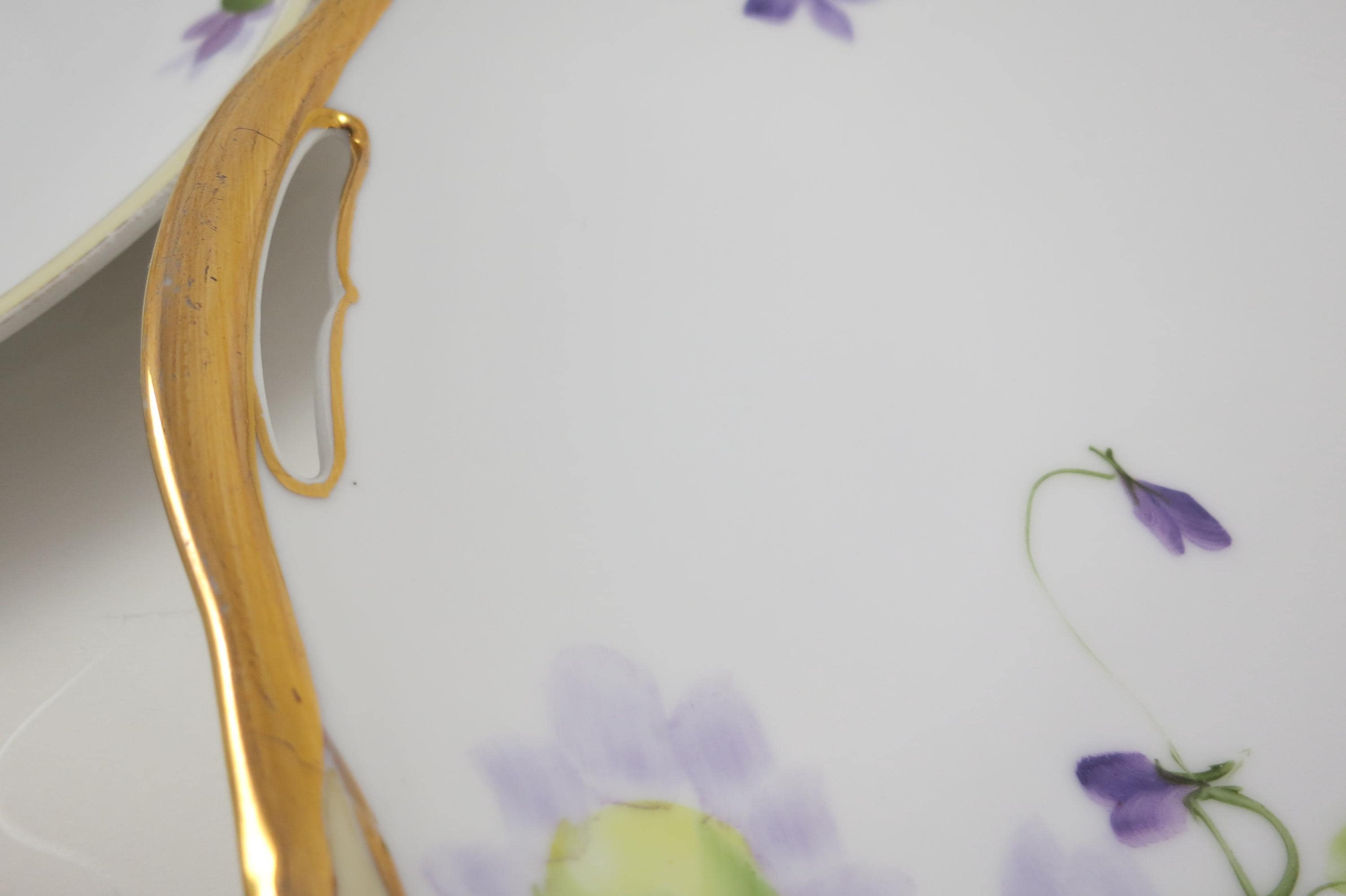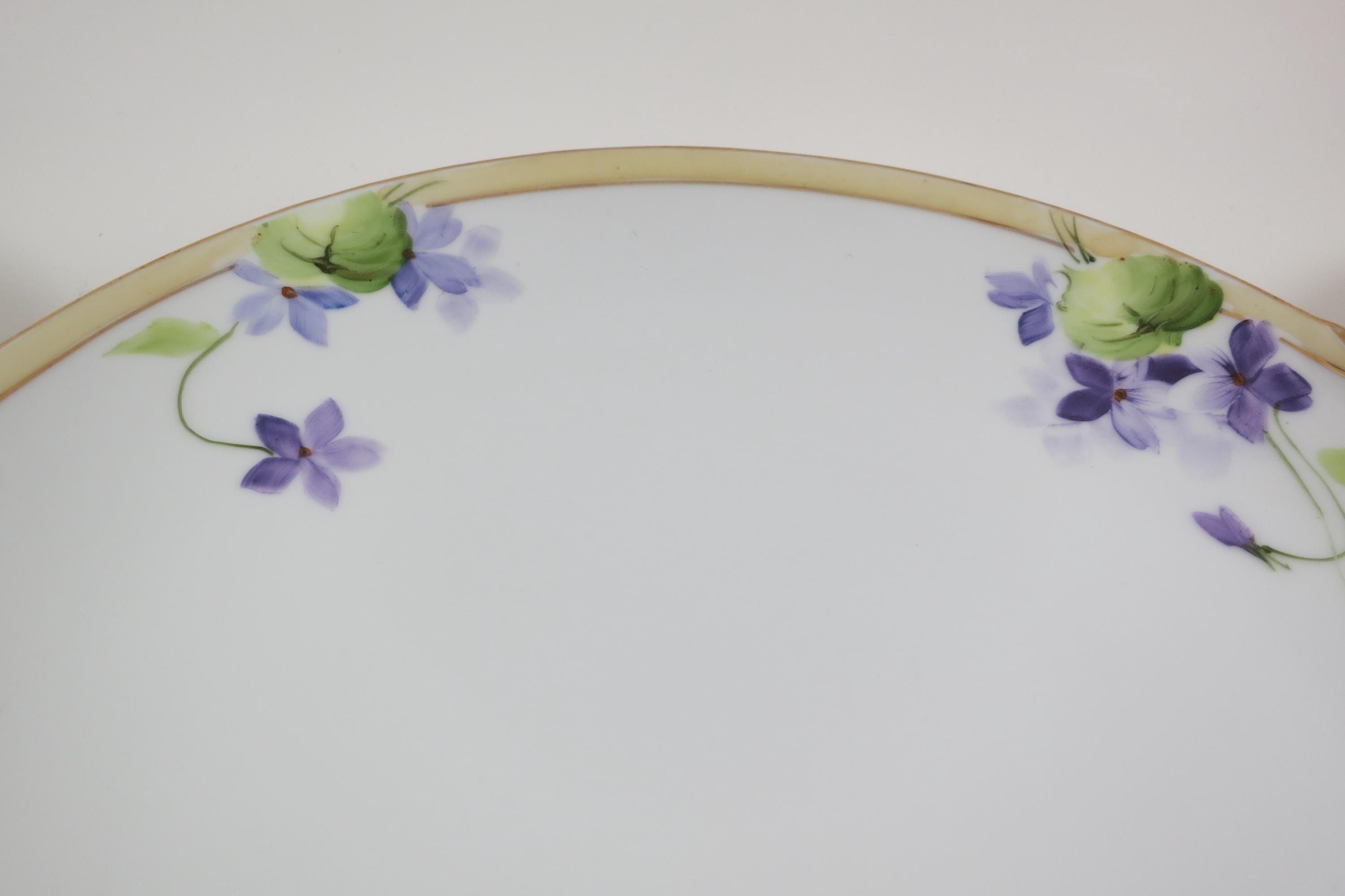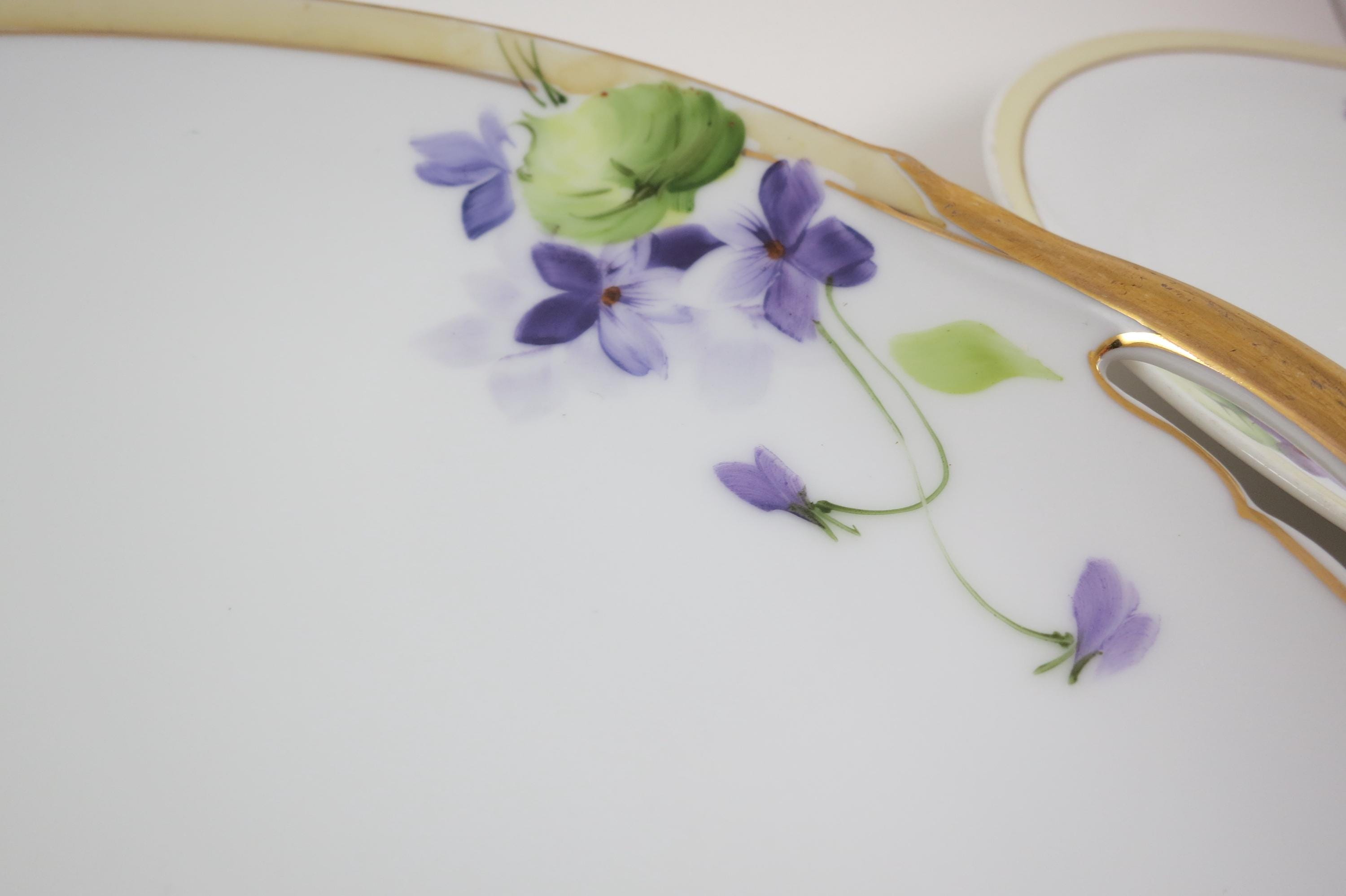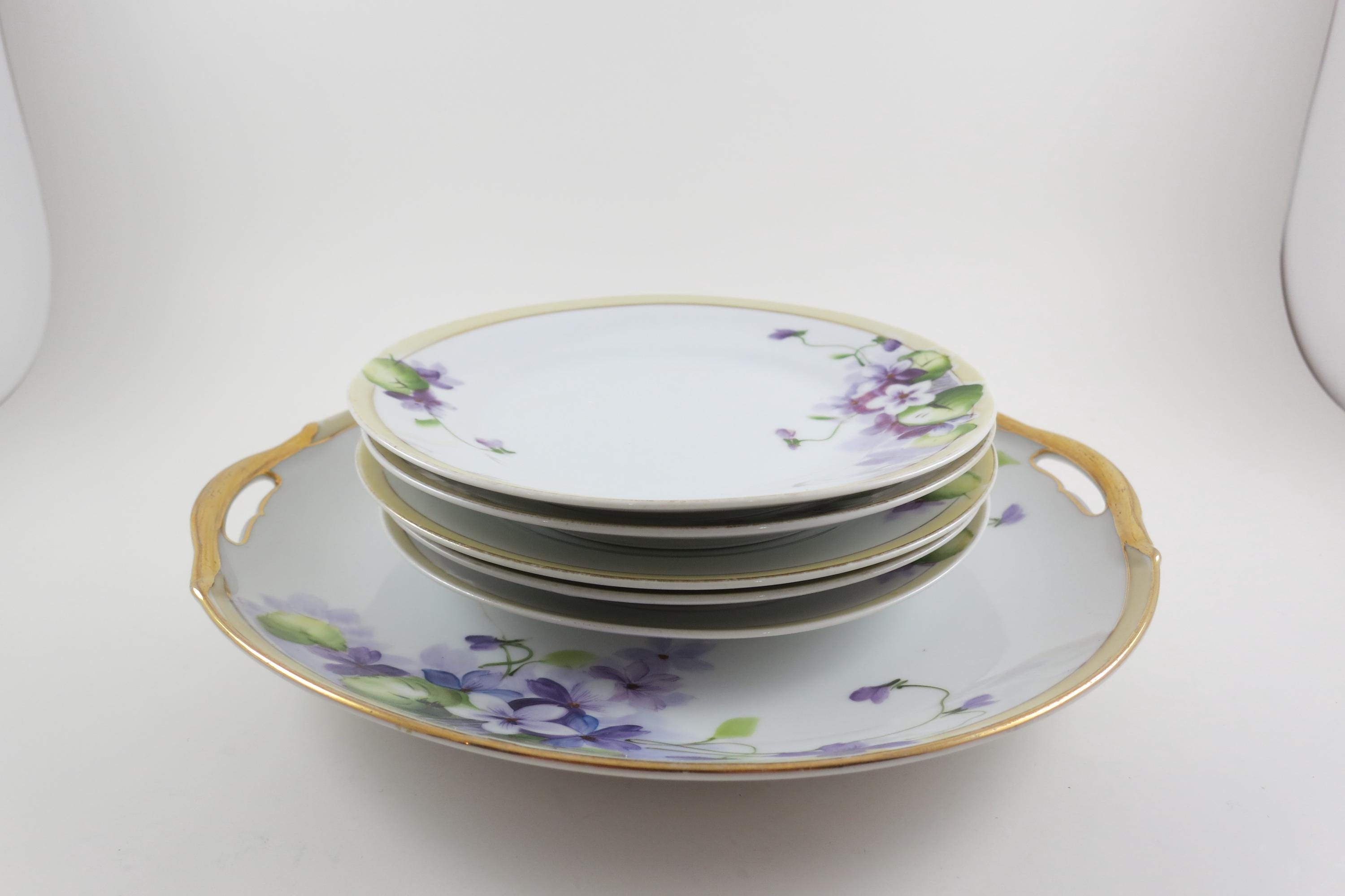 The Larger serving/cake plate is double handled and features a beautiful purple floral pattern with gold trim. Measures 9 3/4 Inches Diameter. The five matching individual plates measure 6 1/2 inches diameter. All six pieces are damage free and in excellent condition. Fabulous old set to use or display!