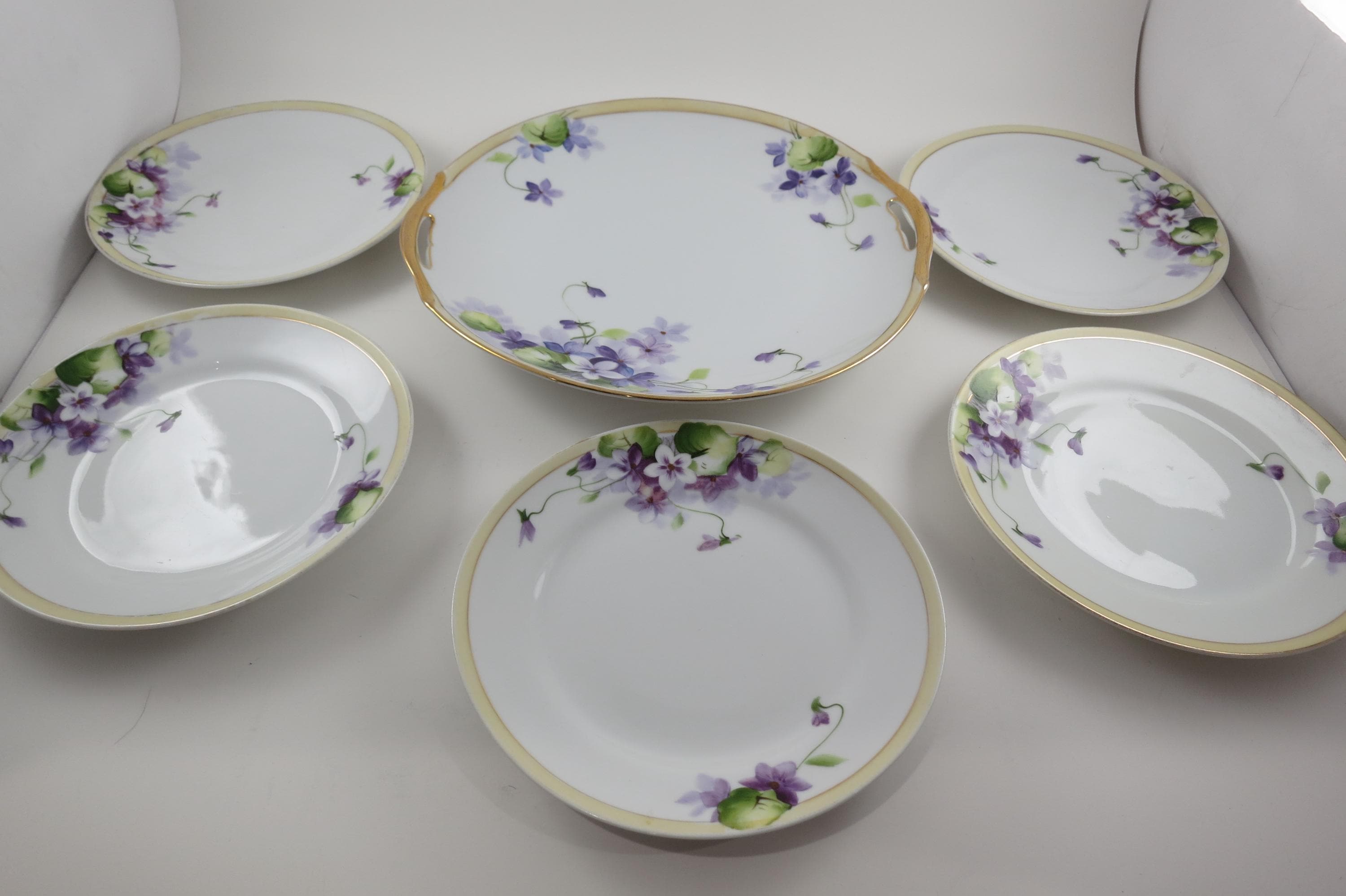 Vintage Nippon Hand Painted 6 Piece Snack Cake Set Purple Floral Excellent Original Condition.