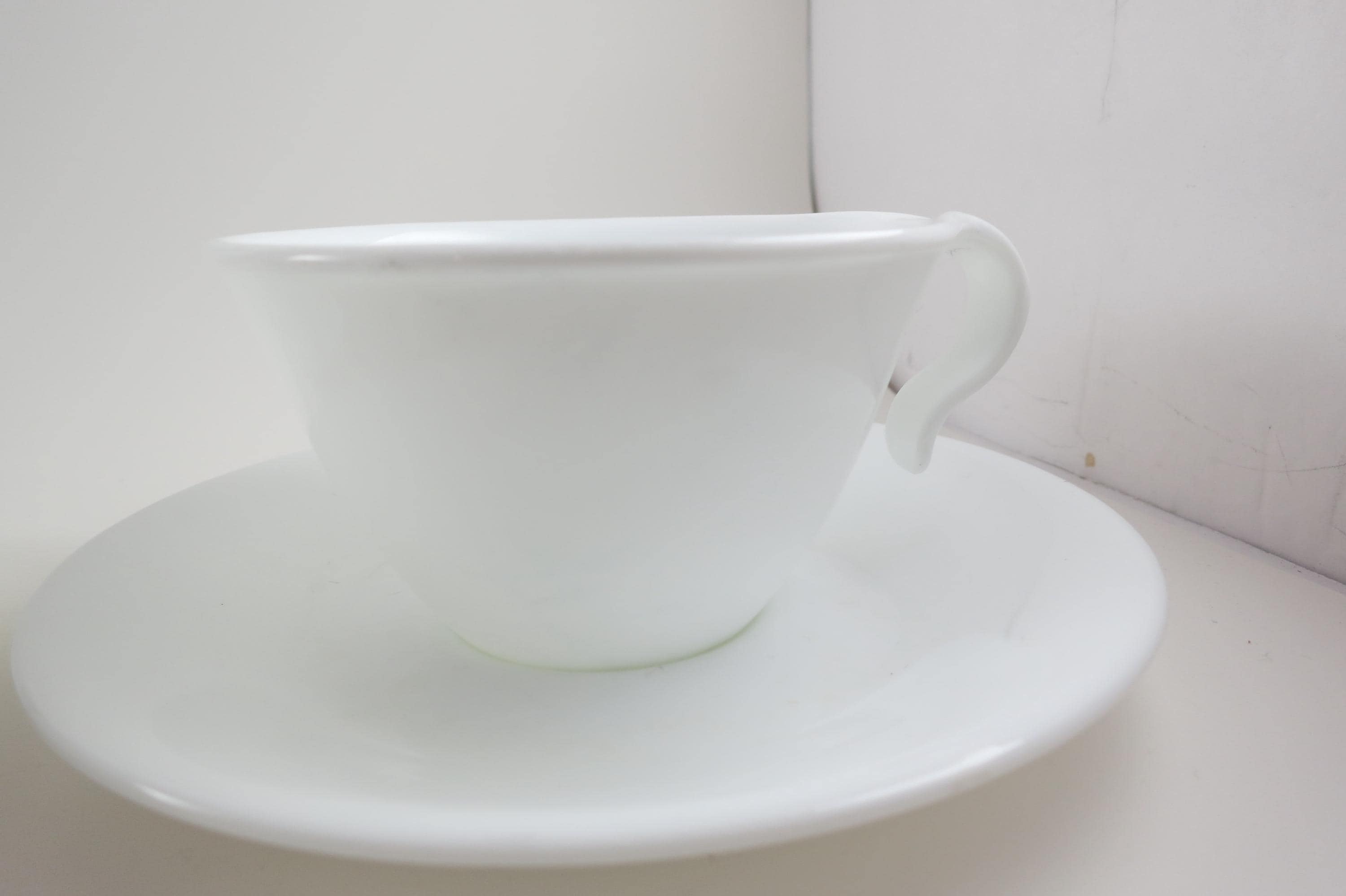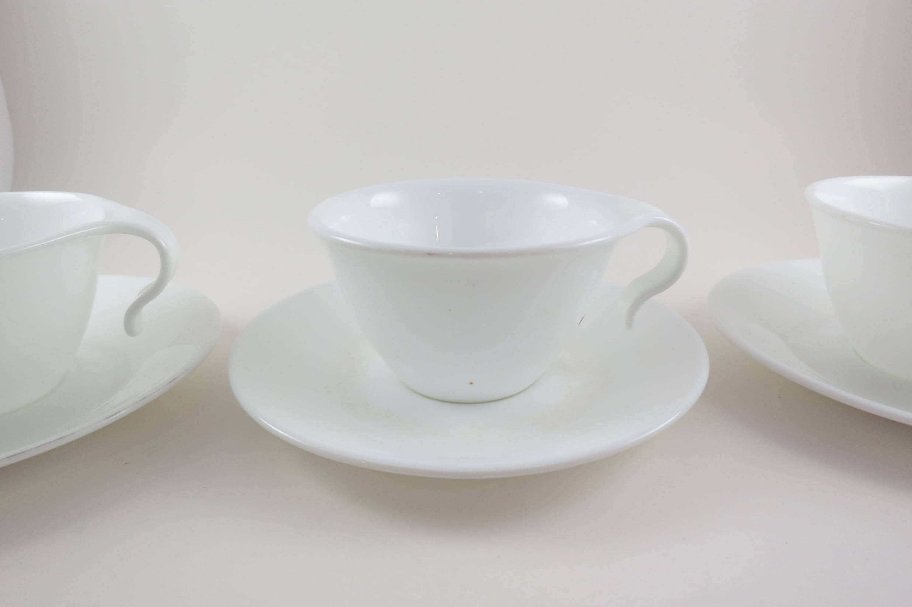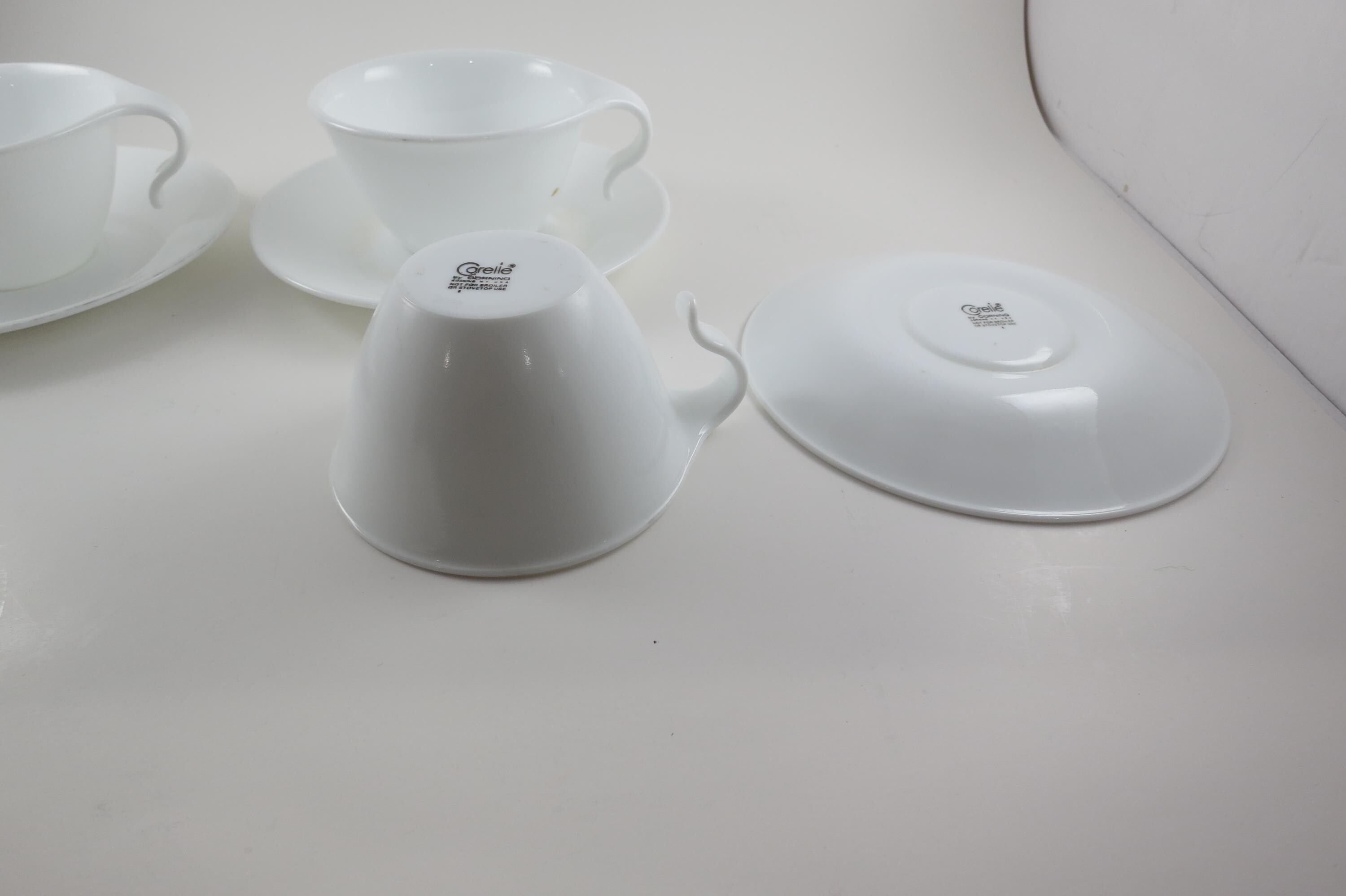 Set of Three Vintage Corning Ware Solid White Hook Handle Coffee Tea Cups and Saucers