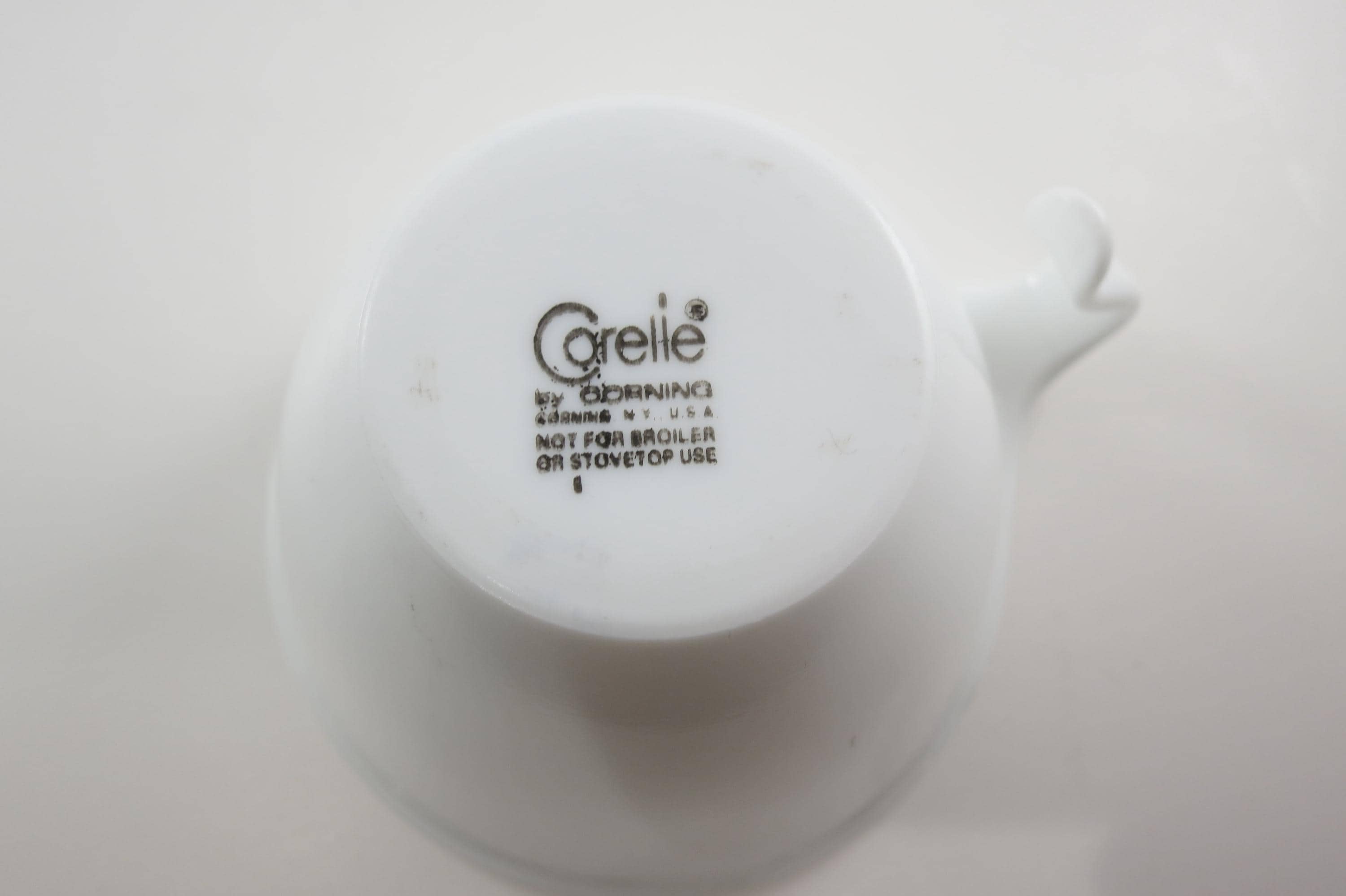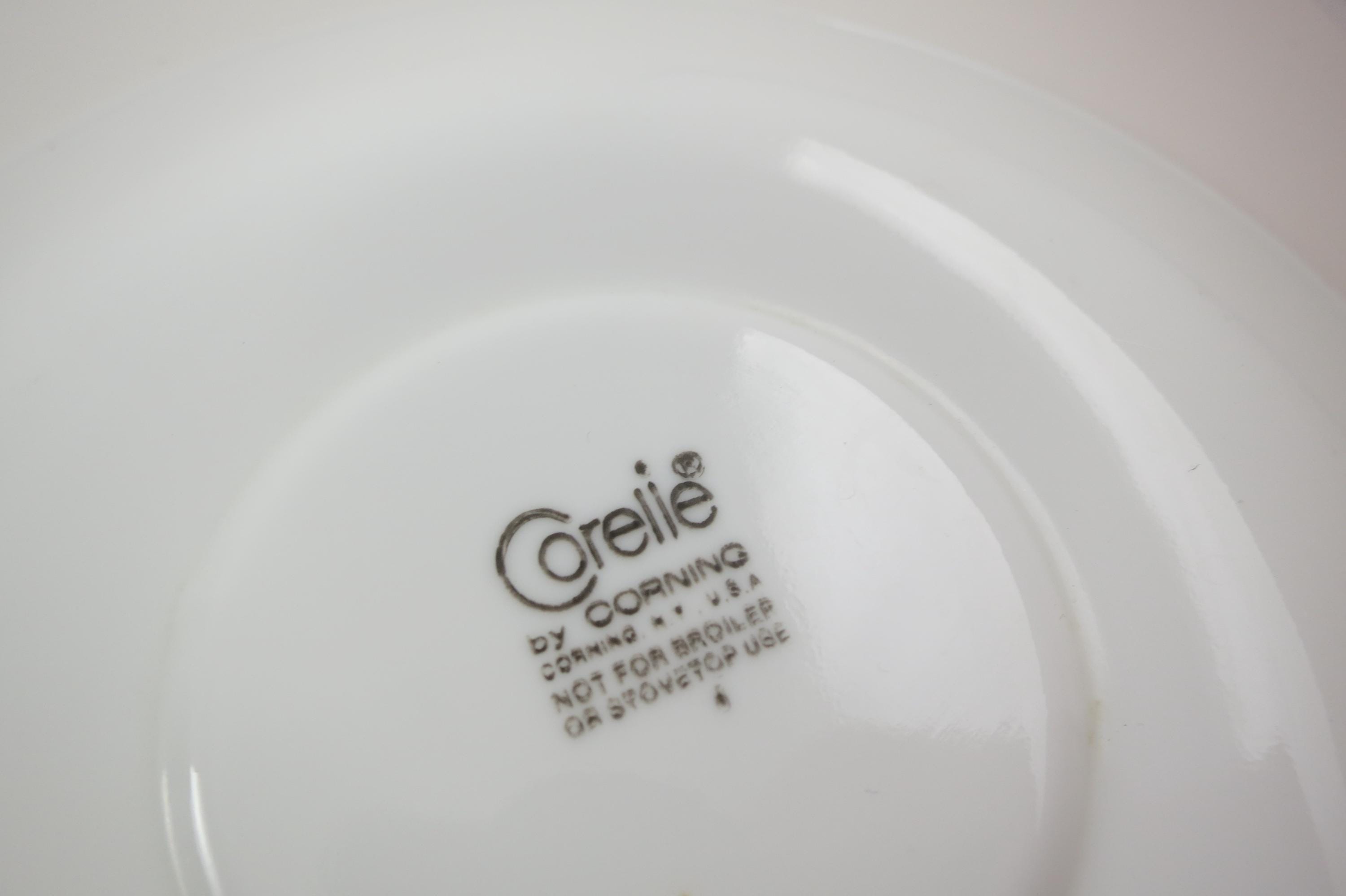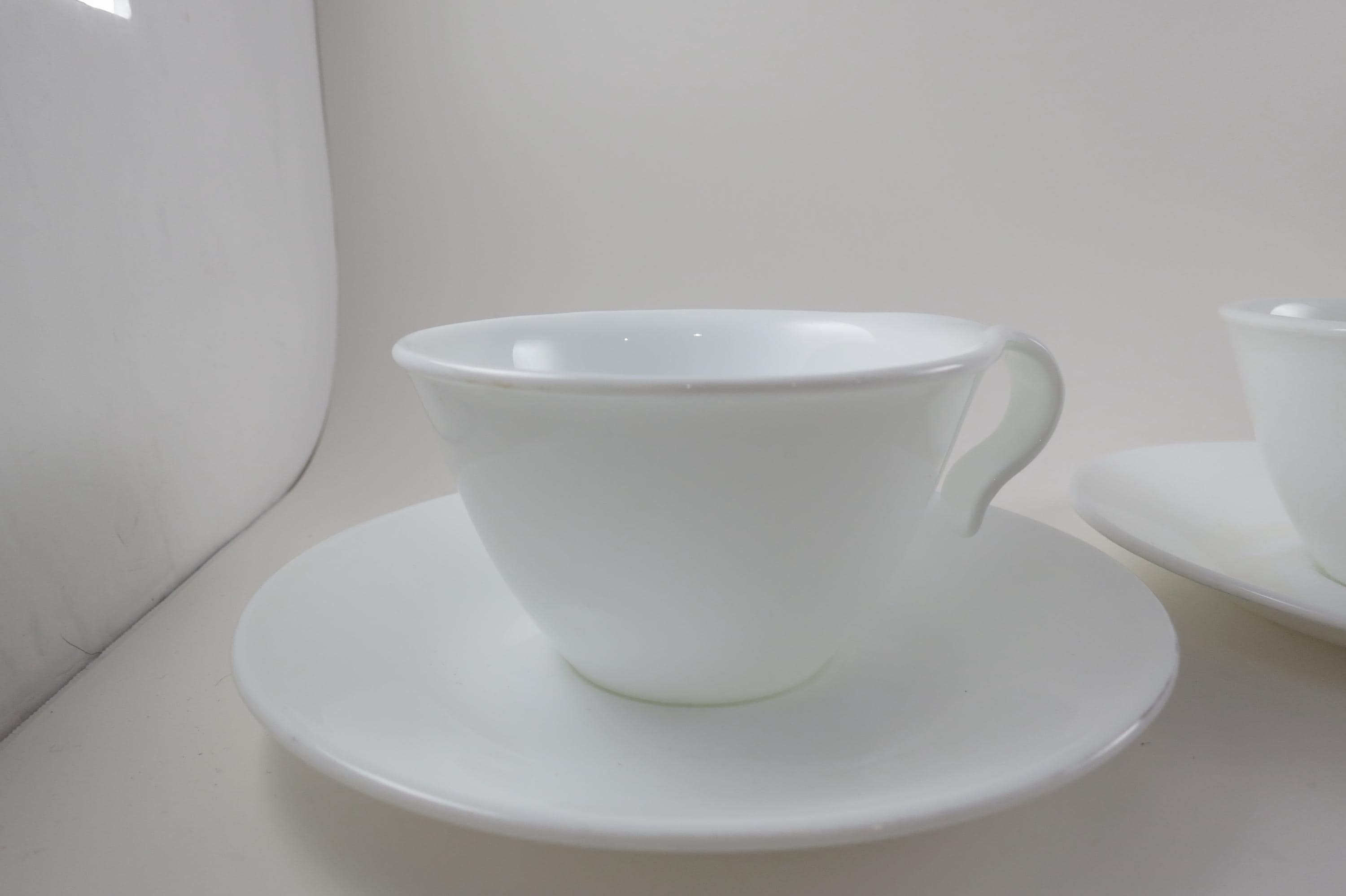 Set of Three Vintage Corning Ware Solid White Hook Handle Coffee Tea Cups and Saucers