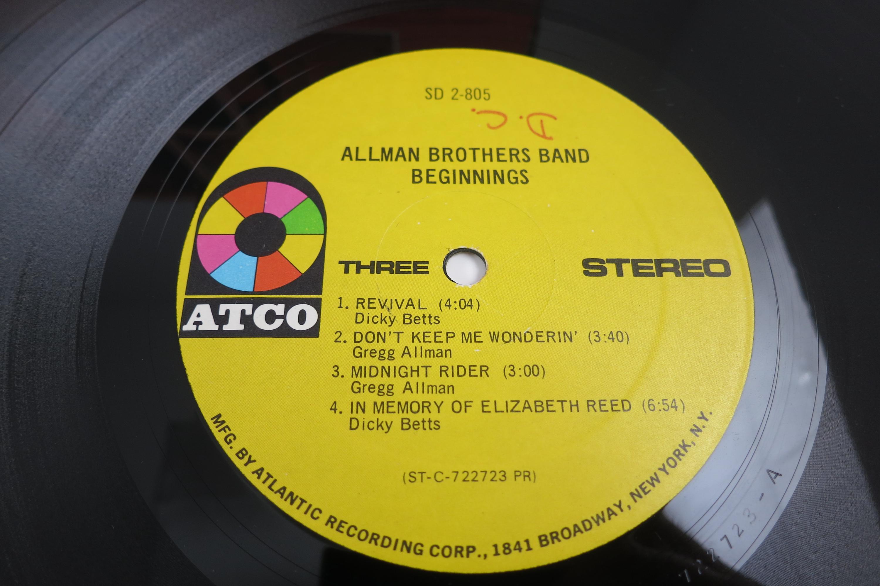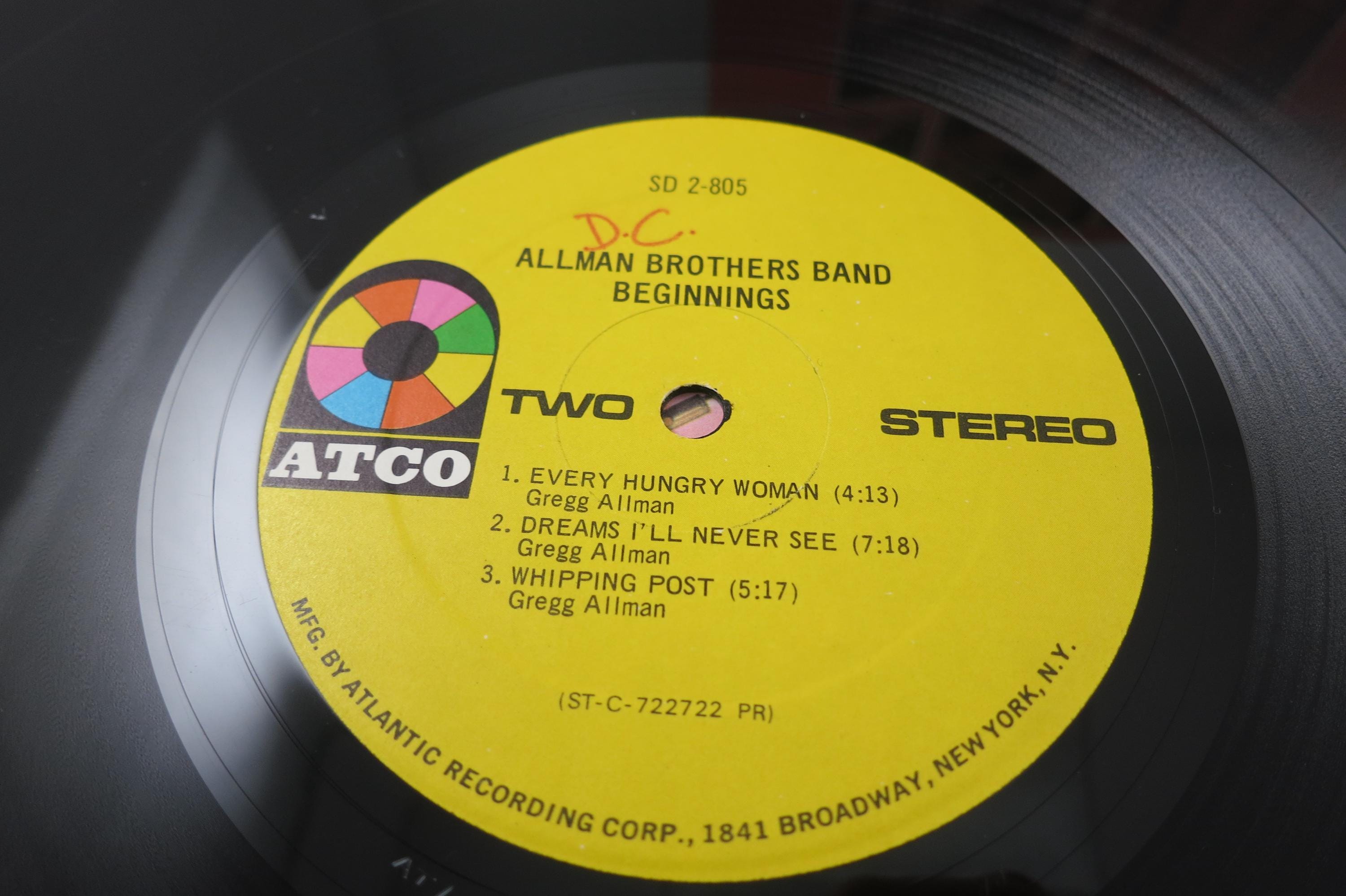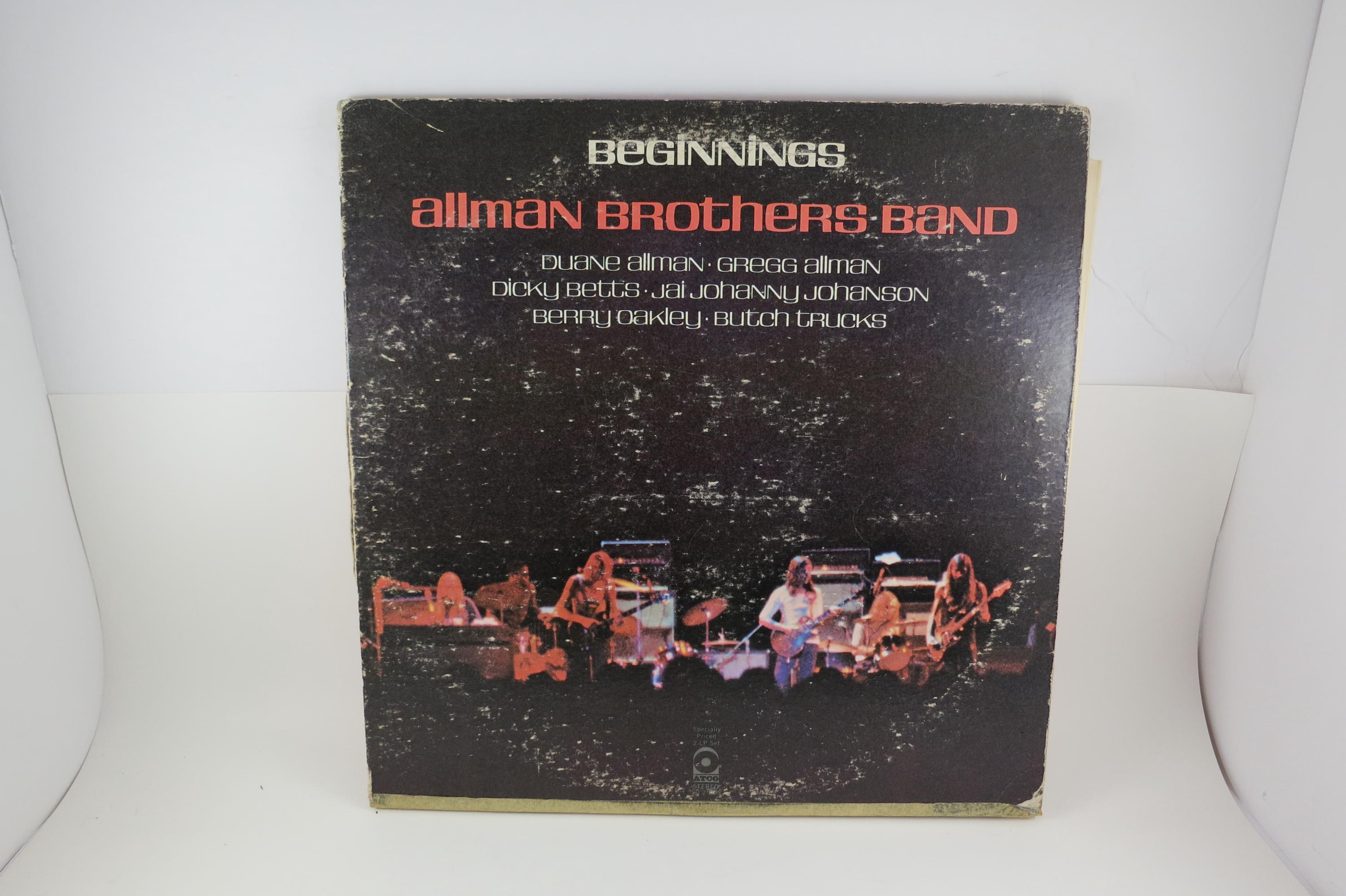 Vintage 1973 Vinyl LP Record Set Beginnings The Allman Brothers Band Very Good Condition. Original gate fold cover is in poor condition and includes the inner paper sleeves. Cover has taped on the seams, spine wear and a previous owners initials. Records are in very good condition with light marks, and the labels have the previous owners initials on them. tracks are as follows
