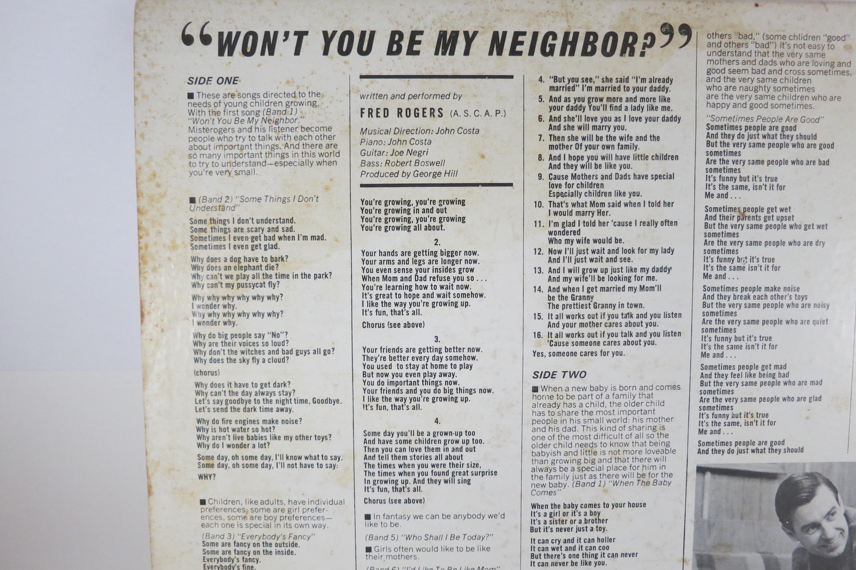 Rare Vintage 1967 Vinyl LP Kids Record Won't You Be My Neighbor? Mister Rogers Very Good Condition. Original cover is in good condition and includes the inner paper sleeve. Cover has a substance in several places. Record is very good. Lots of marks but still plays well! Tracks are as follows